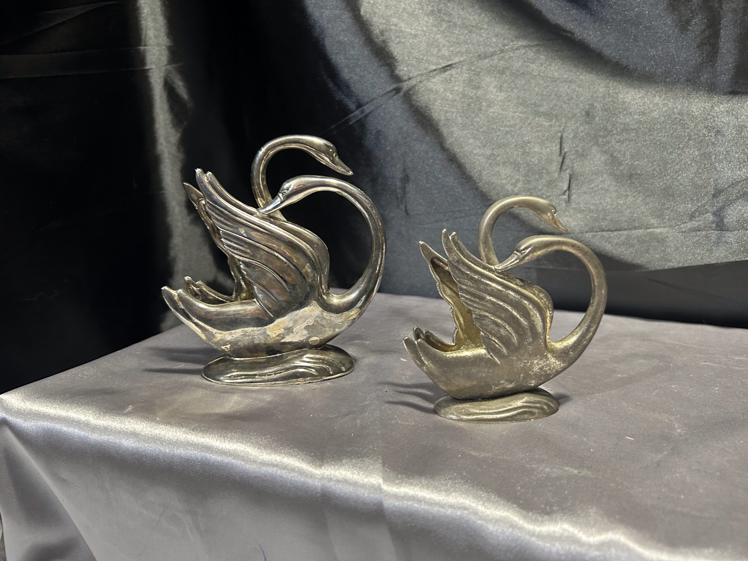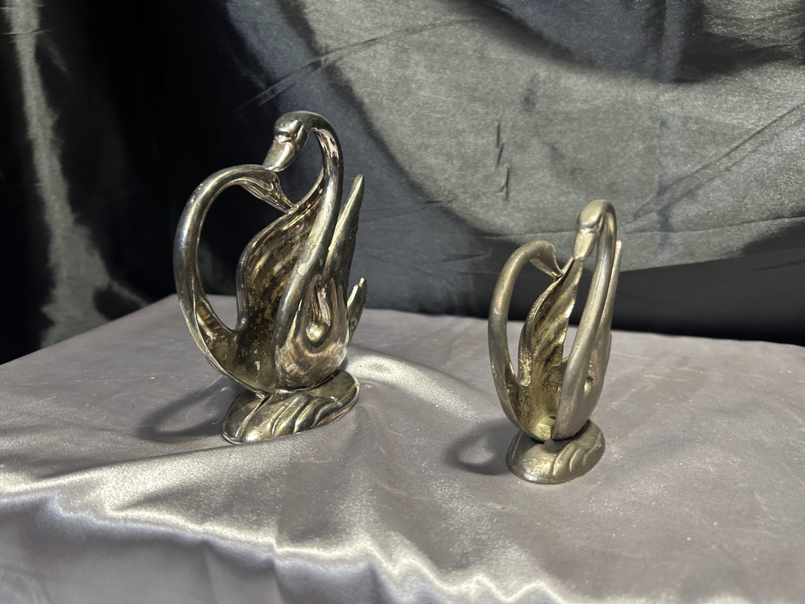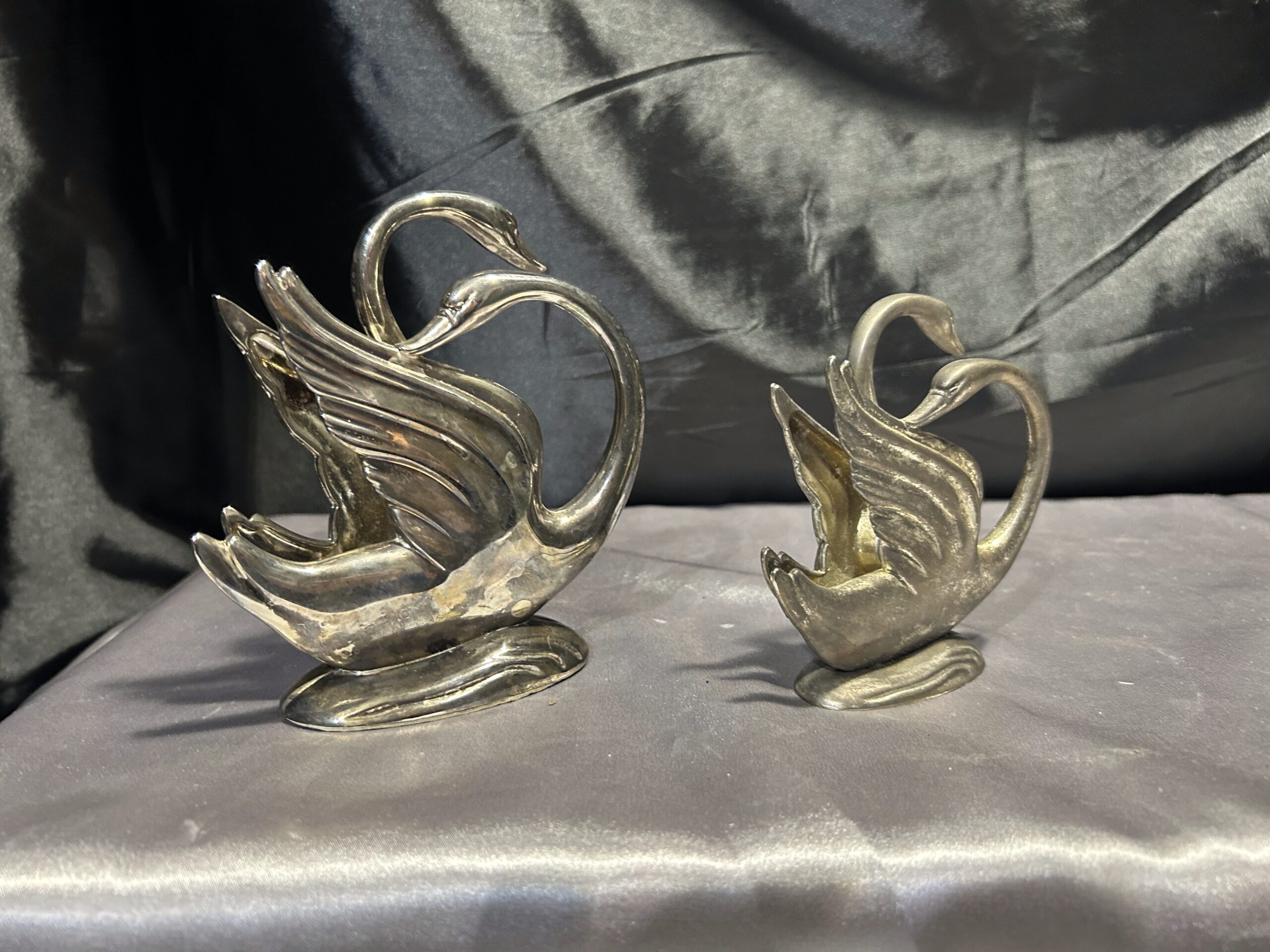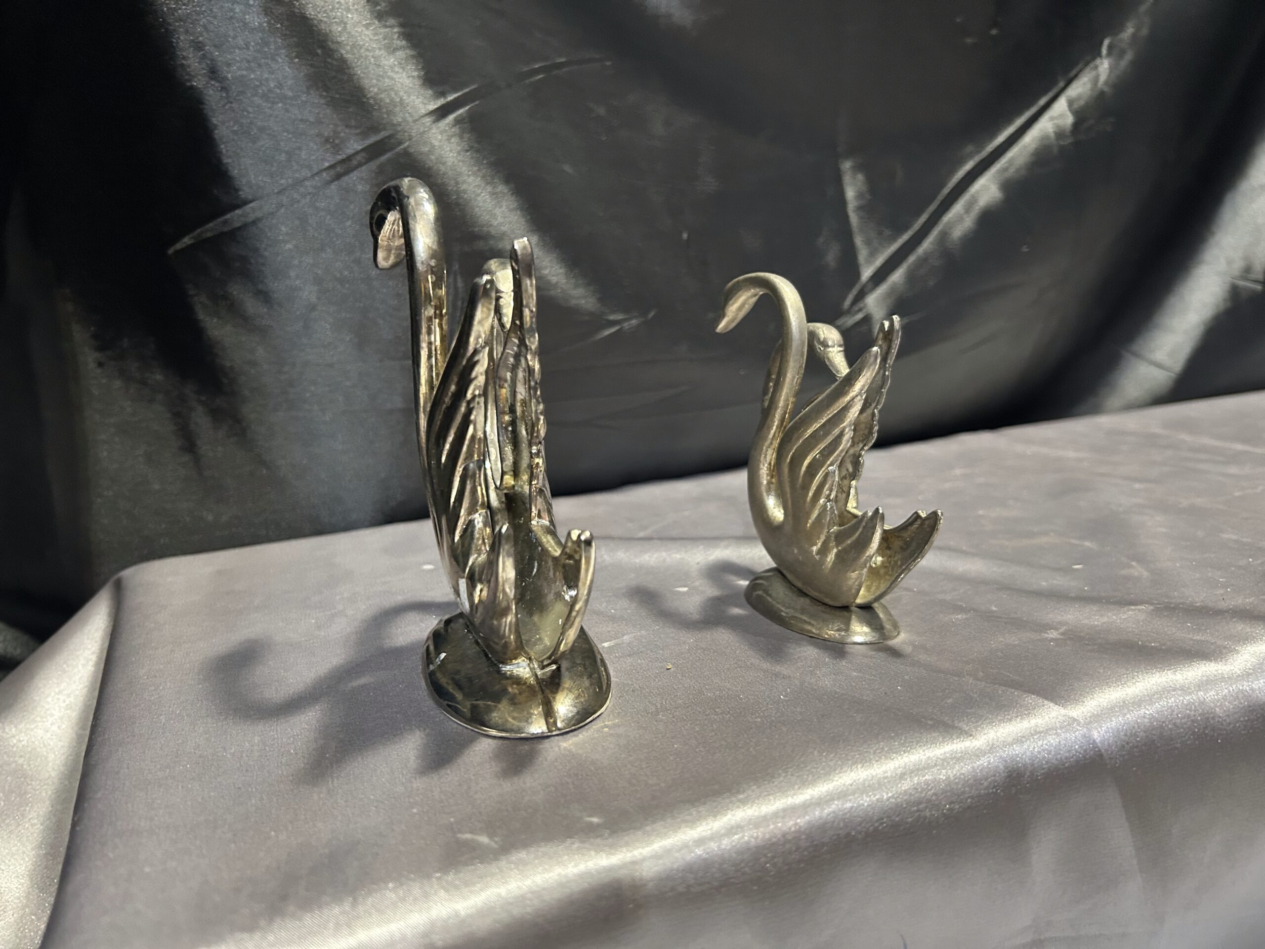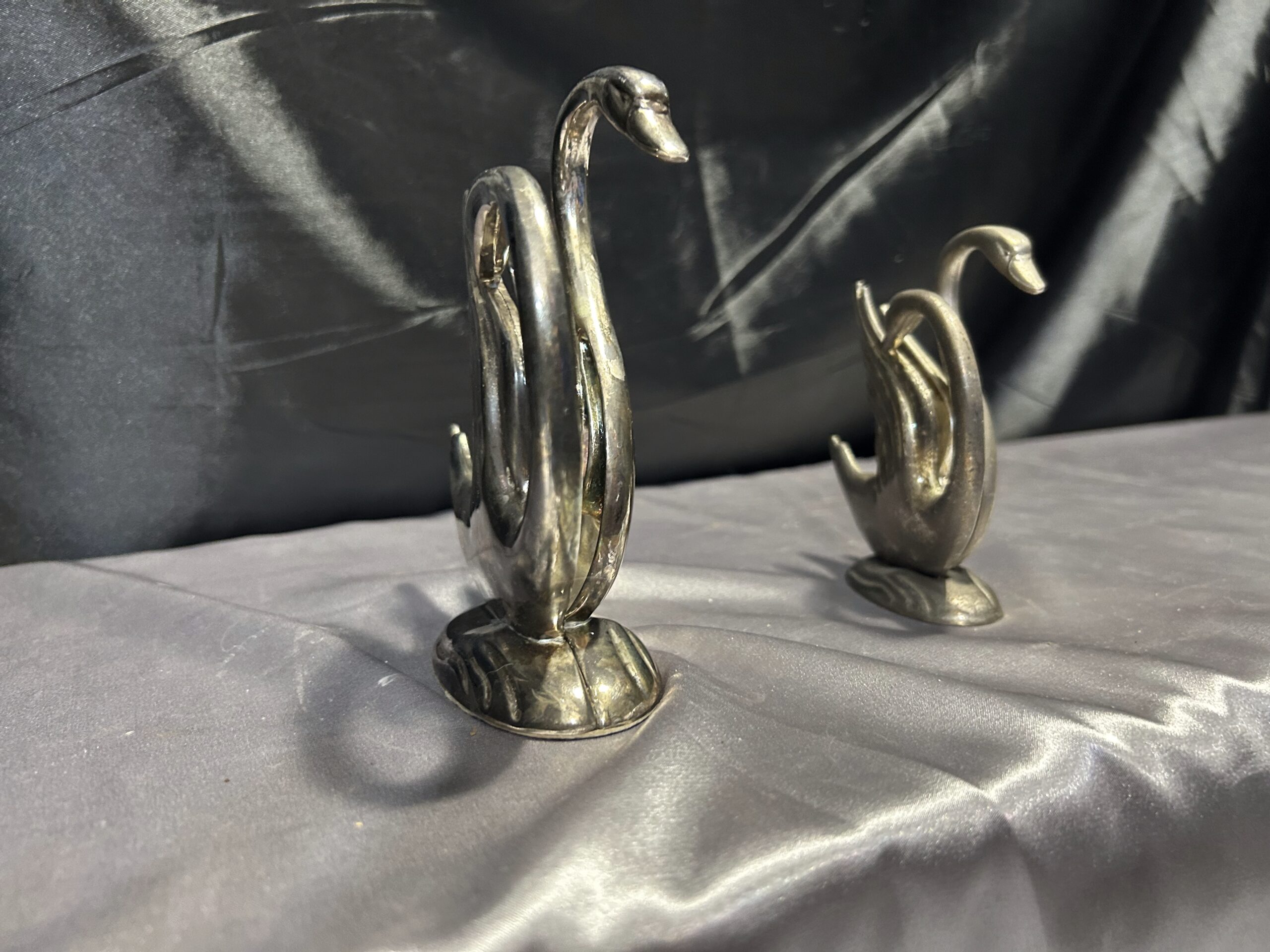 Stylowy zestaw dwóch serwetników w formie łabędzi, prawdopodobnie posrebrzanych, które dodadzą elegancji każdemu nakryciu stołu. Pięknie wykonane, z dbałością o detale, świetnie sprawdzą się zarówno w codziennym użytkowaniu, jak i jako ozdobny element stołowej aranżacji.