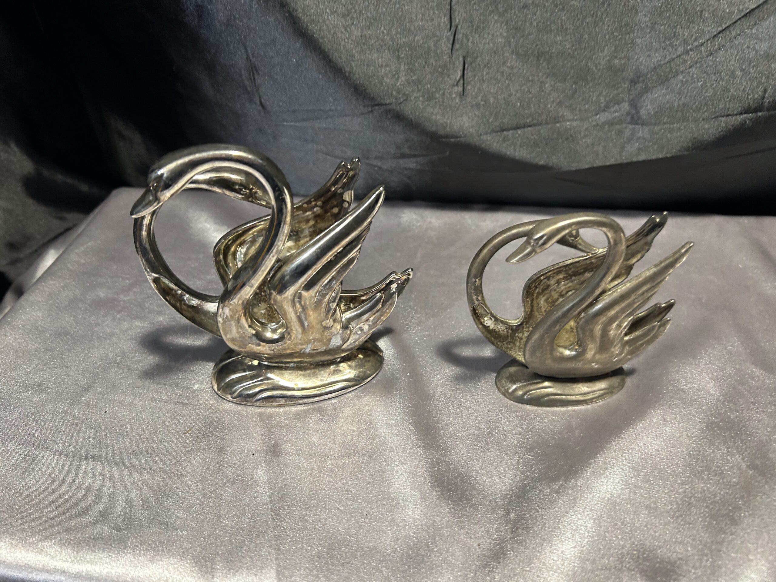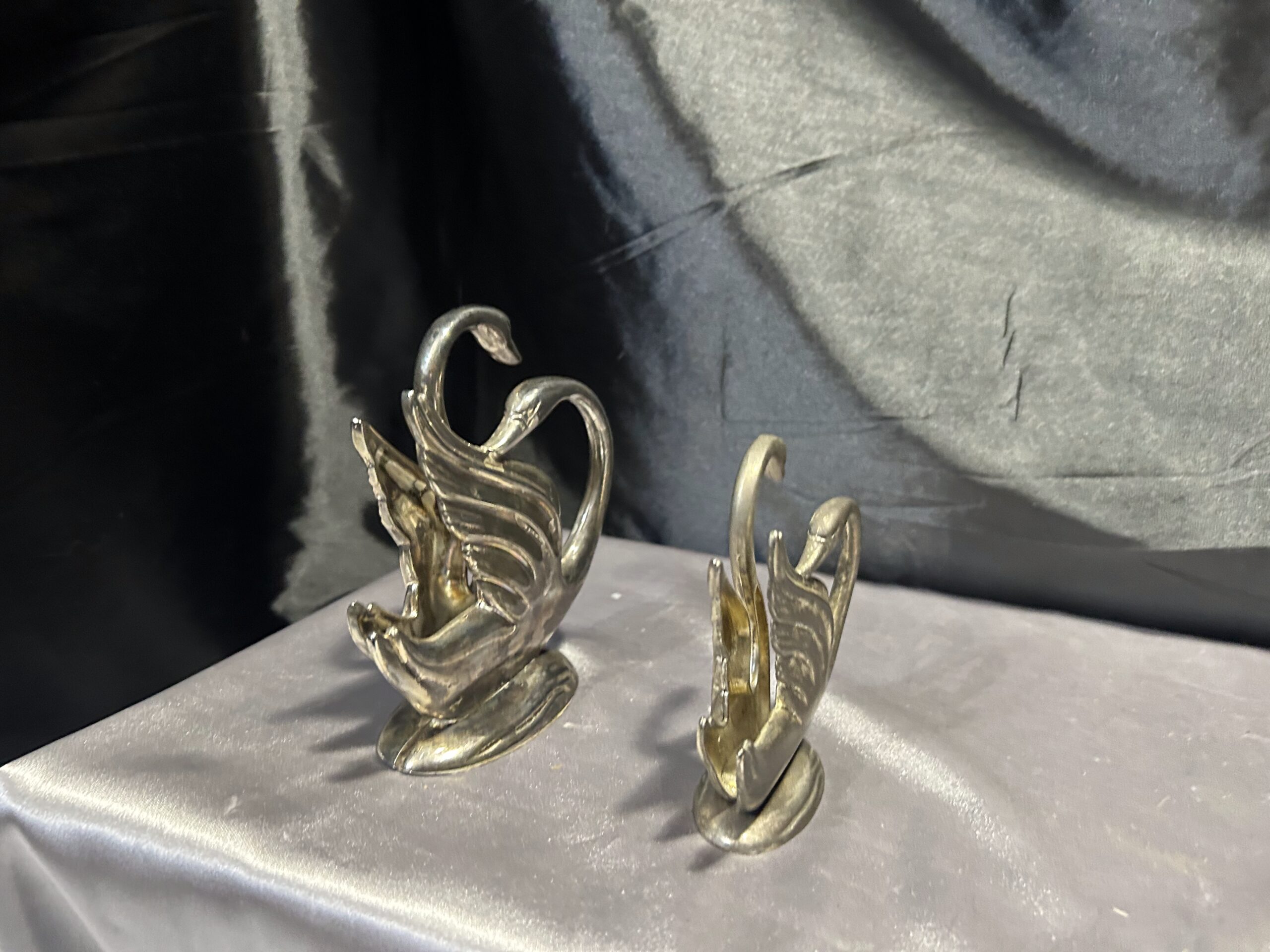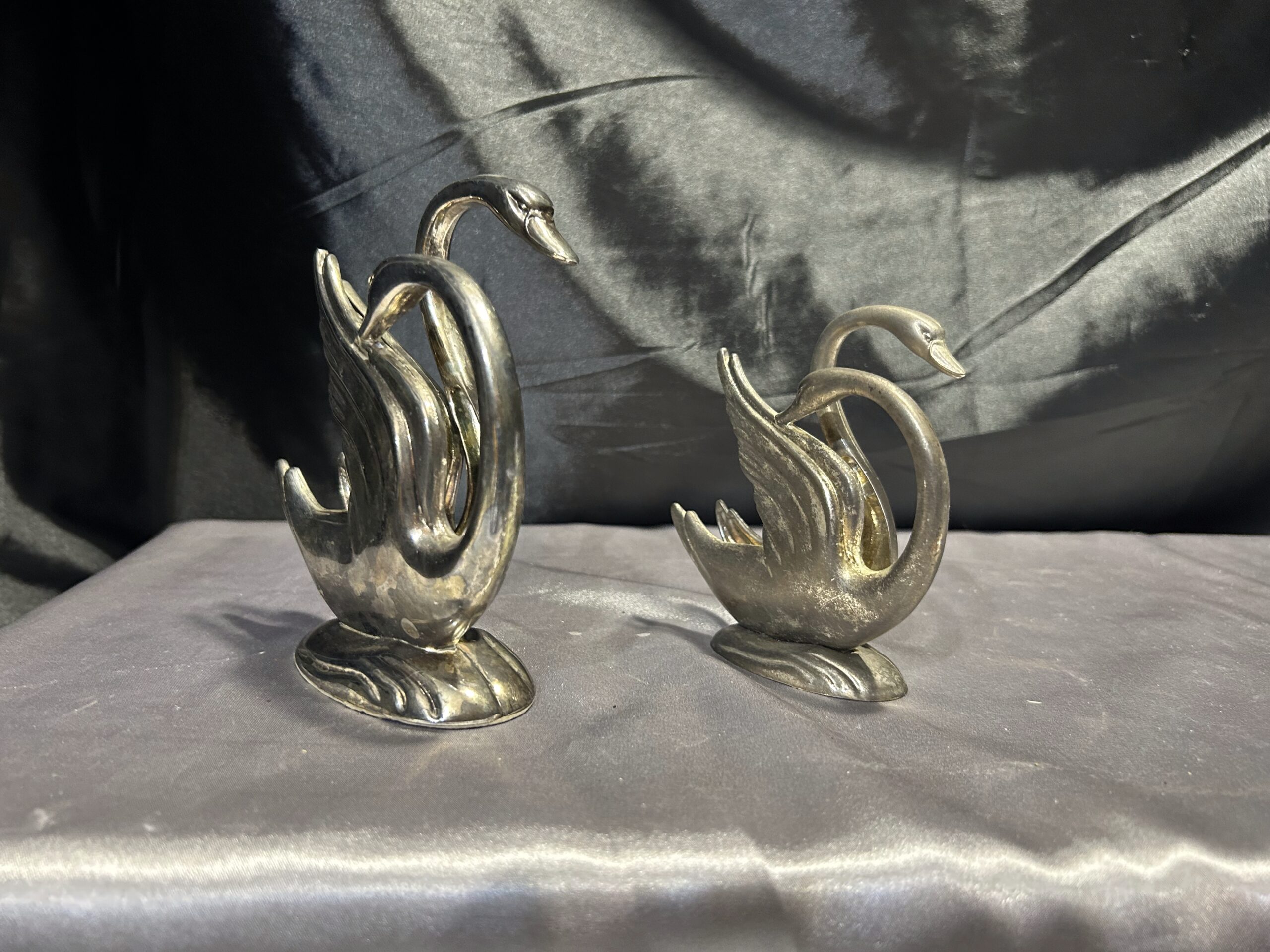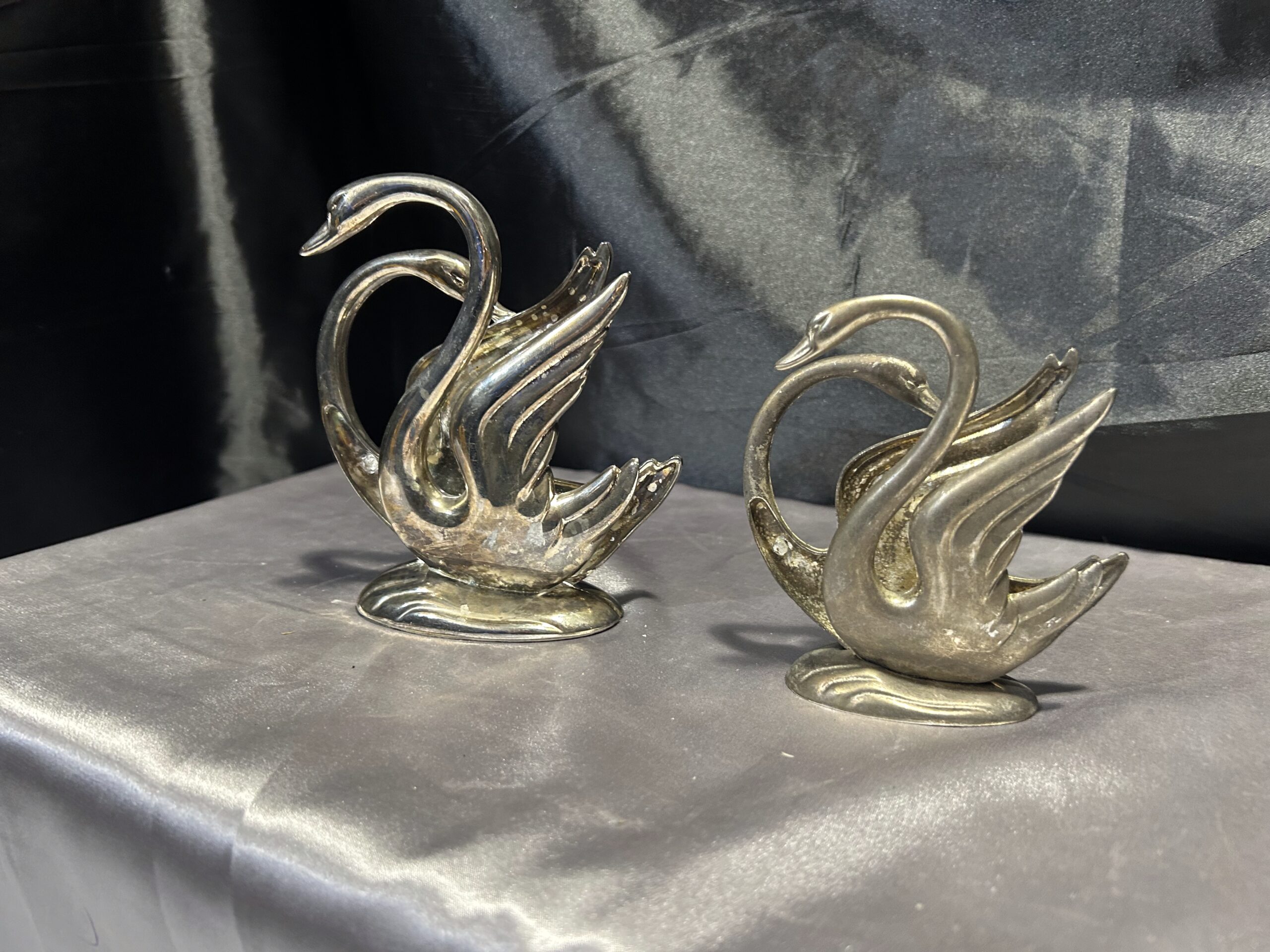 Stylowy zestaw dwóch serwetników w formie łabędzi, prawdopodobnie posrebrzanych, które dodadzą elegancji każdemu nakryciu stołu. Pięknie wykonane, z dbałością o detale, świetnie sprawdzą się zarówno w codziennym użytkowaniu, jak i jako ozdobny element stołowej aranżacji.