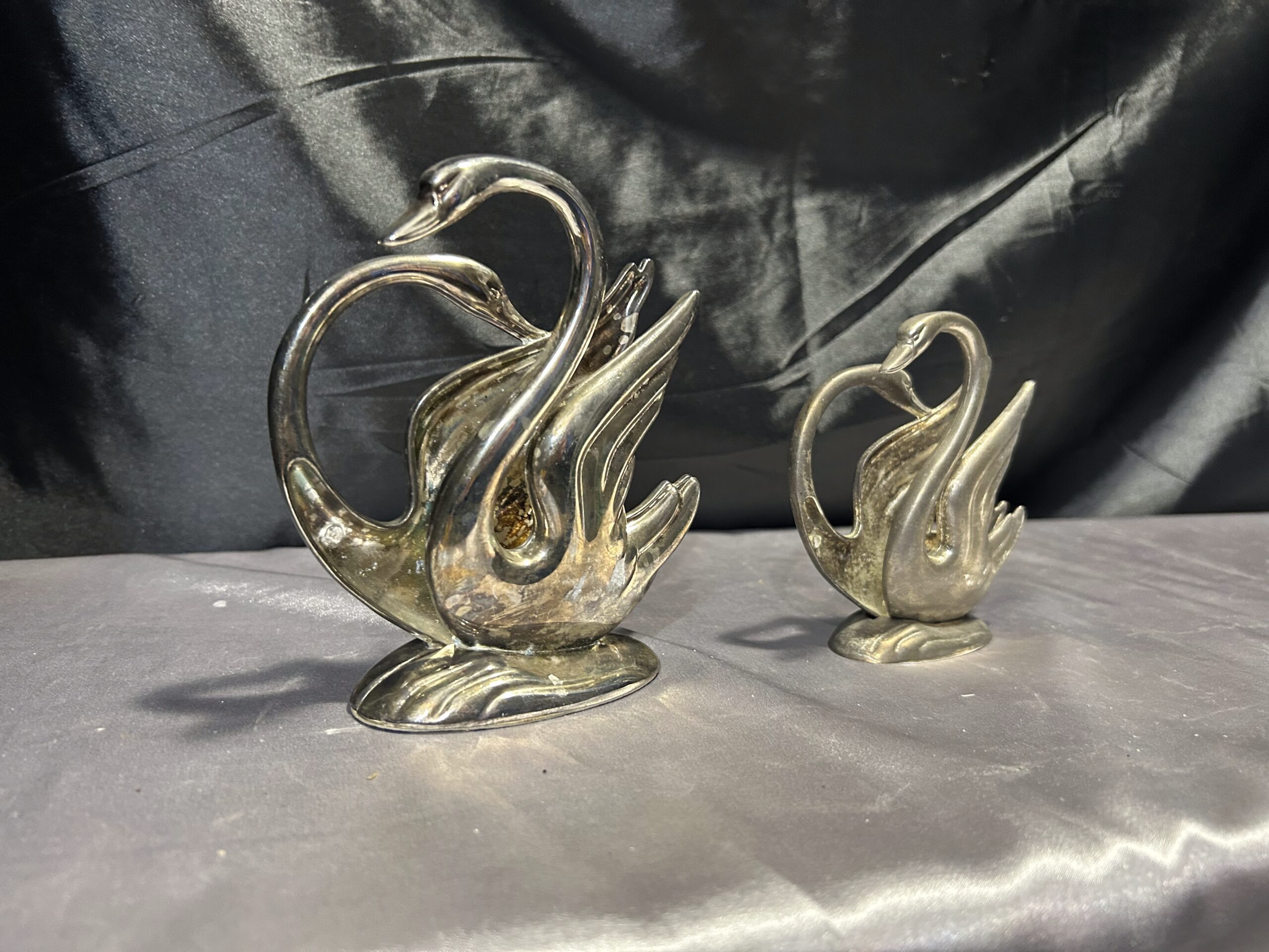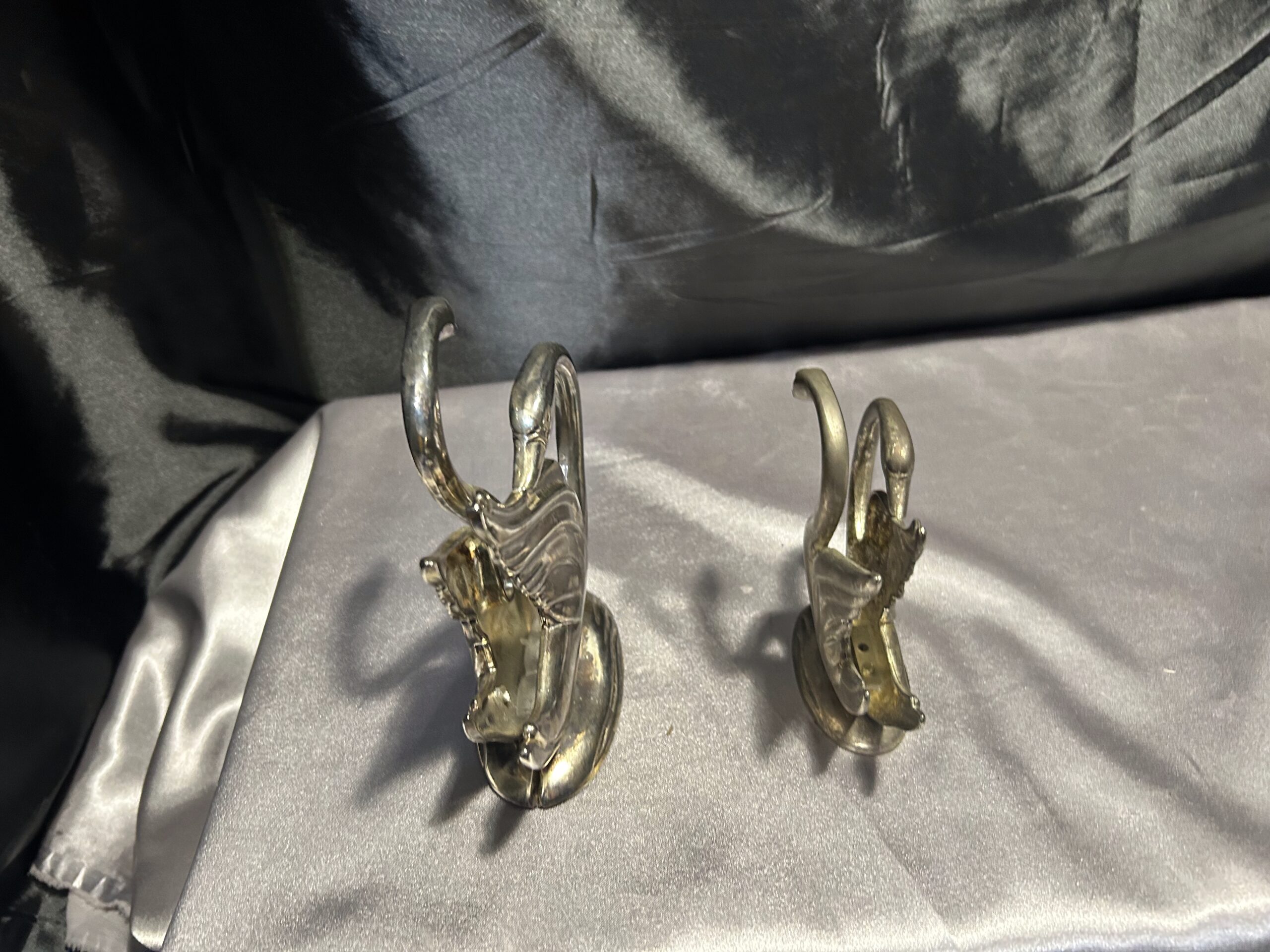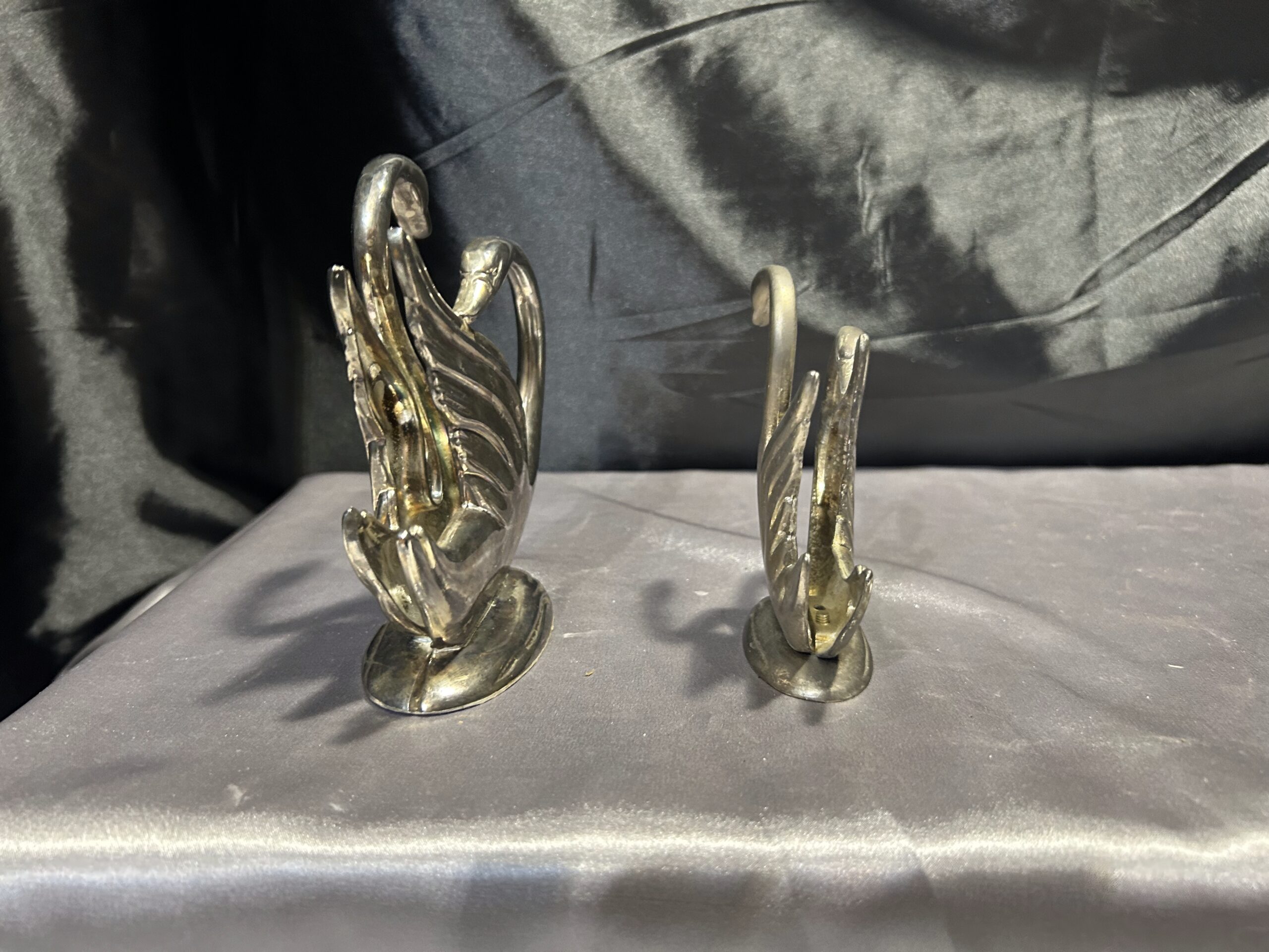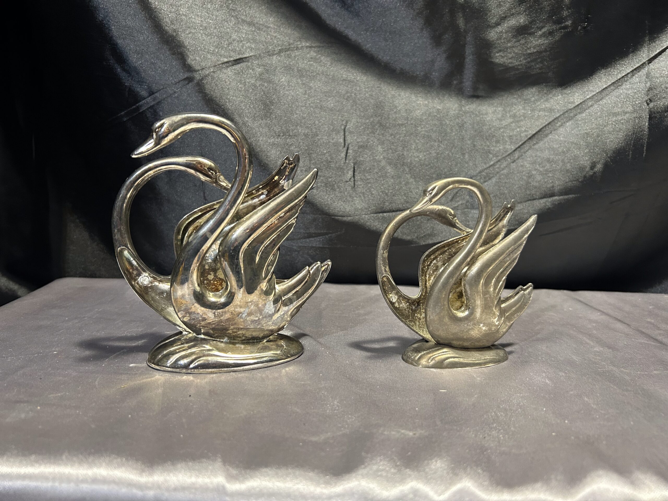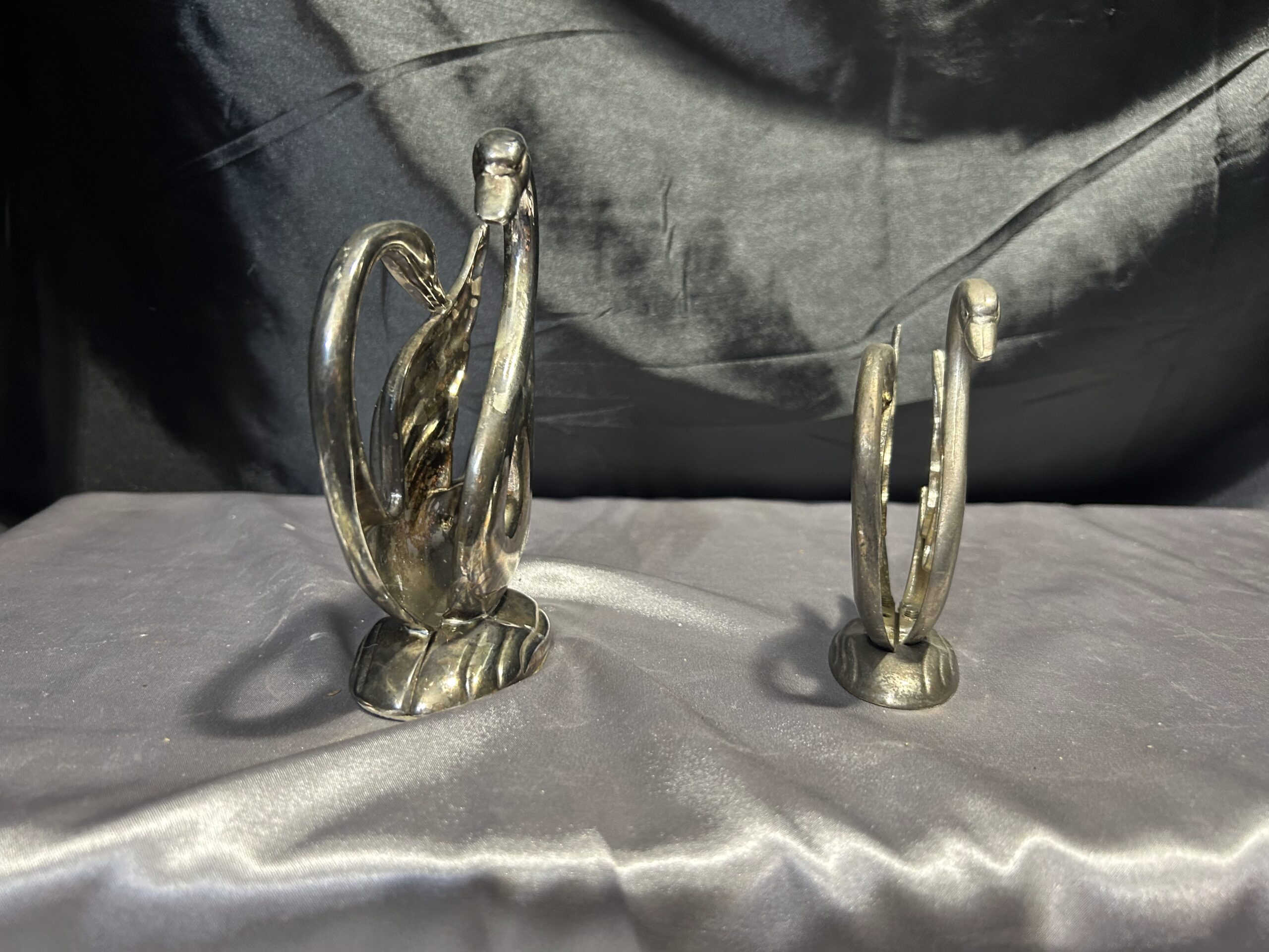 Stylowy zestaw dwóch serwetników w formie łabędzi, prawdopodobnie posrebrzanych, które dodadzą elegancji każdemu nakryciu stołu. Pięknie wykonane, z dbałością o detale, świetnie sprawdzą się zarówno w codziennym użytkowaniu, jak i jako ozdobny element stołowej aranżacji.