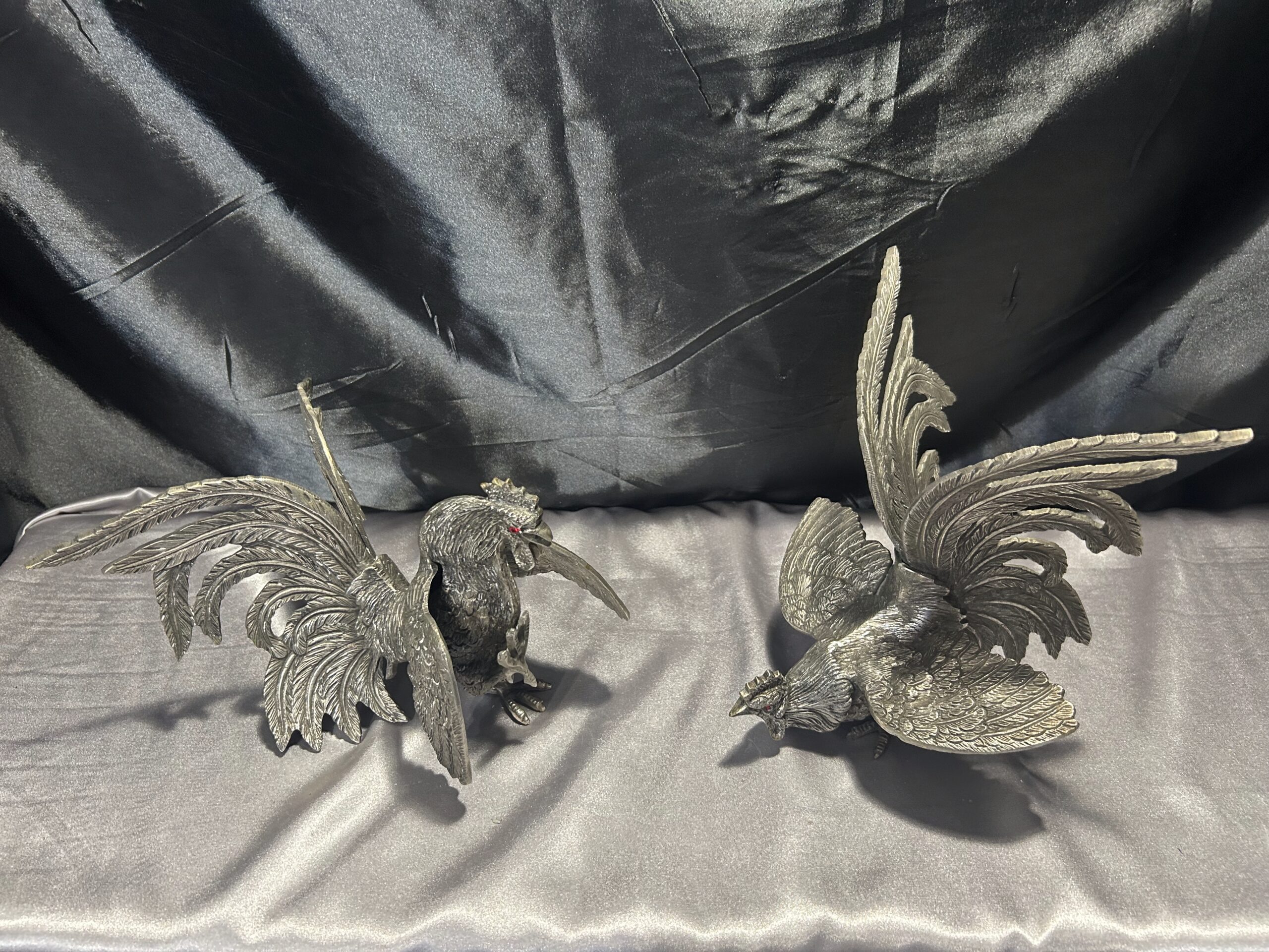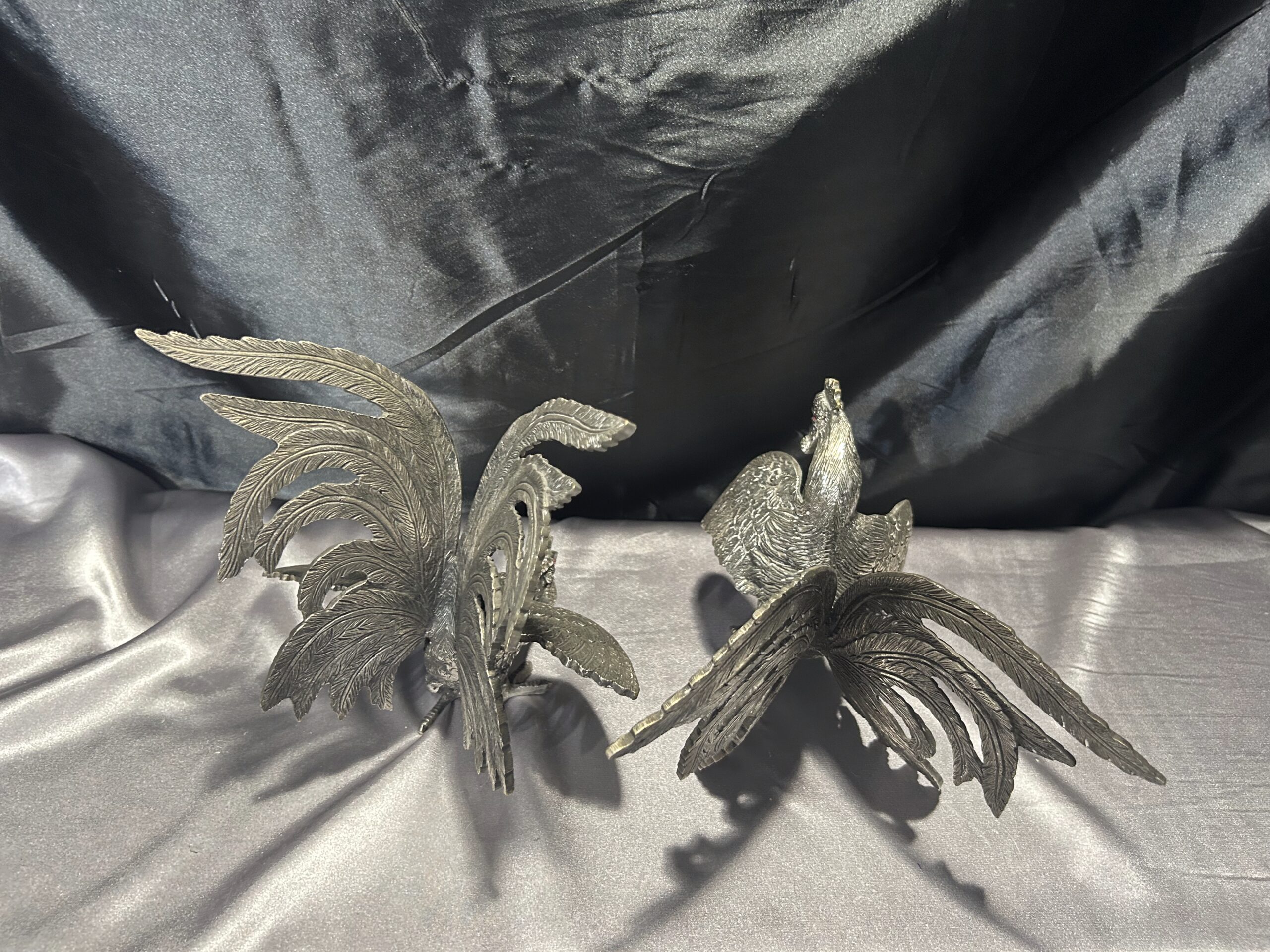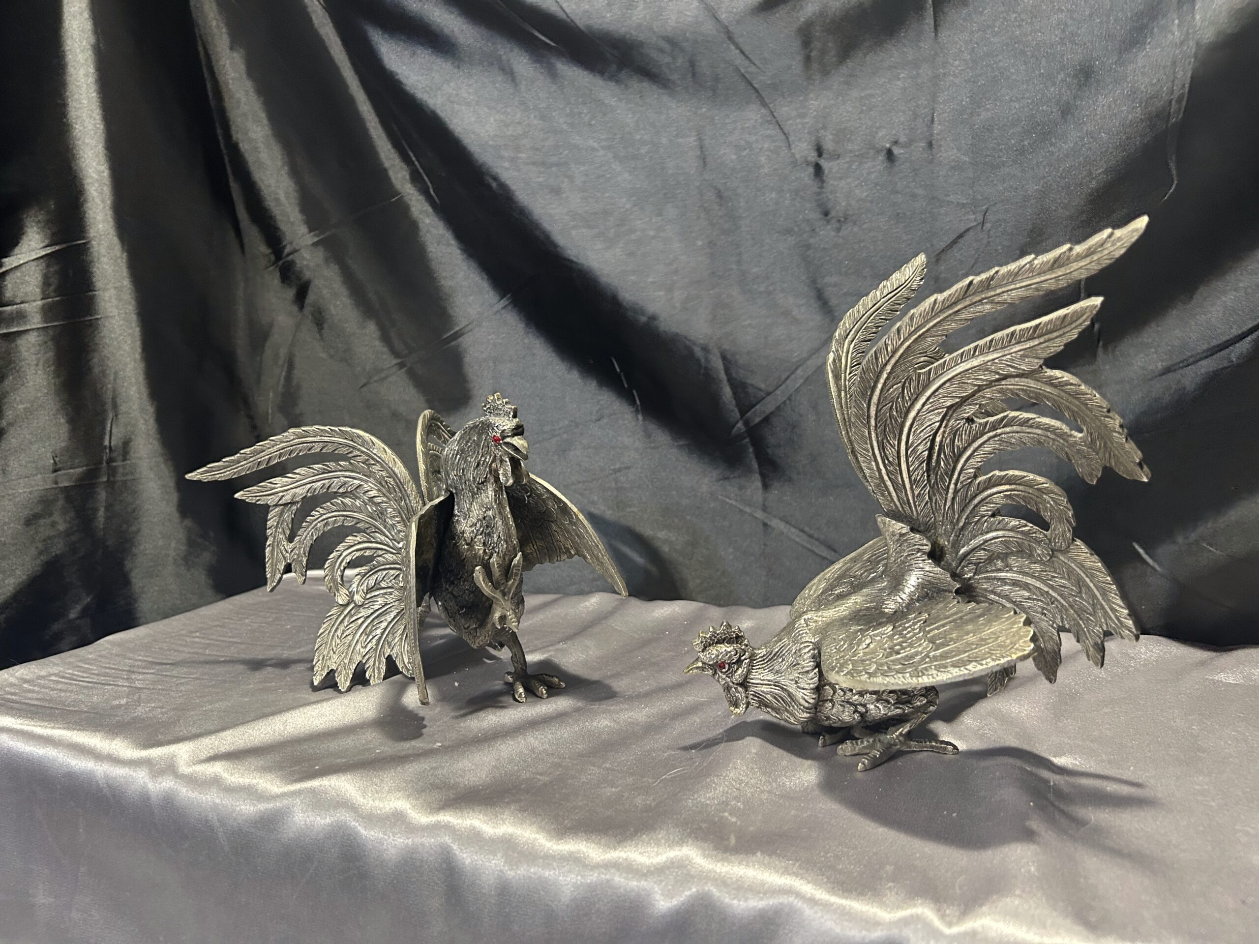 Zestaw Dwóch Walczących Kogutów – Mosiężne Figury w Srebrnym Kolorze