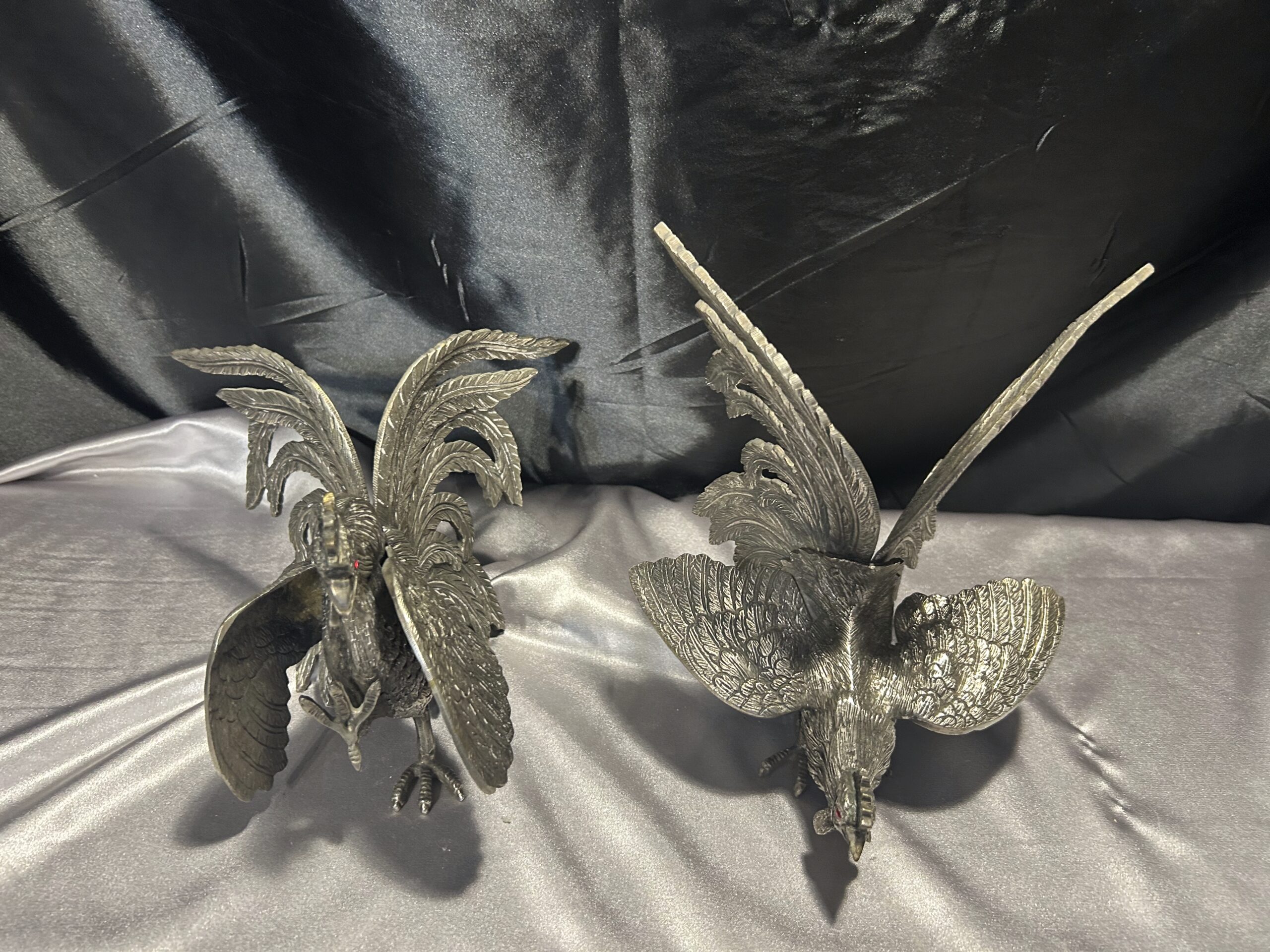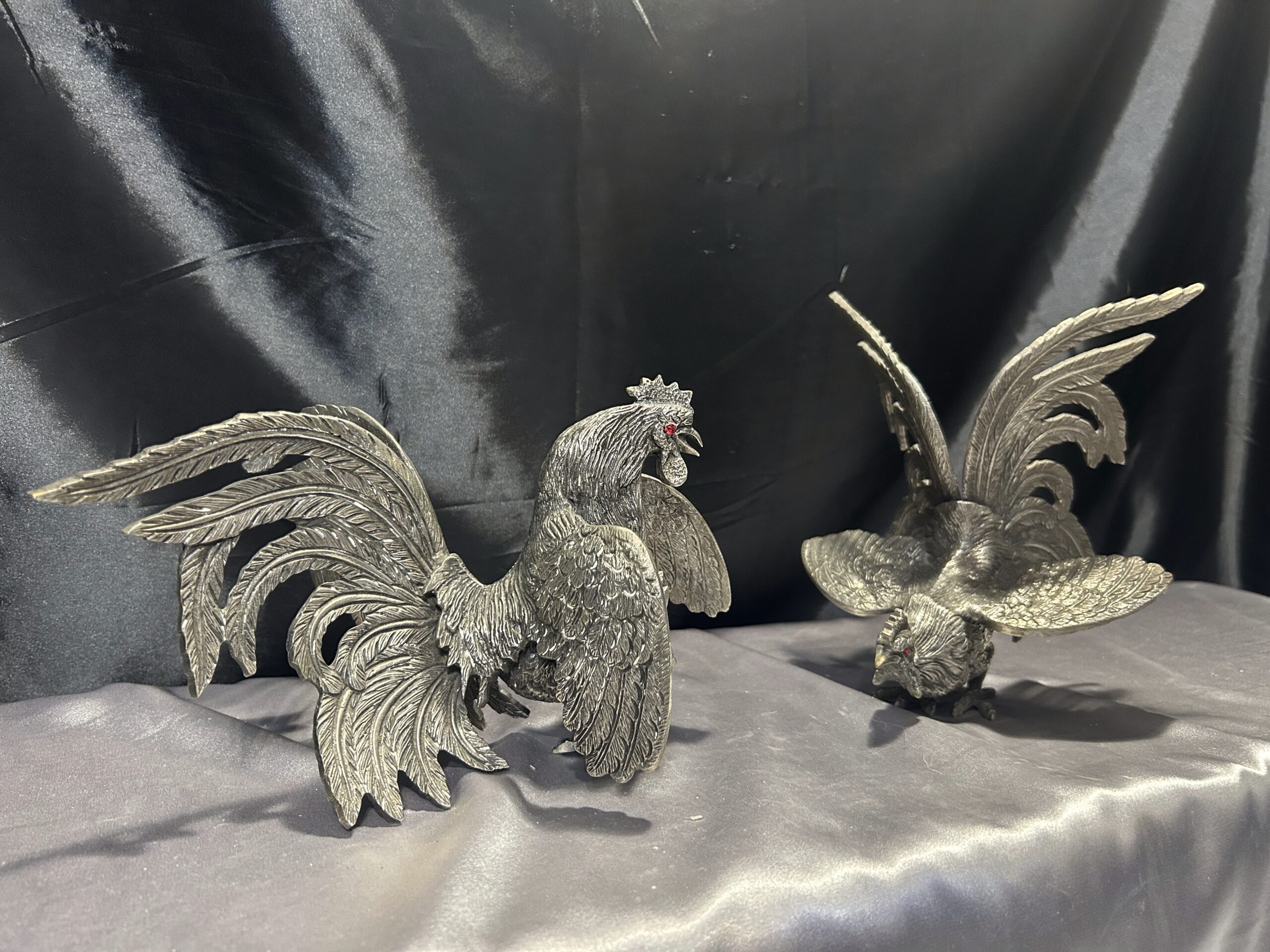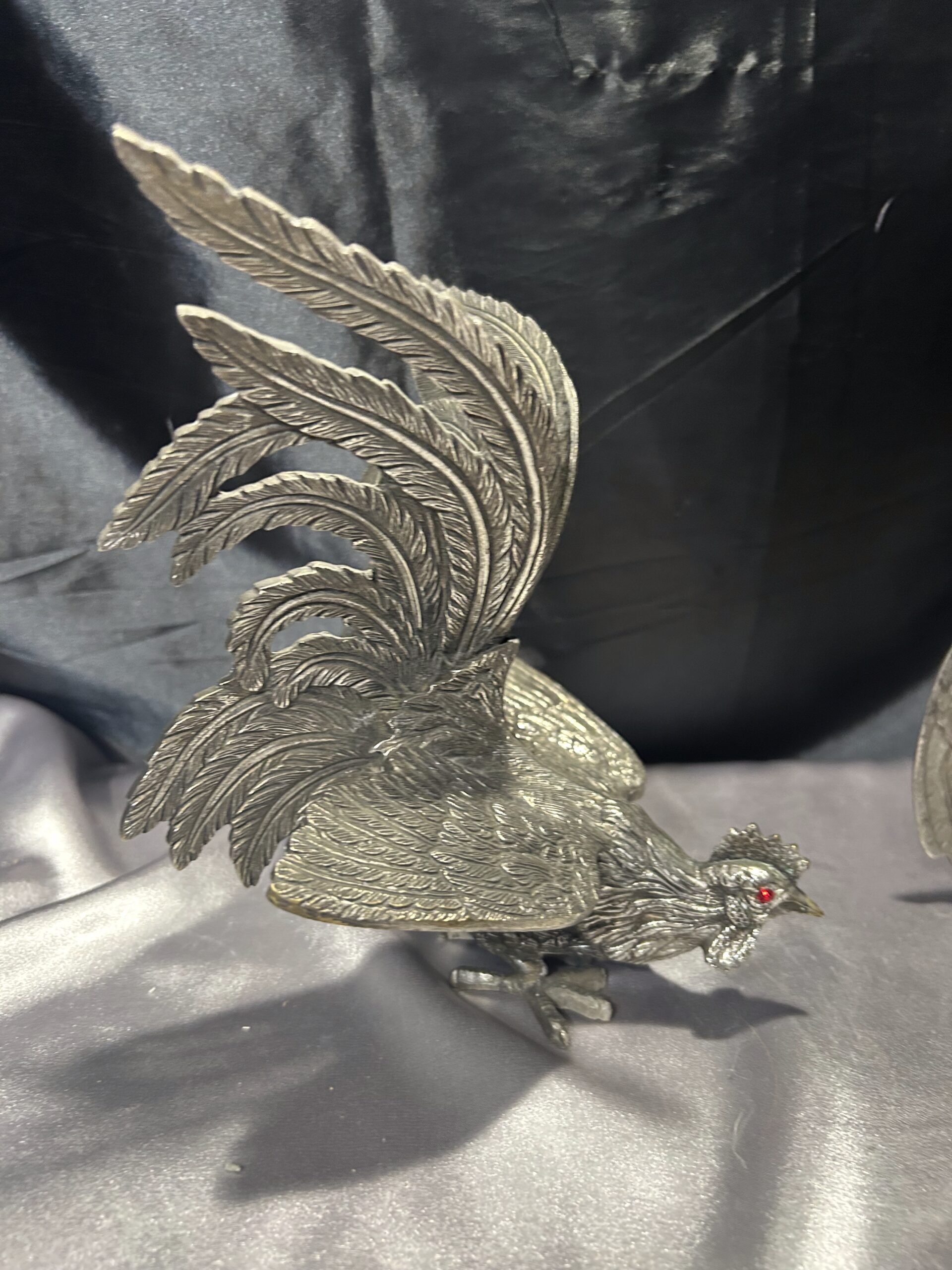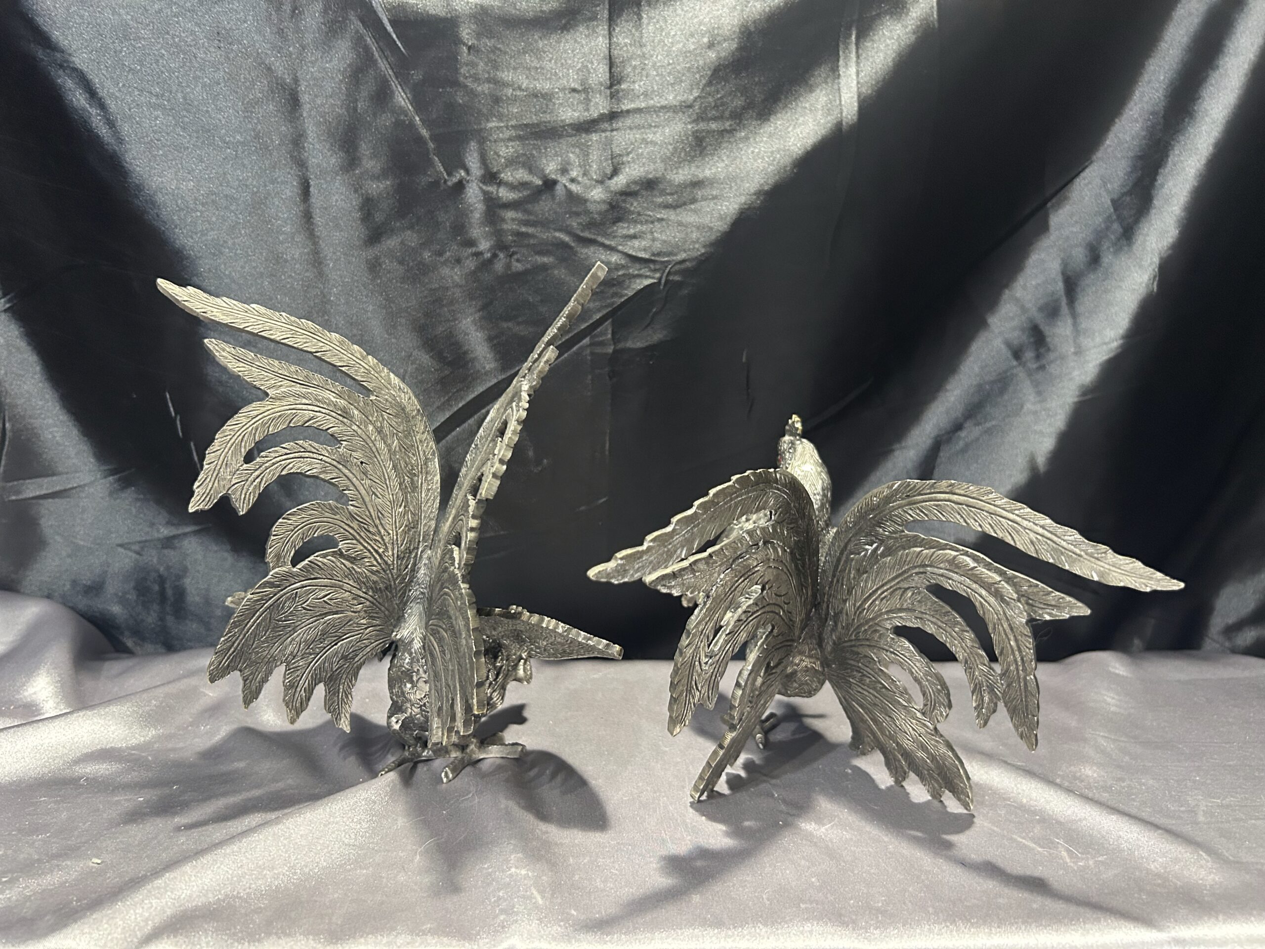 Zestaw Dwóch Walczących Kogutów – Mosiężne Figury w Srebrnym Kolorze