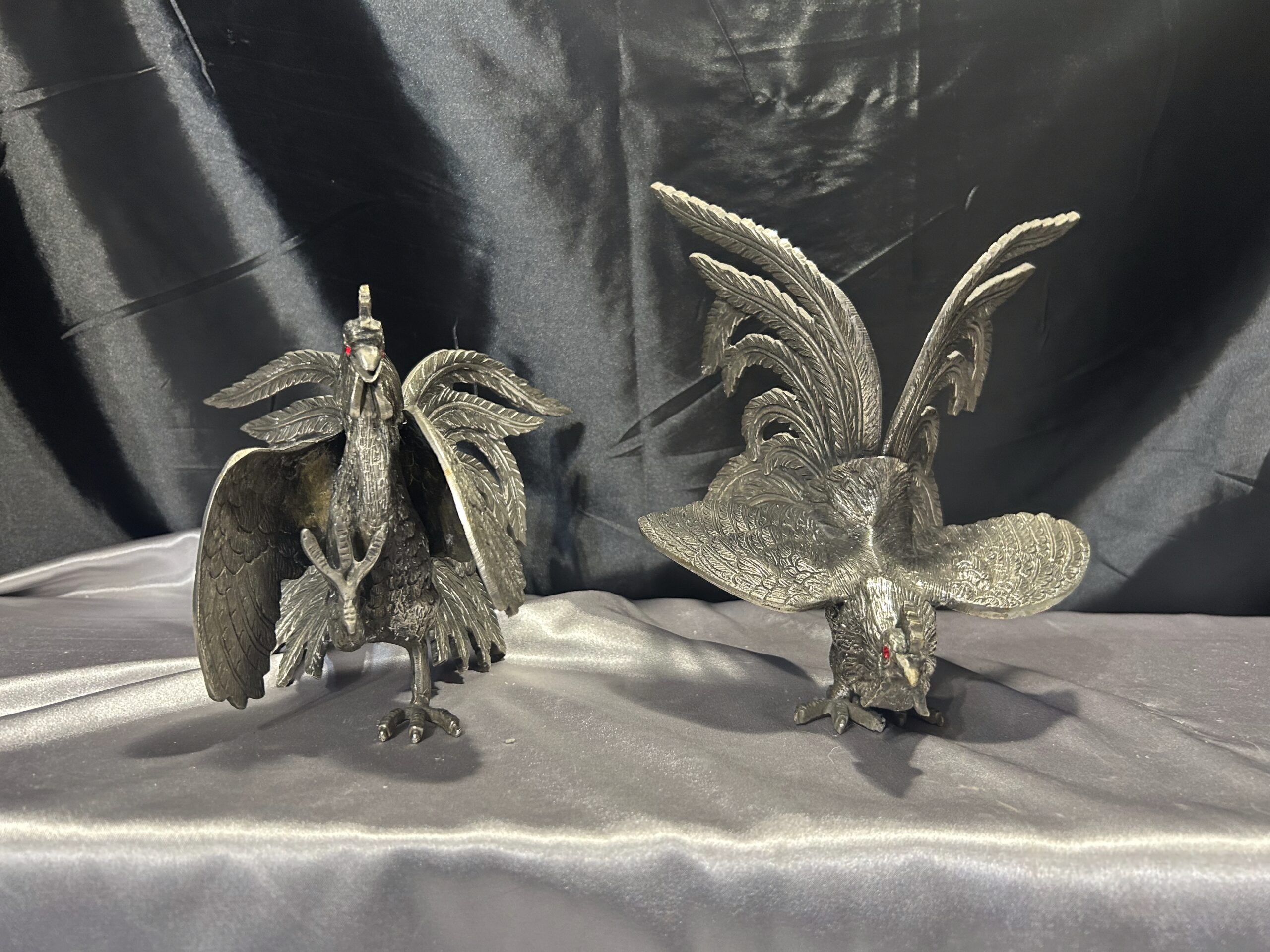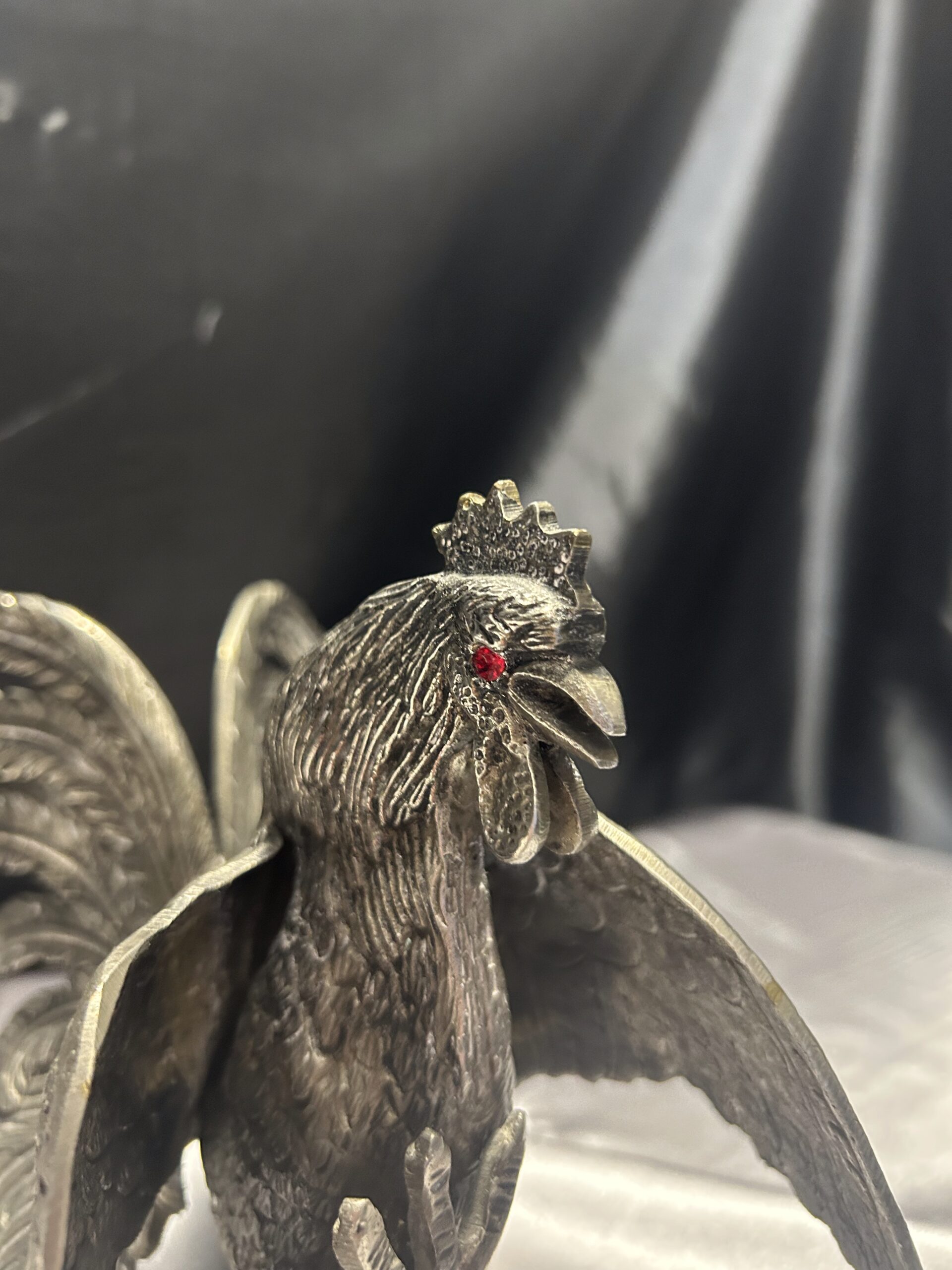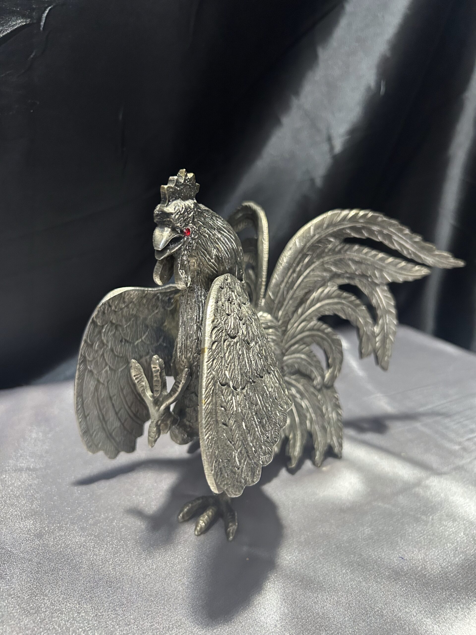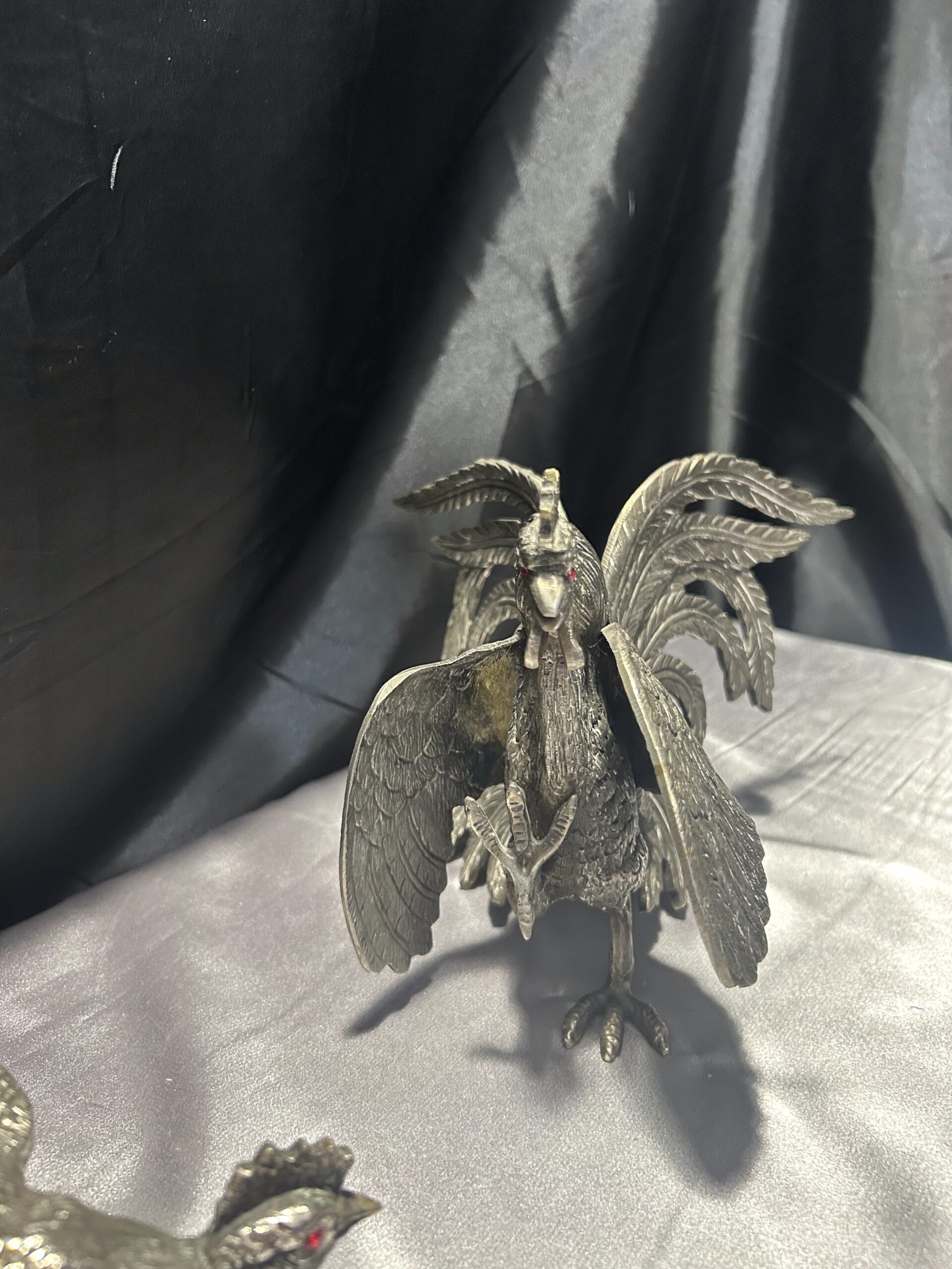 Prezentujemy imponujący zestaw dwóch walczących kogutów, wykonanych z mosiądzu pobiał, co nadaje im srebrzysty odcień i elegancki wygląd. Figury zachwycają realistycznym wykonaniem, a oczy z czerwonych cyrkonii dodają im wyjątkowego charakteru i wyrazistości. To unikalne dzieło sztuki rzemieślniczej, które doskonale sprawdzi się jako dekoracja wnętrza lub ekskluzywny element kolekcji.