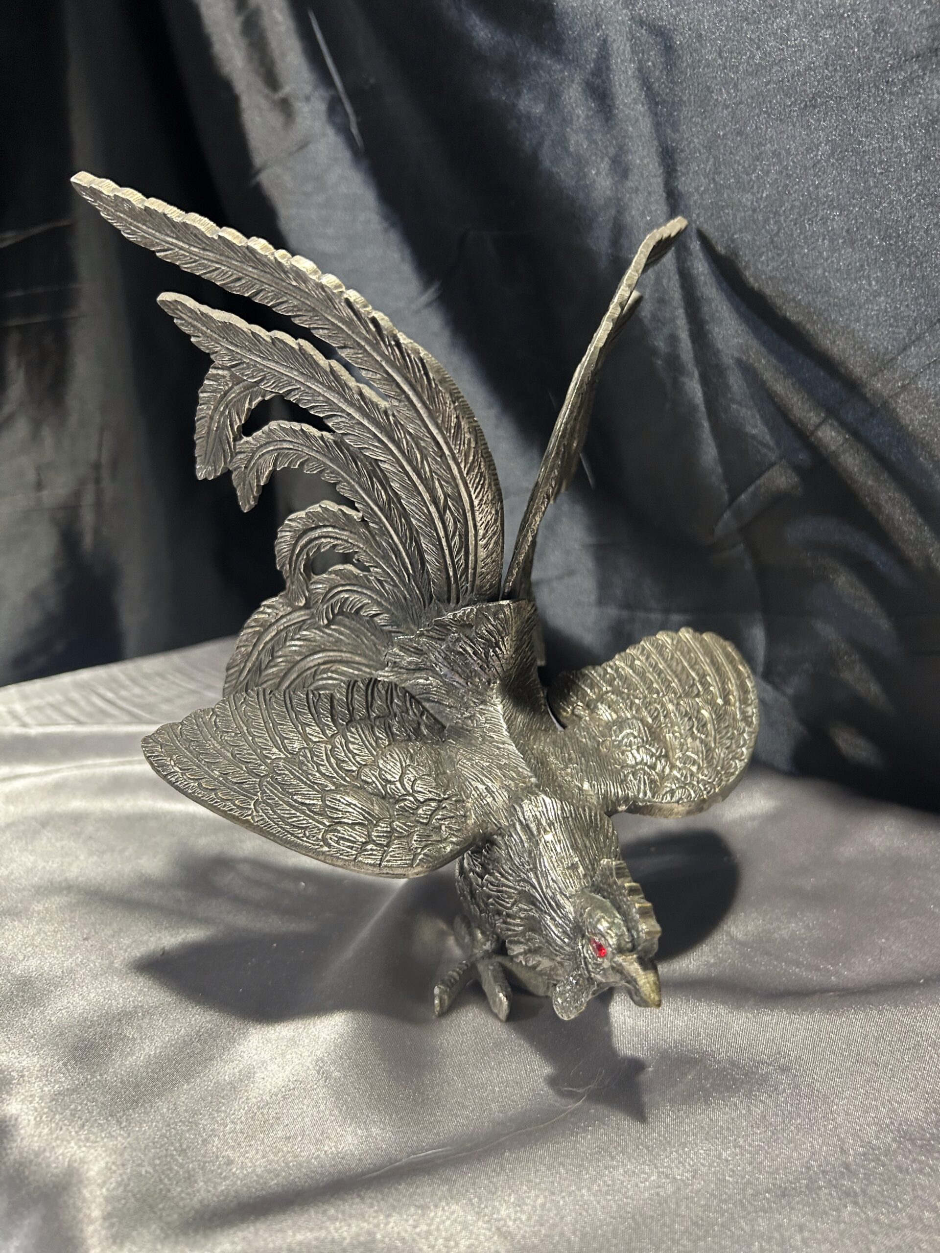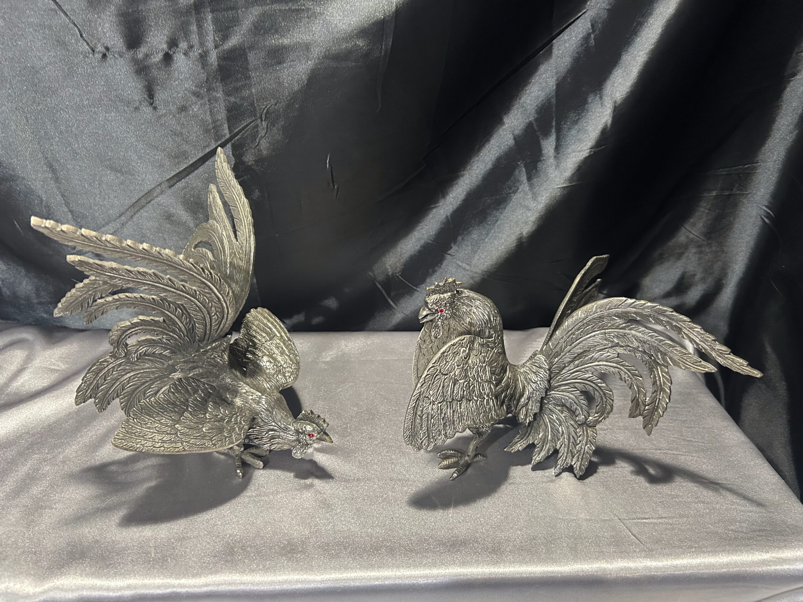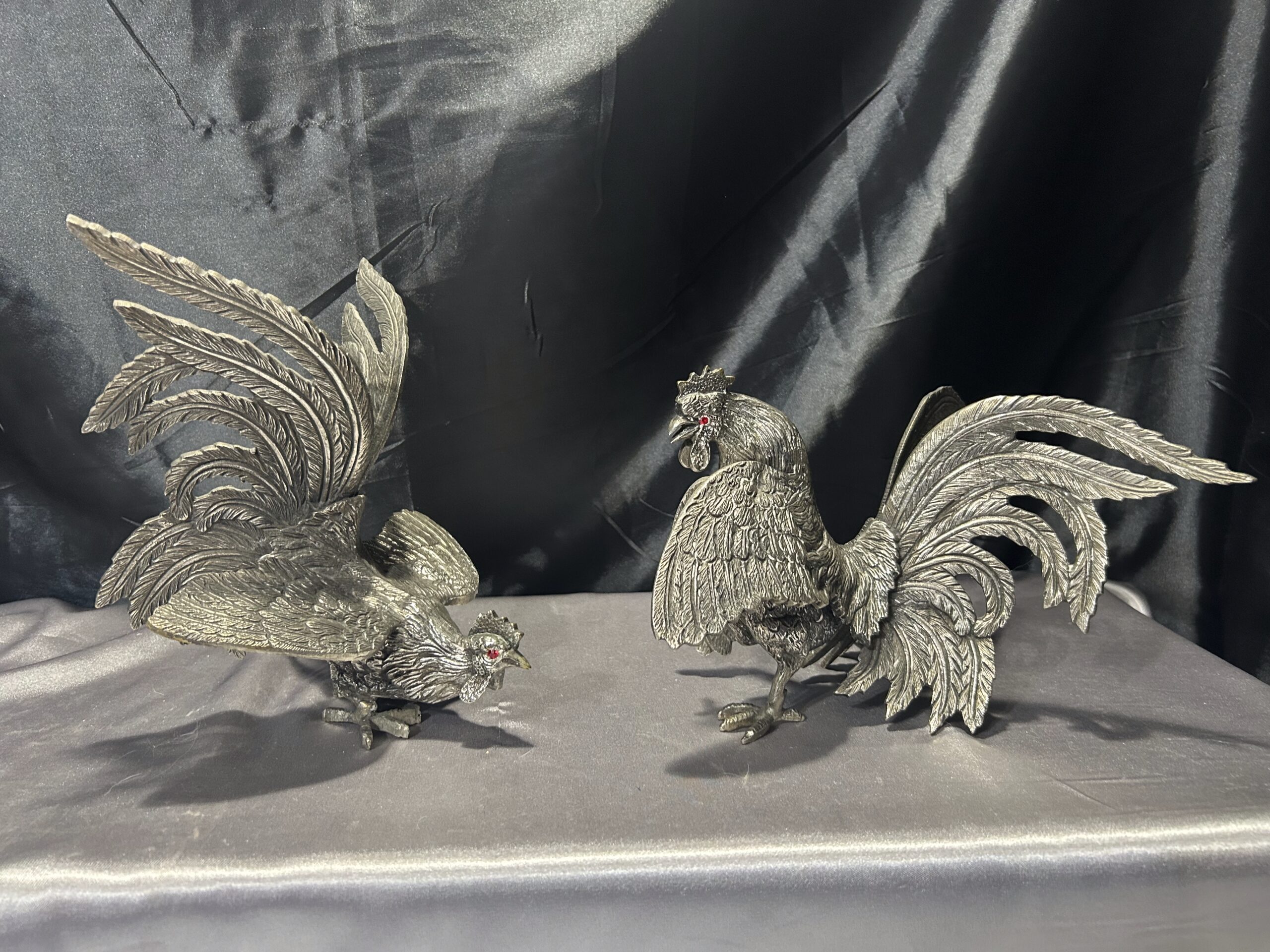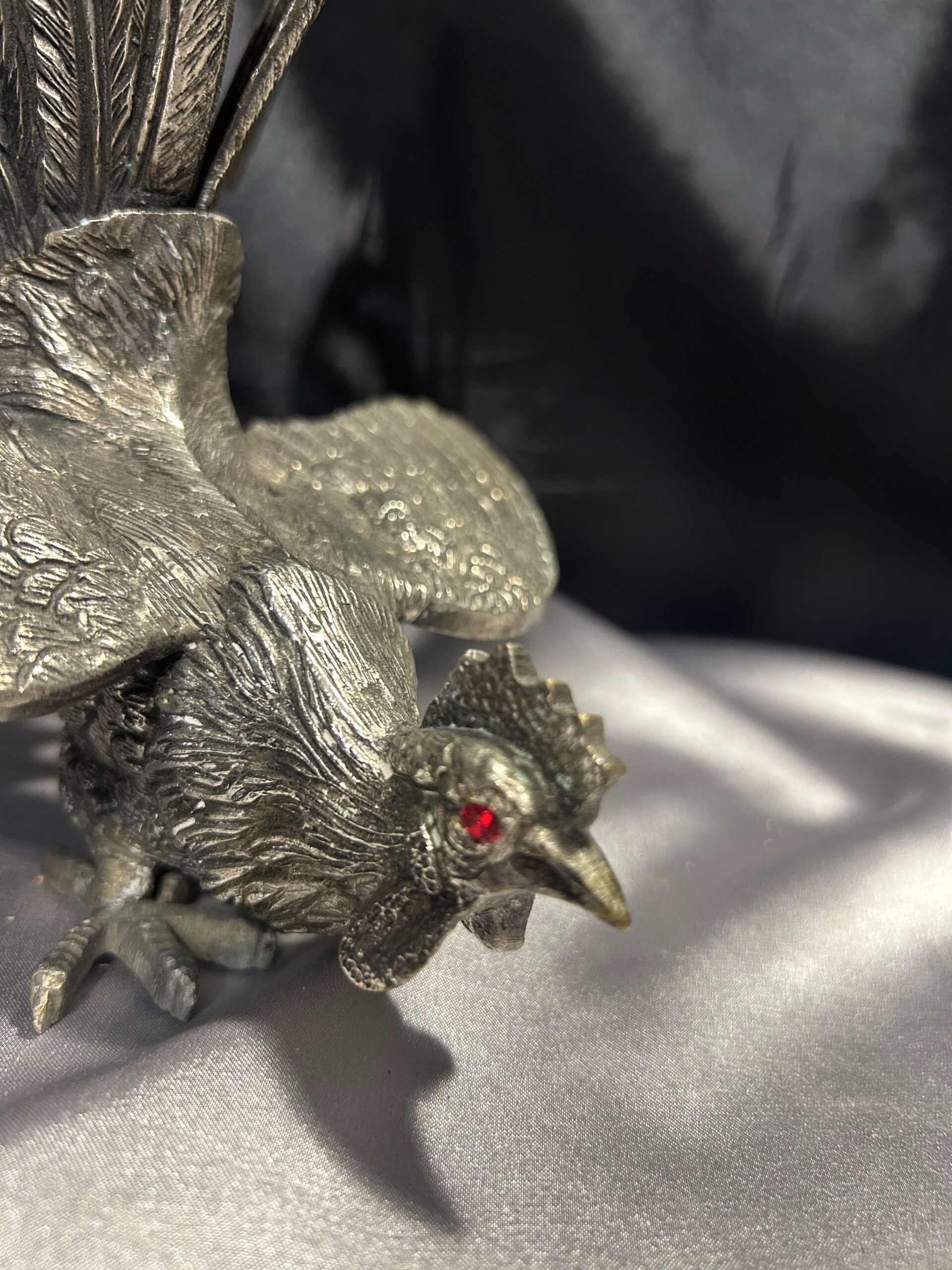 Prezentujemy imponujący zestaw dwóch walczących kogutów, wykonanych z mosiądzu pobiał, co nadaje im srebrzysty odcień i elegancki wygląd. Figury zachwycają realistycznym wykonaniem, a oczy z czerwonych cyrkonii dodają im wyjątkowego charakteru i wyrazistości. To unikalne dzieło sztuki rzemieślniczej, które doskonale sprawdzi się jako dekoracja wnętrza lub ekskluzywny element kolekcji.