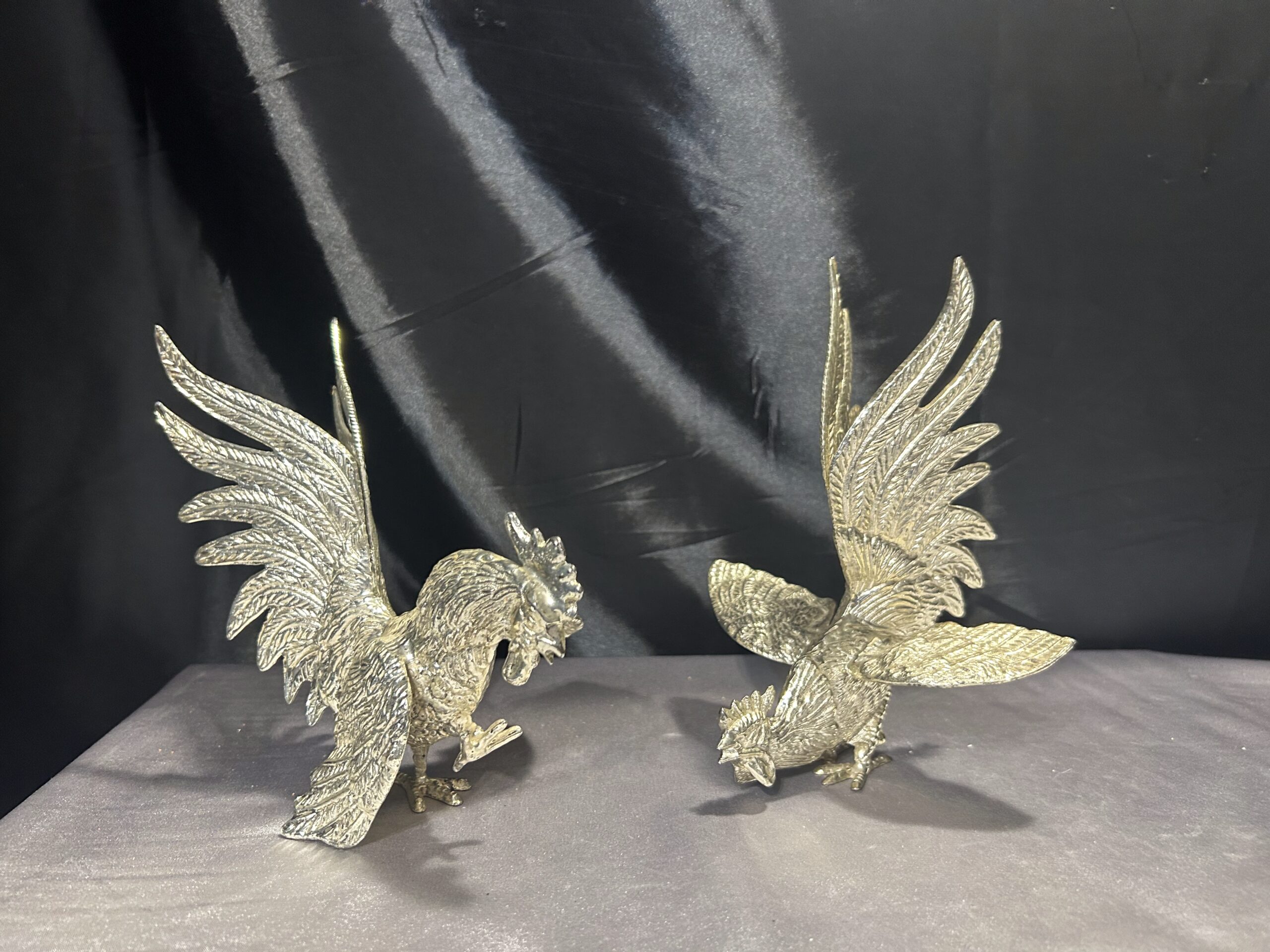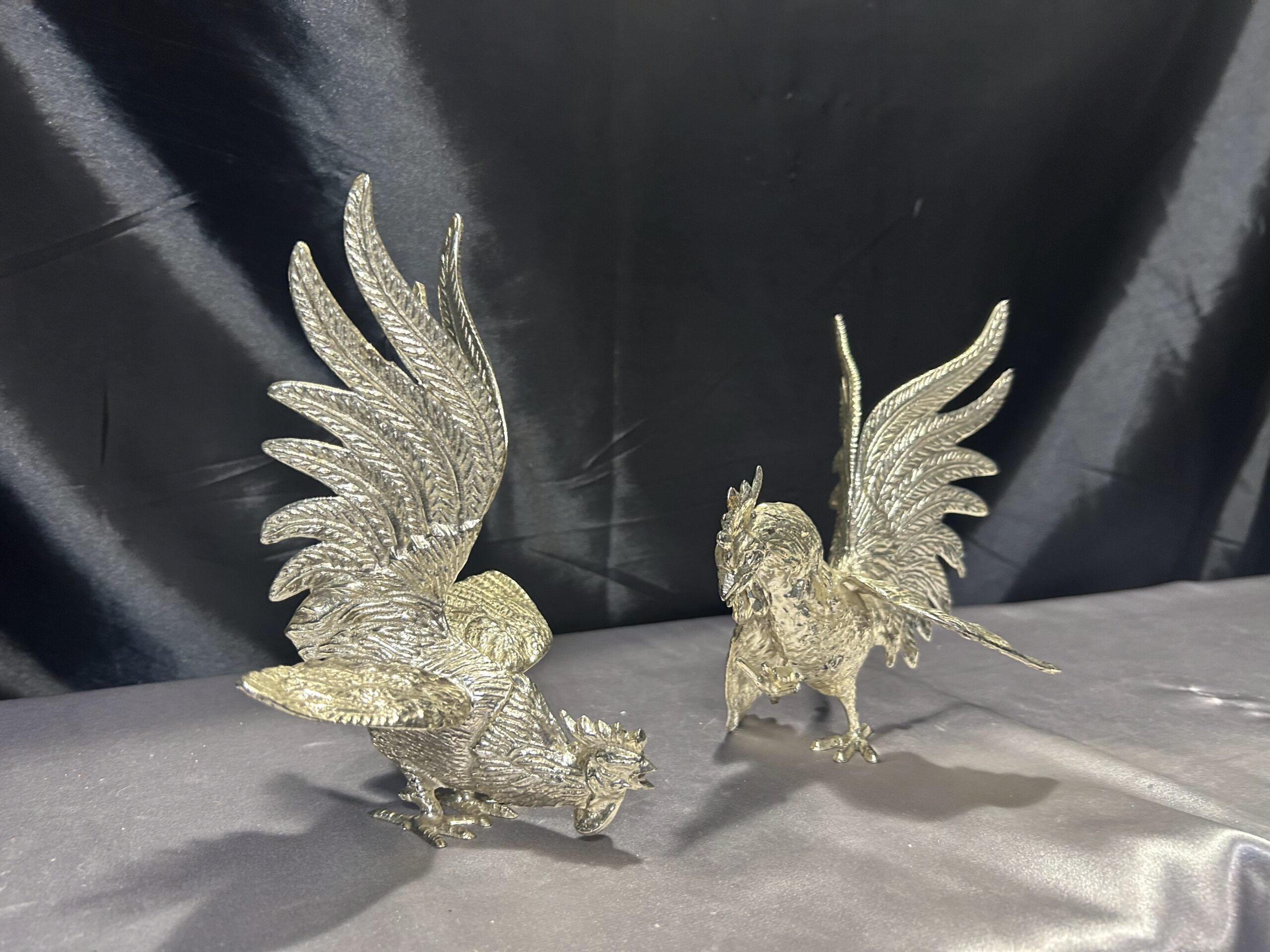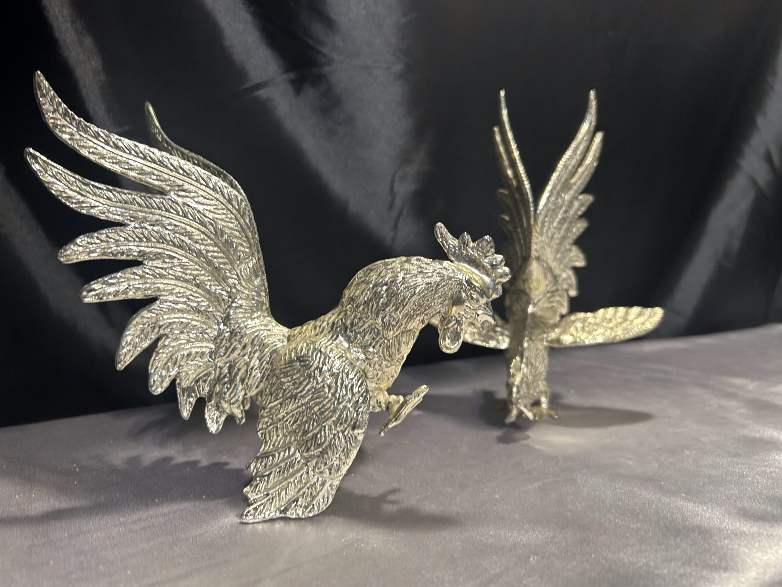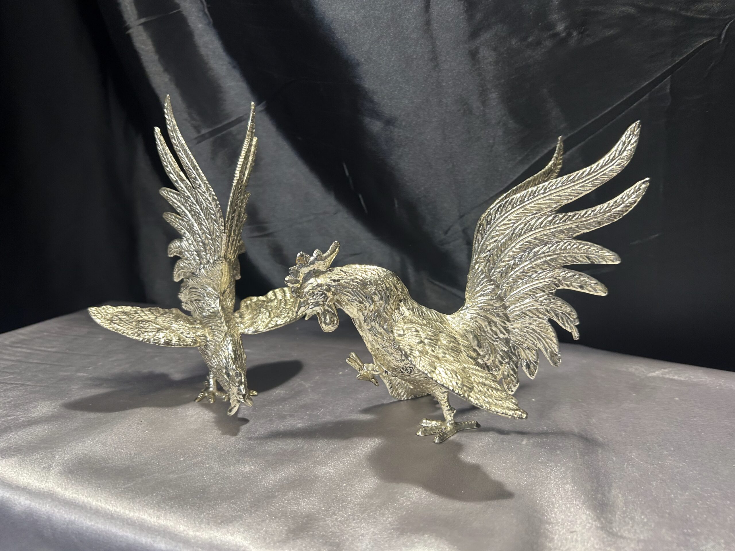 Zestaw Dwóch Walczących Kogutów – Mosiężne Figury w Srebrnym Odcieniu