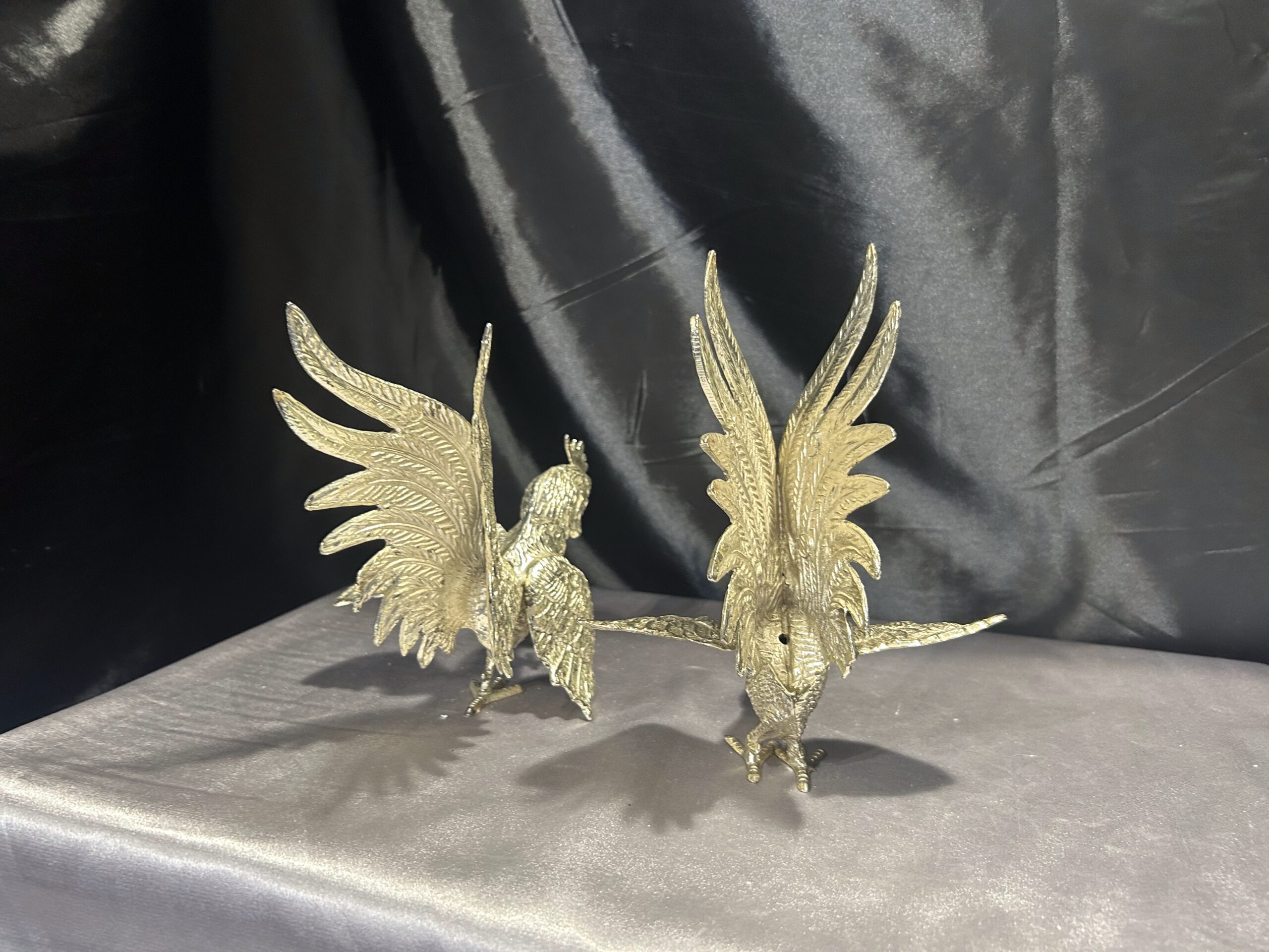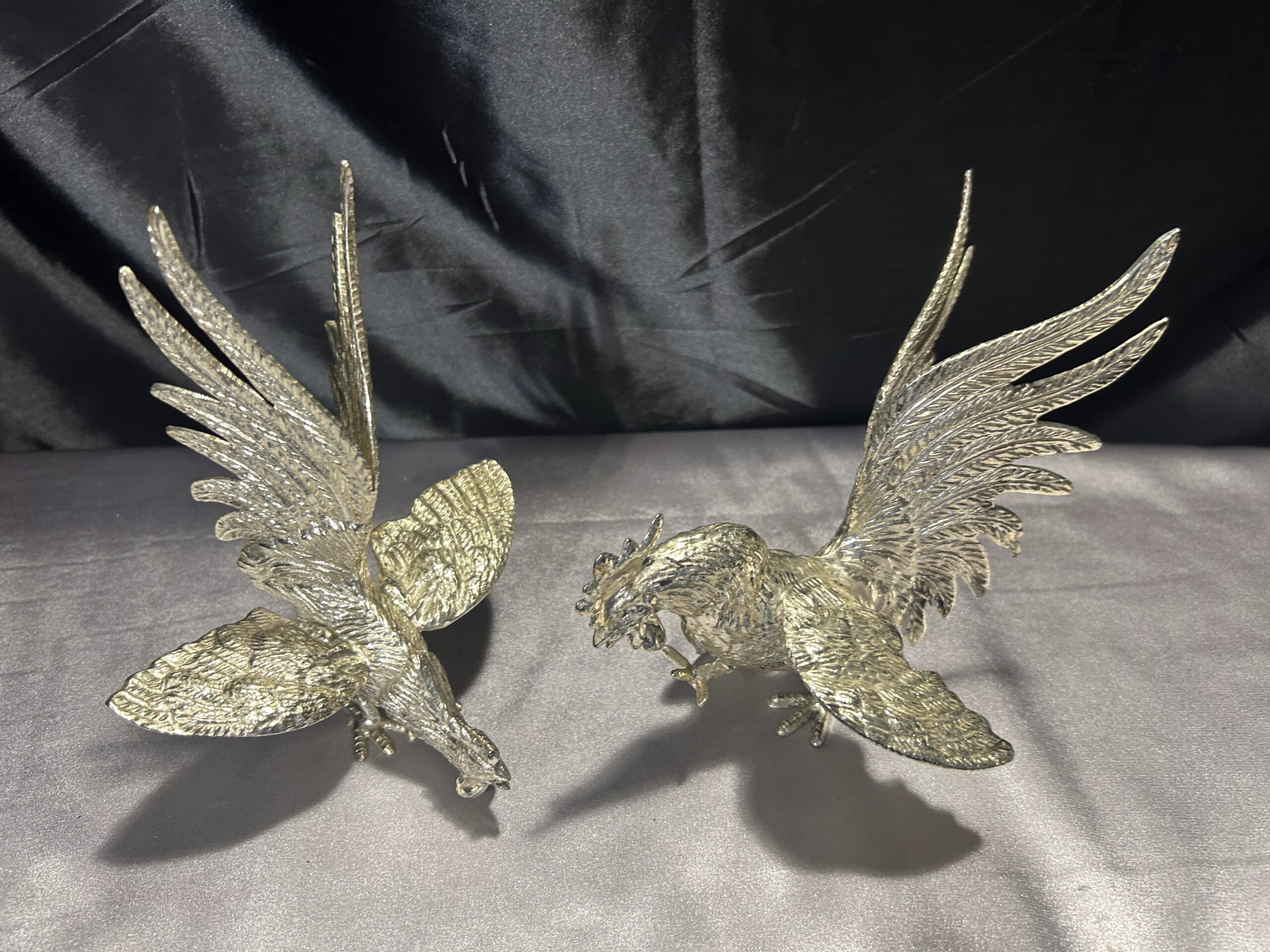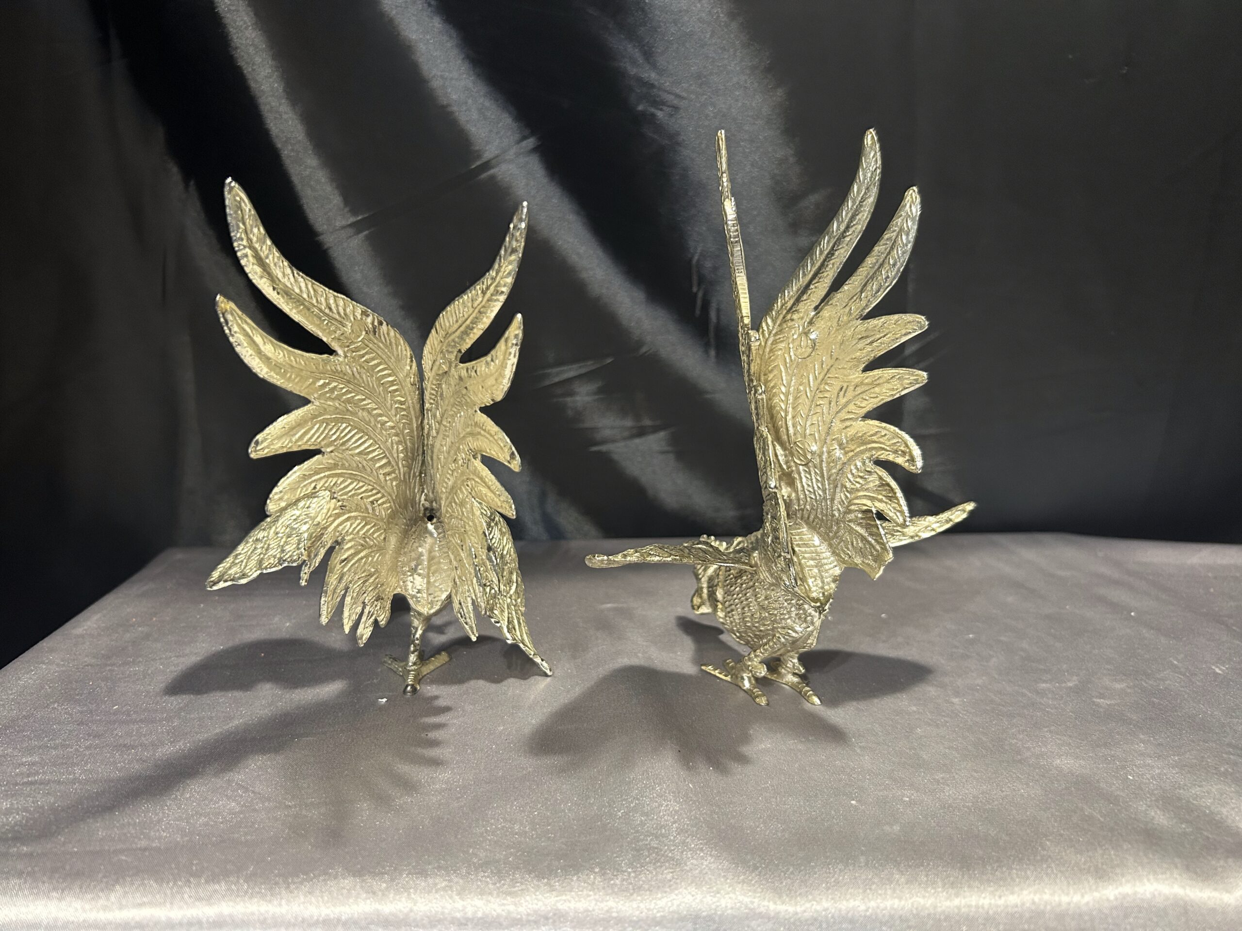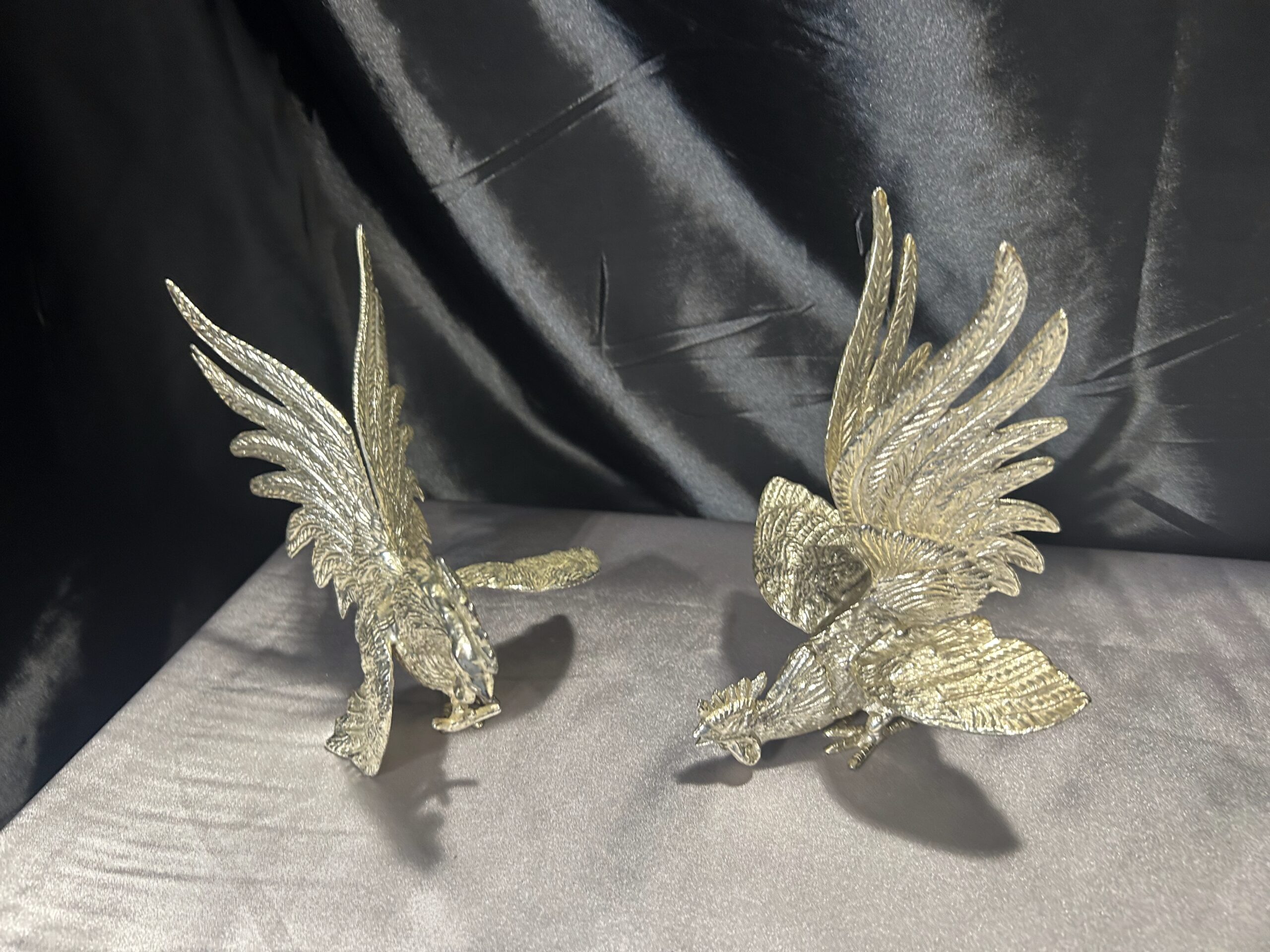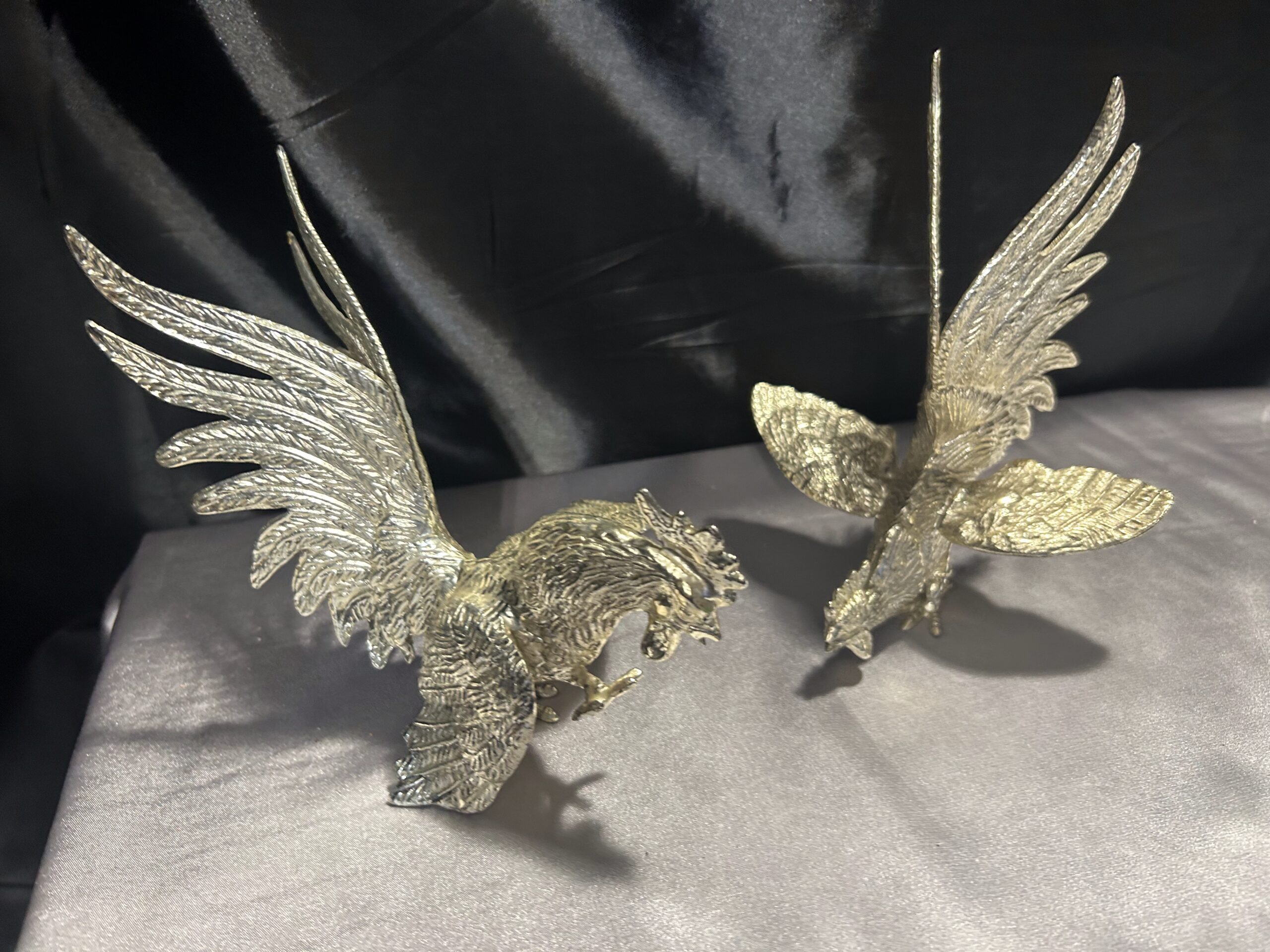 Zestaw Dwóch Walczących Kogutów – Mosiężne Figury w Srebrnym Odcieniu