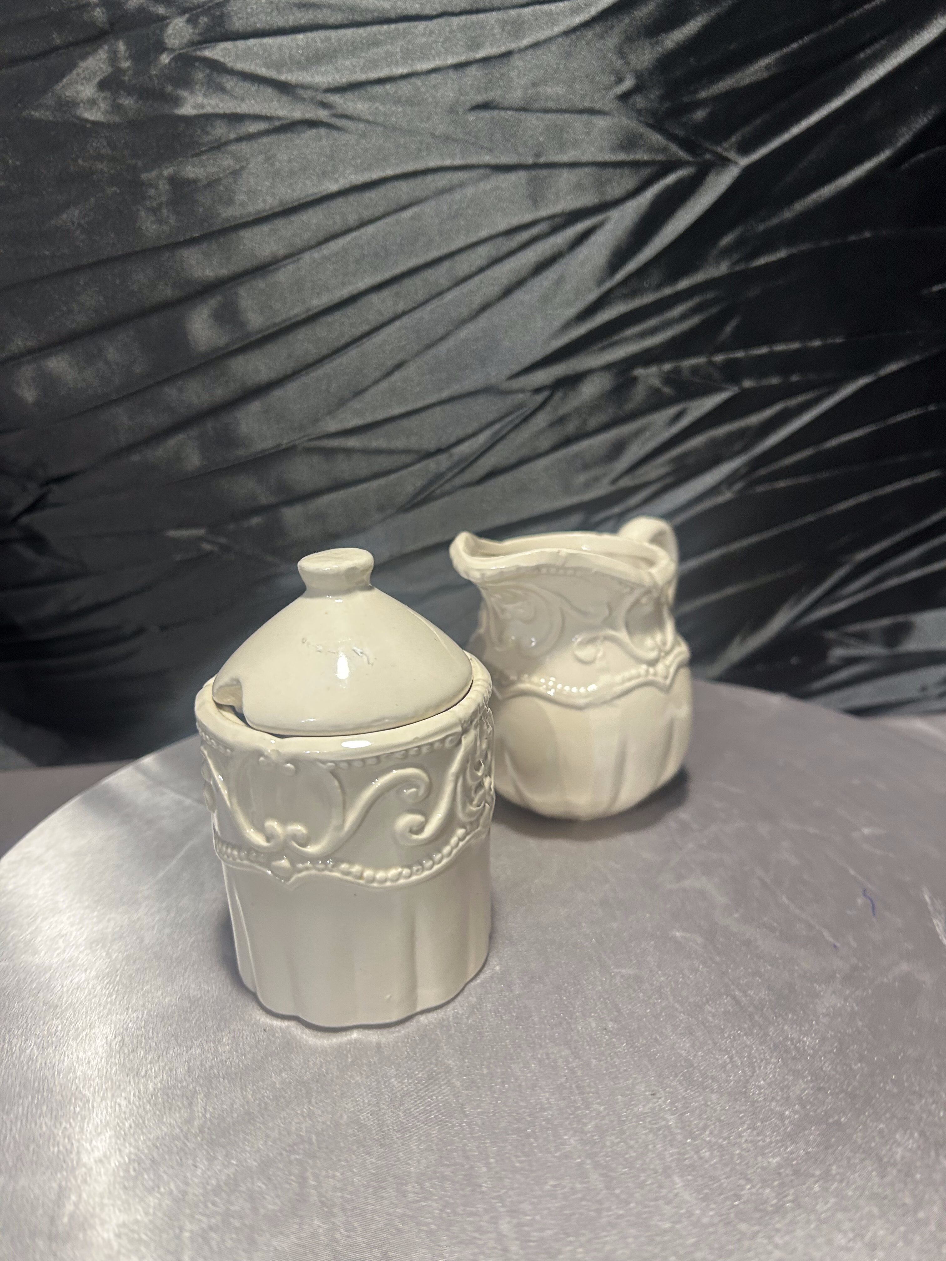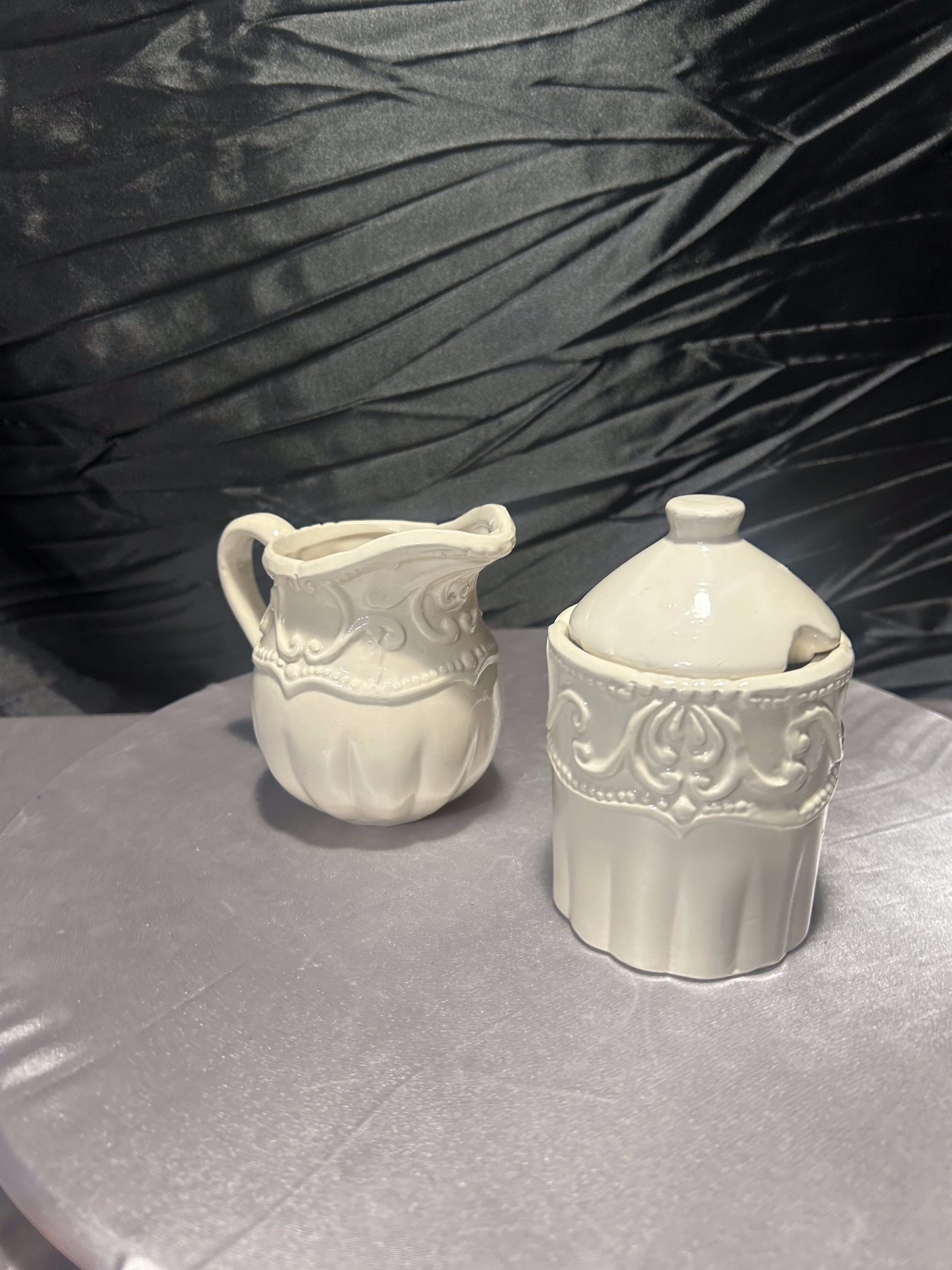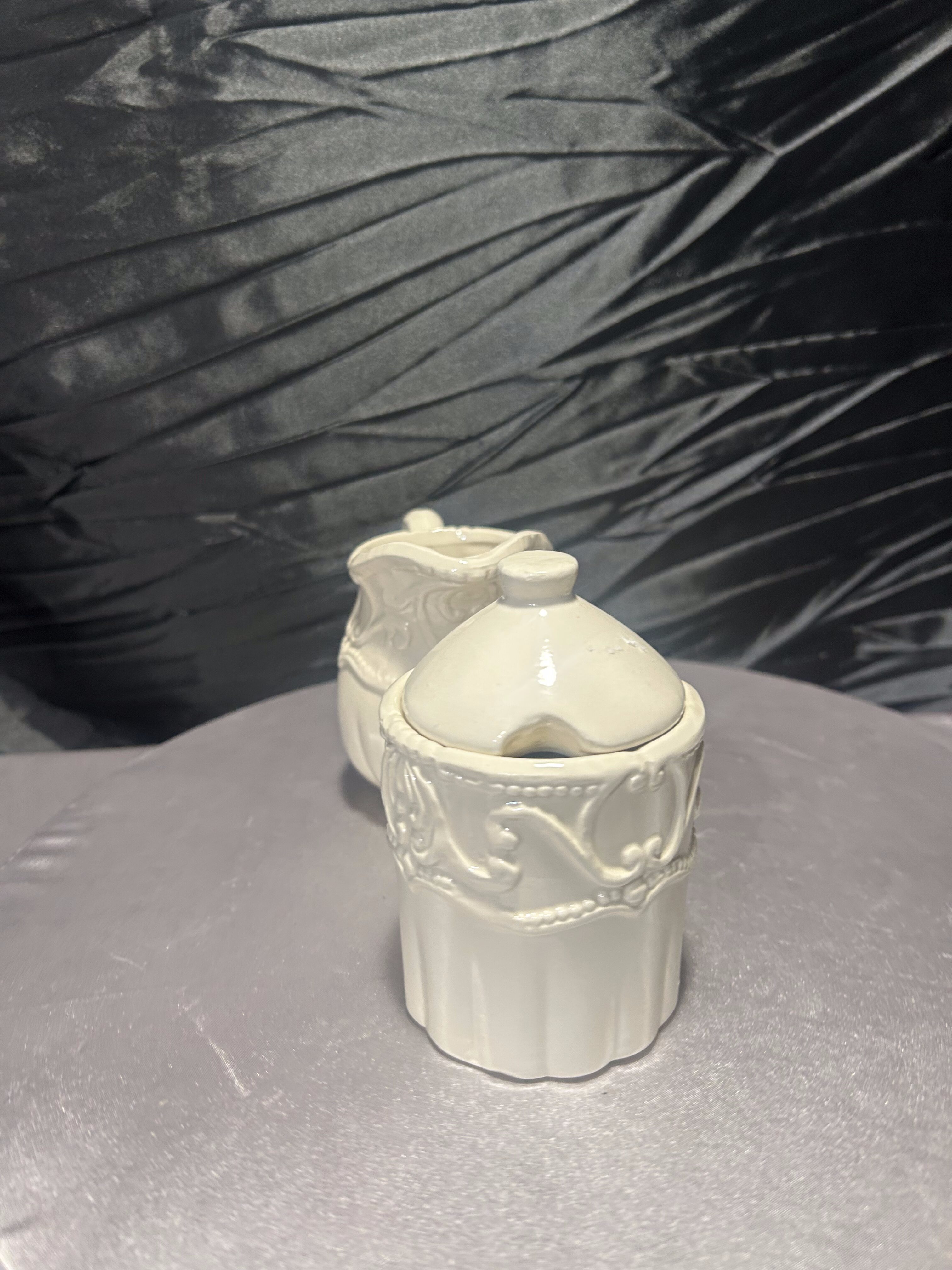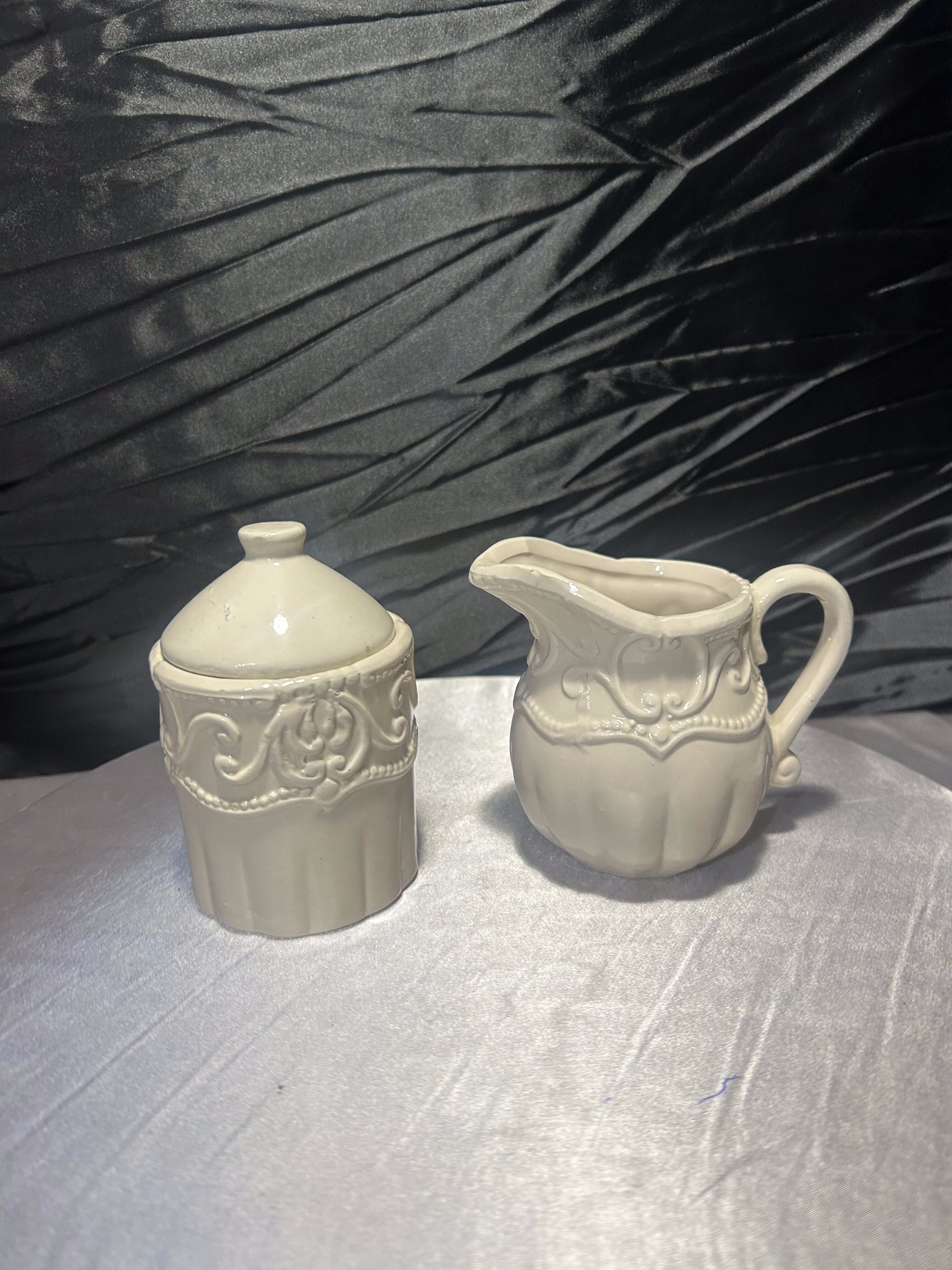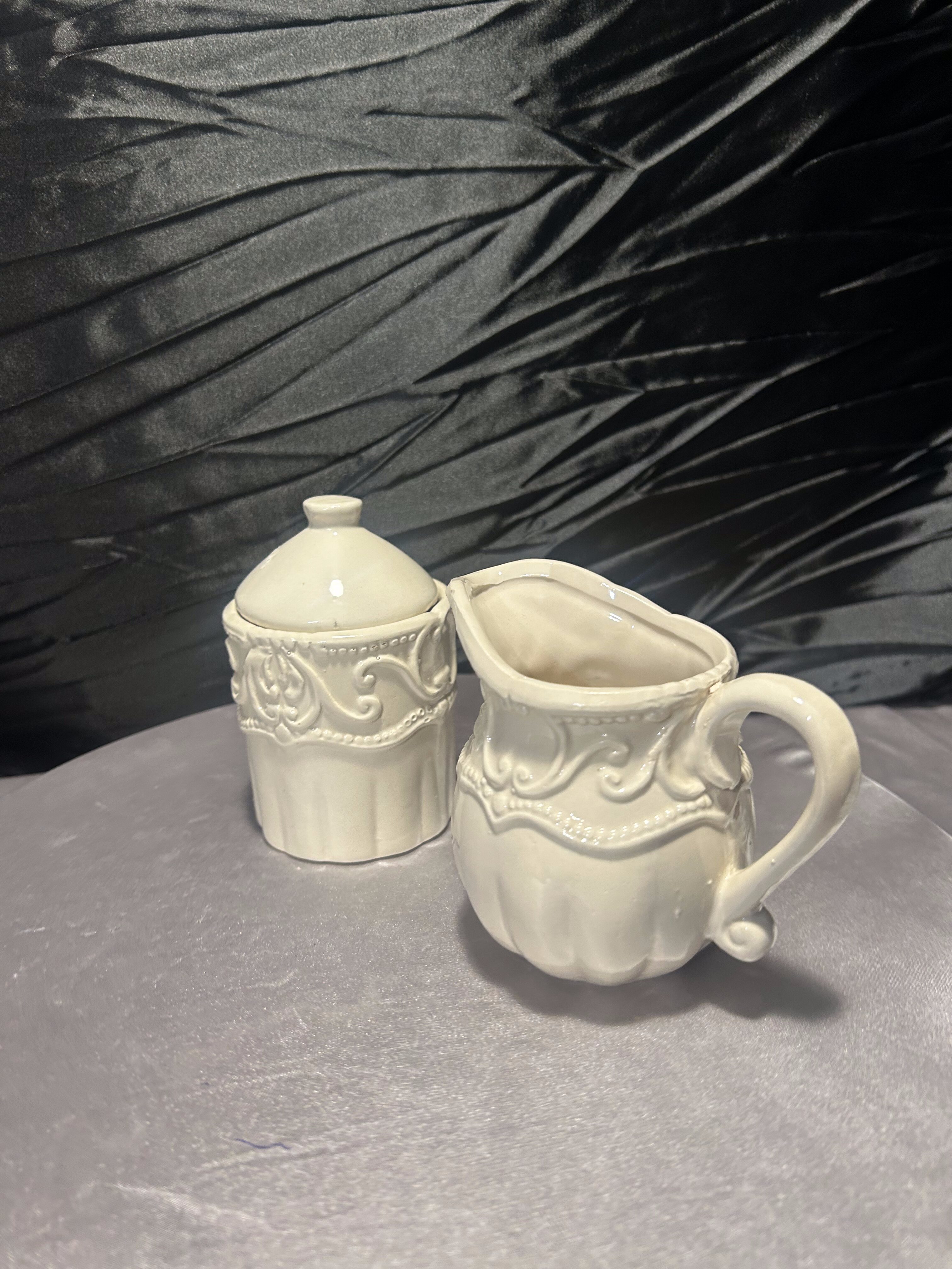 Uroczy zestaw fajansowy składający się z eleganckiej cukiernicy z pokrywką oraz dopasowanego mlecznika. Oba elementy wykonane z fajansu w delikatnym, kremowym odcieniu, ozdobione subtelnym reliefowym wzorem w stylu klasycznym.