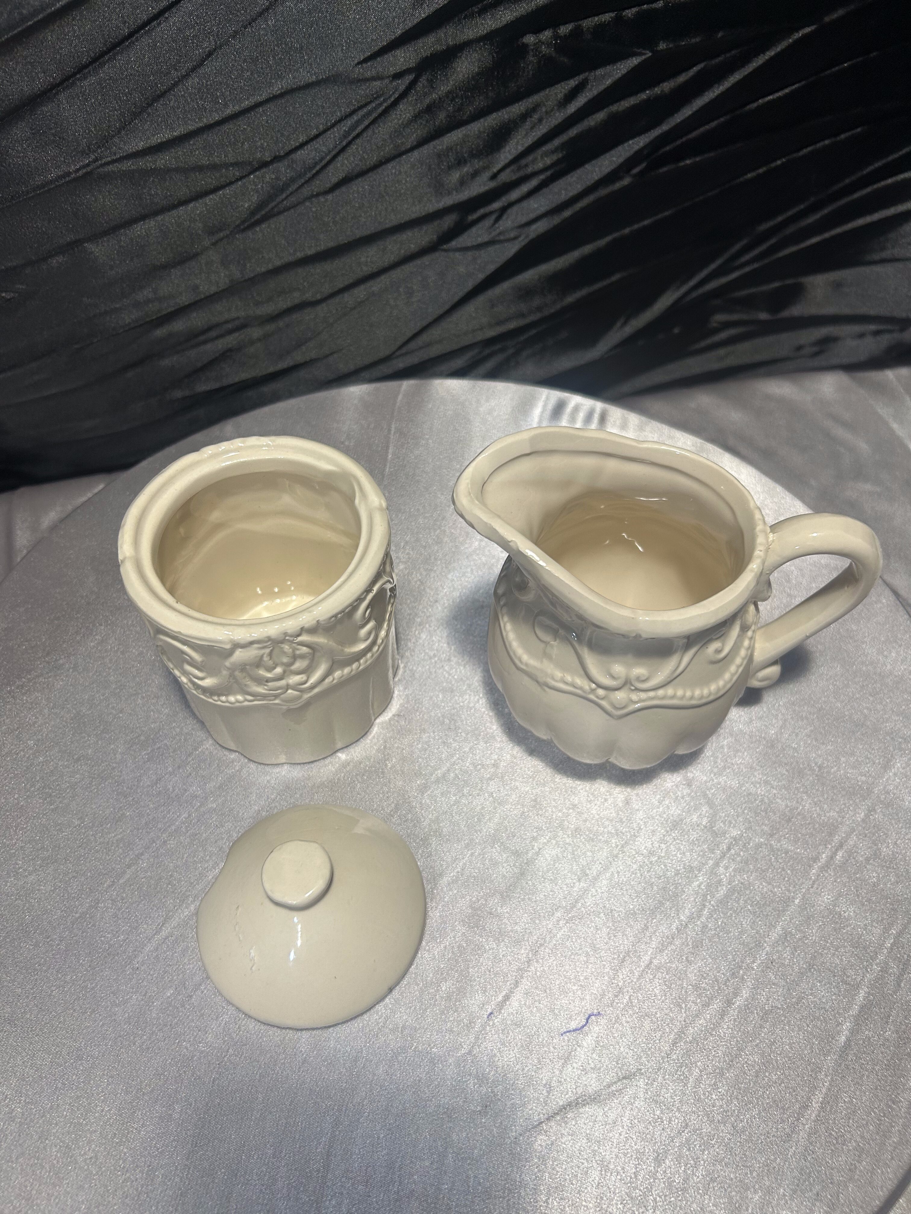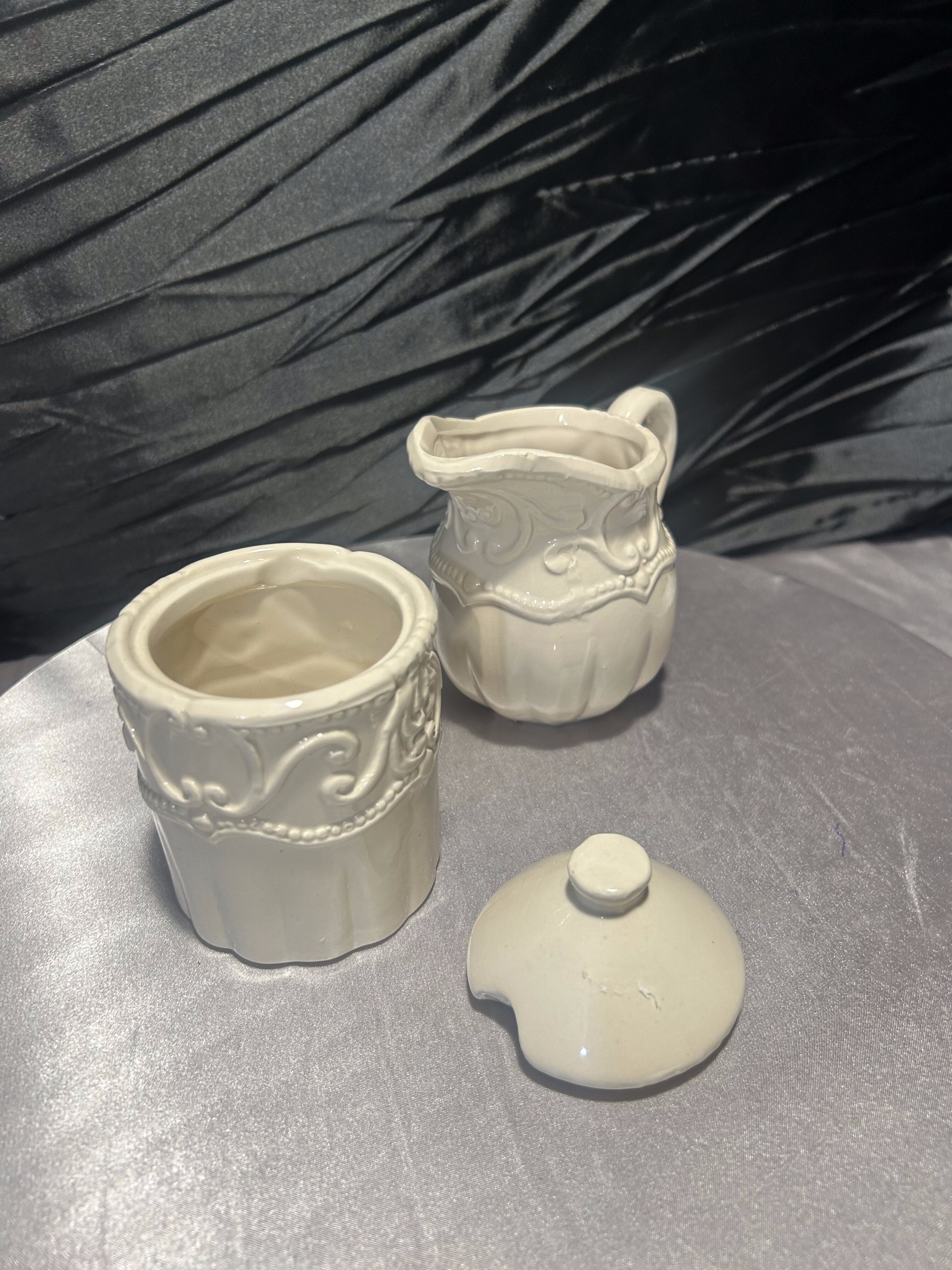 - Zestaw fajansowy – cukiernica i mlecznik z reliefowym zdobieniem – kremowy komplet vintage
