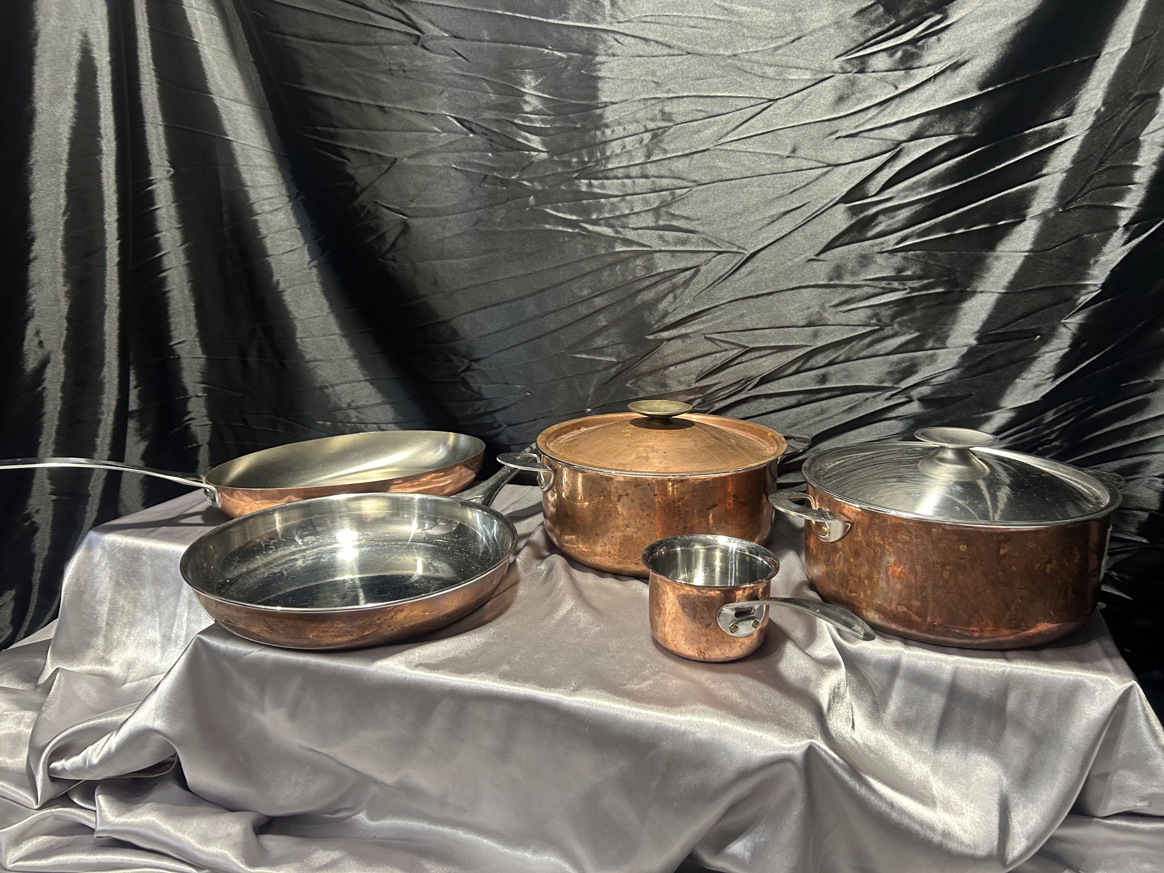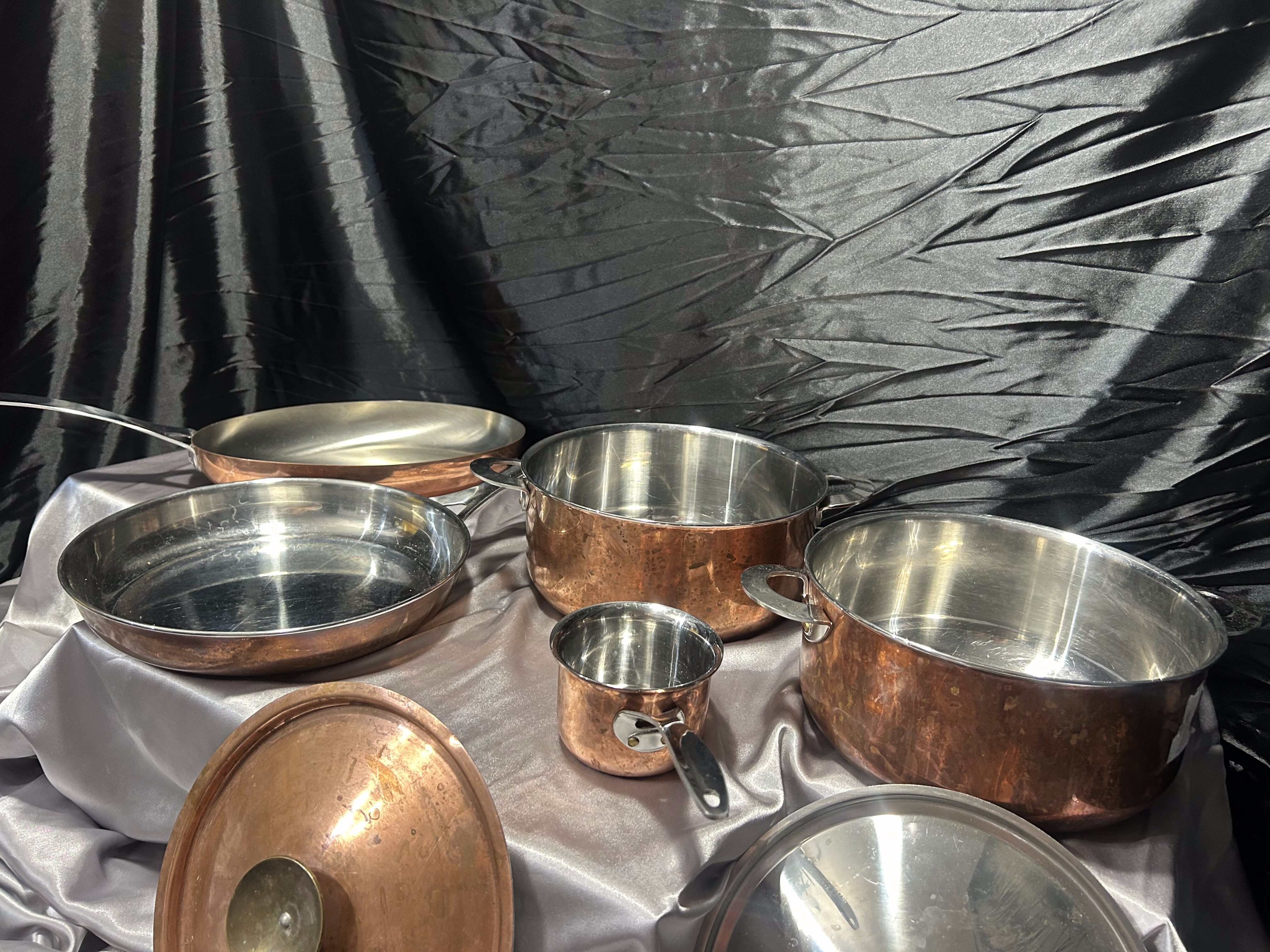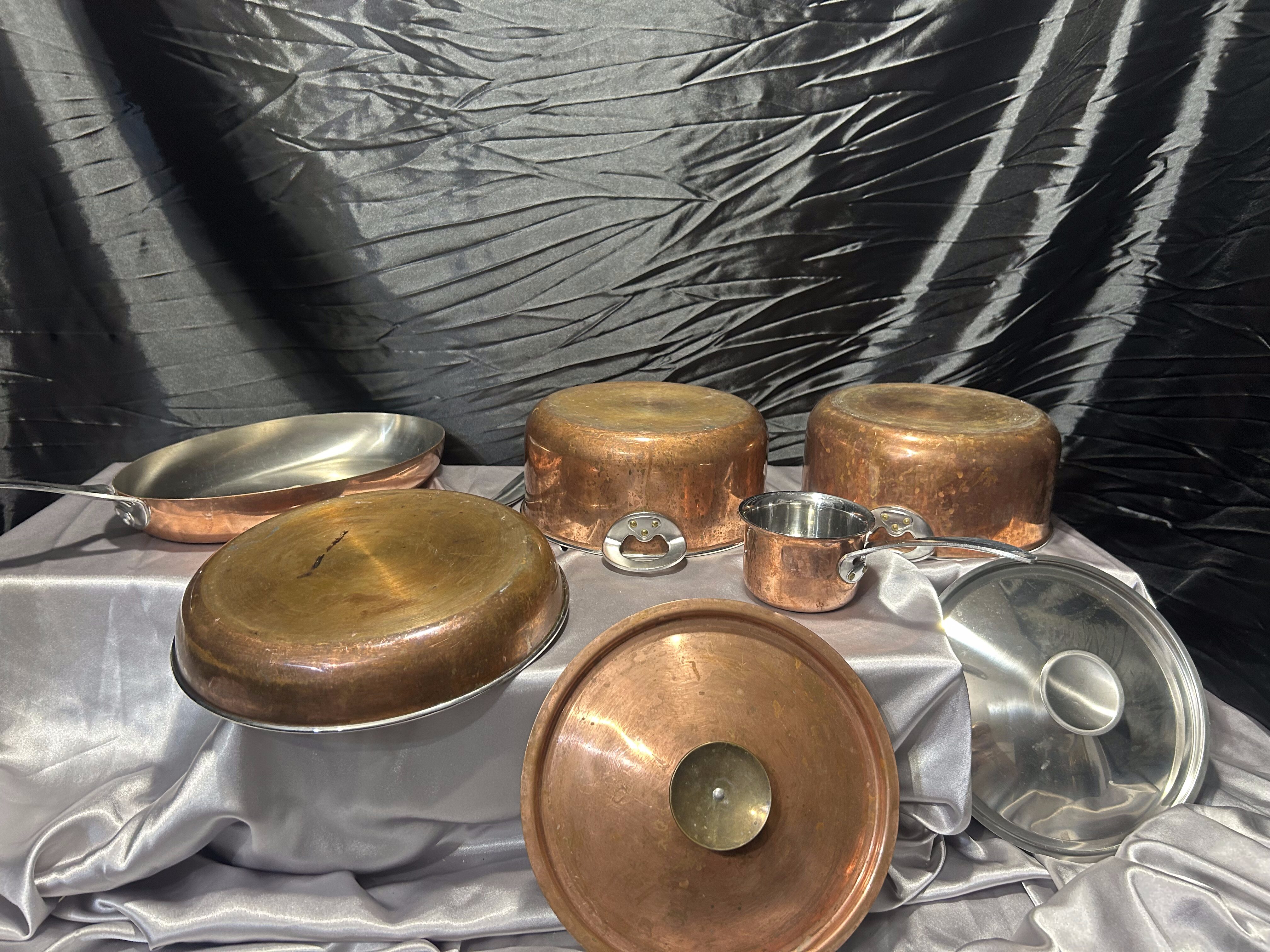 Wyjątkowy, duży zestaw miedzianych garnków i patelni marki Polaris, sygnowany, wykonany w tradycyjnym stylu z wykorzystaniem wysokiej jakości miedzi i stali nierdzewnej wewnątrz. Komplet obejmuje dwa garnki z pokrywkami, dwie patelnie oraz mały rondel – wszystkie elementy masywne, eleganckie i stworzone z myślą o profesjonalnym gotowaniu.