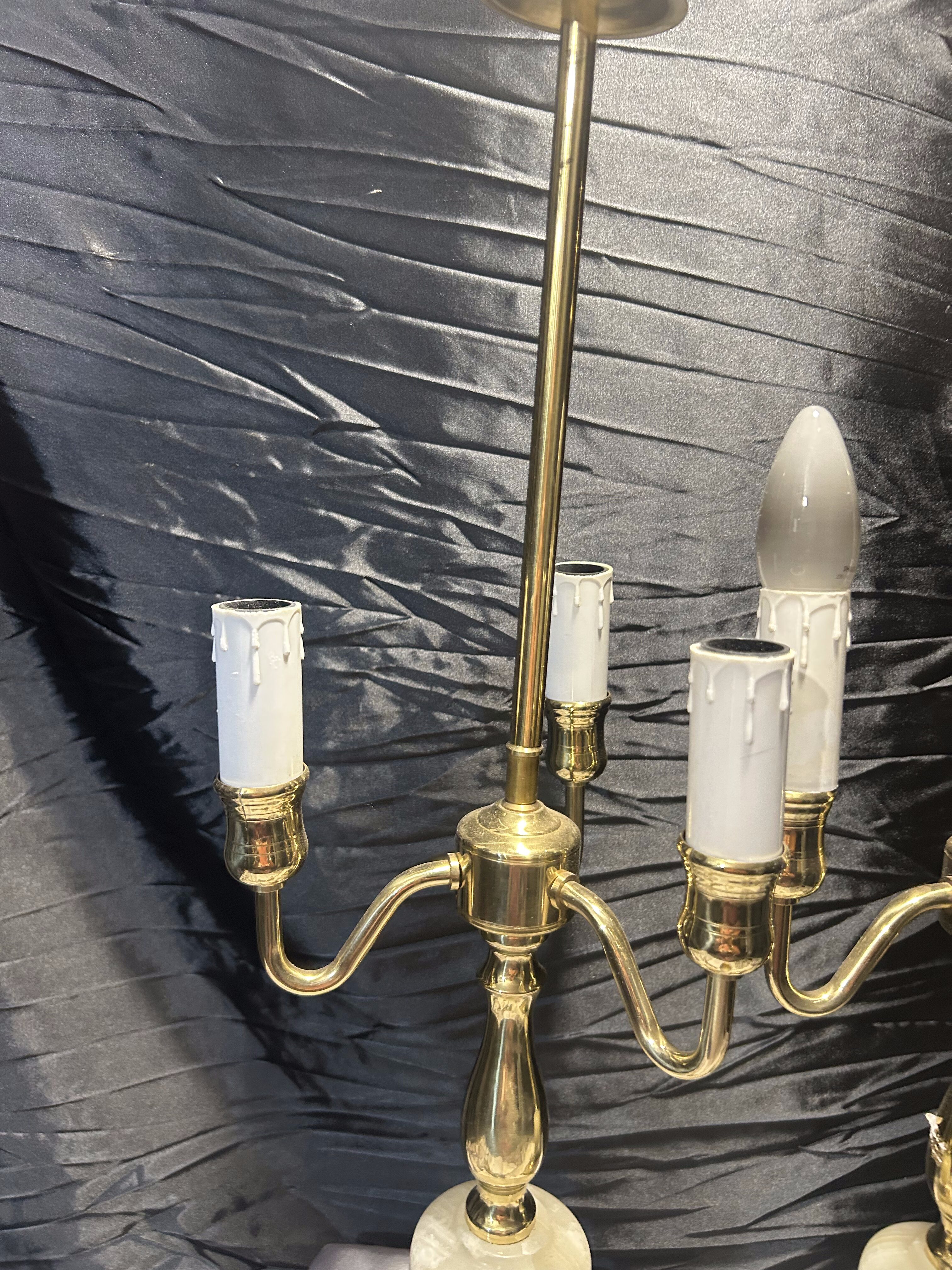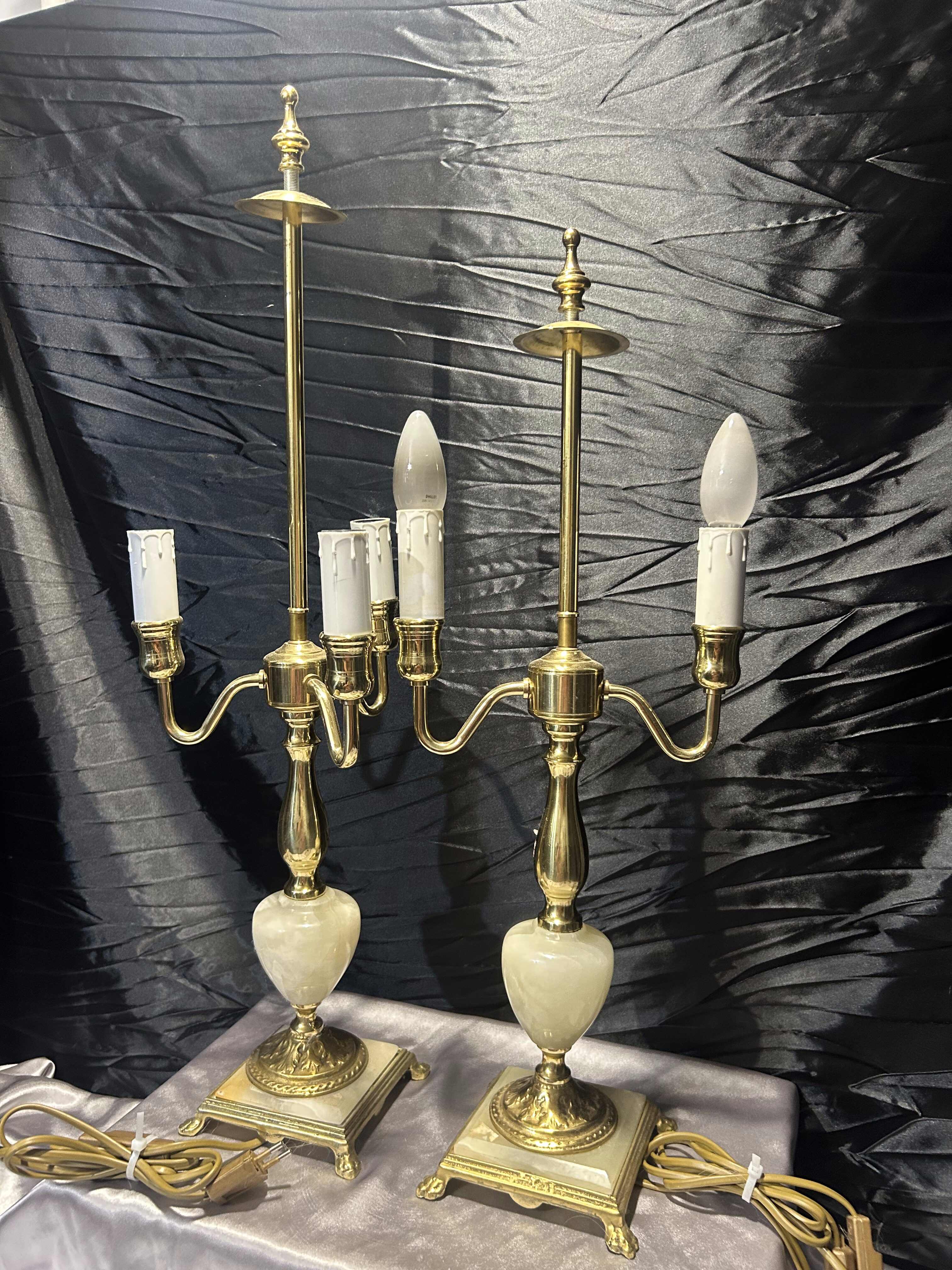 Unikalny zestaw dwóch lamp stołowych wykonanych z mosiądzu i toczonego onyksu, który nadaje całości niepowtarzalnego charakteru. Lampa z trzema żarówkami prezentuje się okazale, podczas gdy mniejsza, z dwiema żarówkami, subtelnie uzupełnia zestaw. Obie stoją na dekoracyjnych podstawach zdobionych klasycznymi detalami, a naturalny onyks pięknie kontrastuje z połyskiem złoconego mosiądzu. Doskonałe zarówno do wnętrz stylizowanych, jak i jako kontrastowy akcent w nowoczesnym wystroju.