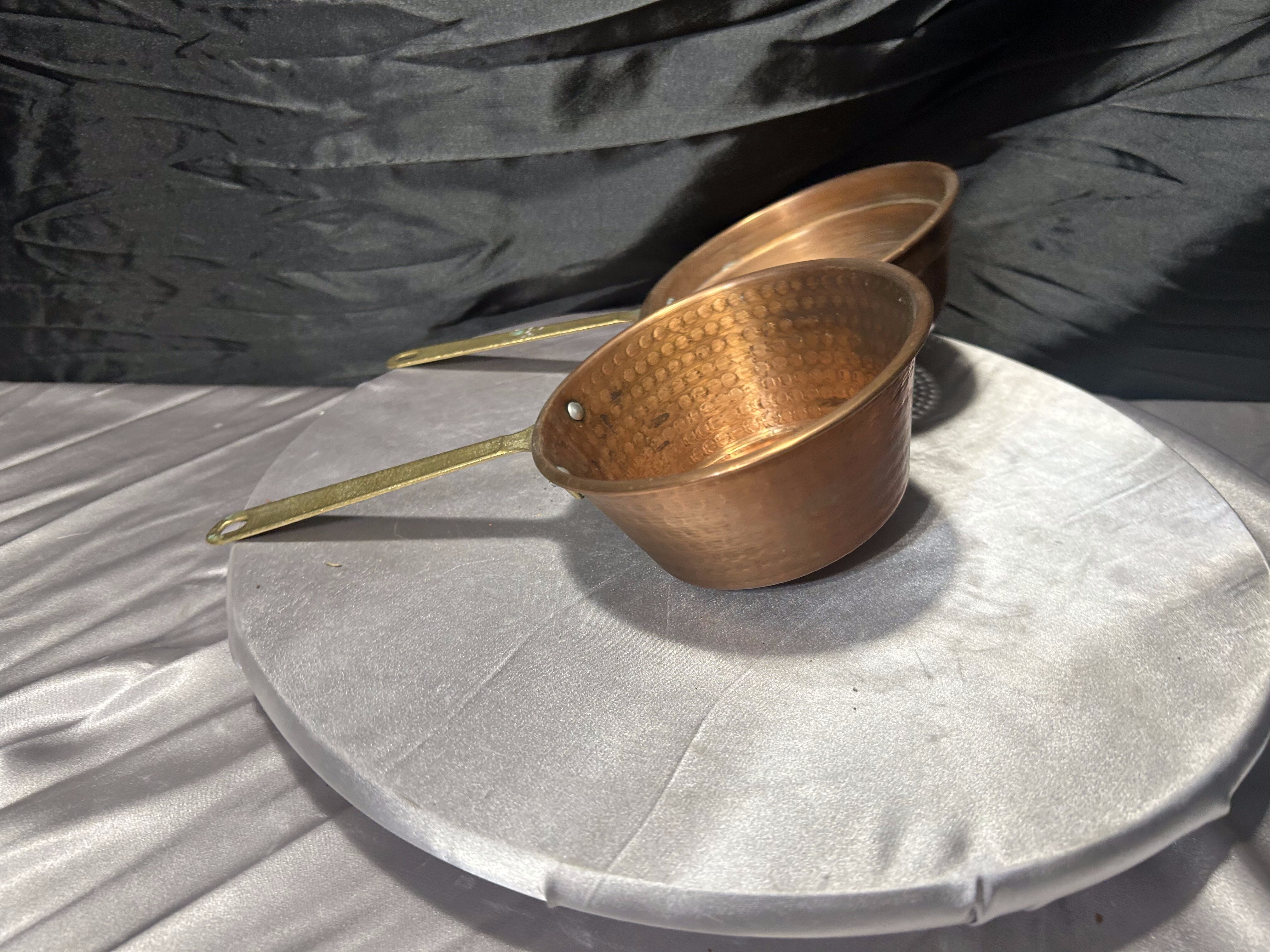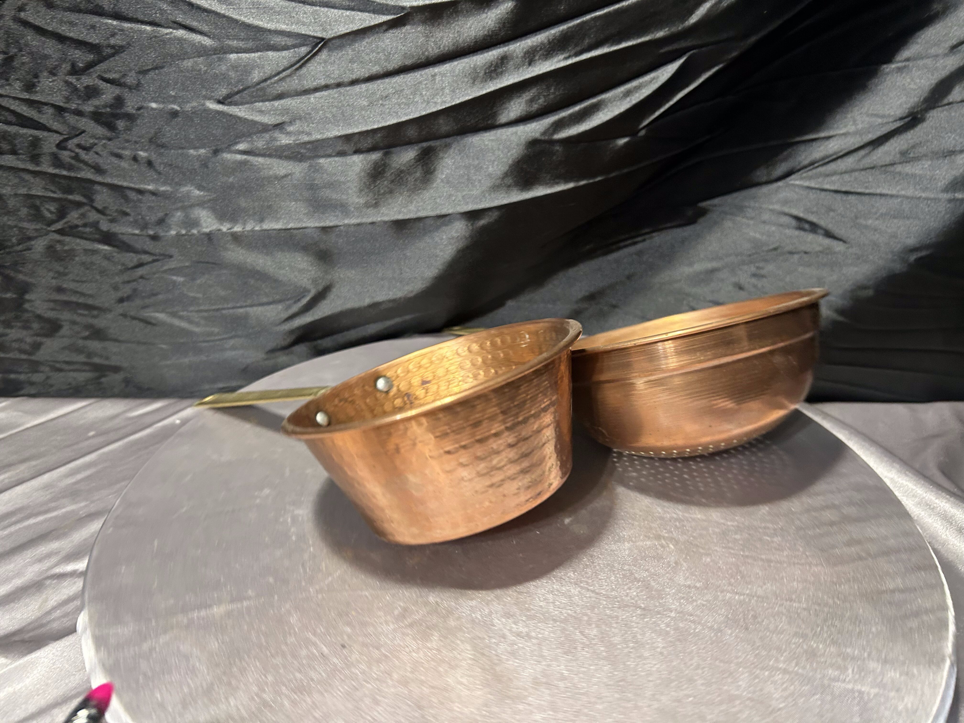 Przedmiotem oferty jest efektowny zestaw dwóch naczyń kuchennych wykonanych z miedzi, wyposażonych w solidne mosiężne rączki. W skład kompletu wchodzi duża łyżka cedzakowa oraz głęboka chochla (podbierak). Naczynia charakteryzują się klasycznym wzornictwem i dekoracyjną fakturą materiału, co sprawia, że będą doskonałym dopełnieniem wystroju stylowej kuchni lub jadalni.
