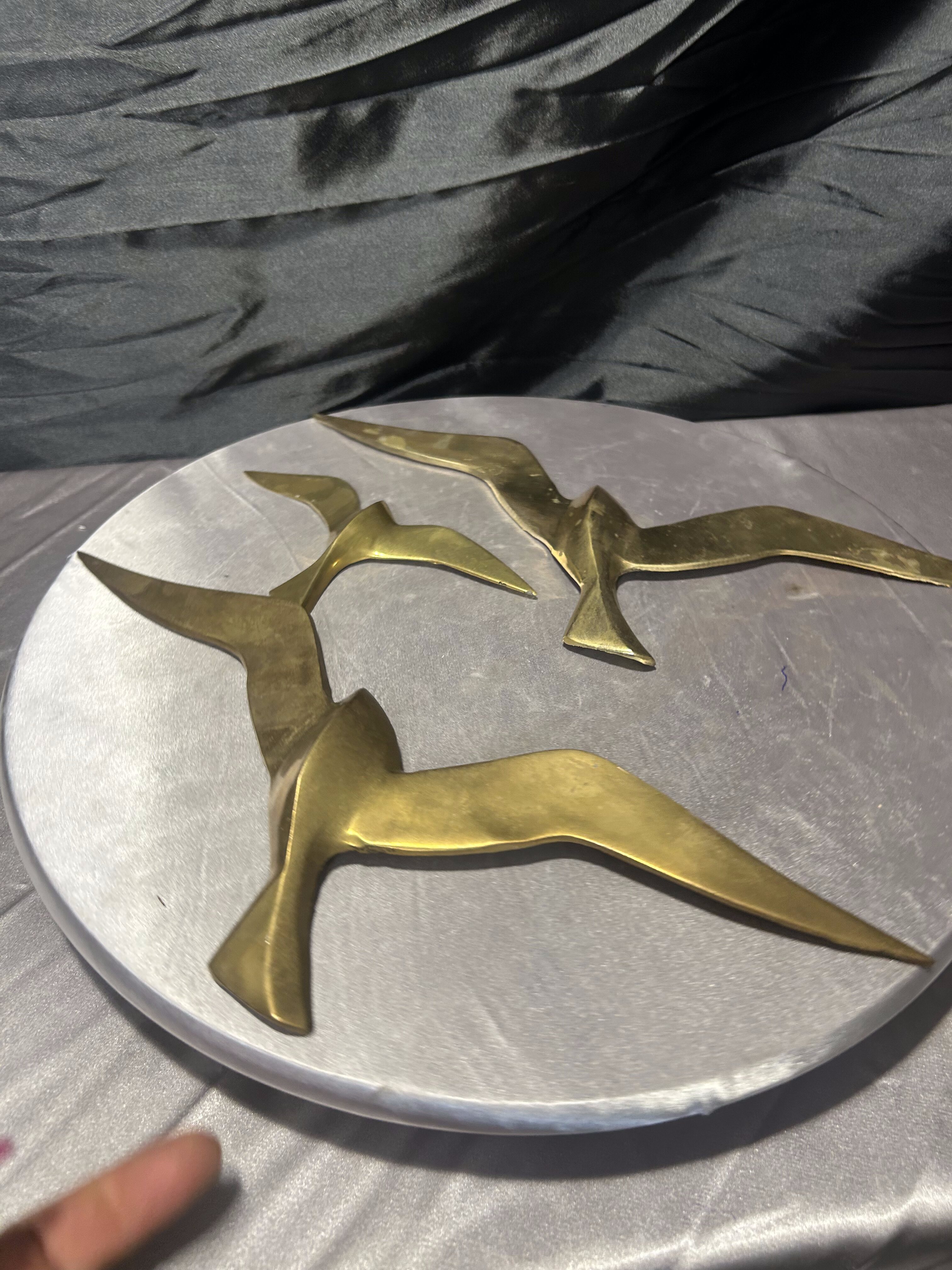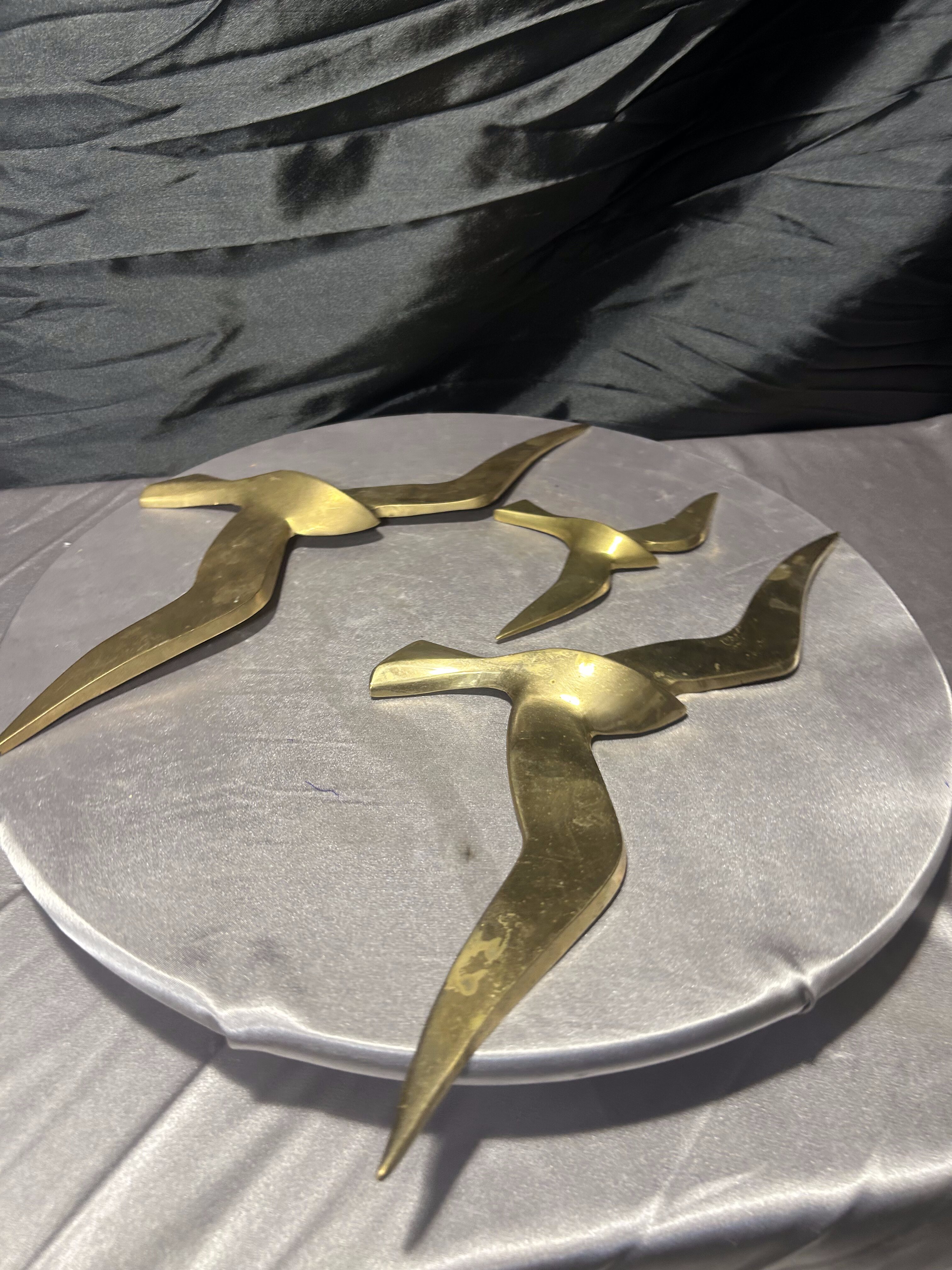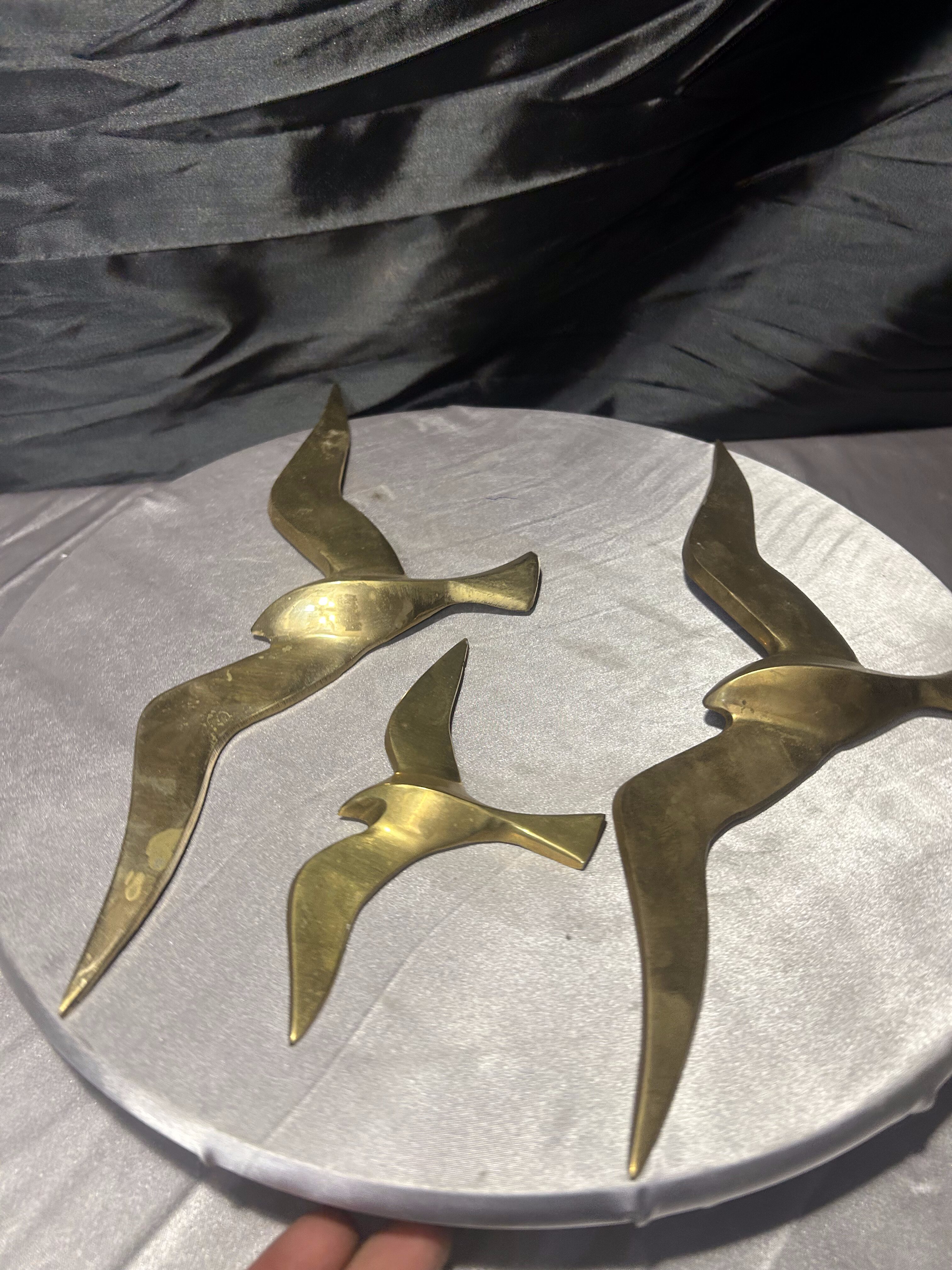 Przepiękny zestaw trzech dekoracyjnych ptaków (mew) wykonanych z litego mosiądzu, przeznaczonych do zawieszenia na ścianie. Komplet składa się z dwóch większych oraz jednej mniejszej figurki, co pozwala na stworzenie dowolnej, dynamicznej konfiguracji na ścianie – od klasycznego klucza ptaków po artystyczny nieład. Każdy element posiada od spodu praktyczne kółeczko ułatwiające montaż. Złocisty blask mosiądzu w połączeniu z marynistycznym motywem sprawia, że jest to wyjątkowa ozdoba, która nada charakteru salonowi, gabinetowi czy sypialni, wprowadzając do wnętrza powiew nadmorskiego klimatu.