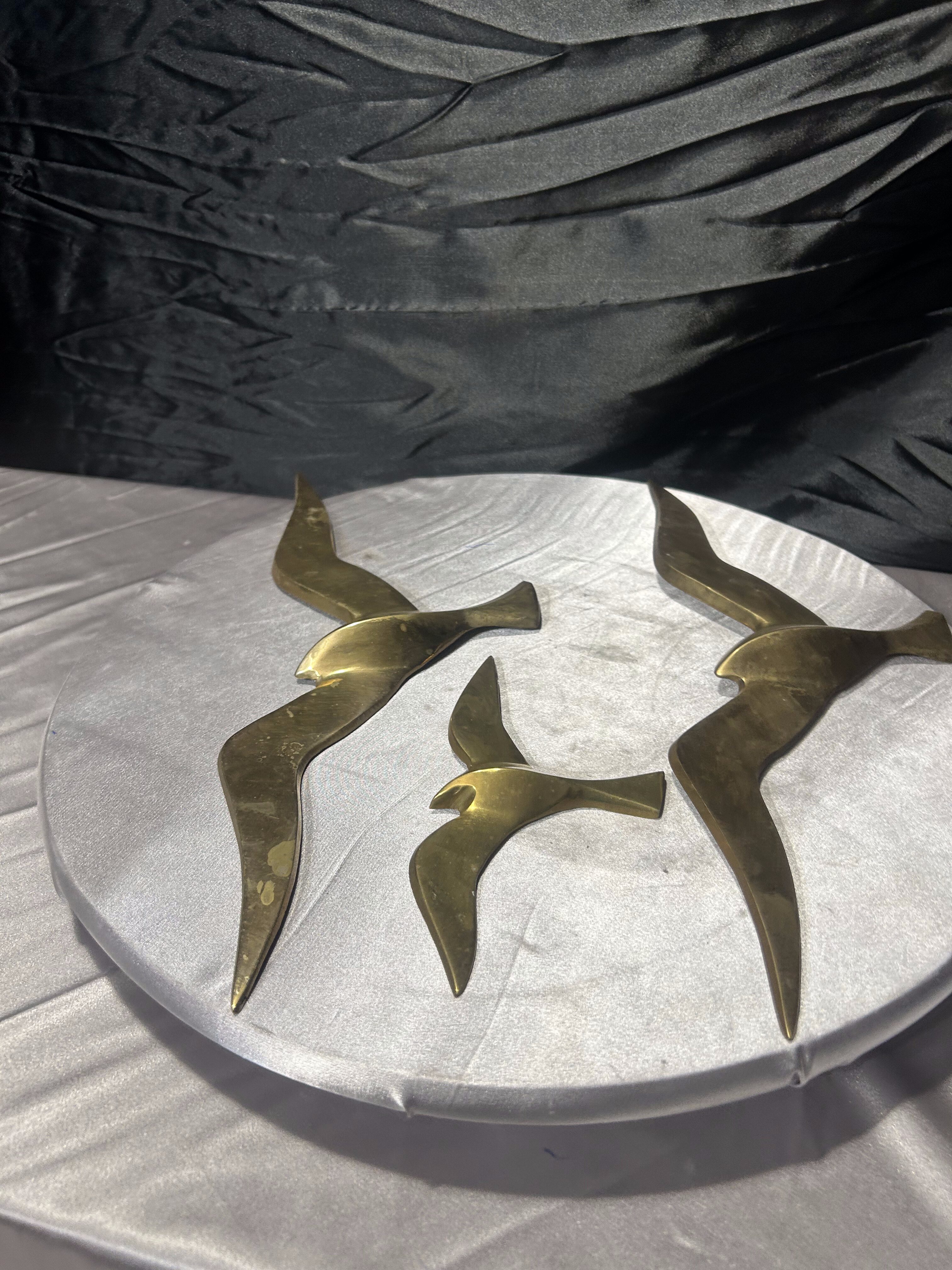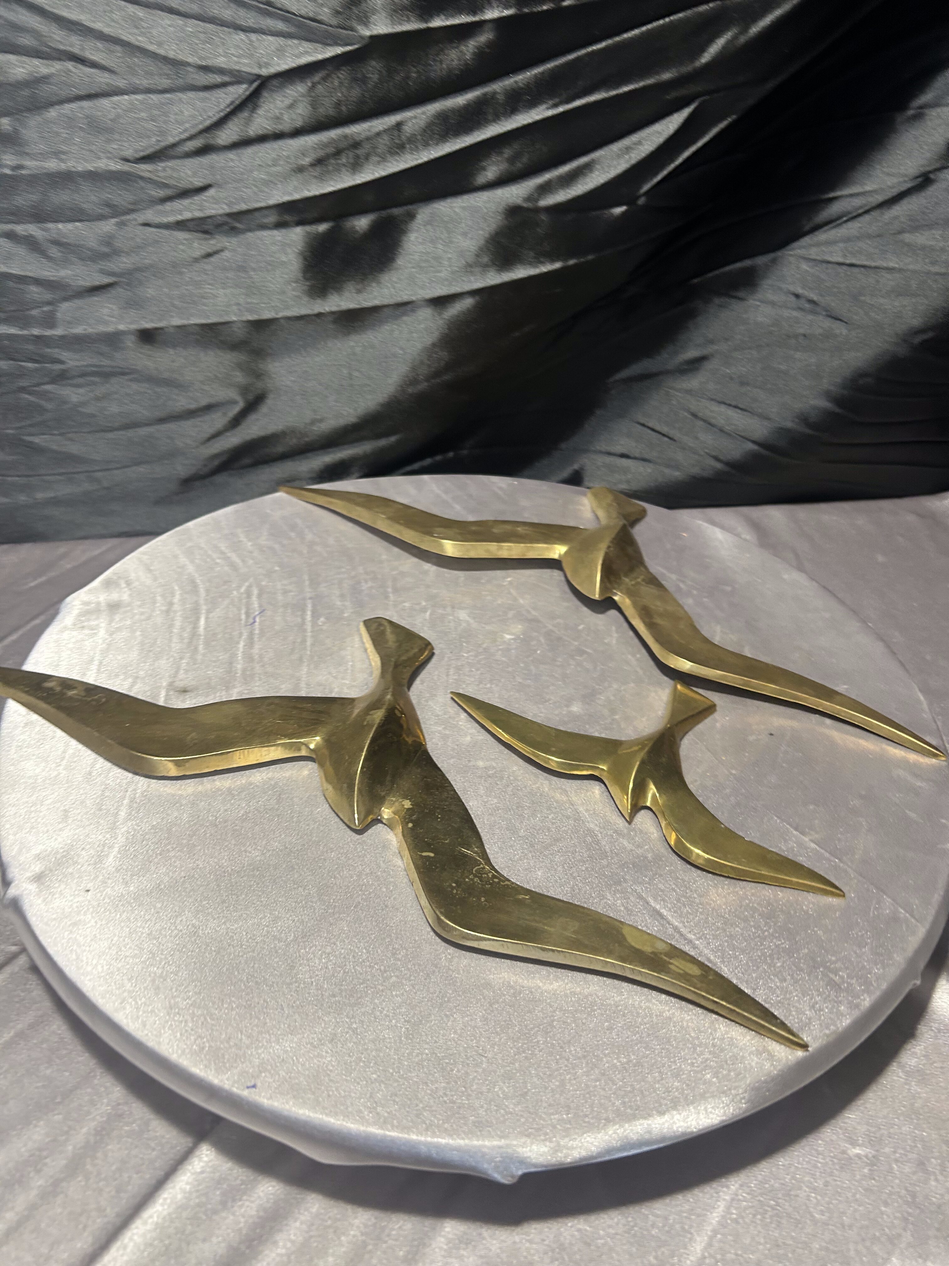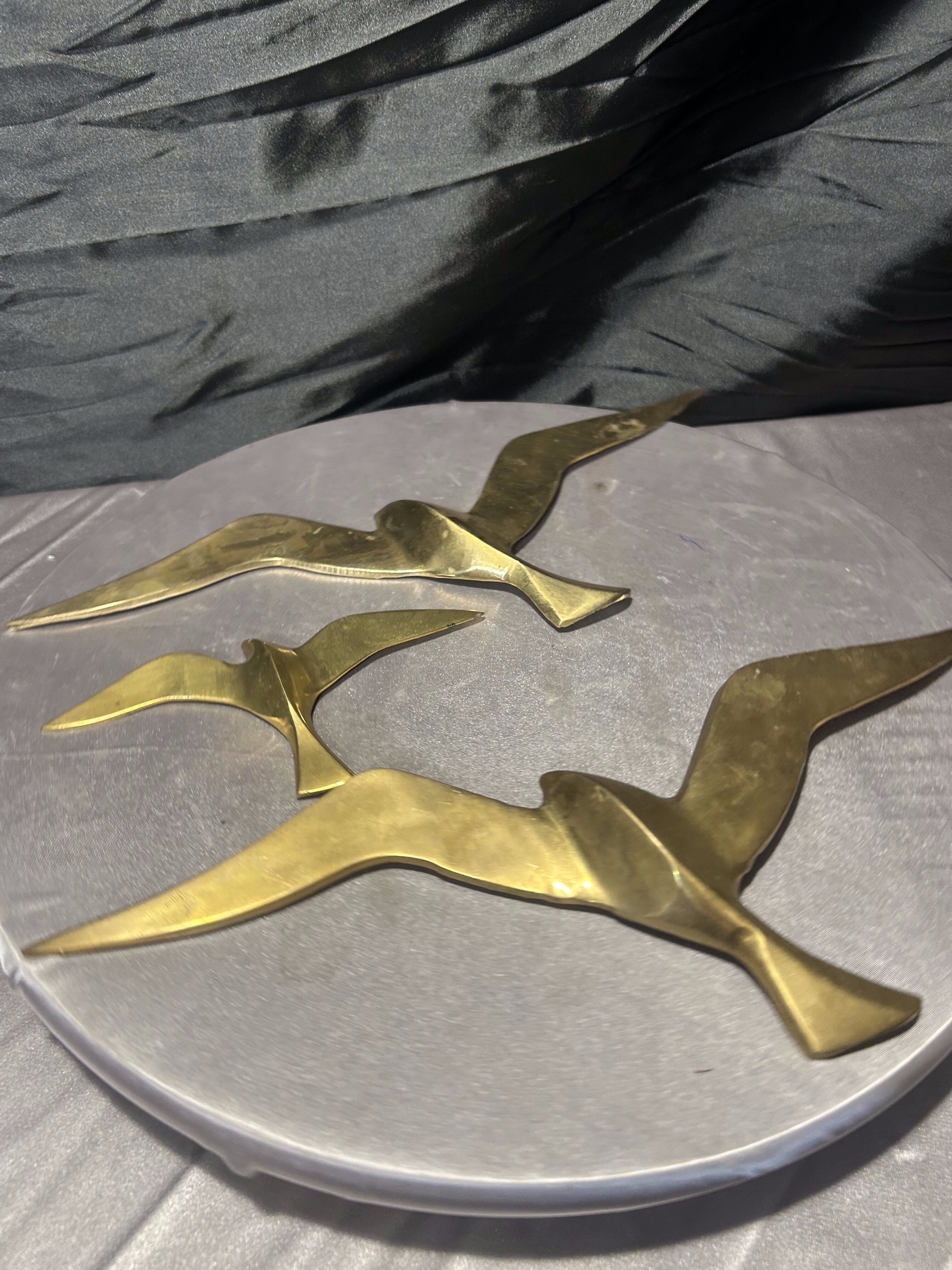 Przepiękny zestaw trzech dekoracyjnych ptaków (mew) wykonanych z litego mosiądzu, przeznaczonych do zawieszenia na ścianie. Komplet składa się z dwóch większych oraz jednej mniejszej figurki, co pozwala na stworzenie dowolnej, dynamicznej konfiguracji na ścianie – od klasycznego klucza ptaków po artystyczny nieład. Każdy element posiada od spodu praktyczne kółeczko ułatwiające montaż. Złocisty blask mosiądzu w połączeniu z marynistycznym motywem sprawia, że jest to wyjątkowa ozdoba, która nada charakteru salonowi, gabinetowi czy sypialni, wprowadzając do wnętrza powiew nadmorskiego klimatu.