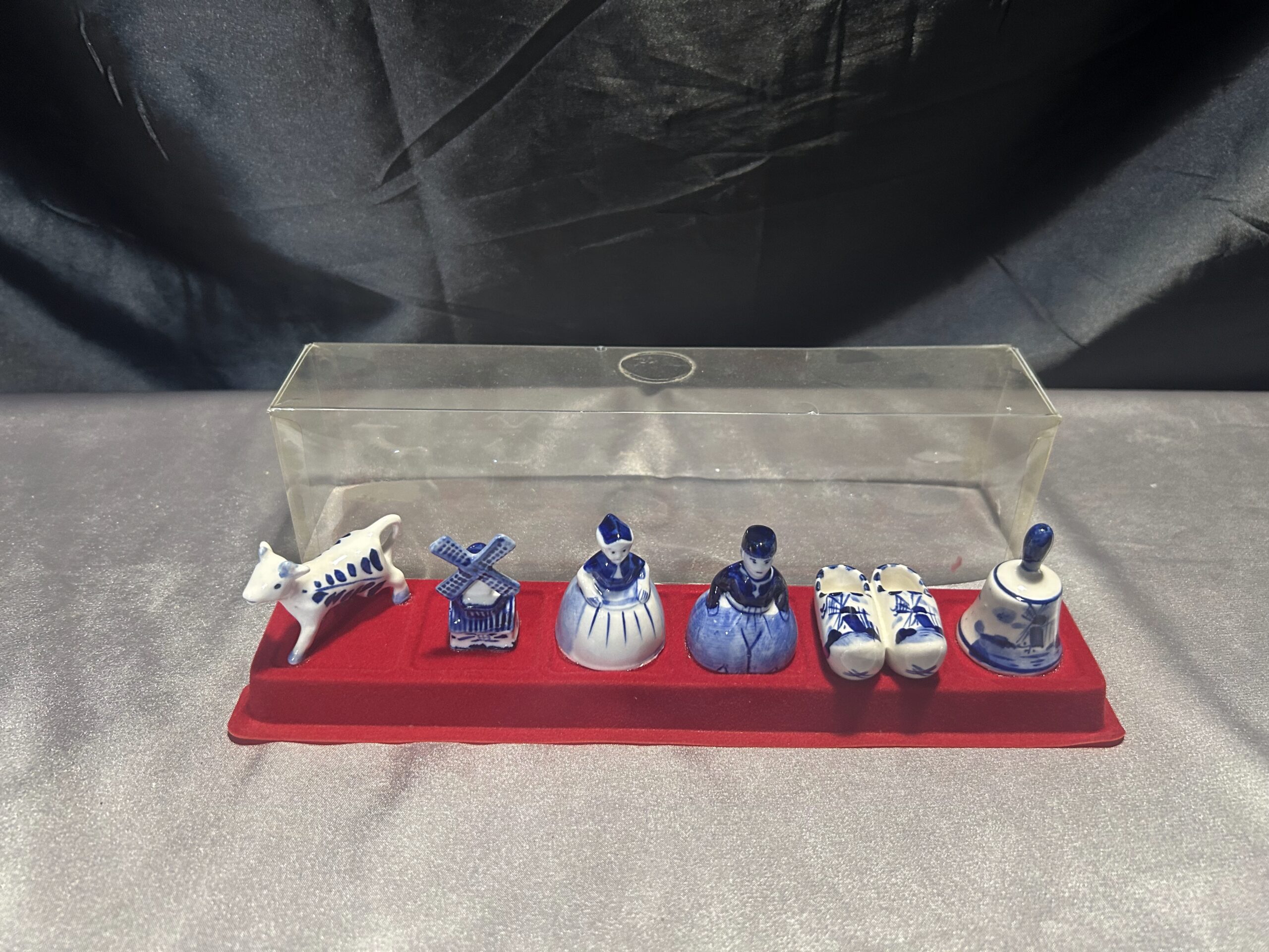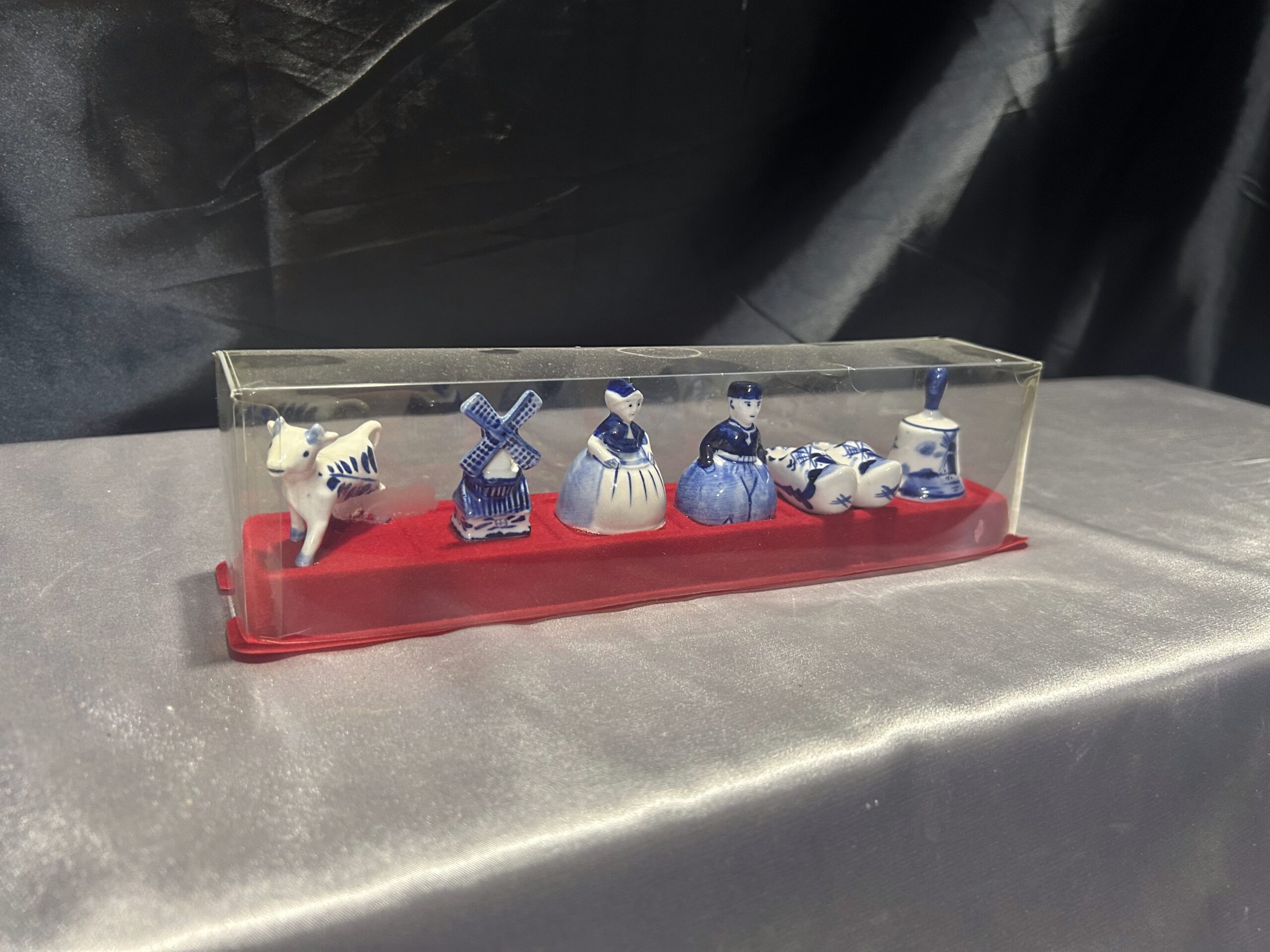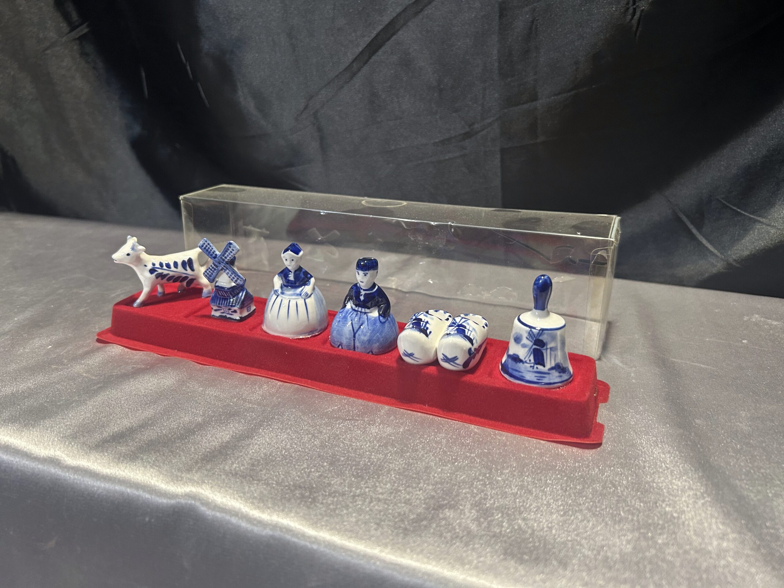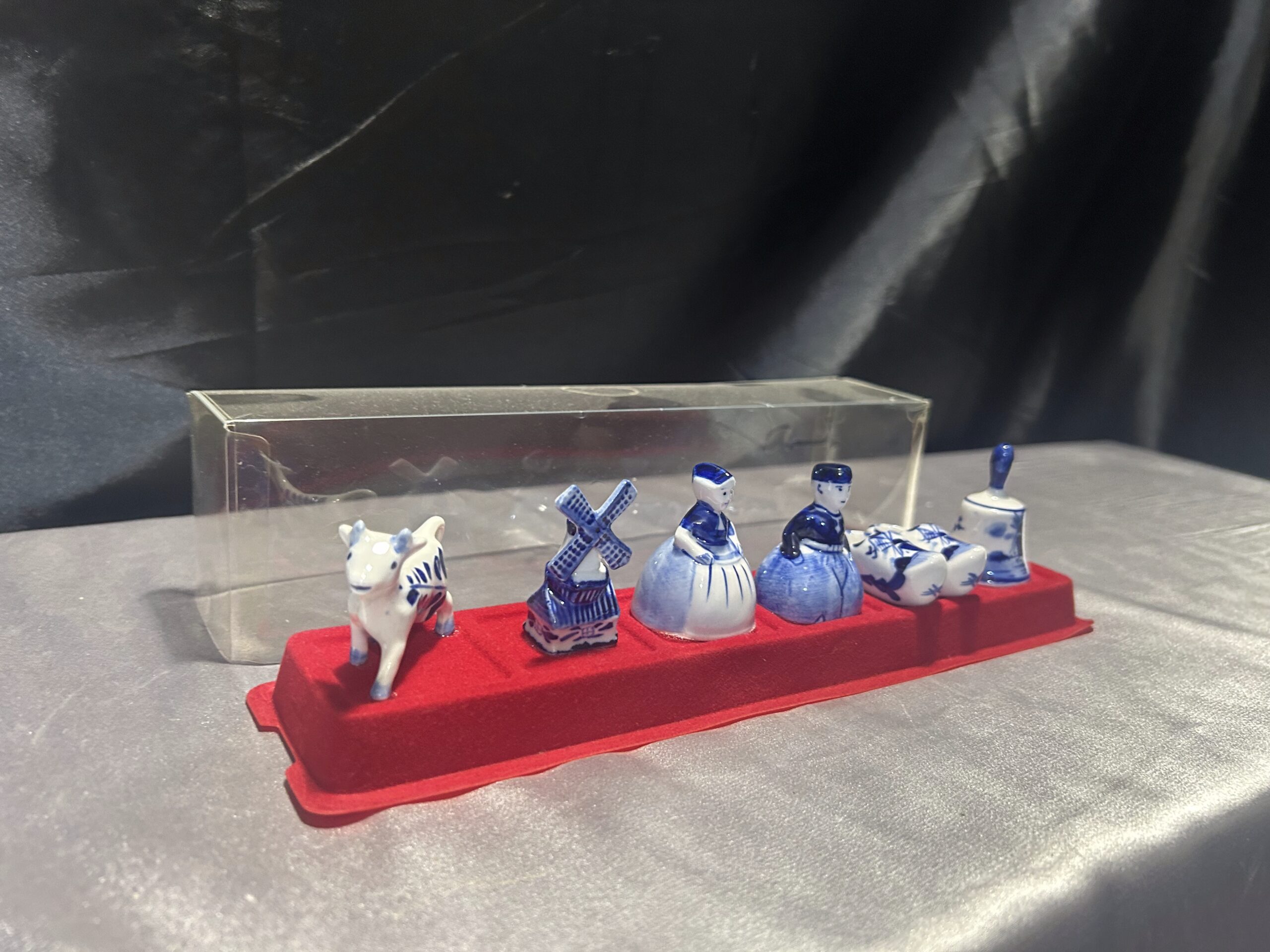 Unikalny zestaw figurek ceramicznych w biało-niebieskiej kolorystyce, inspirowany holenderską kulturą i tradycją. Figurki ułożone są na czerwonej filcowej podstawie i zabezpieczone przezroczystą pokrywką, co czyni ten zestaw idealnym jako dekoracja lub pamiątka.