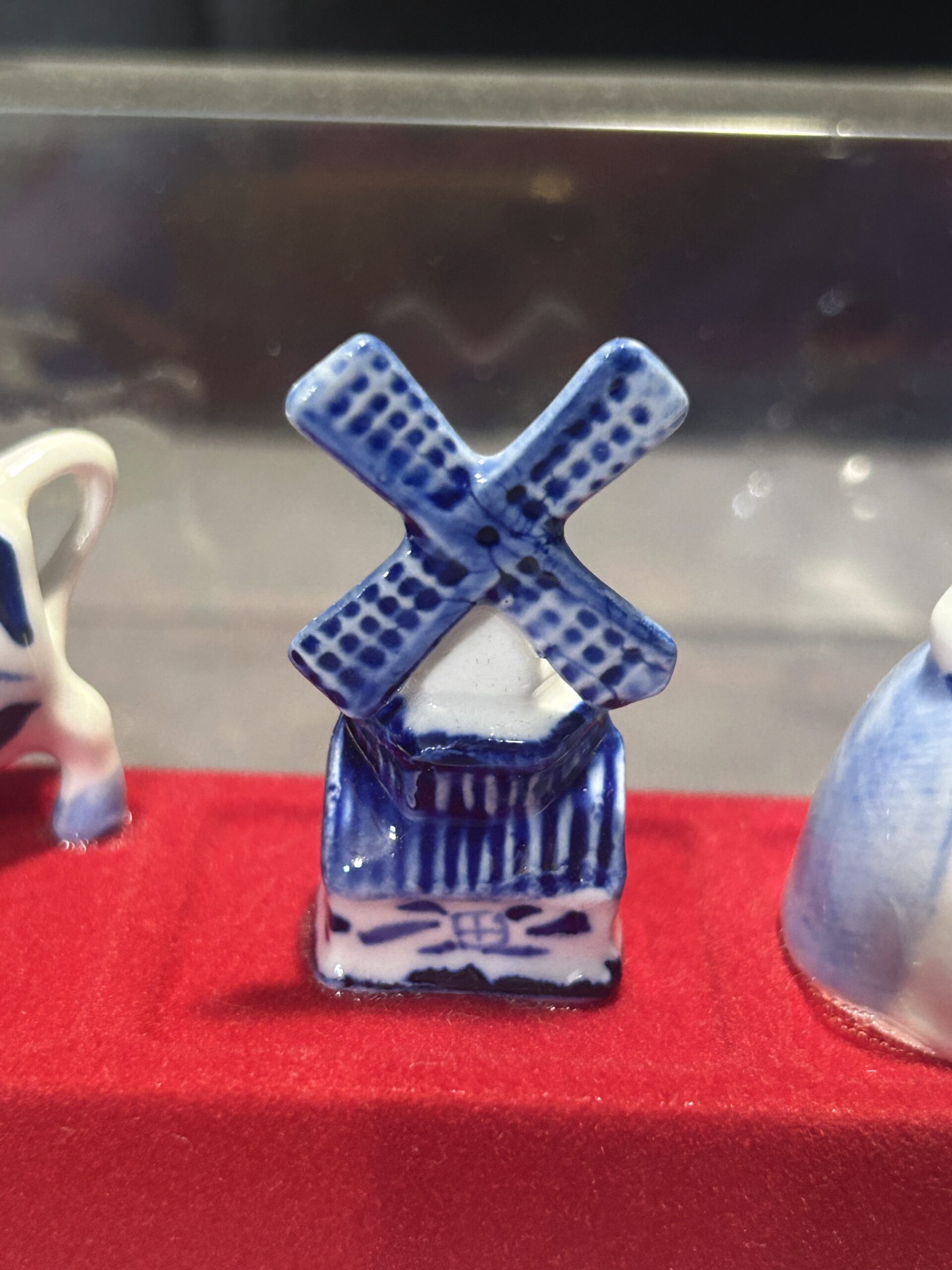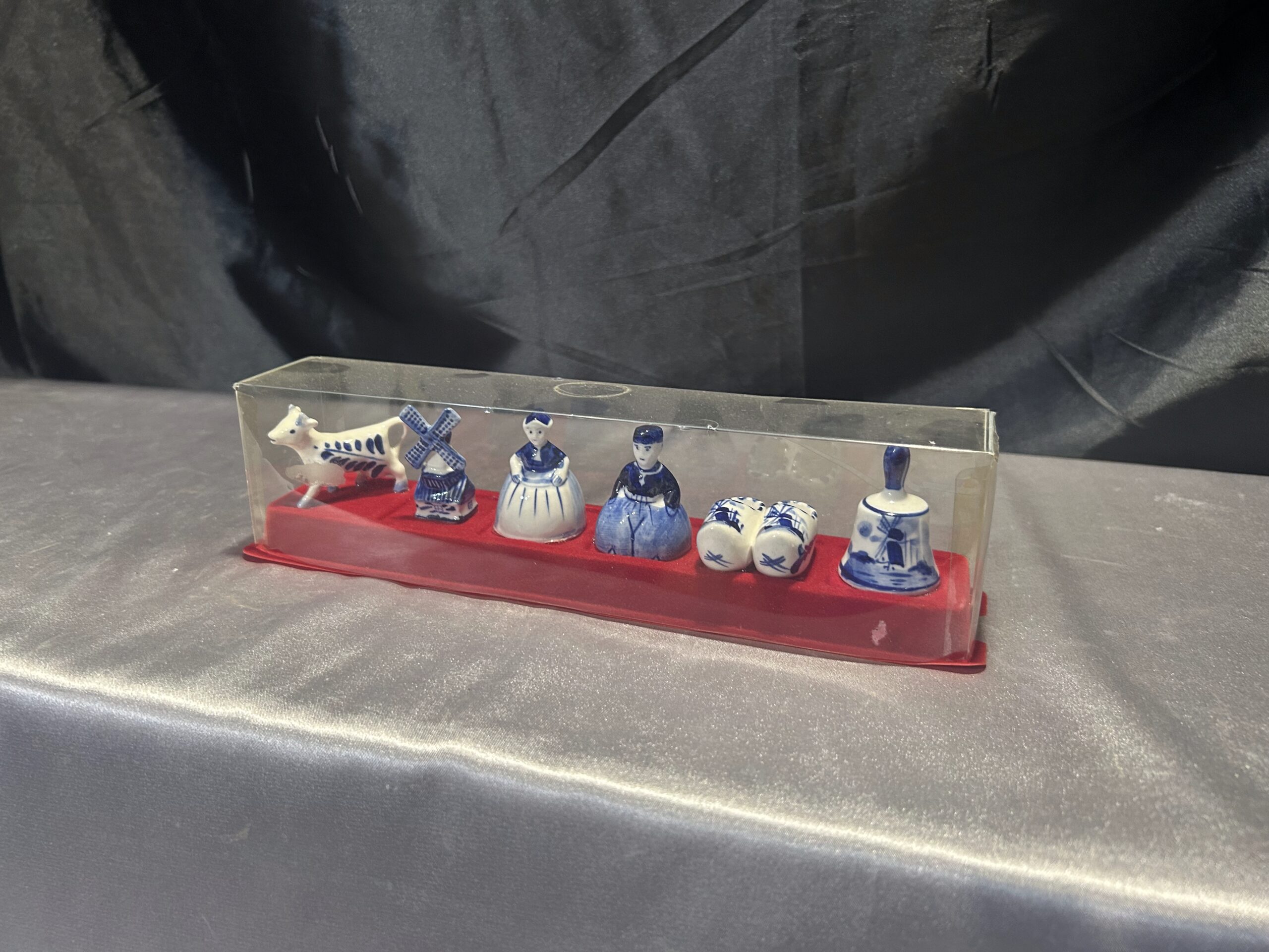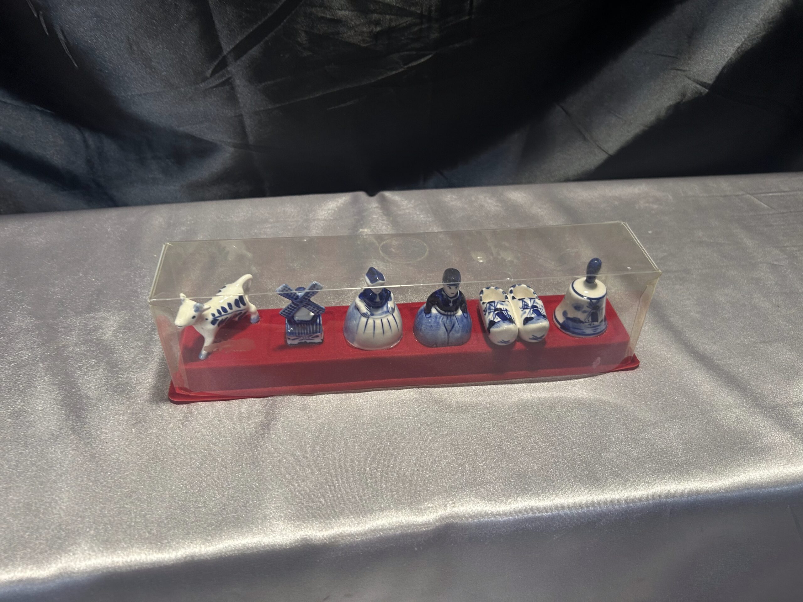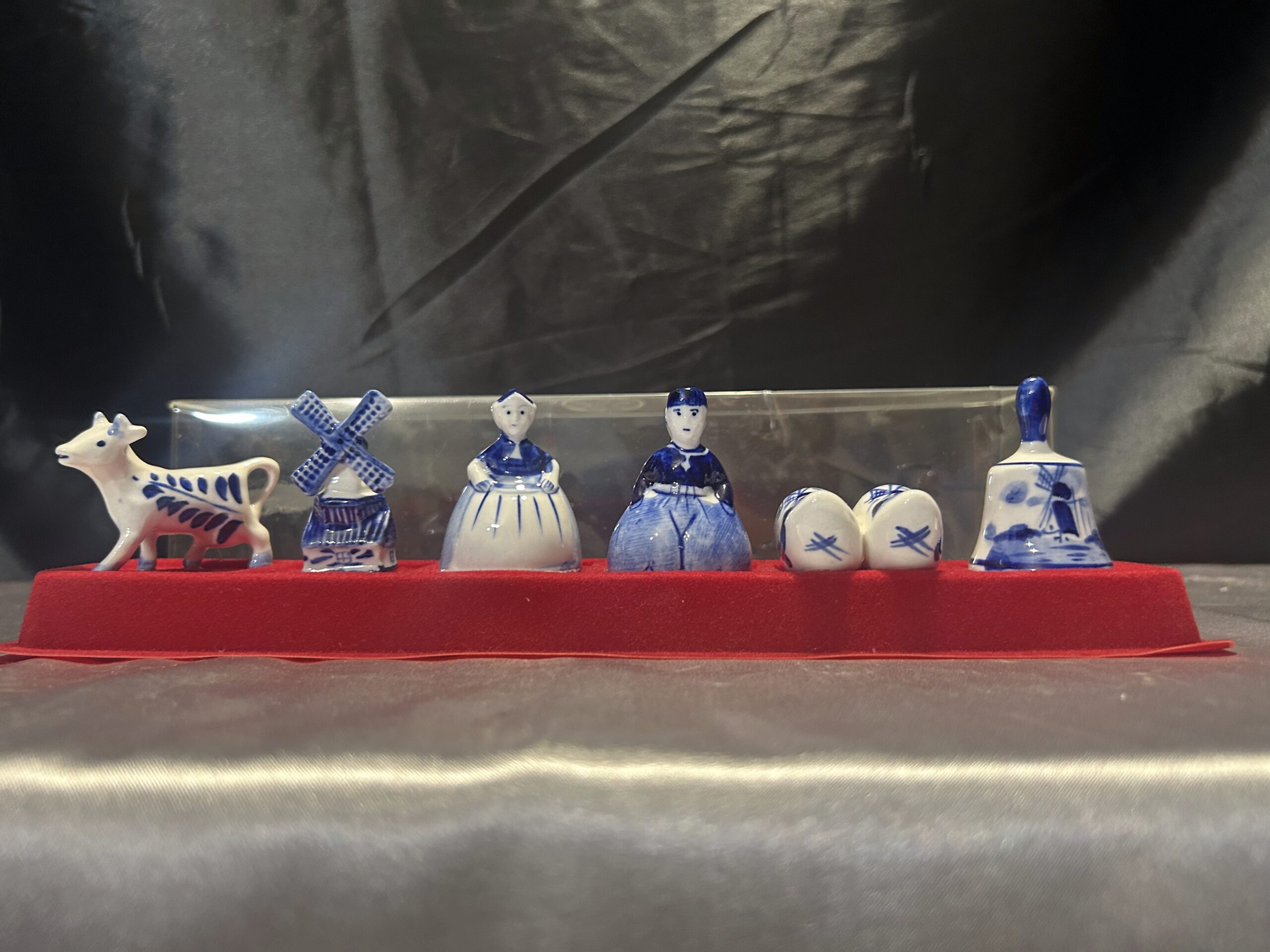 Unikalny zestaw figurek ceramicznych w biało-niebieskiej kolorystyce, inspirowany holenderską kulturą i tradycją. Figurki ułożone są na czerwonej filcowej podstawie i zabezpieczone przezroczystą pokrywką, co czyni ten zestaw idealnym jako dekoracja lub pamiątka.