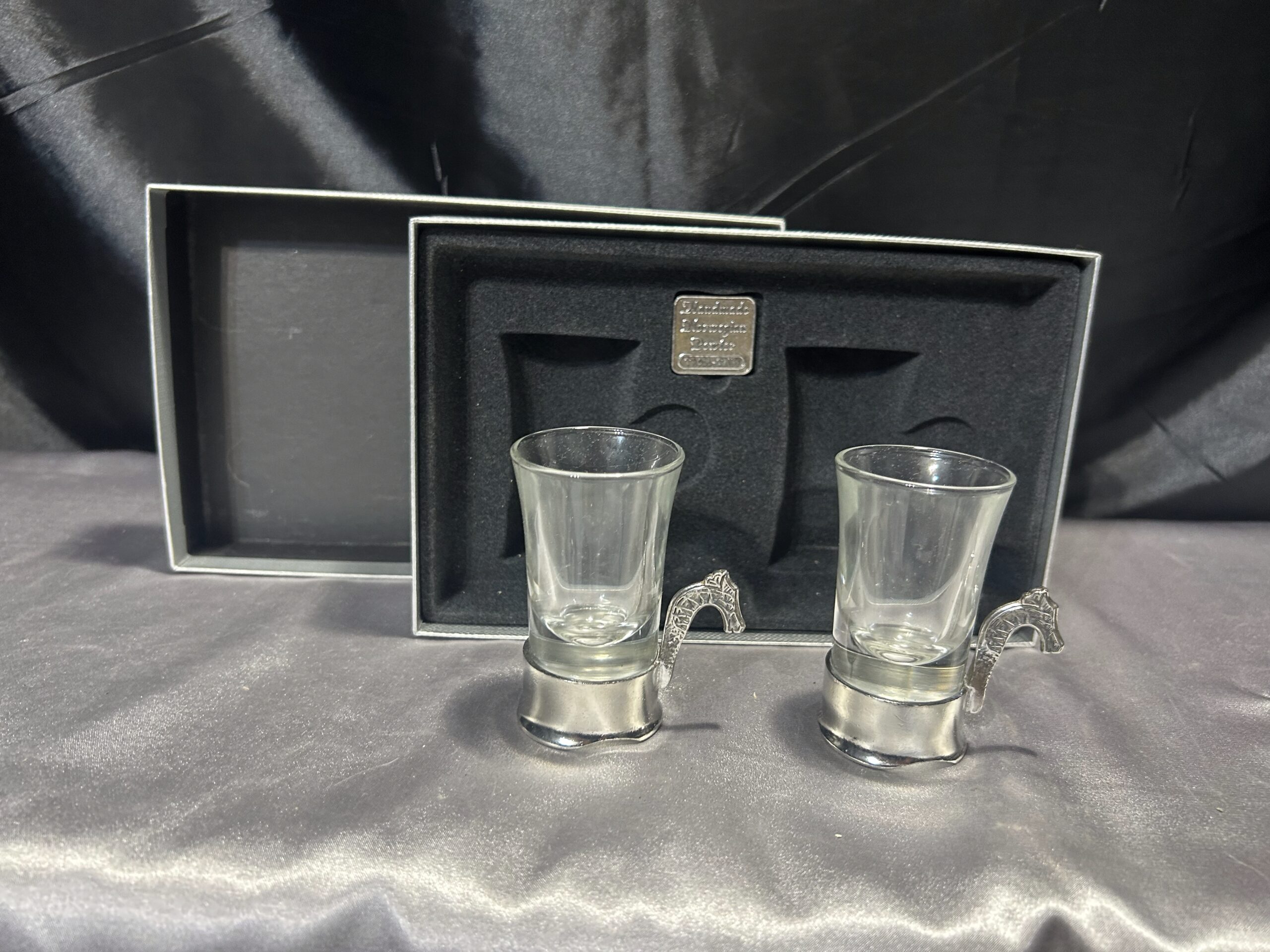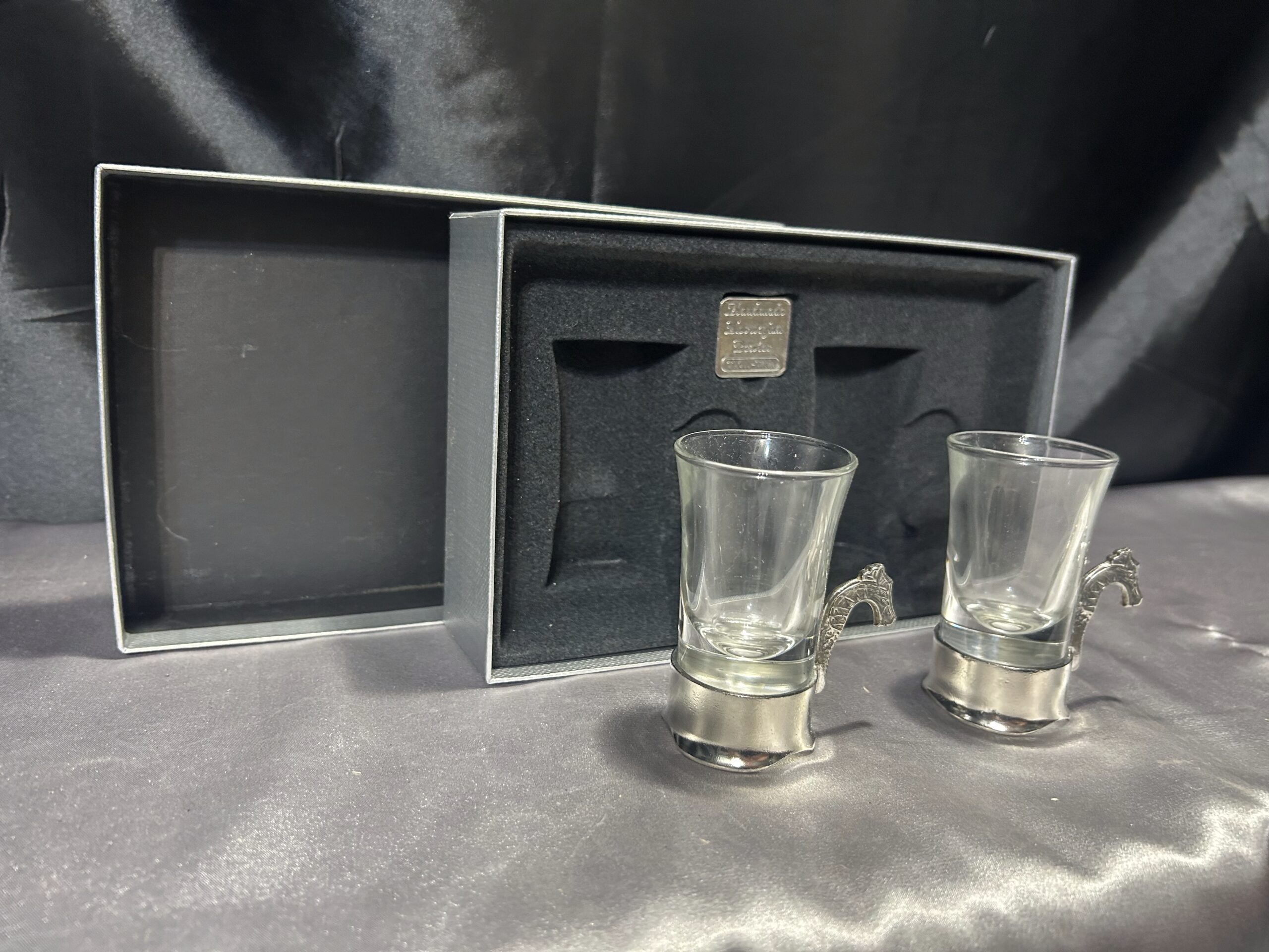 Zestaw 4 Szklaneczek w Cynowym Stelażu z Uchem