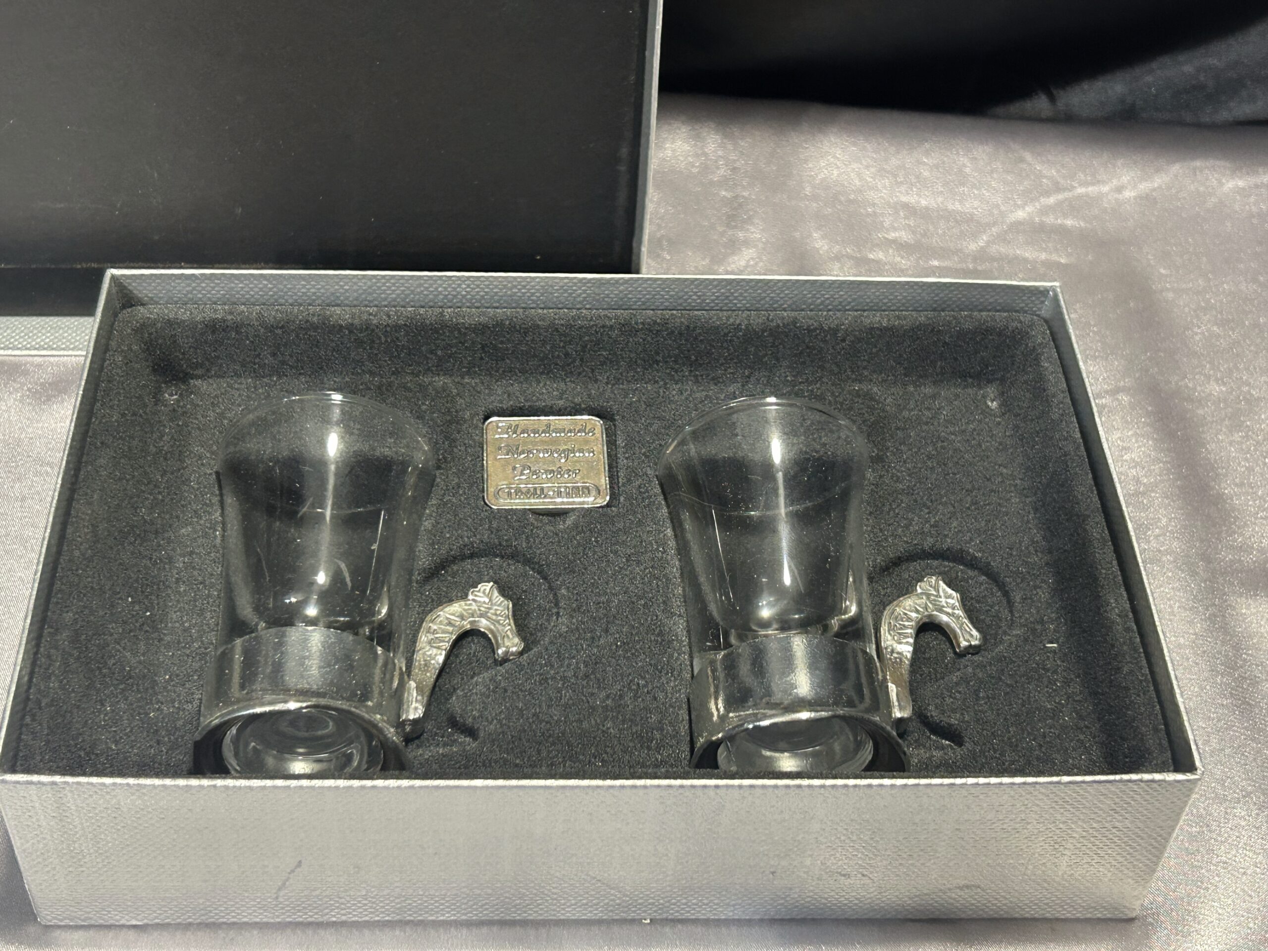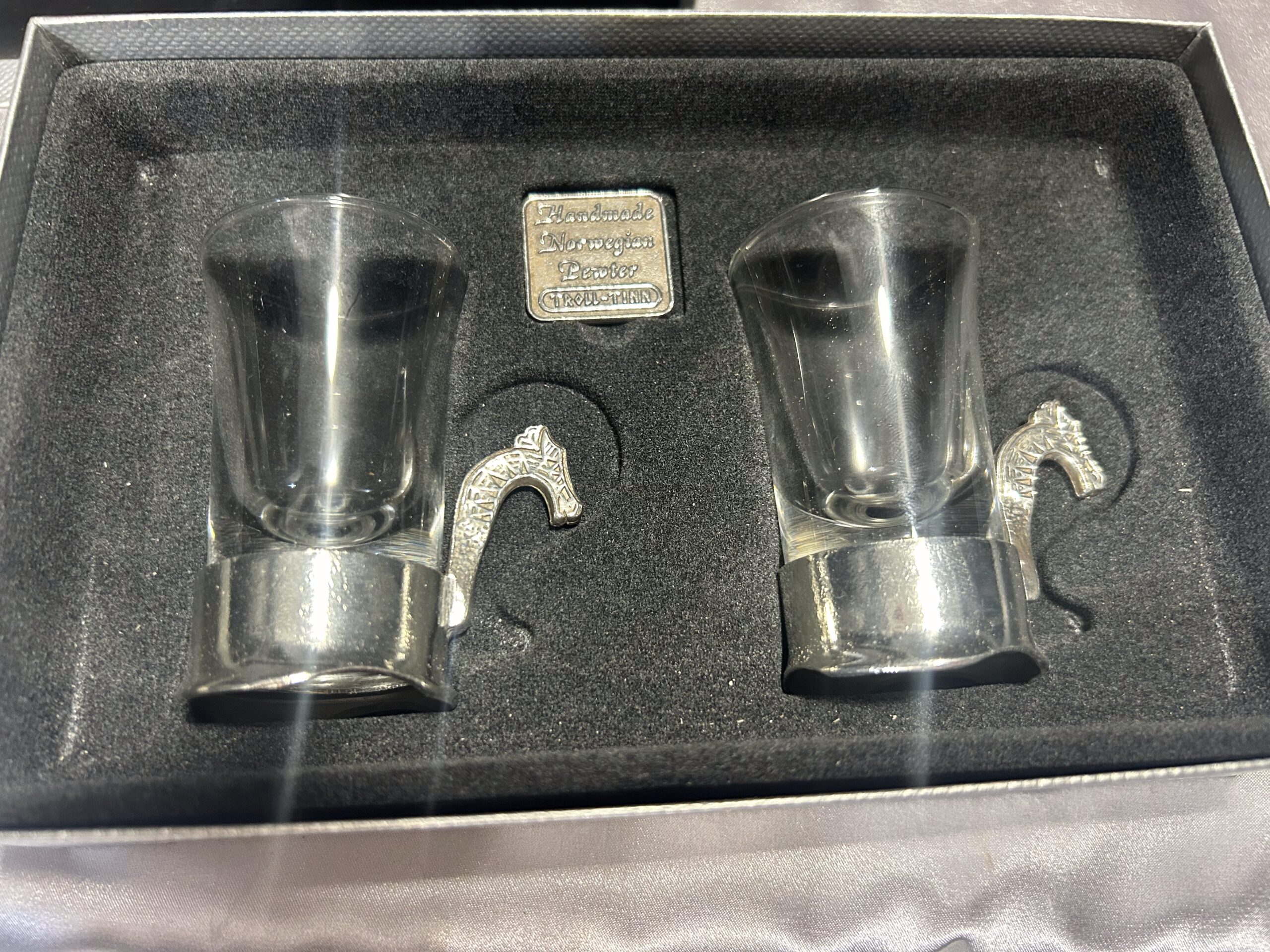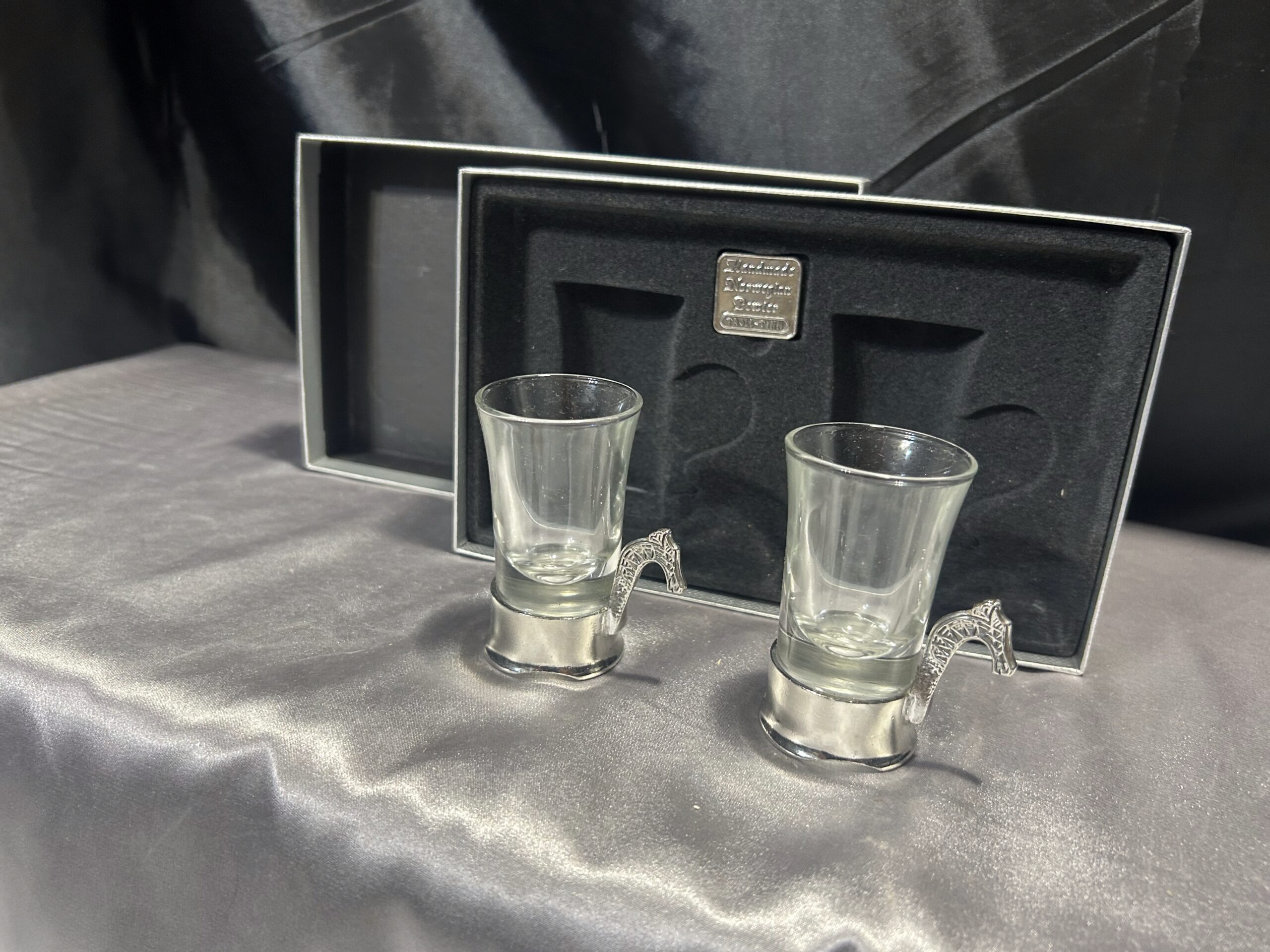 Prezentujemy wyjątkowy zestaw dwóch ozdobnych kieliszków, przywiezionych z Norwegii. To niezwykłe połączenie szkła i misternie zdobionej cyny, której ucho przedstawia głowę smoka – nawiązanie do legendarnych wikingowskich drakkarów. Każdy kieliszek to ręczna robota, sygnowana przez twórcę, co podkreśla ich unikalność i kolekcjonerską wartość.