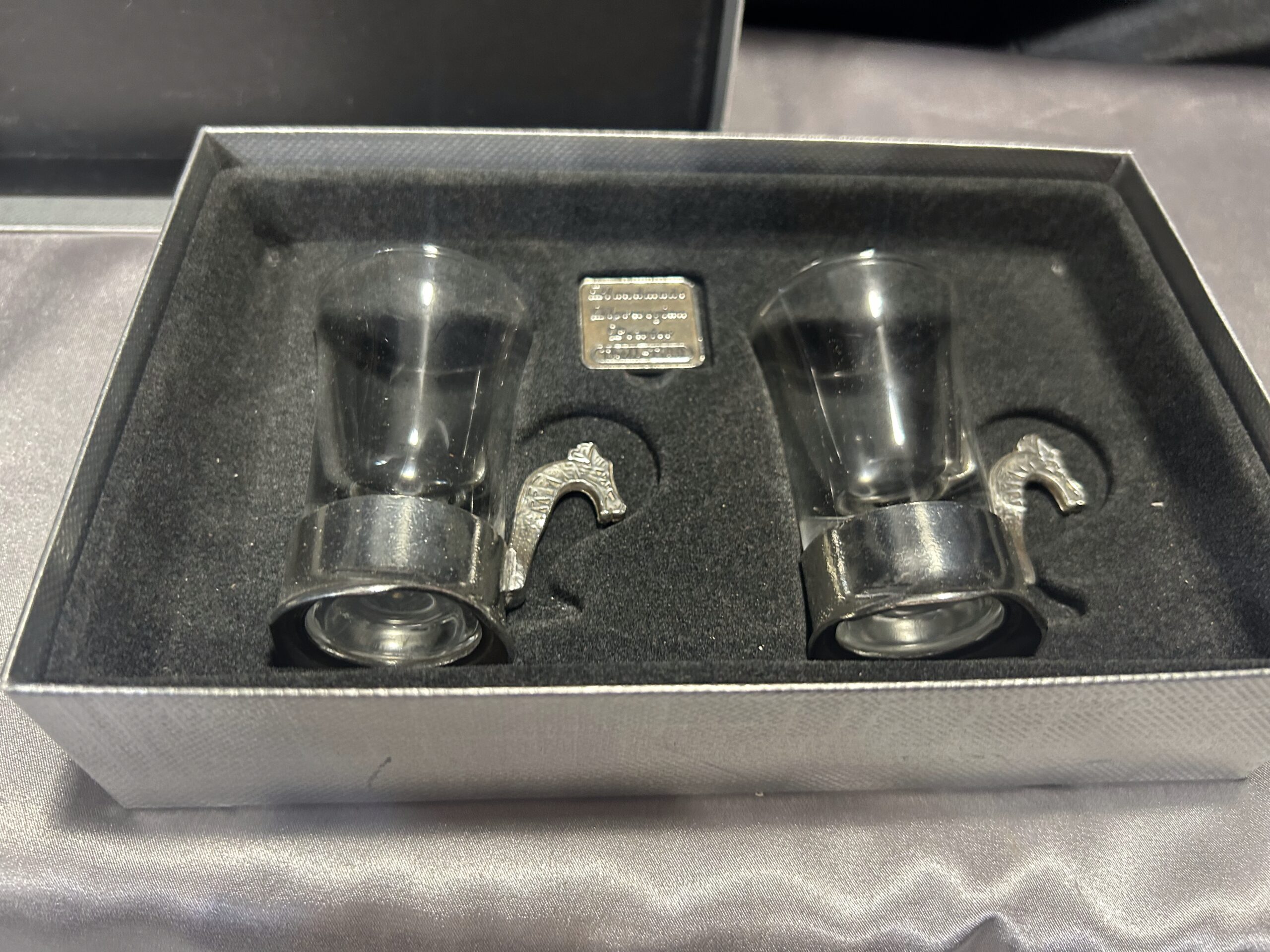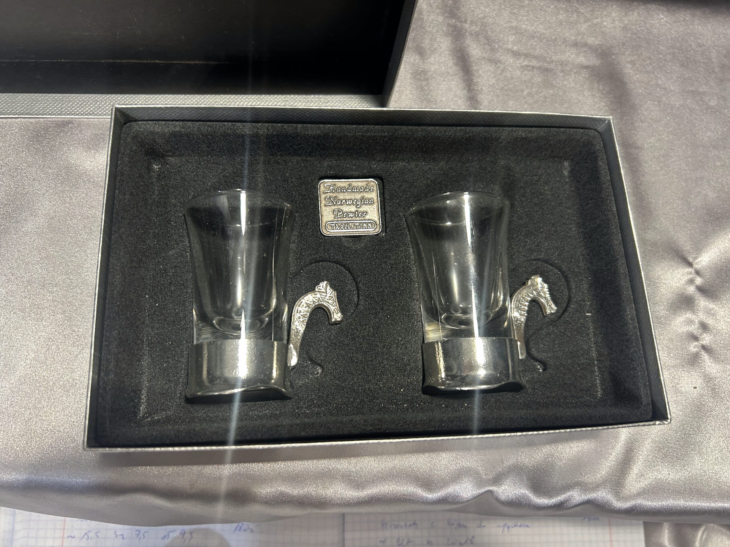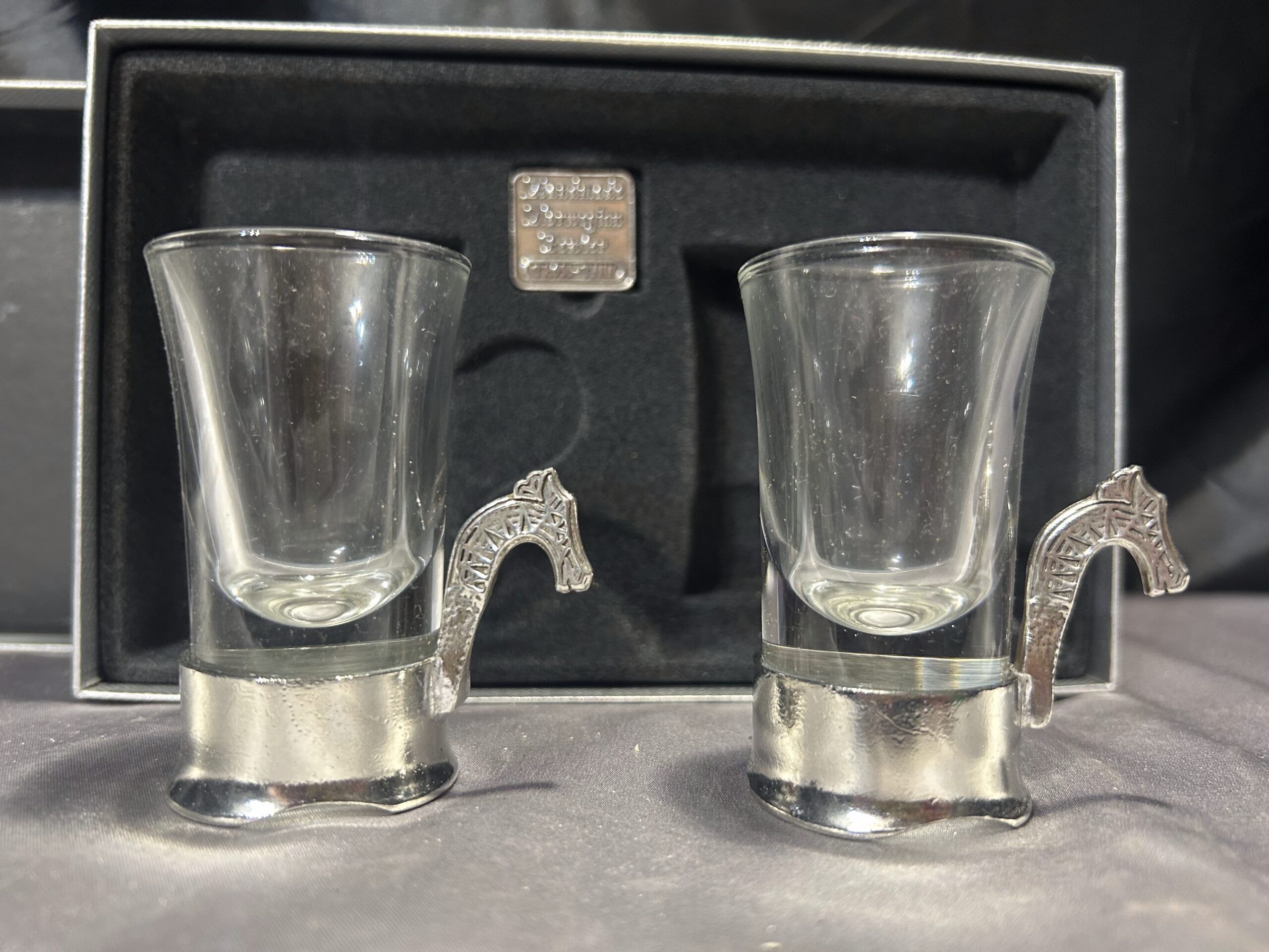 Prezentujemy wyjątkowy zestaw dwóch ozdobnych kieliszków, przywiezionych z Norwegii. To niezwykłe połączenie szkła i misternie zdobionej cyny, której ucho przedstawia głowę smoka – nawiązanie do legendarnych wikingowskich drakkarów. Każdy kieliszek to ręczna robota, sygnowana przez twórcę, co podkreśla ich unikalność i kolekcjonerską wartość.