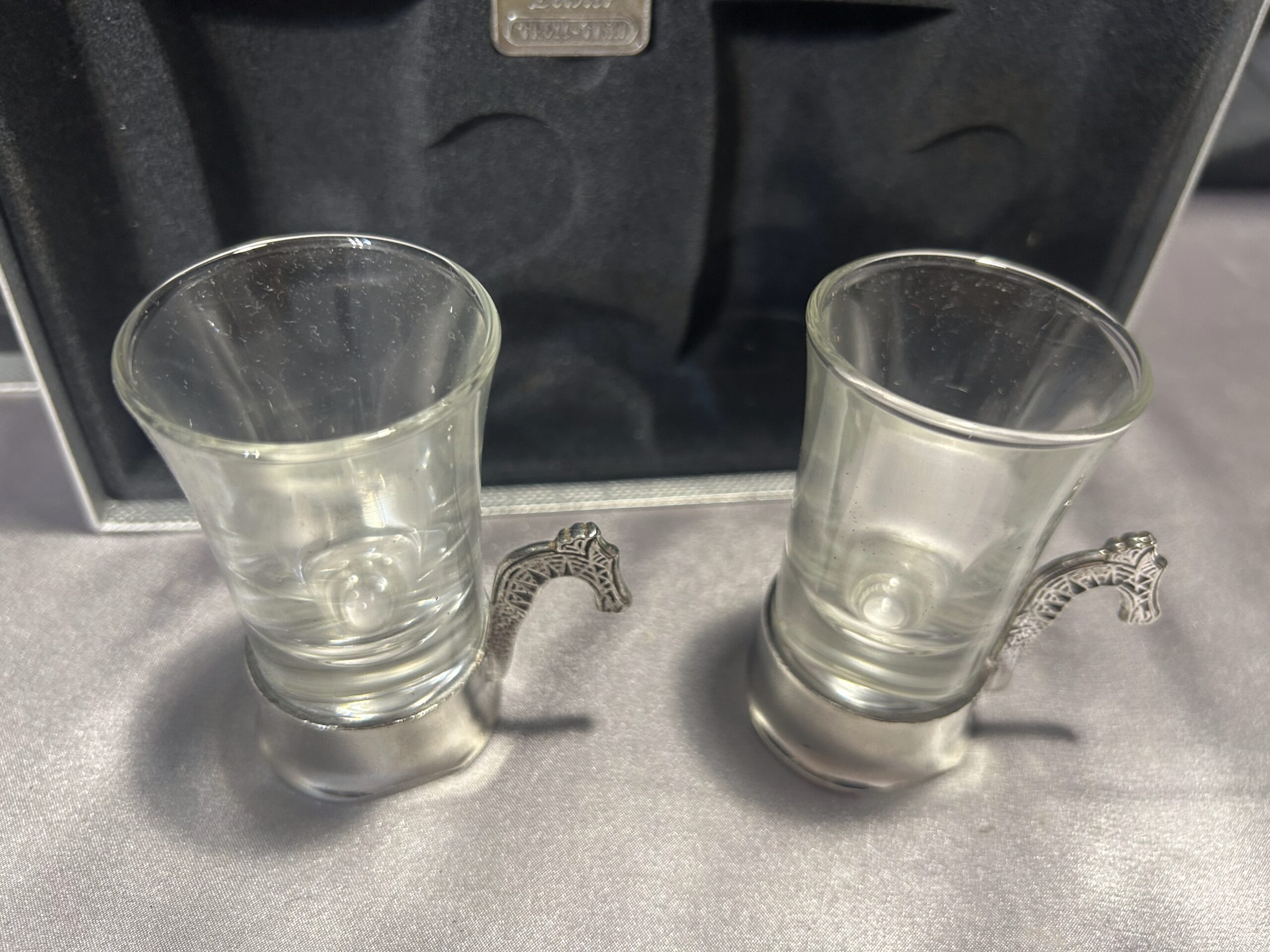 Zestaw Ozdobnych Kieliszków z Norwegii – Połączenie Szkła i Cyny z Motywem Smoka