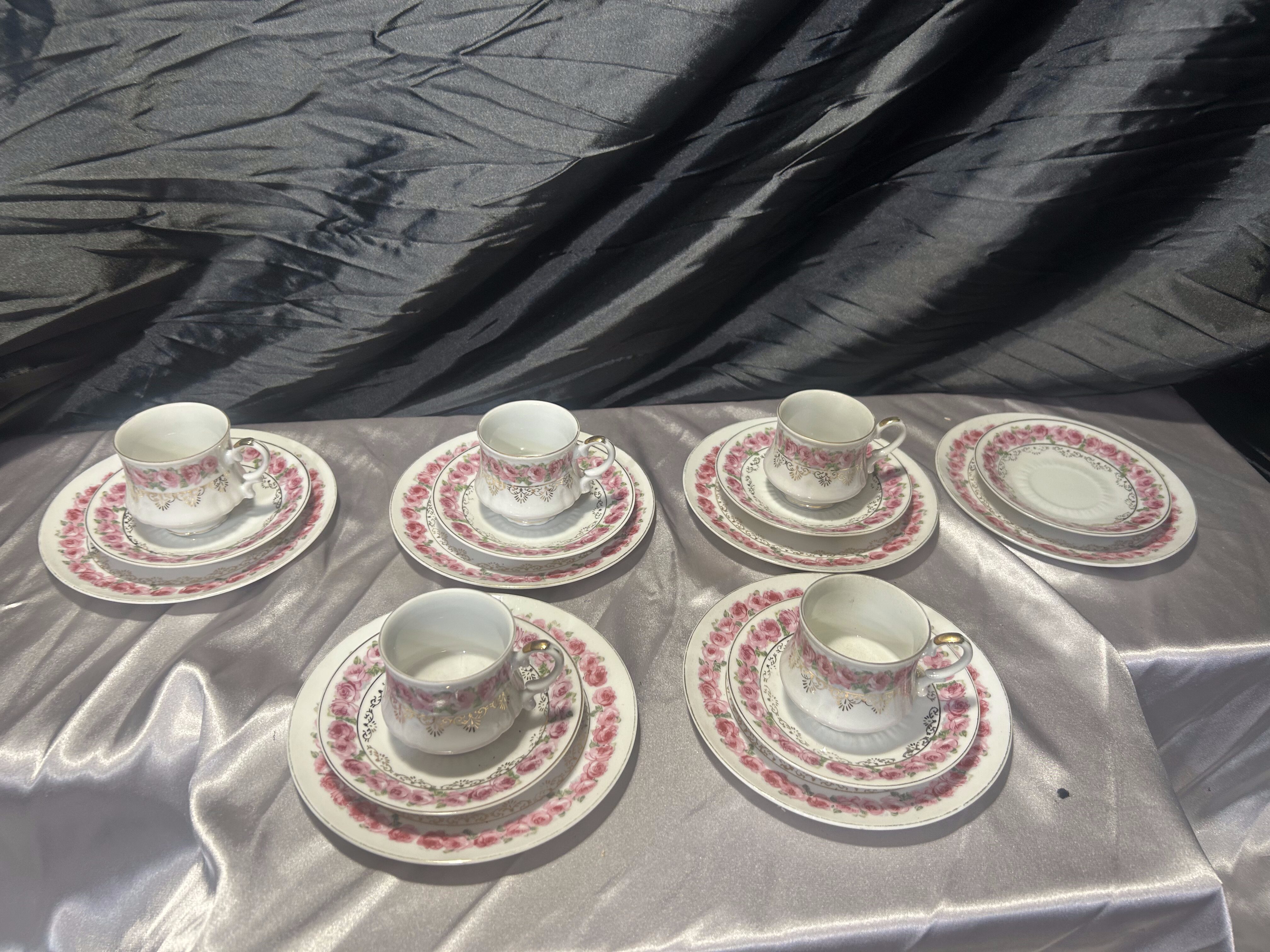 Elegancki zestaw porcelanowy typu Trio, składający się z pięciu filiżanek z talerzykami deserowymi i spodkami, utrzymany w klasycznej, romantycznej stylistyce. Każdy element zdobiony jest pięknym, różowym motywem kwiatowym z delikatnymi złoceniami, który nadaje całości wyjątkowego uroku i lekkości.