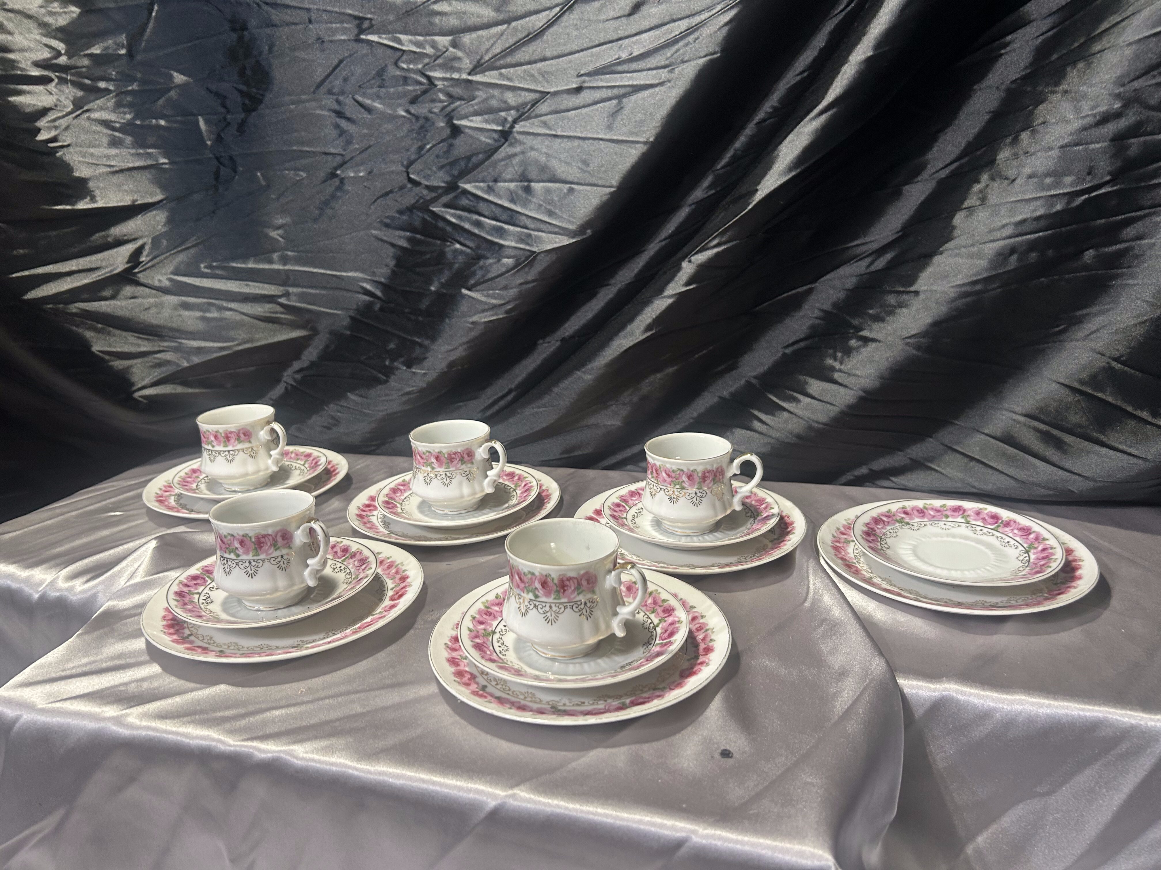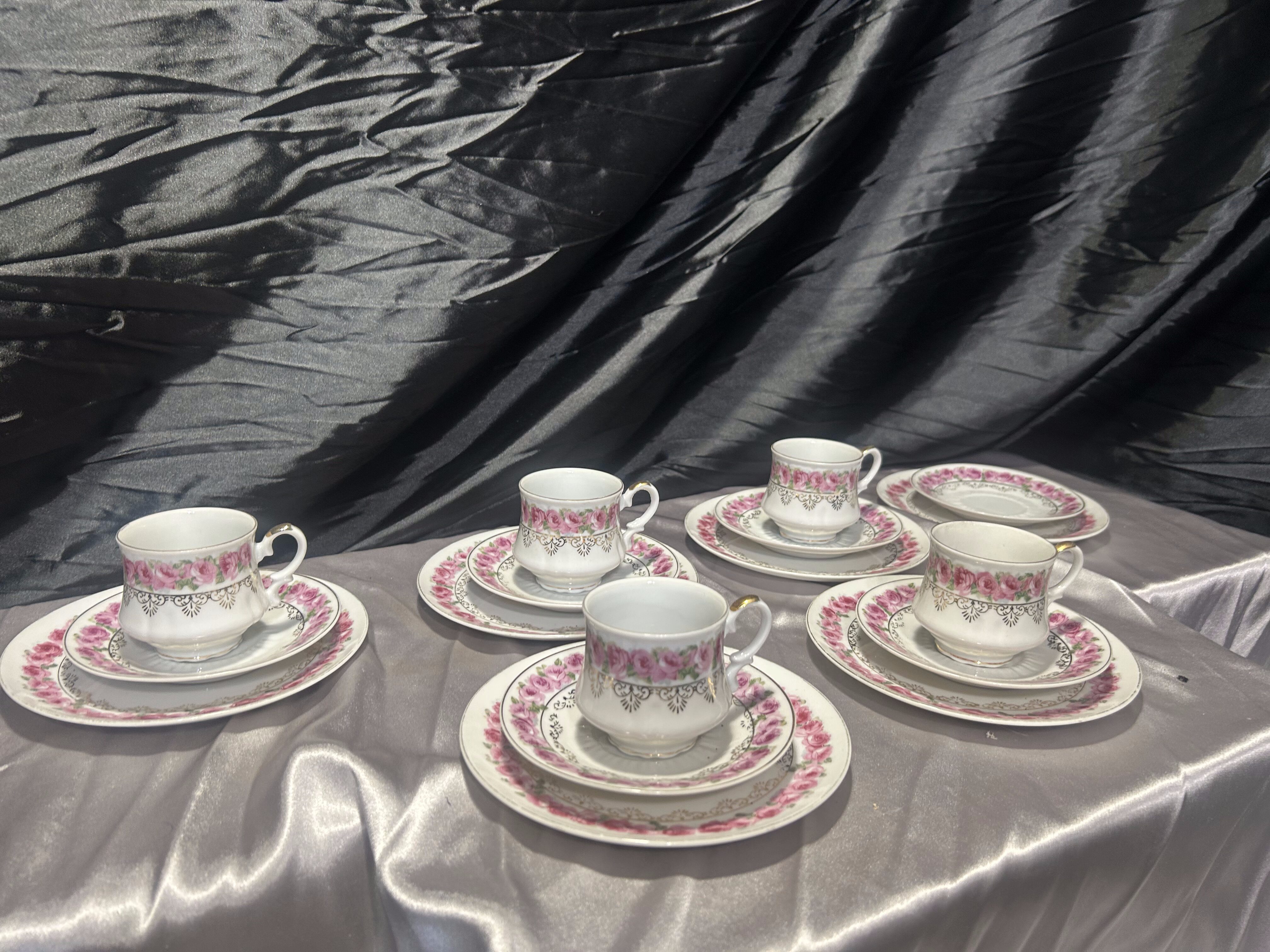 - Zestaw porcelany – filiżanki Trio z różowym kwiecistym wzorem – komplet 5 sztuk