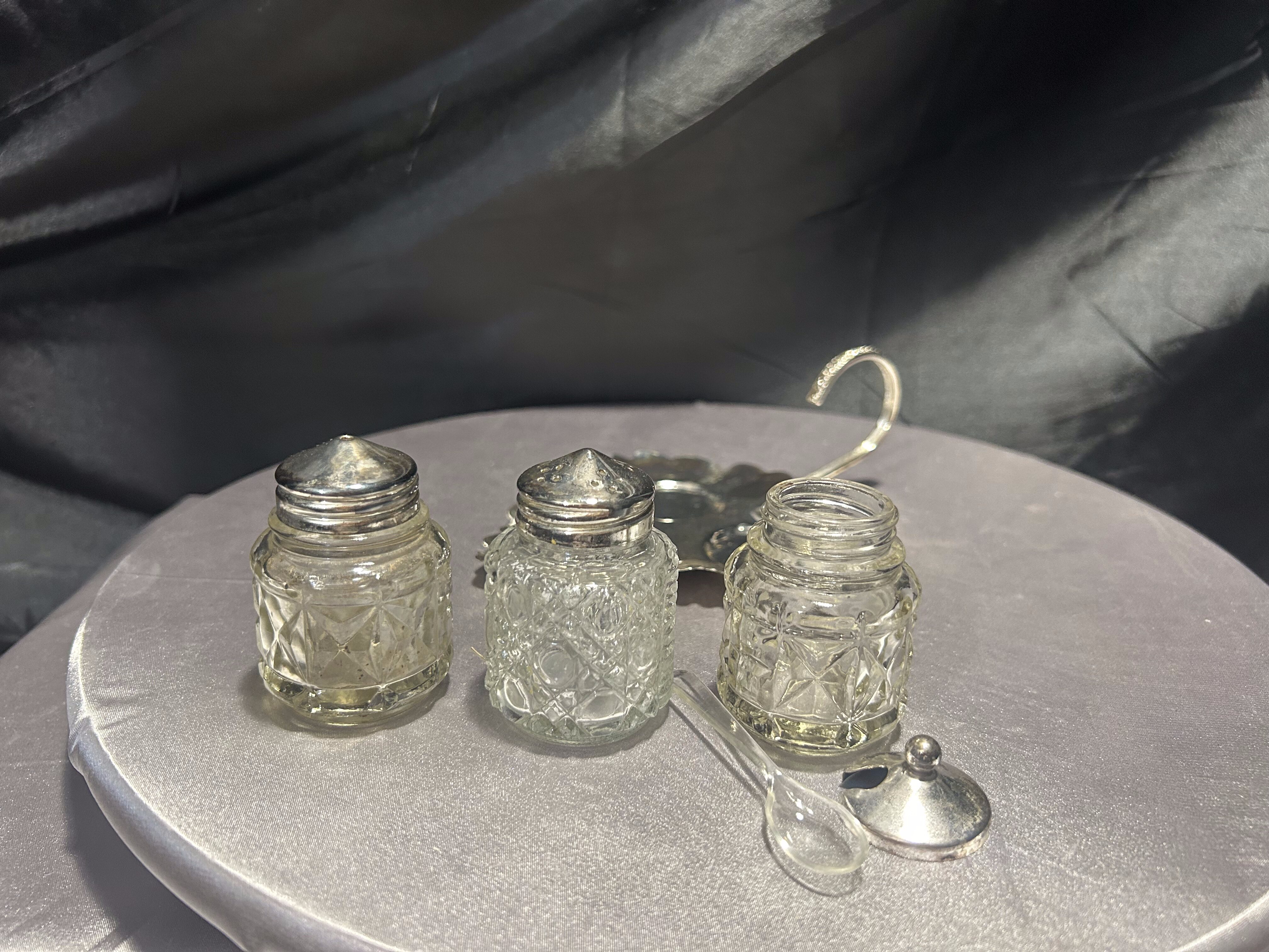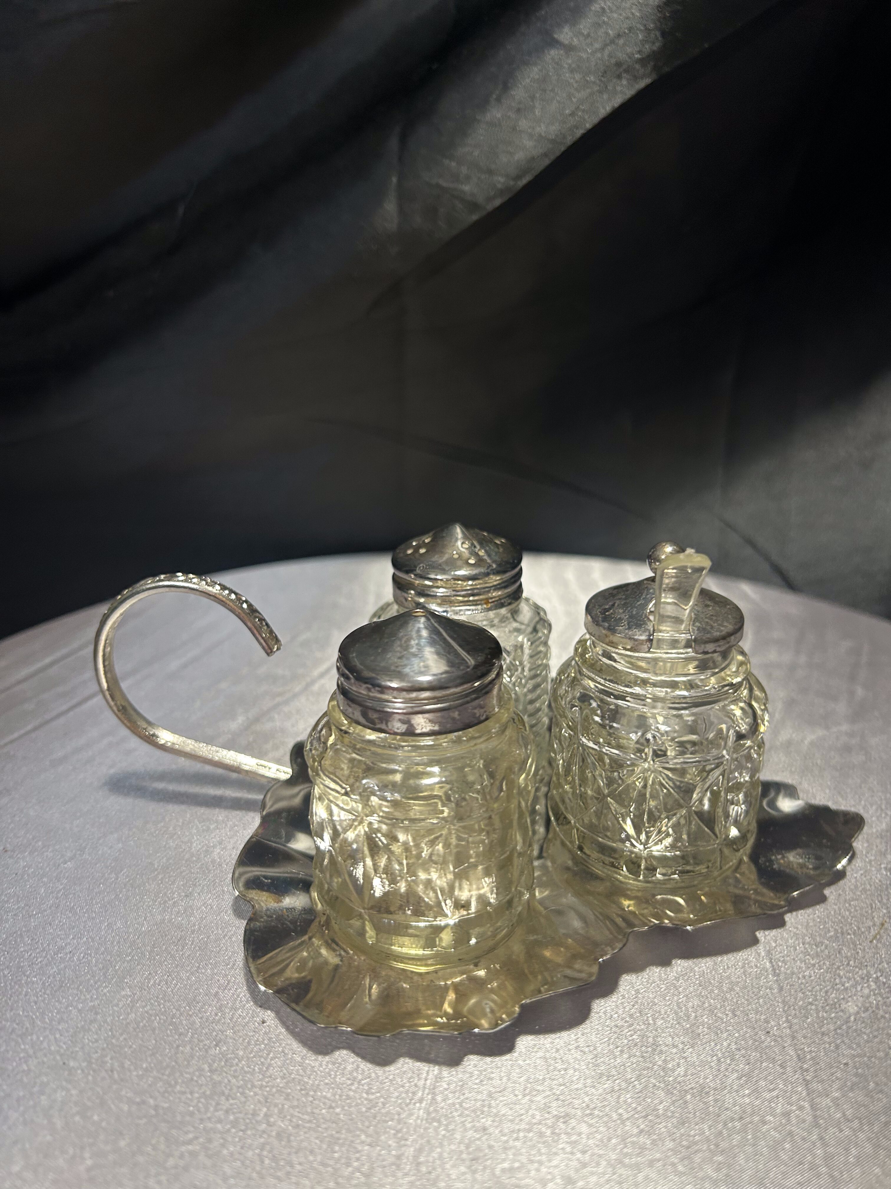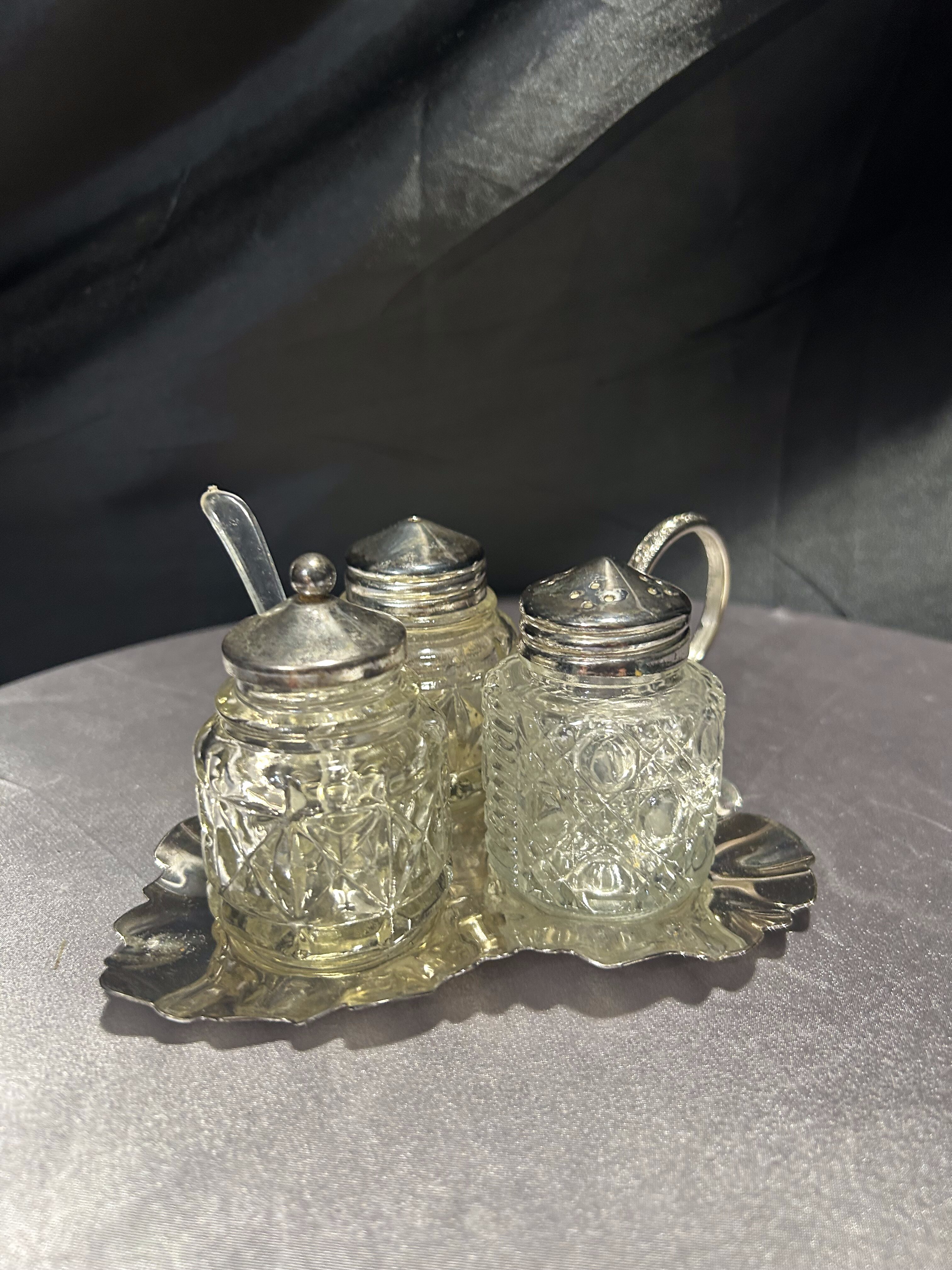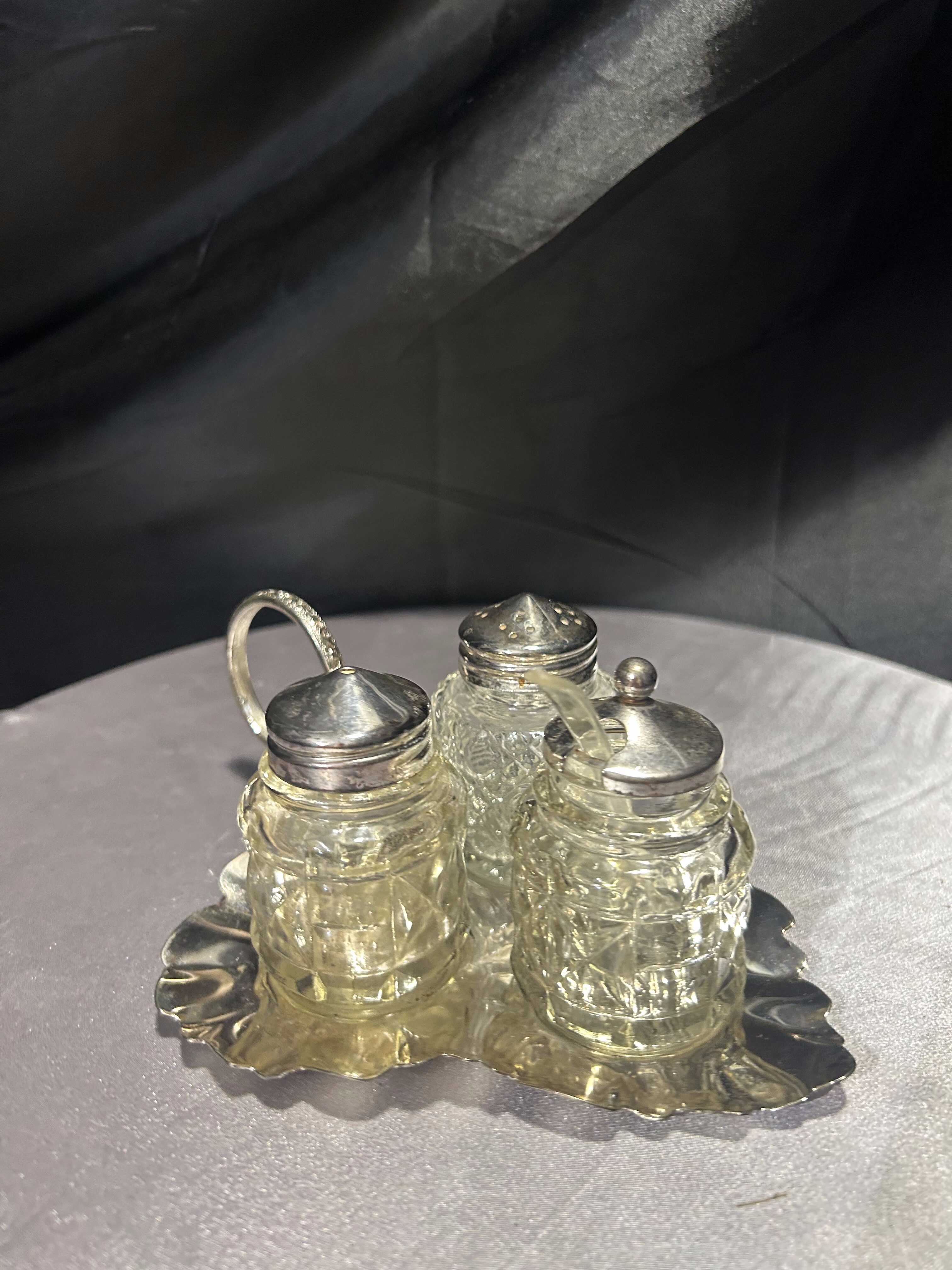 Stylowy trzyczęściowy zestaw przyprawników, obejmujący solniczkę, pieprzniczkę oraz cukiernicę z pokrywką i łyżeczką. Naczynia wykonane z grubego, tłoczonego szkła o geometrycznym wzorze przywodzącym na myśl kryształowe detale. Całość umieszczona na srebrzystej, dekoracyjnej tacy w kształcie liścia z ozdobnym uchwytem do przenoszenia. Tego typu zestawy gościły niegdyś na eleganckich stołach w domach mieszczańskich i dworskich – dziś stanowią doskonały akcent vintage do kuchni, salonu lub stylowej jadalni.