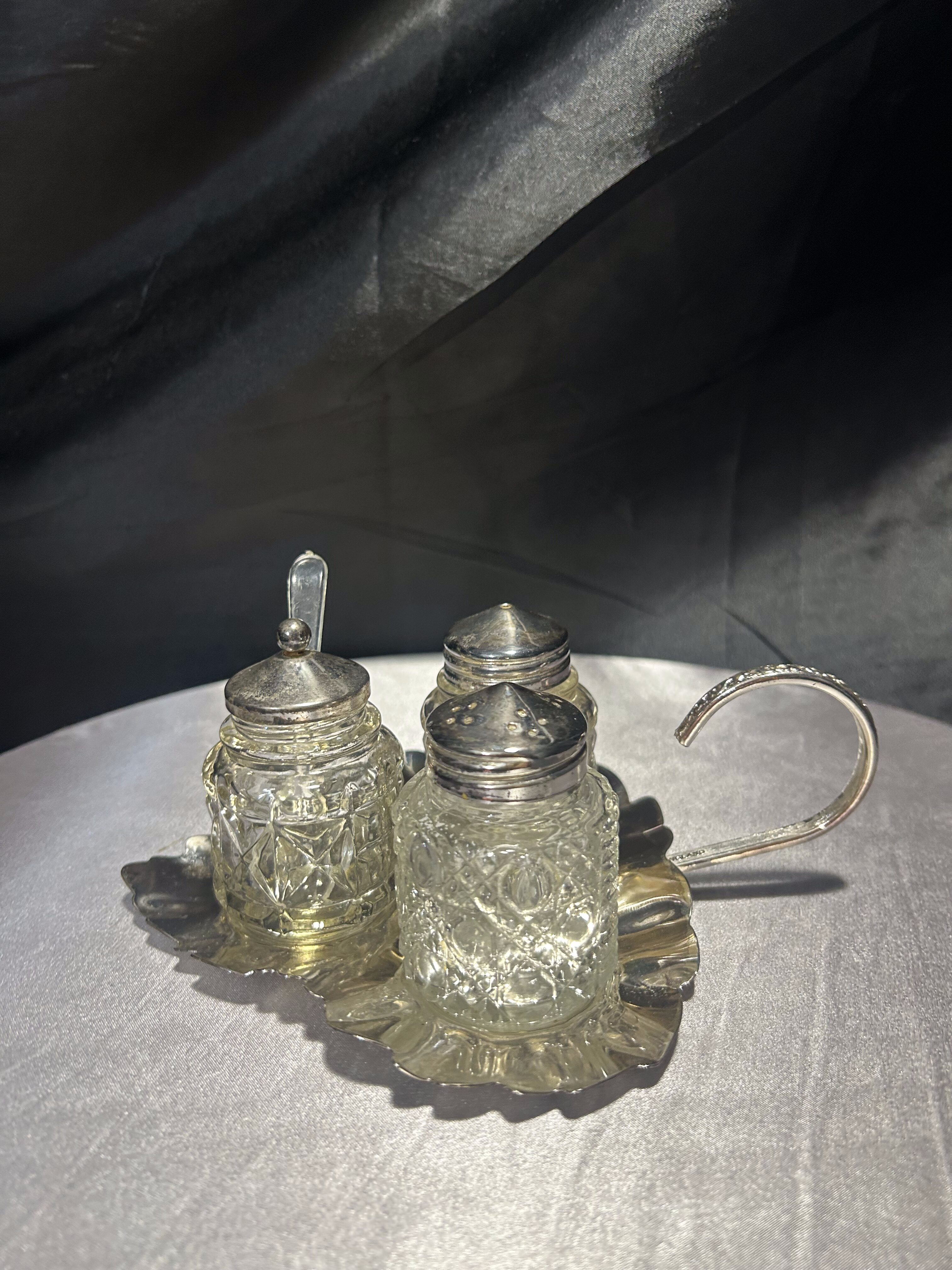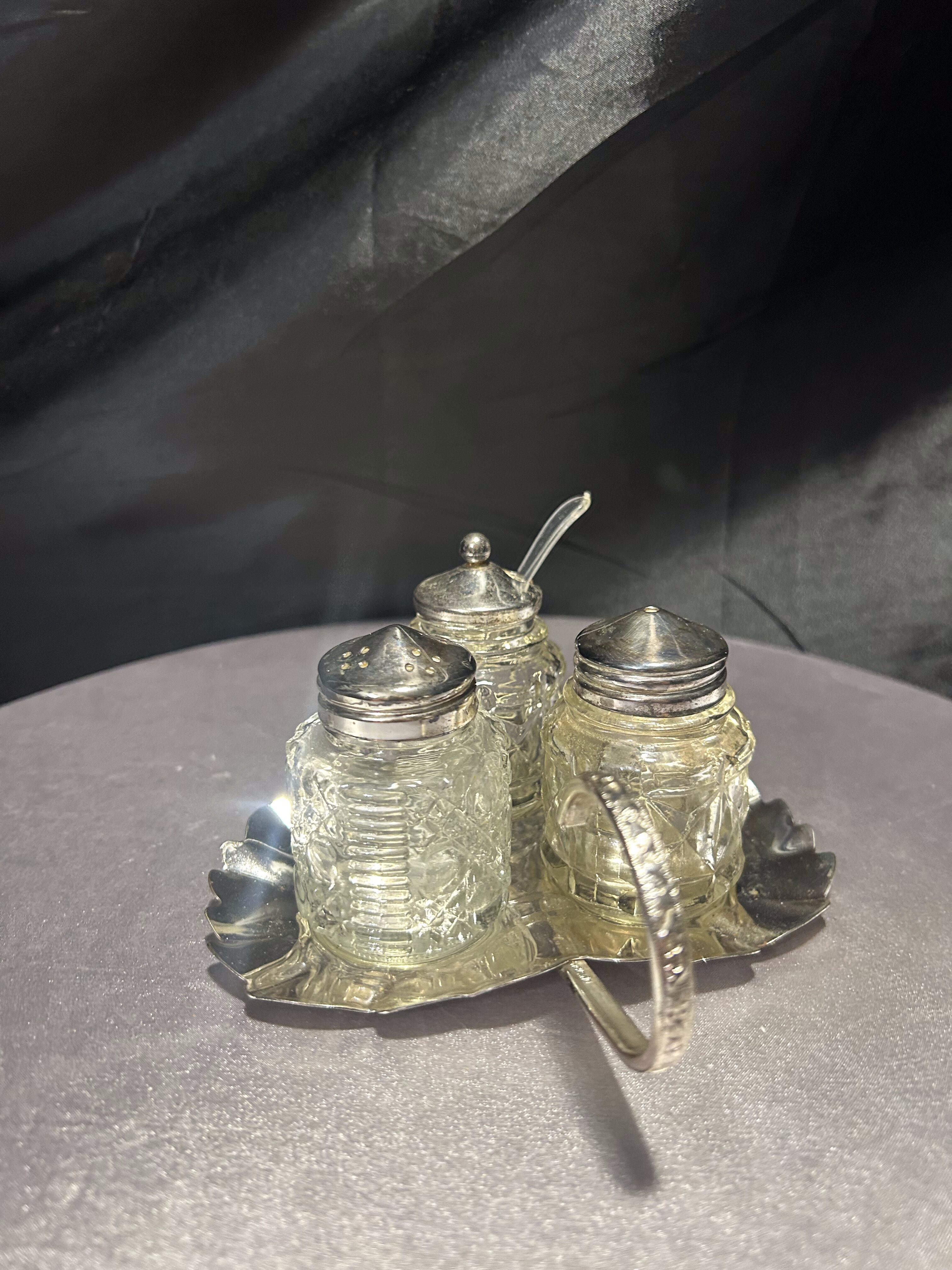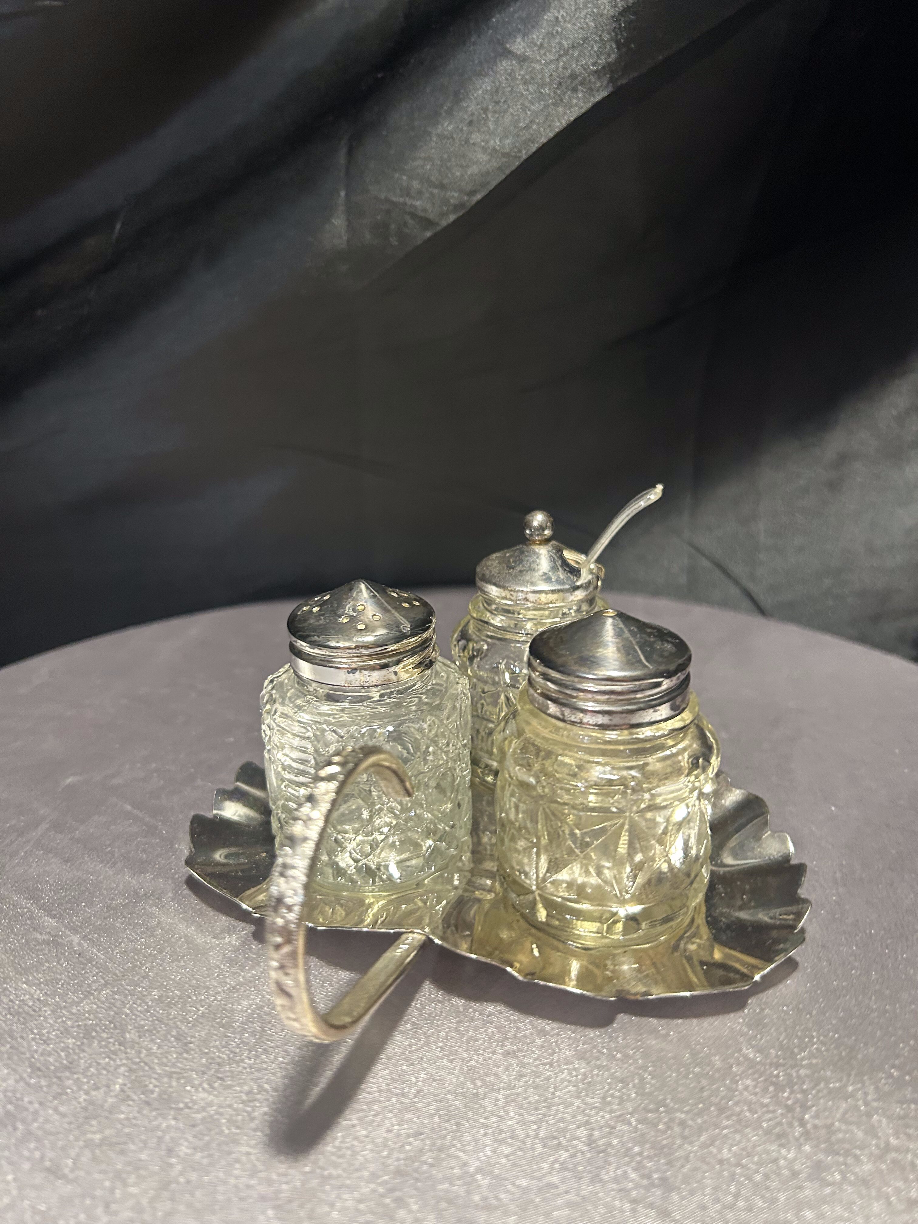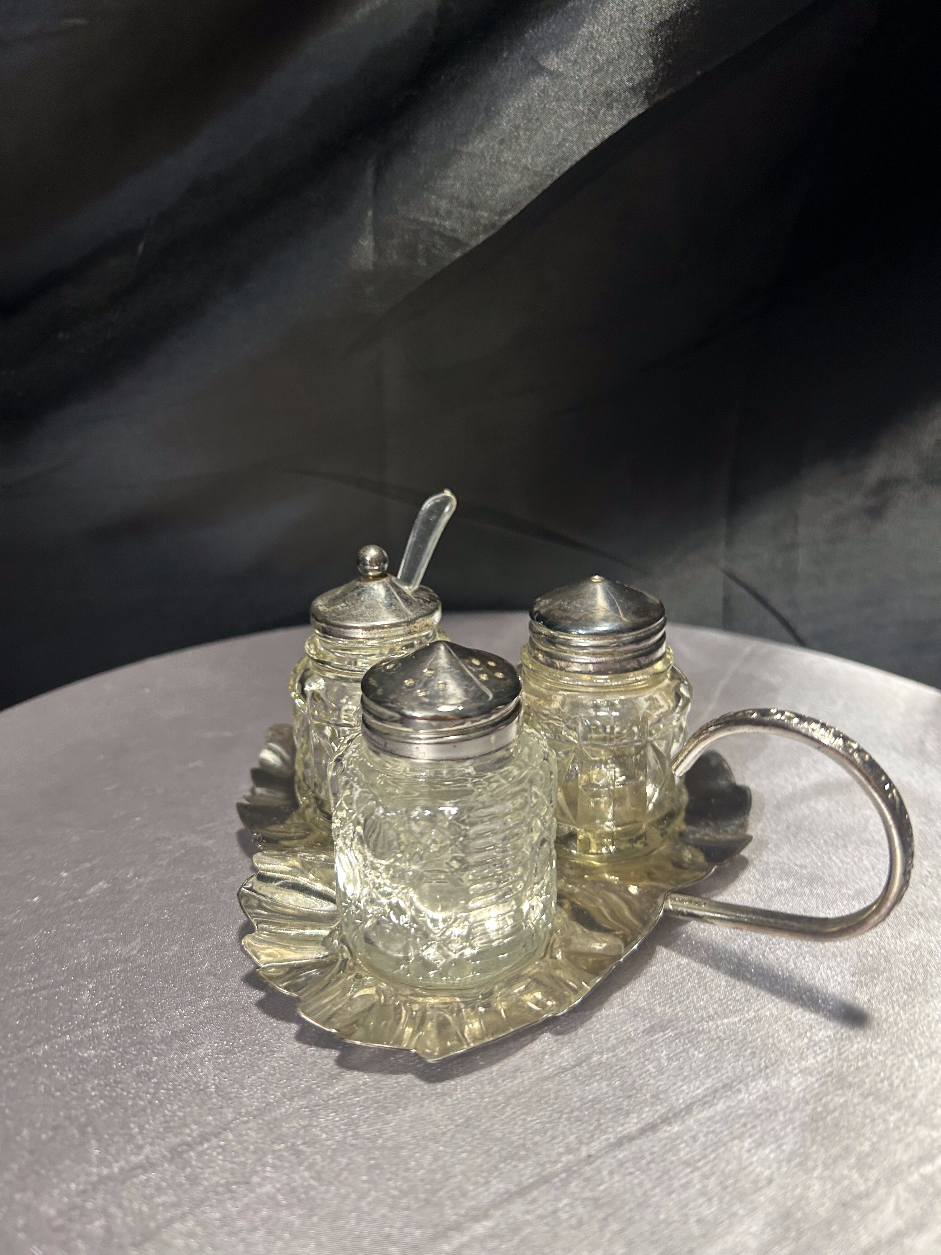 - Zestaw przyprawników na tacy w kształcie liścia – styl vintage – szkło i metal