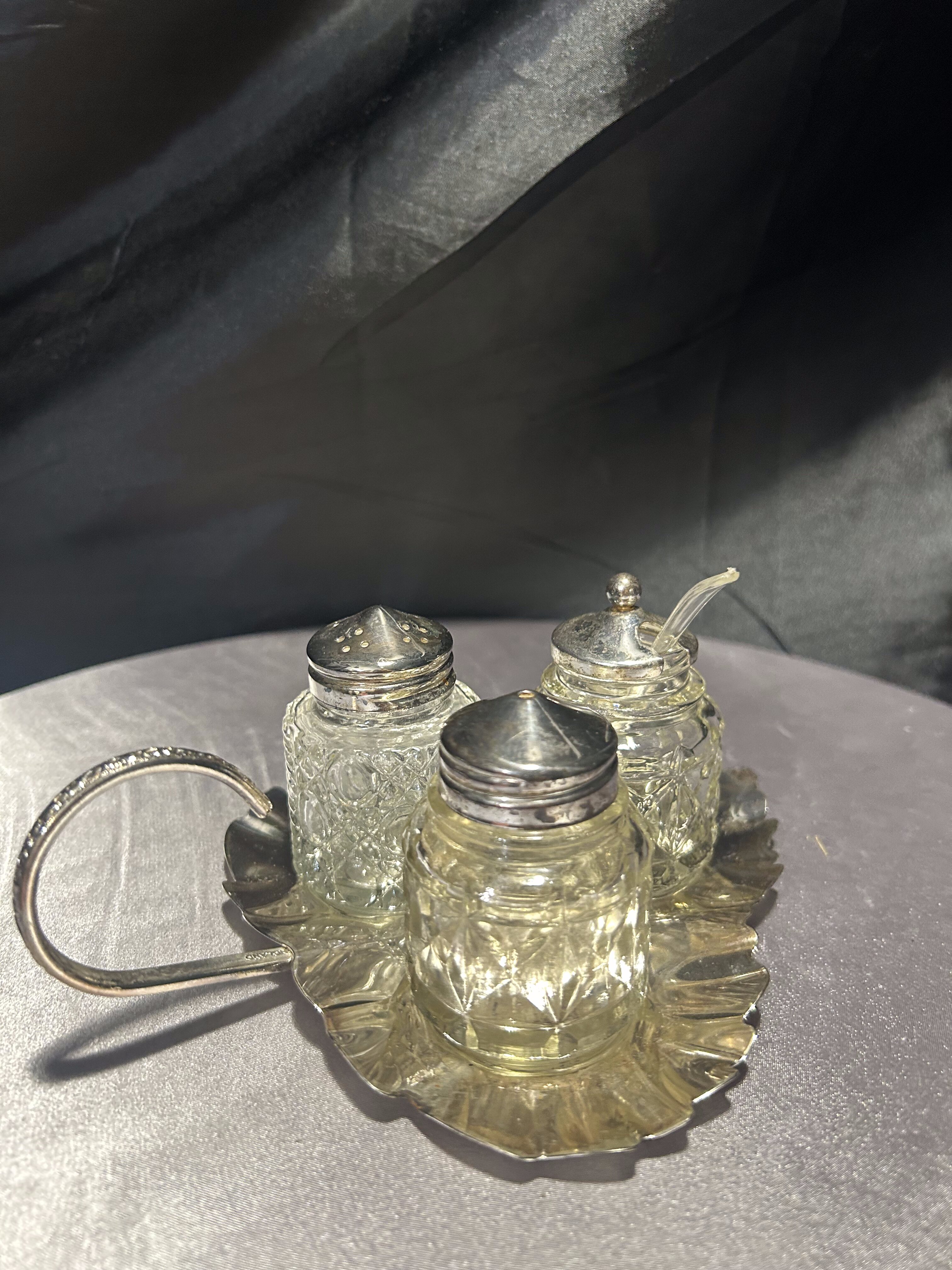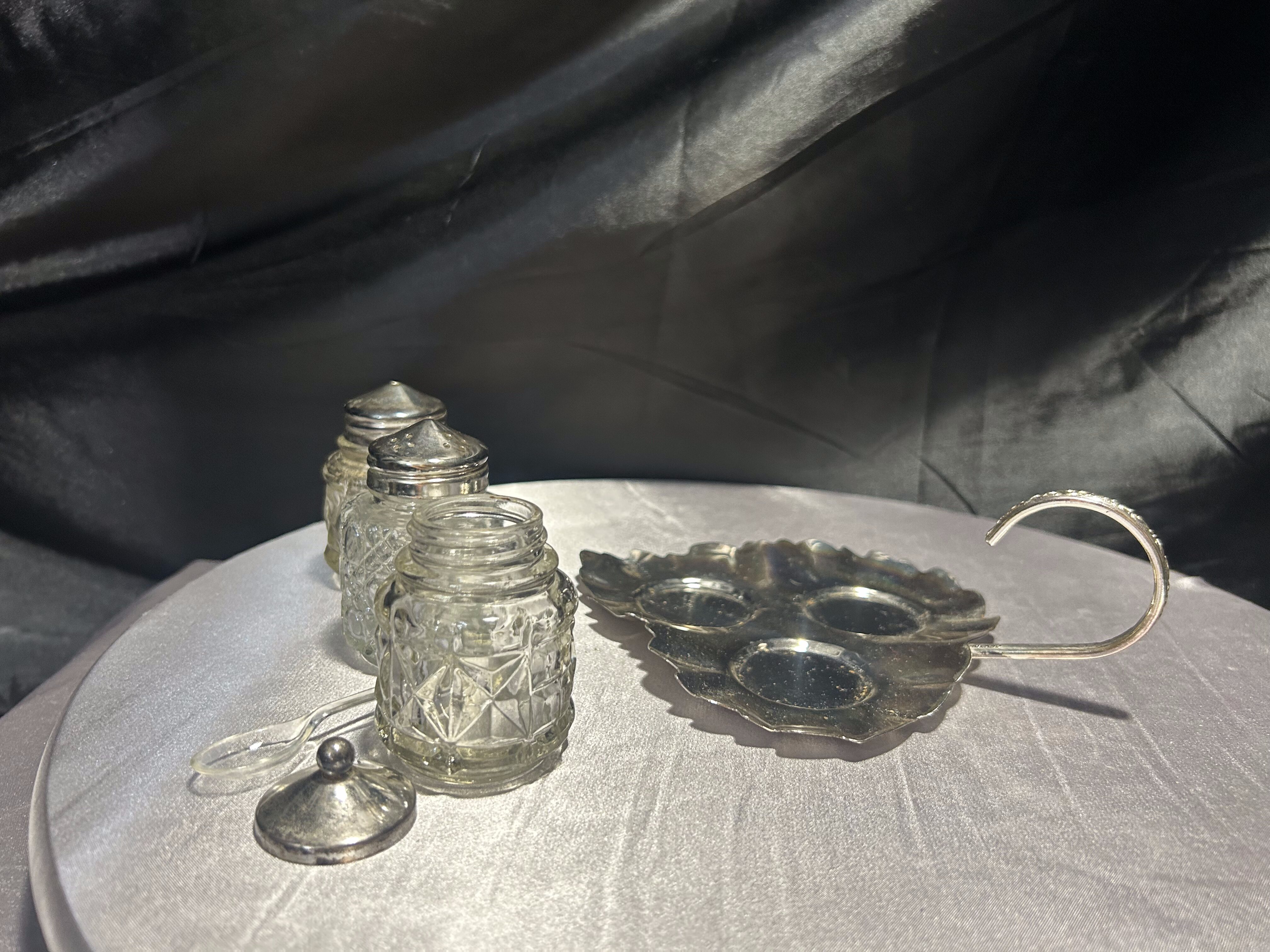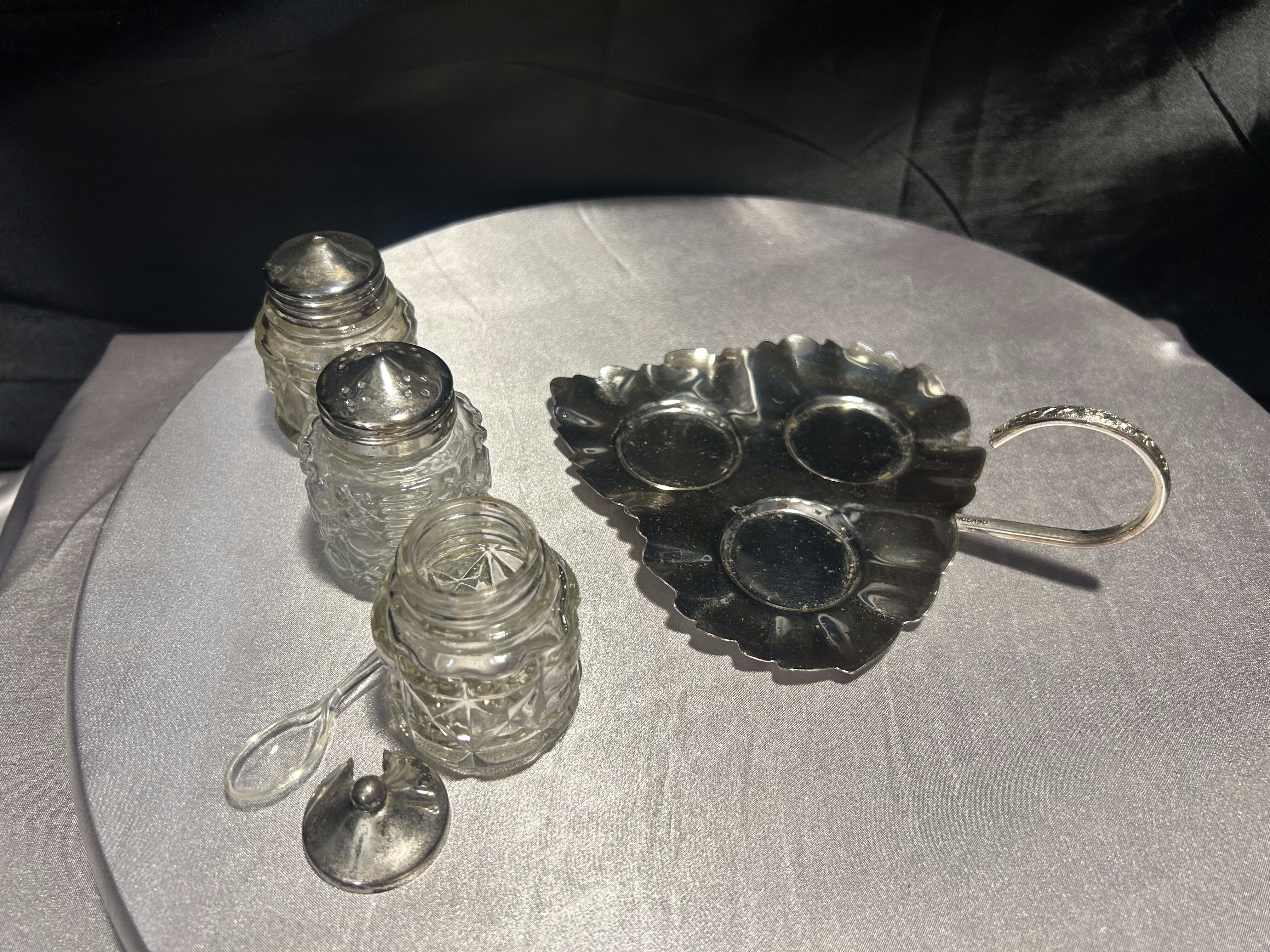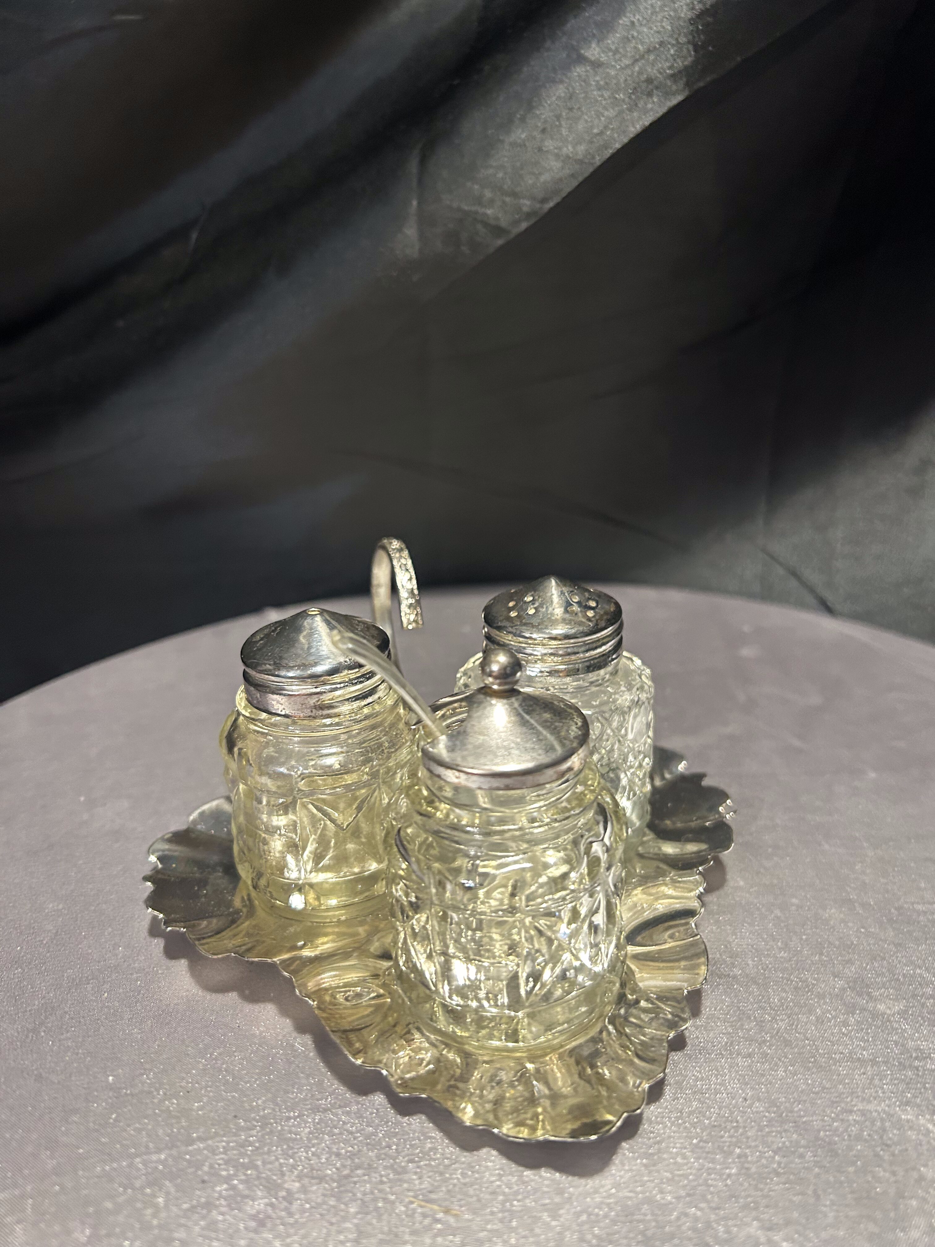 - Zestaw przyprawników na tacy w kształcie liścia – styl vintage – szkło i metal