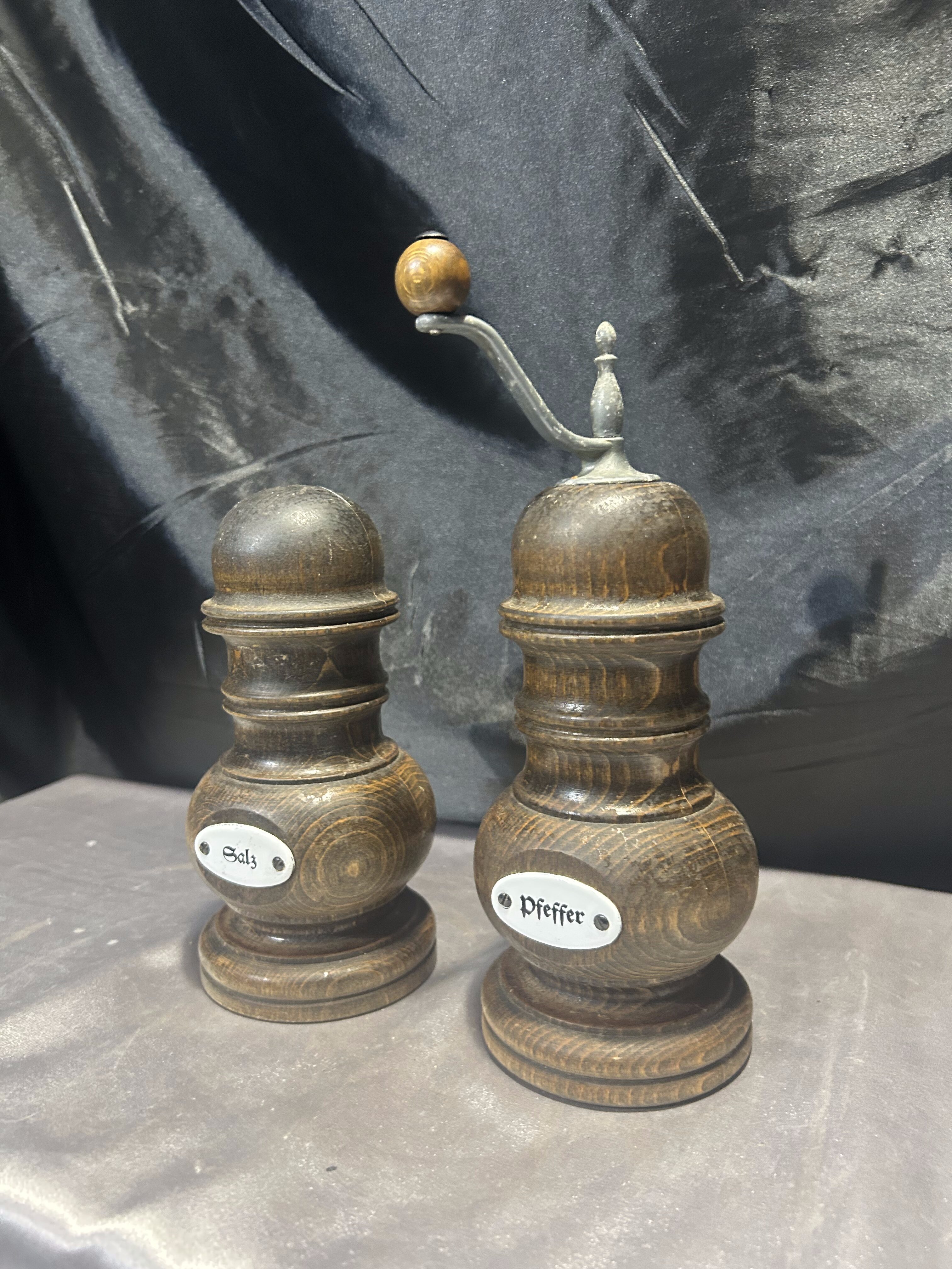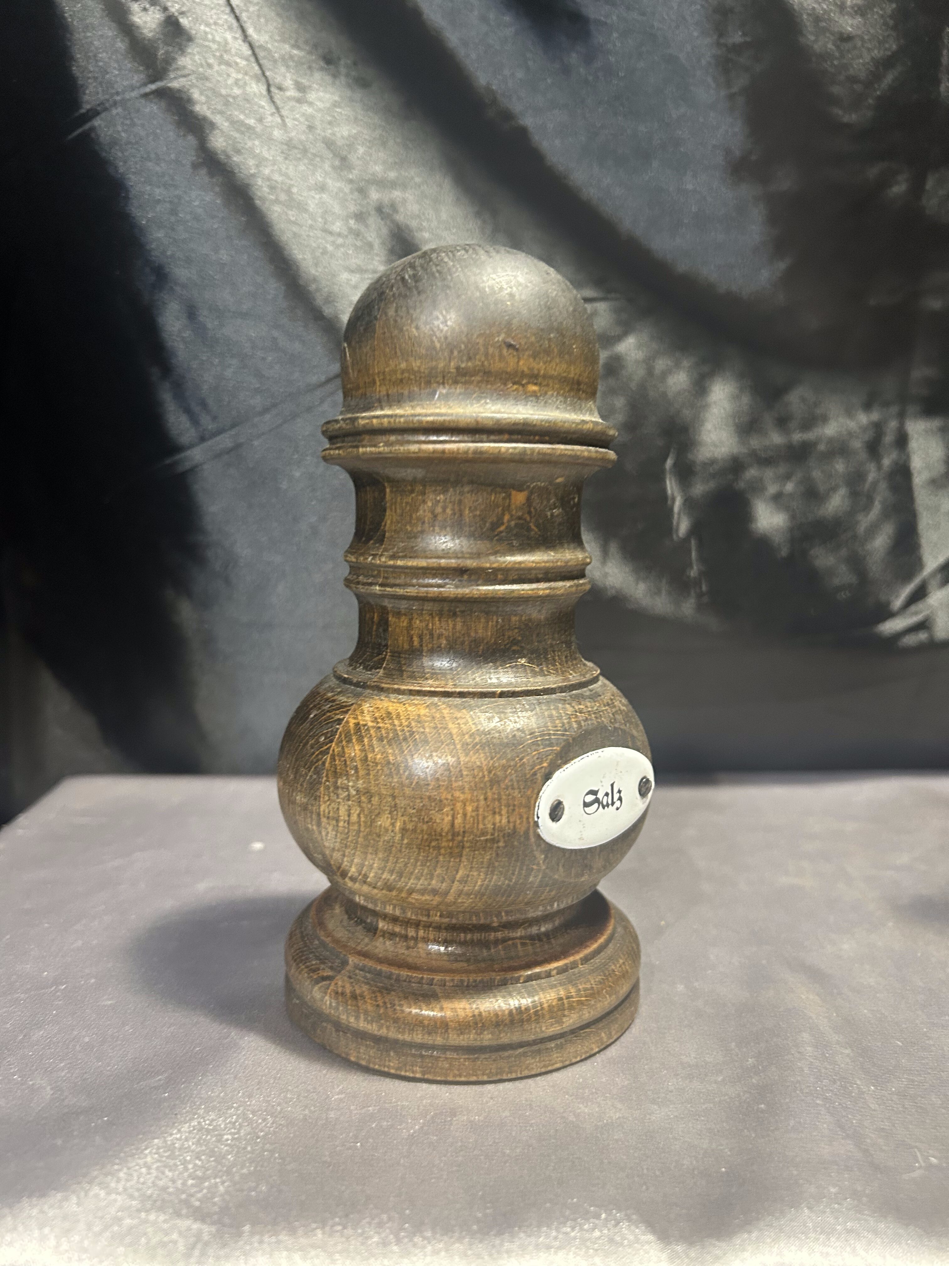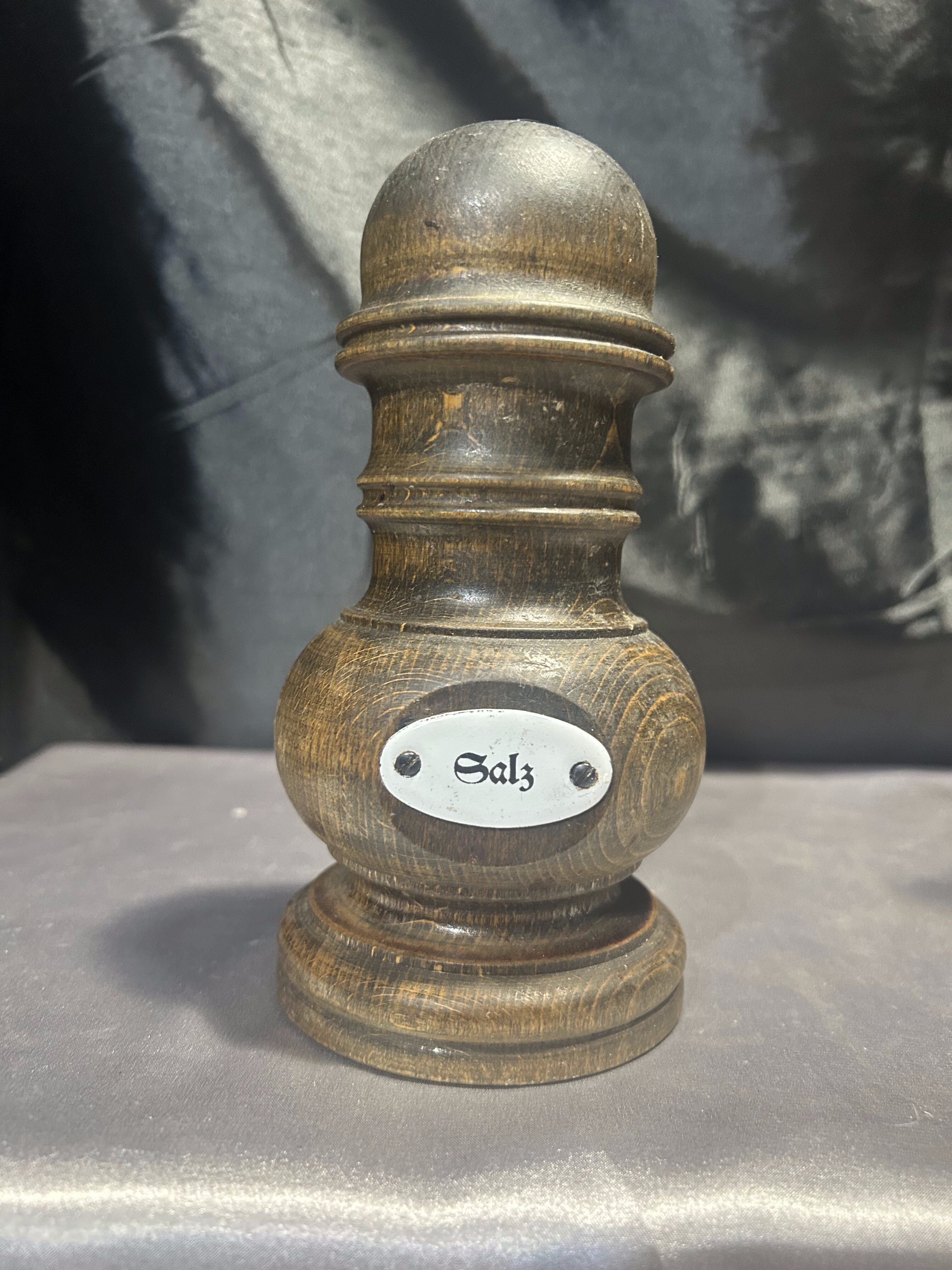 Na sprzedaż elegancki zestaw składający się z drewnianej solniczki oraz pieprzniczki w formie wygodnego młynka. Obie części ozdobione są białymi emaliowanymi tabliczkami z czarnym napisem: SALE (sól) i PFEFFER (pieprz). Zestaw wyróżnia się solidnym wykonaniem i klasycznym wyglądem – idealny do kuchni urządzonej w stylu retro, rustykalnym lub prowansalskim.