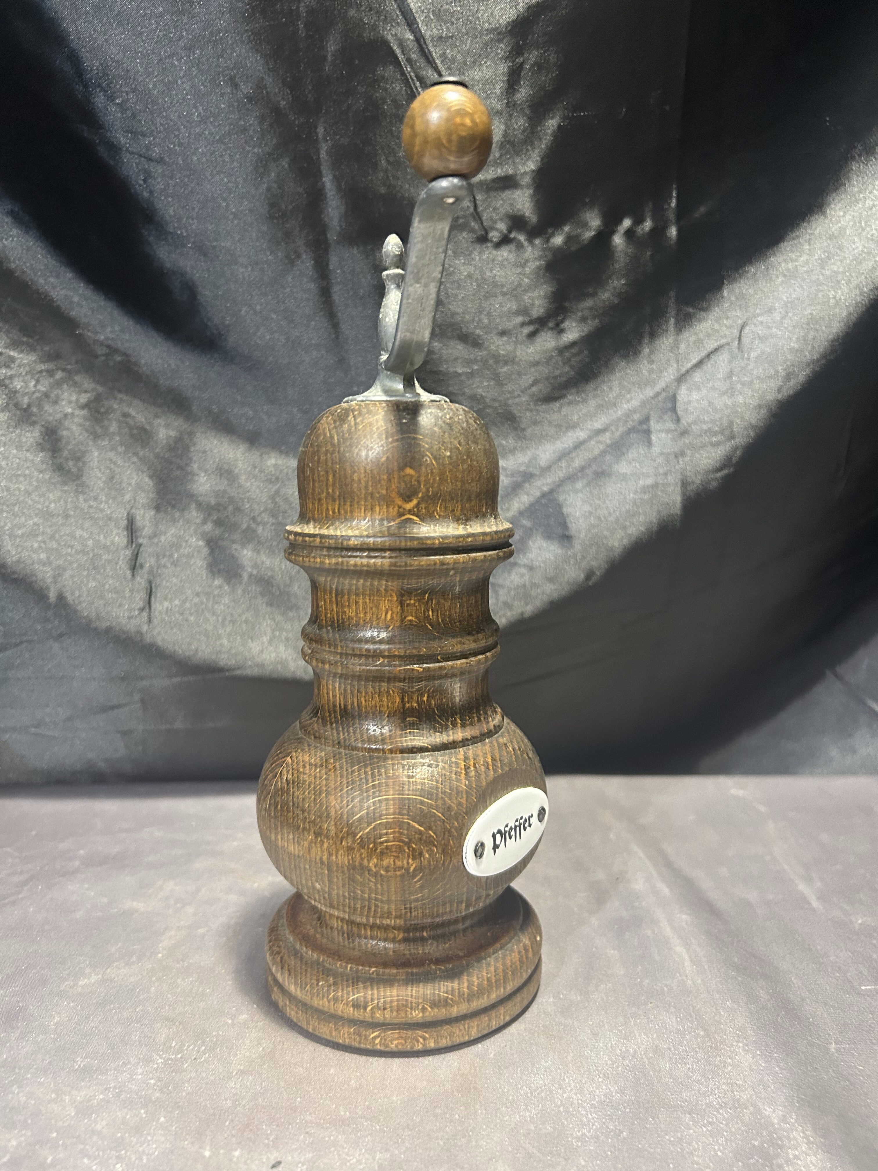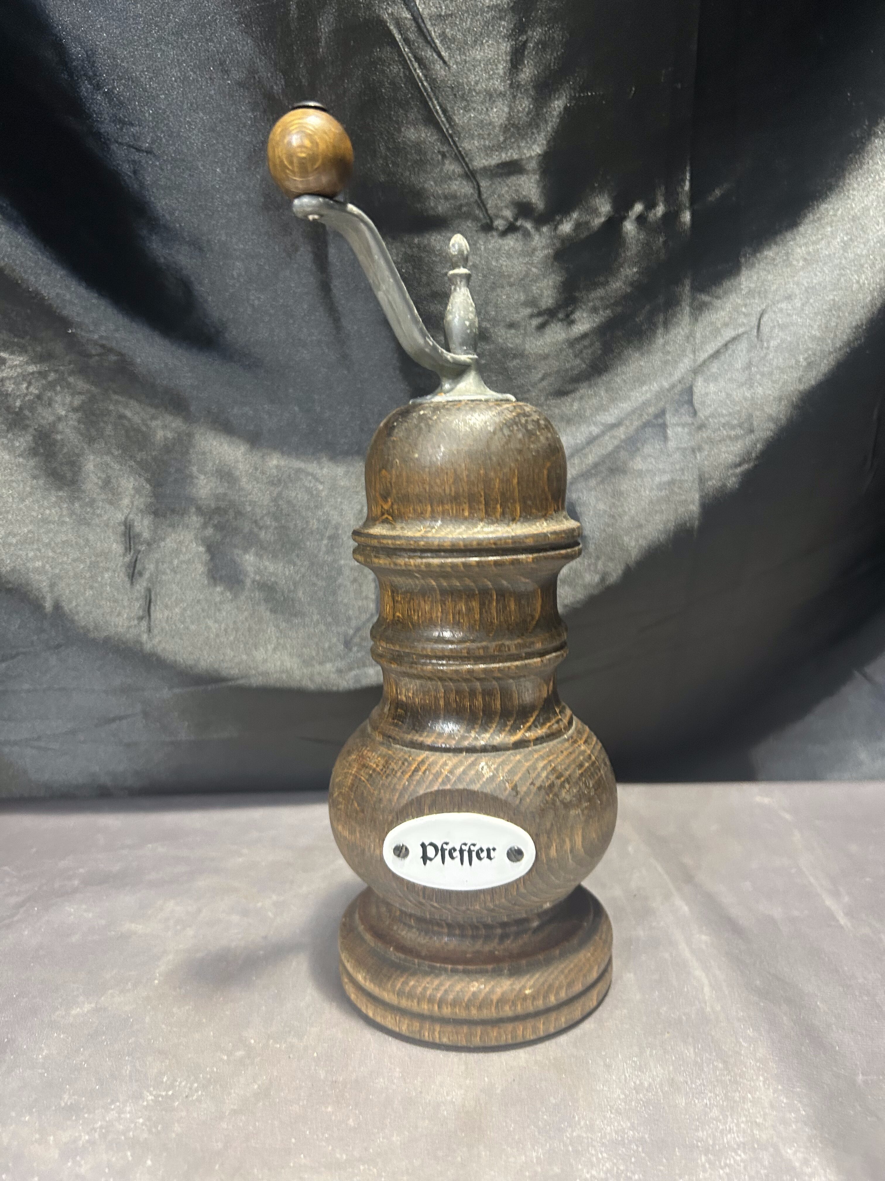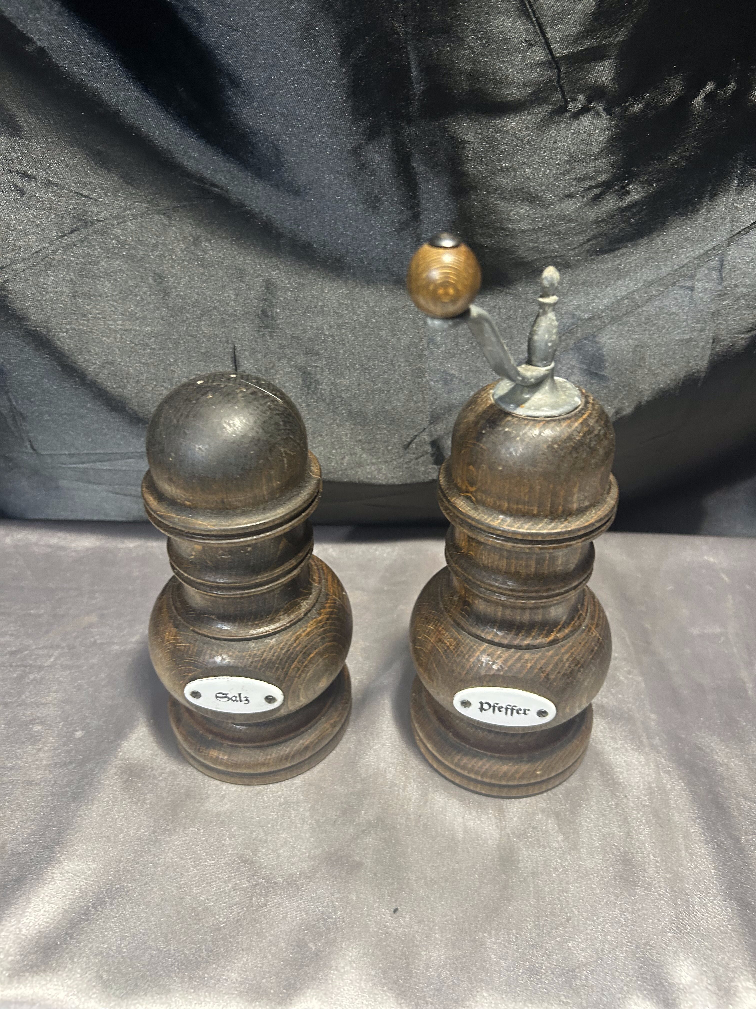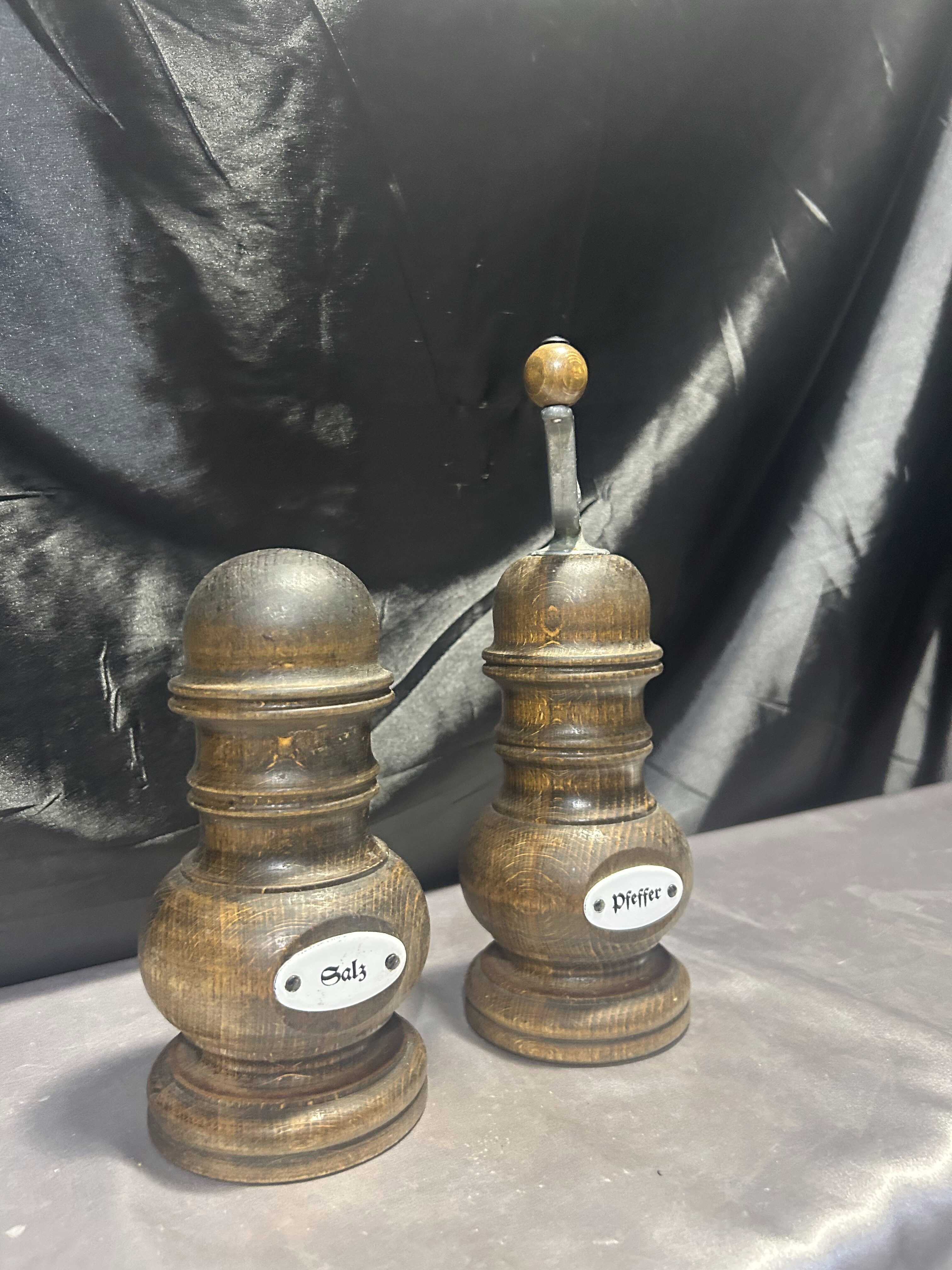 Na sprzedaż elegancki zestaw składający się z drewnianej solniczki oraz pieprzniczki w formie wygodnego młynka. Obie części ozdobione są białymi emaliowanymi tabliczkami z czarnym napisem: SALE (sól) i PFEFFER (pieprz). Zestaw wyróżnia się solidnym wykonaniem i klasycznym wyglądem – idealny do kuchni urządzonej w stylu retro, rustykalnym lub prowansalskim.
