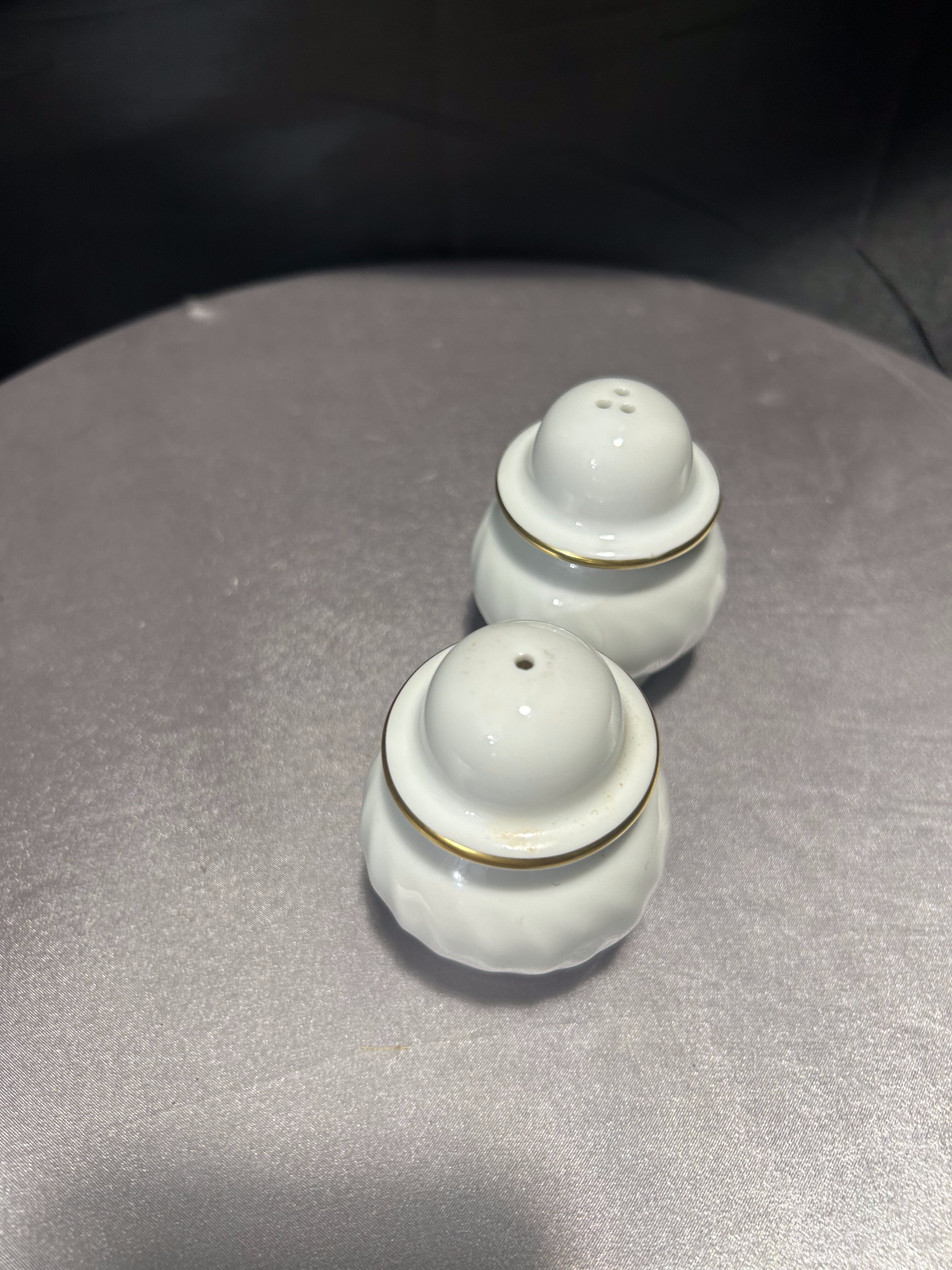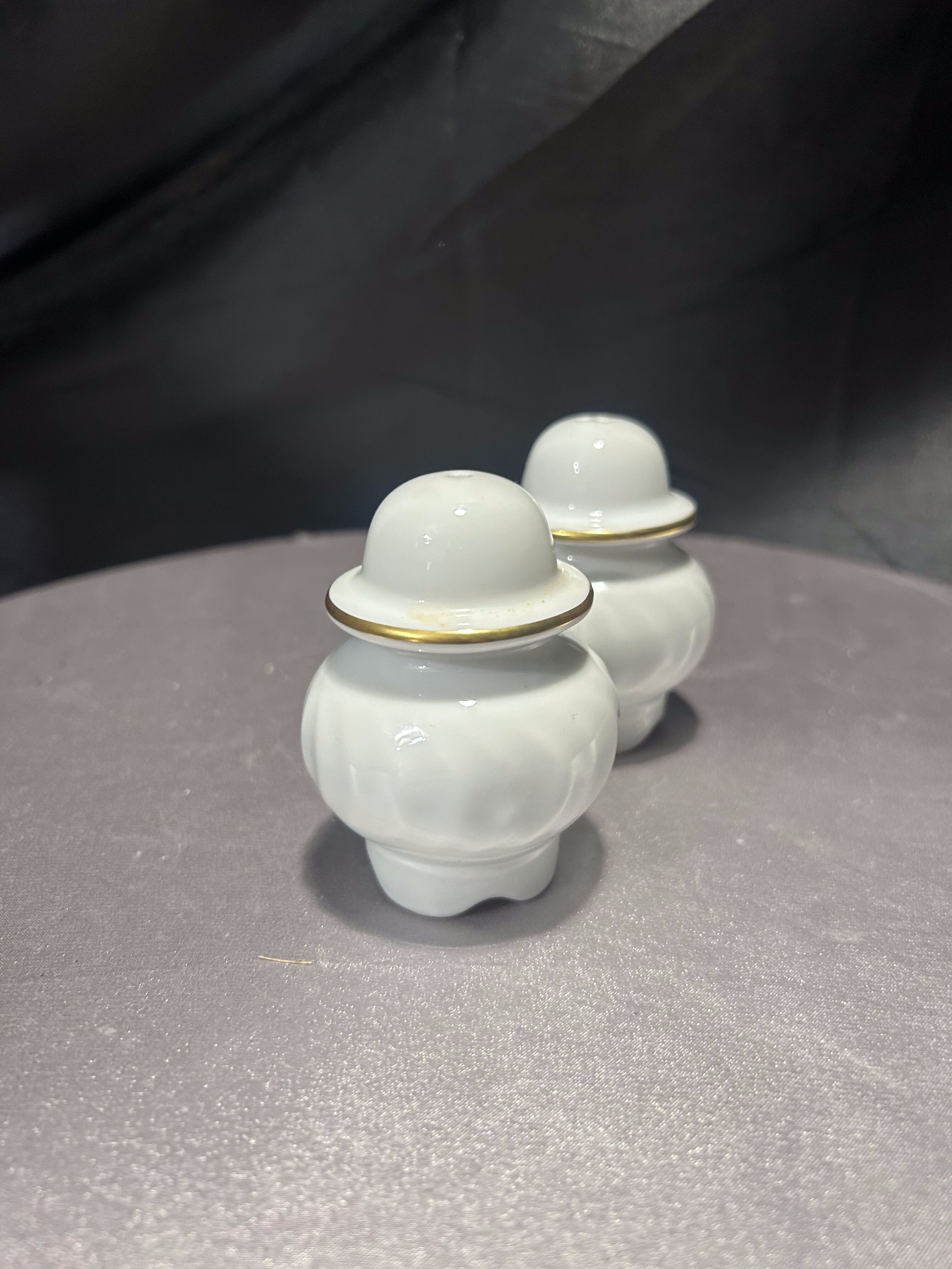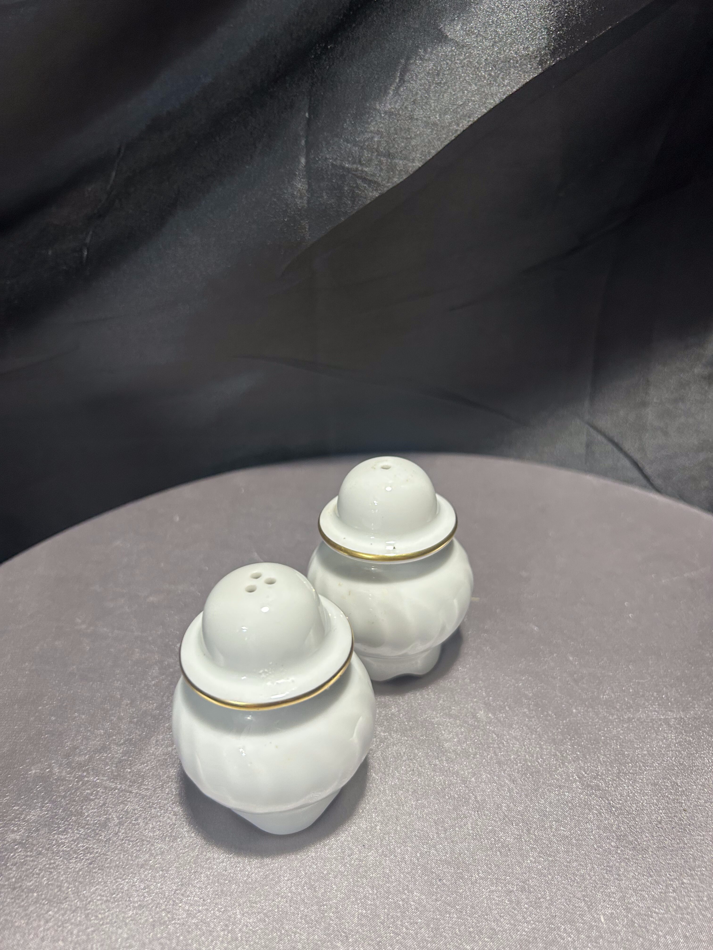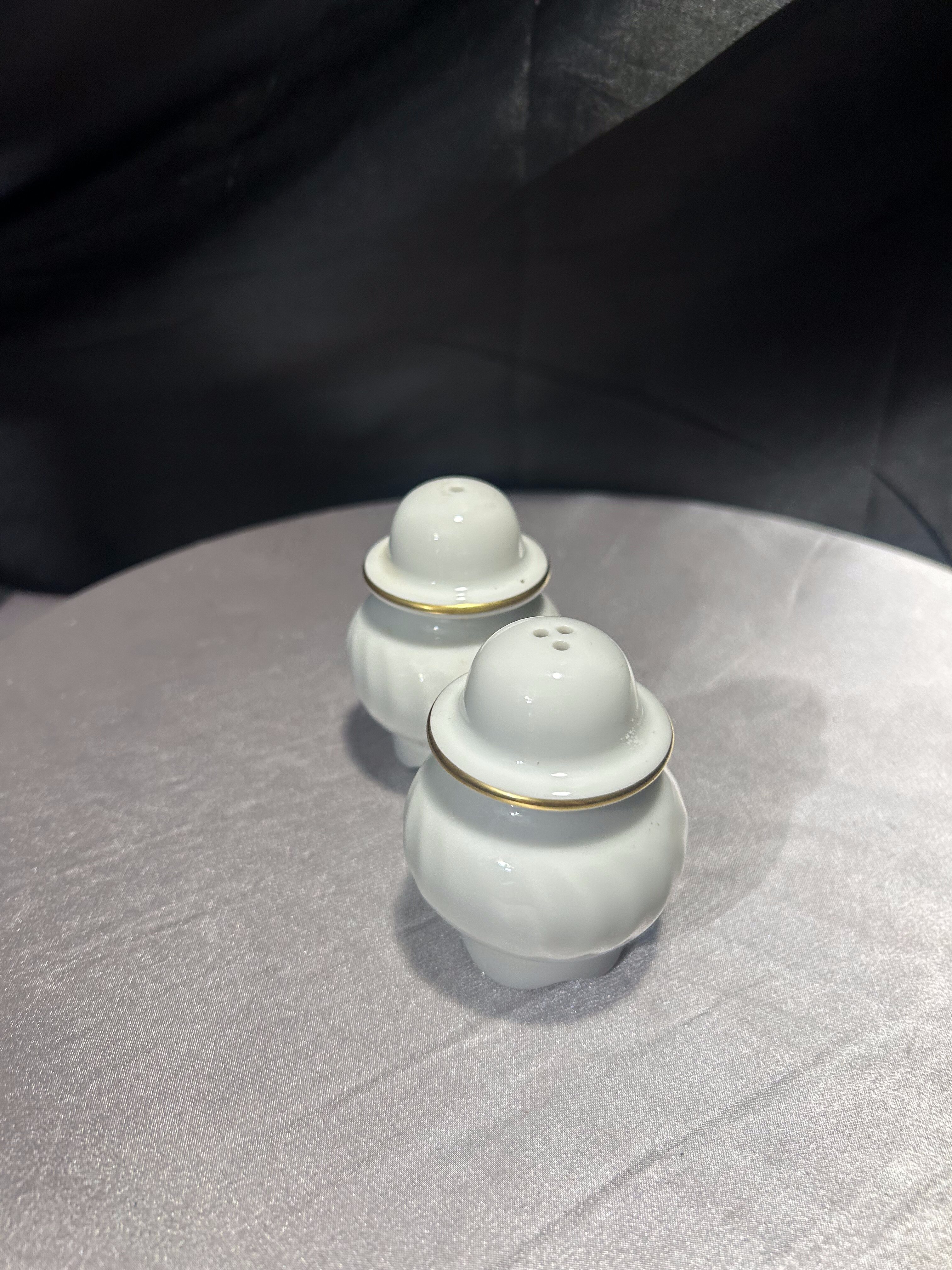 Wyjątkowy zestaw porcelanowych przyprawników – solniczka i pieprzniczka – pochodzący z renomowanej norweskiej manufaktury Porsgrunds Porselænsfabrik, której historia sięga 1885 roku. Elementy wykonane z najwyższej jakości białej porcelany, zdobione subtelnym złotym rantem. Klasyczna, ale stylowa forma z lekkim karbowaniem nawiązuje do elegancji lat 60. i 70. XX wieku.