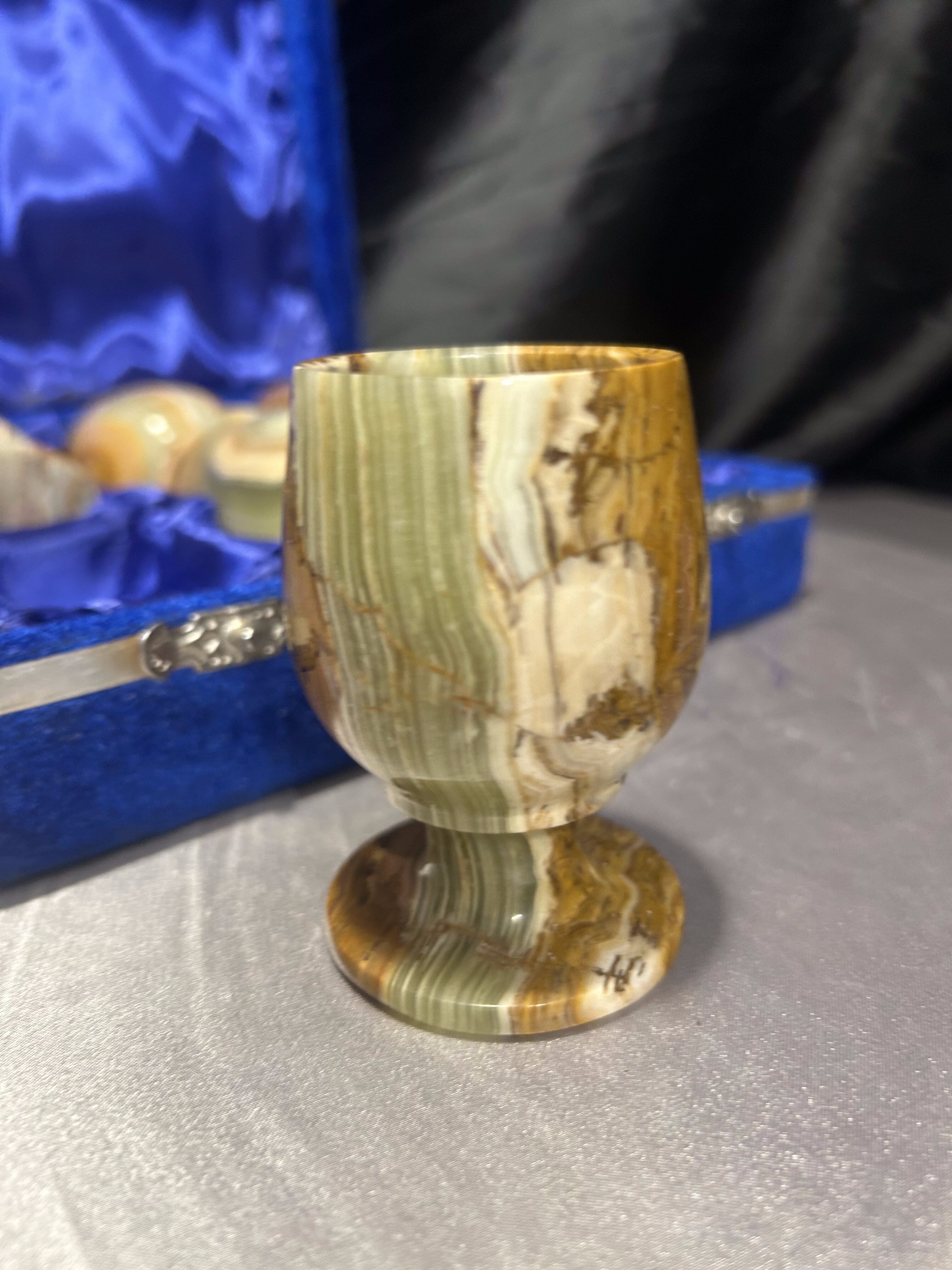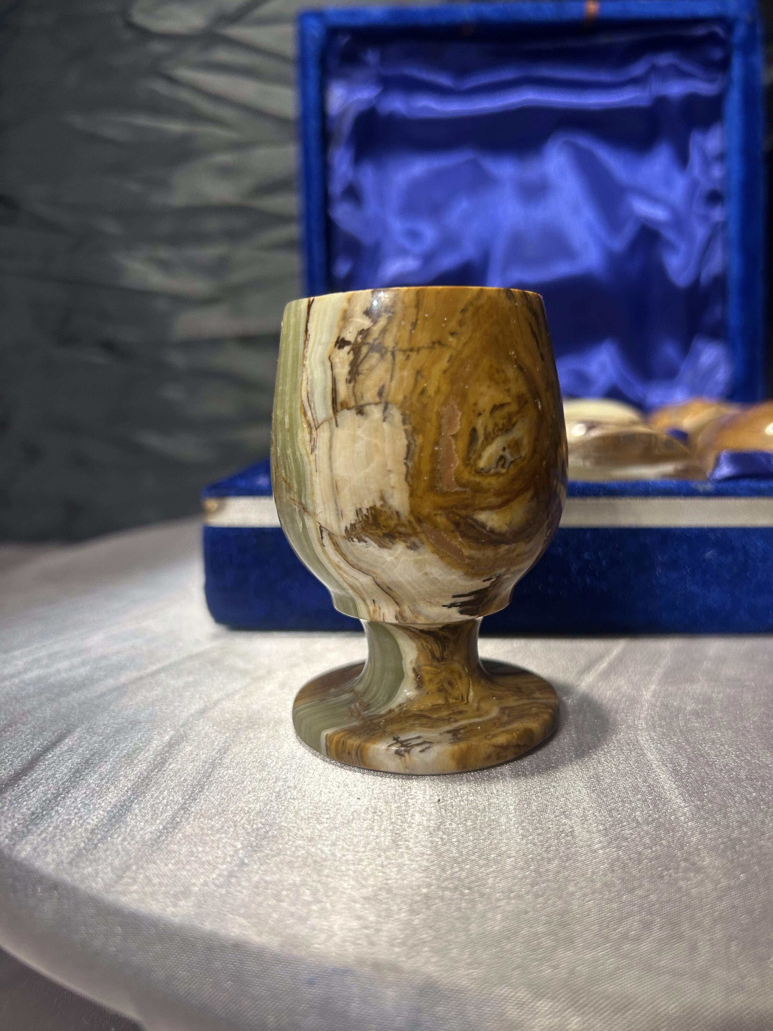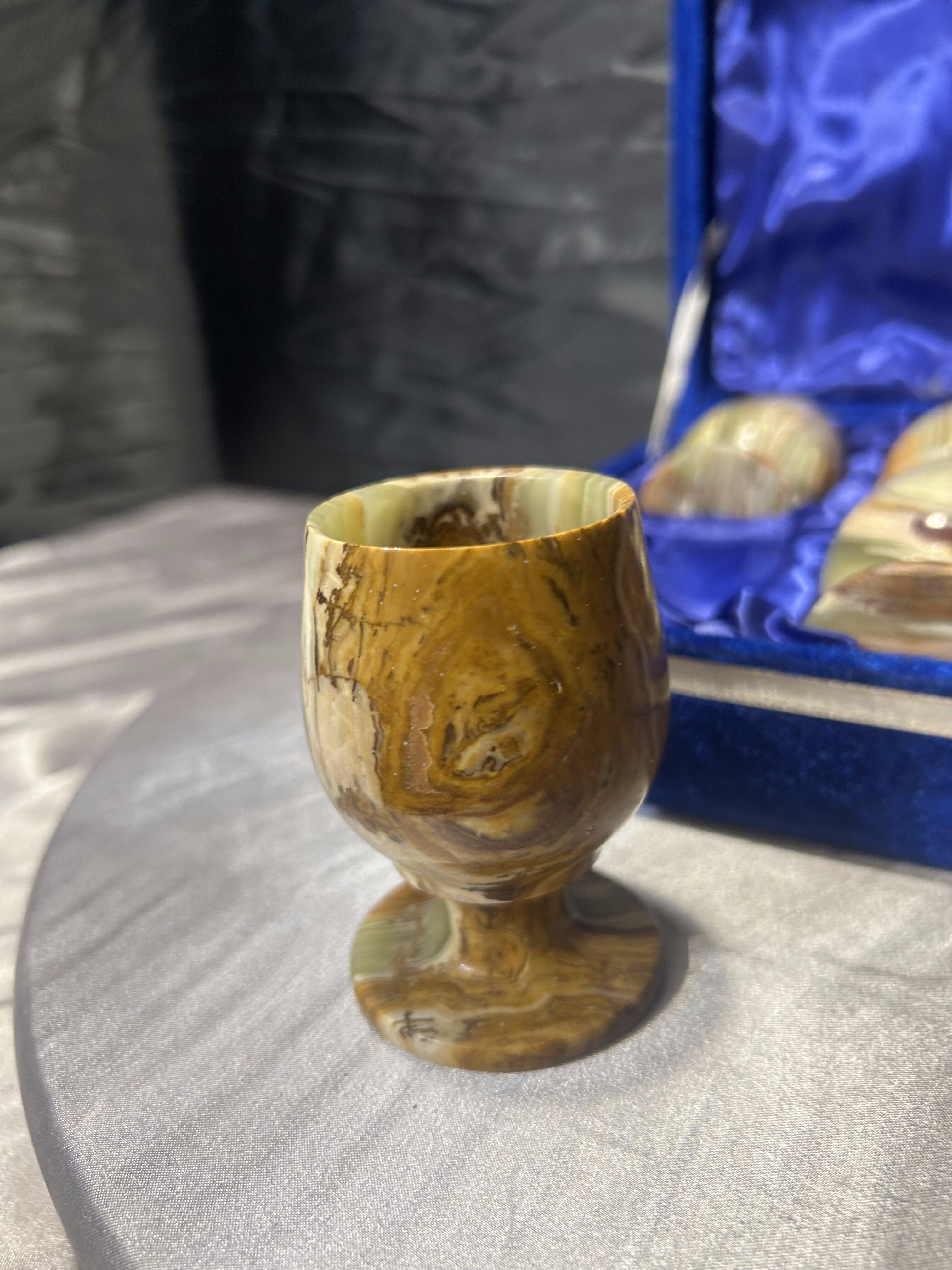 Elegancki zestaw sześciu kieliszków wykonanych z naturalnego onyksu, starannie toczonych i dopracowanych w detalu. Każdy egzemplarz wyróżnia się indywidualnym rysunkiem kamienia i subtelną grą barw, charakterystyczną dla onyksu. Kieliszki umieszczone są w efektownym etui w niebieskim kolorze, wyłożonym miękką tkaniną, które podkreśla ich szlachetny i kolekcjonerski charakter.