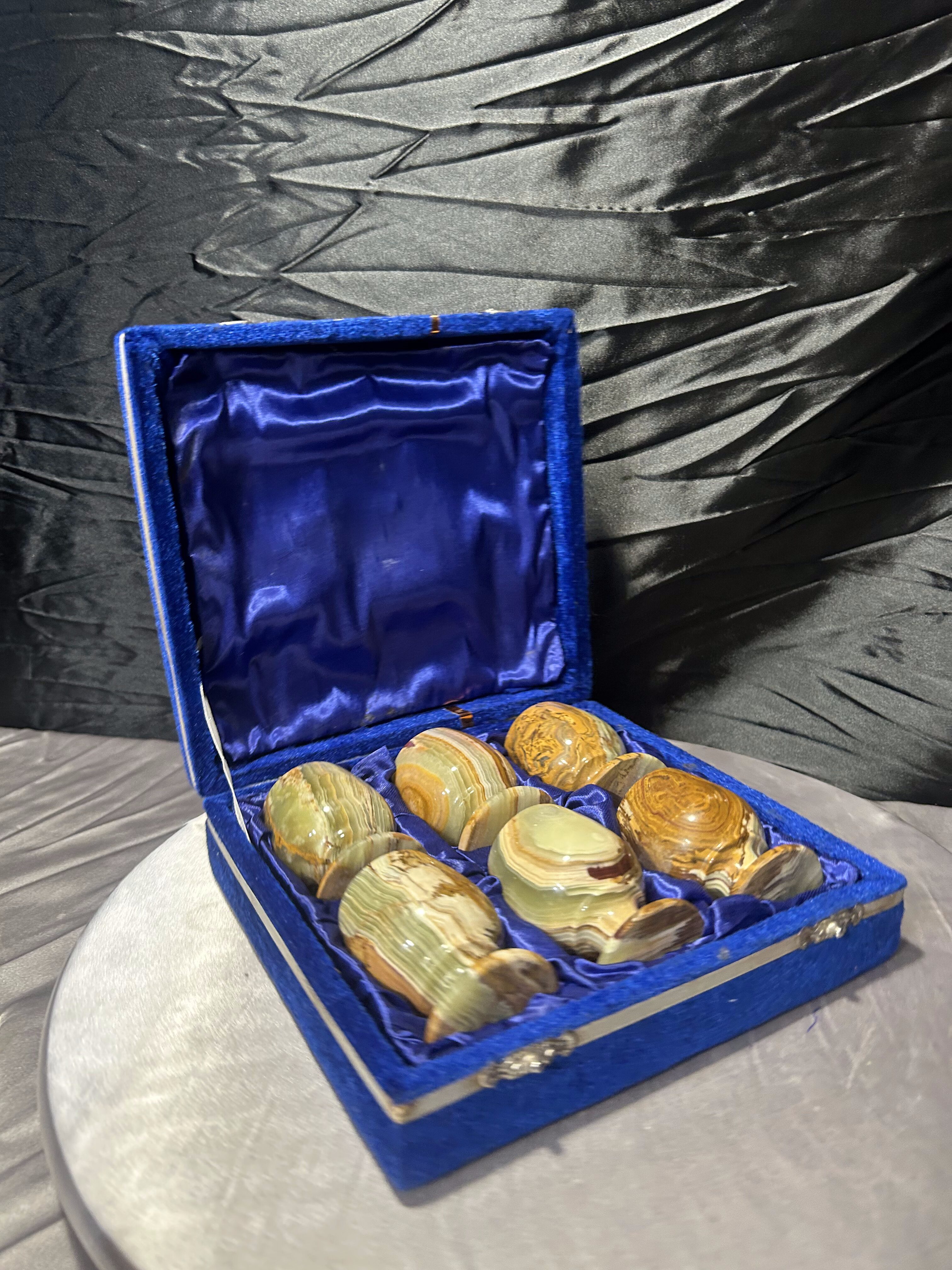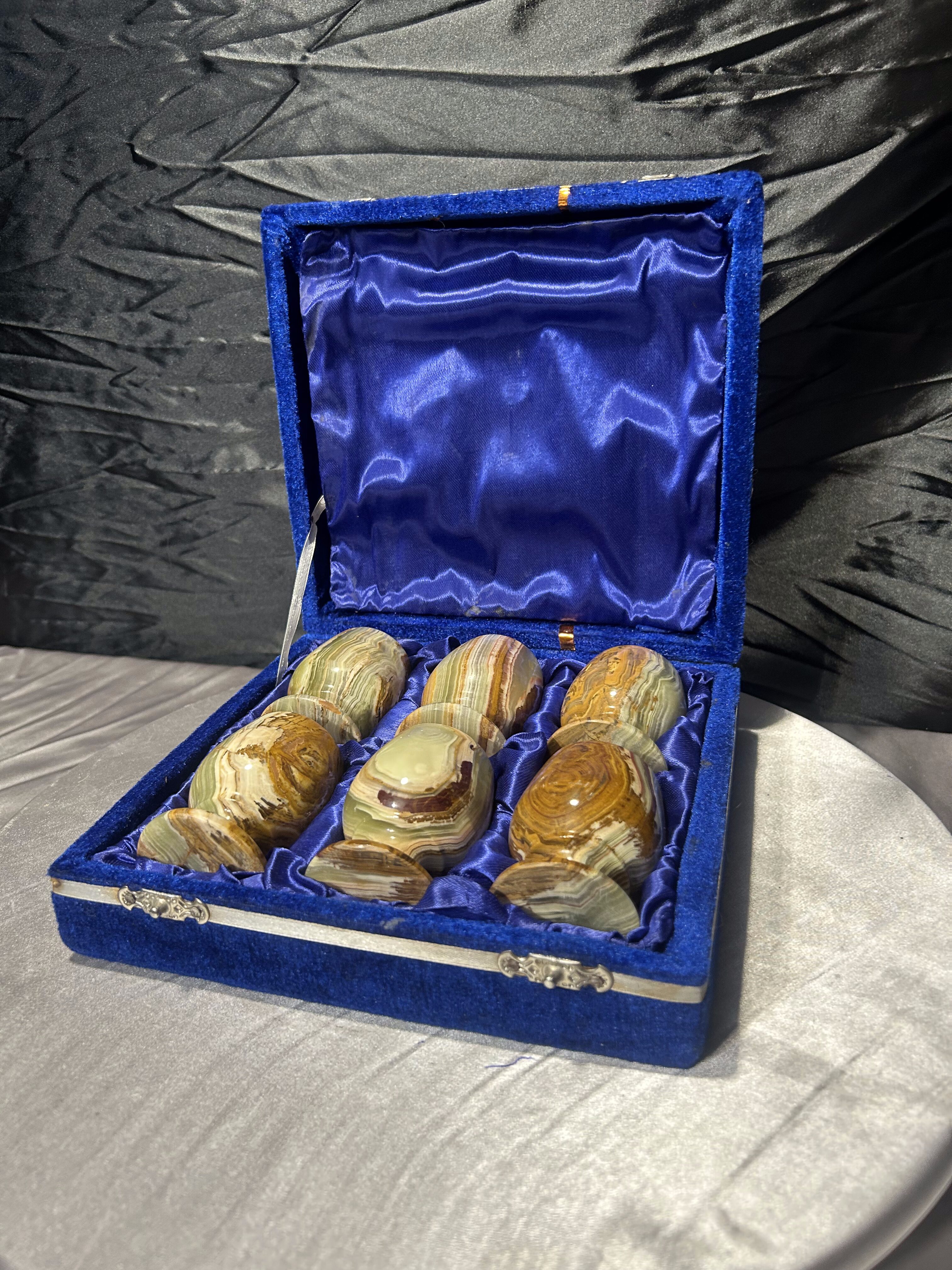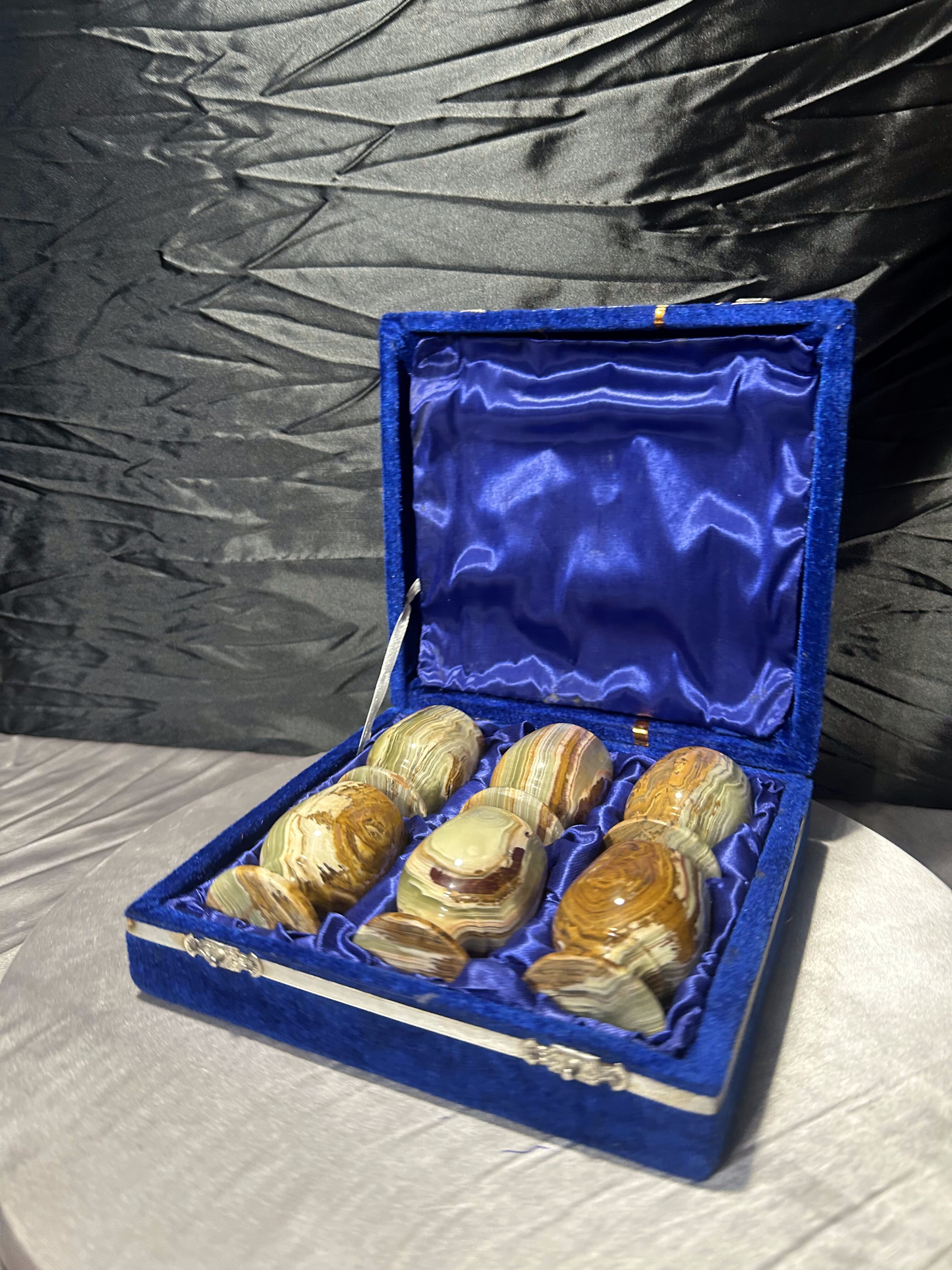 Elegancki zestaw sześciu kieliszków wykonanych z naturalnego onyksu, starannie toczonych i dopracowanych w detalu. Każdy egzemplarz wyróżnia się indywidualnym rysunkiem kamienia i subtelną grą barw, charakterystyczną dla onyksu. Kieliszki umieszczone są w efektownym etui w niebieskim kolorze, wyłożonym miękką tkaniną, które podkreśla ich szlachetny i kolekcjonerski charakter.