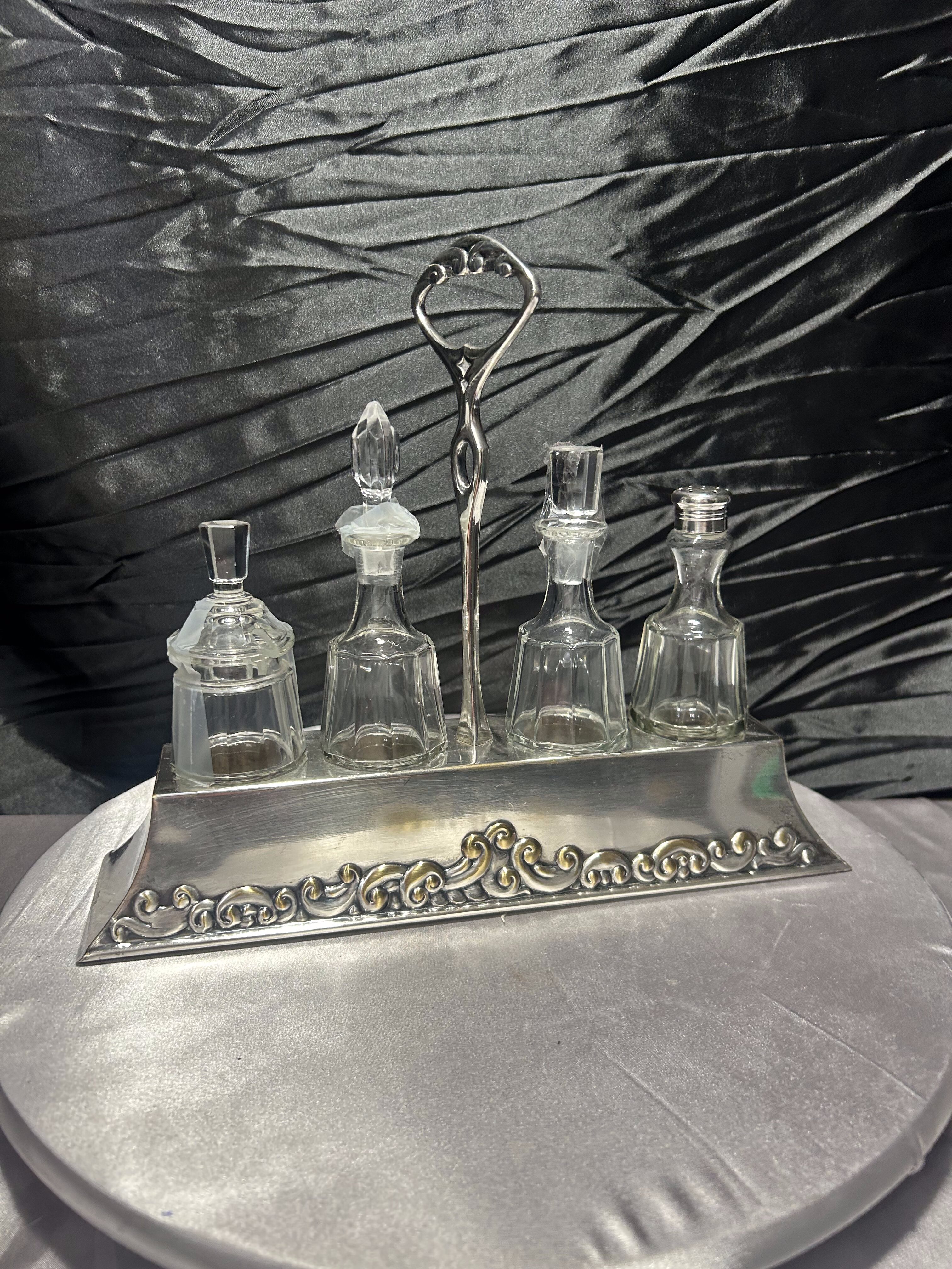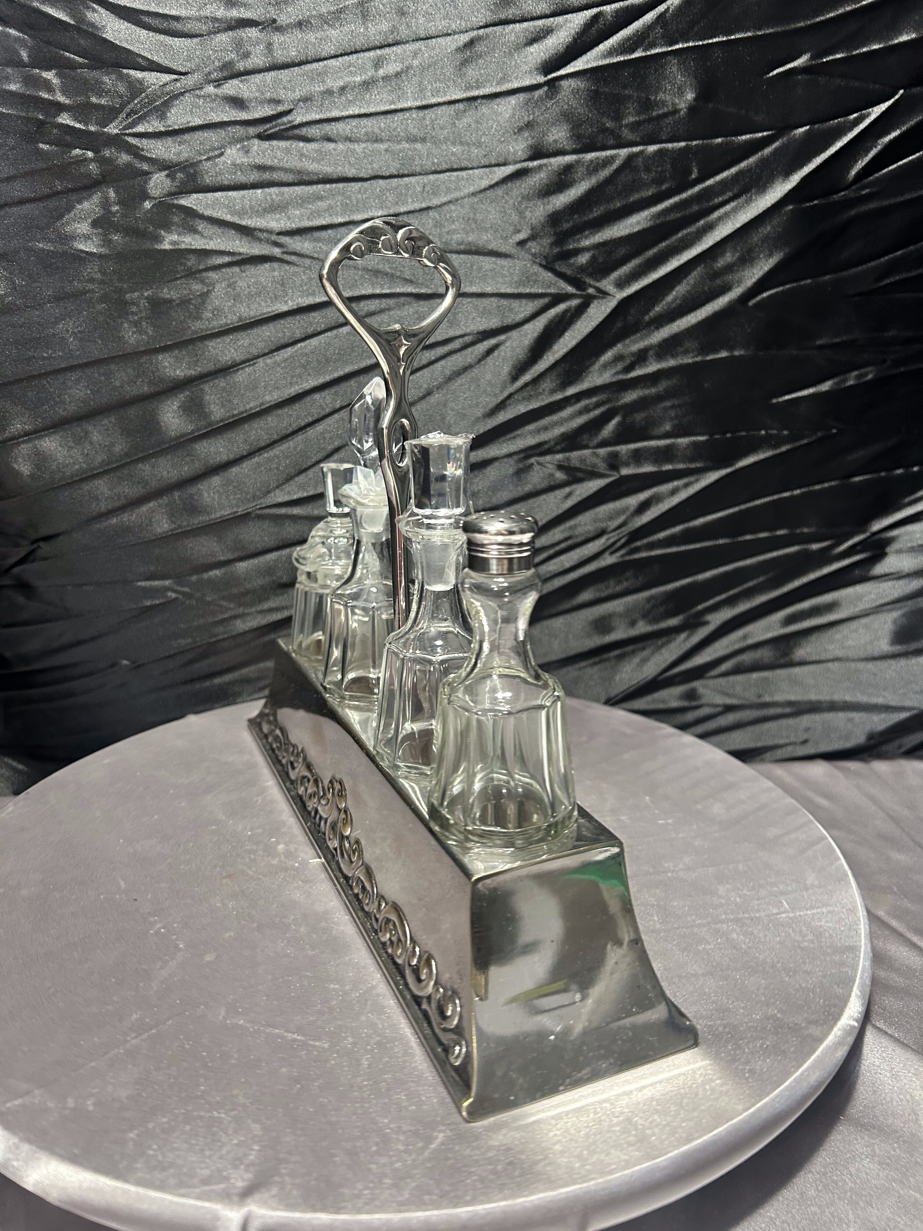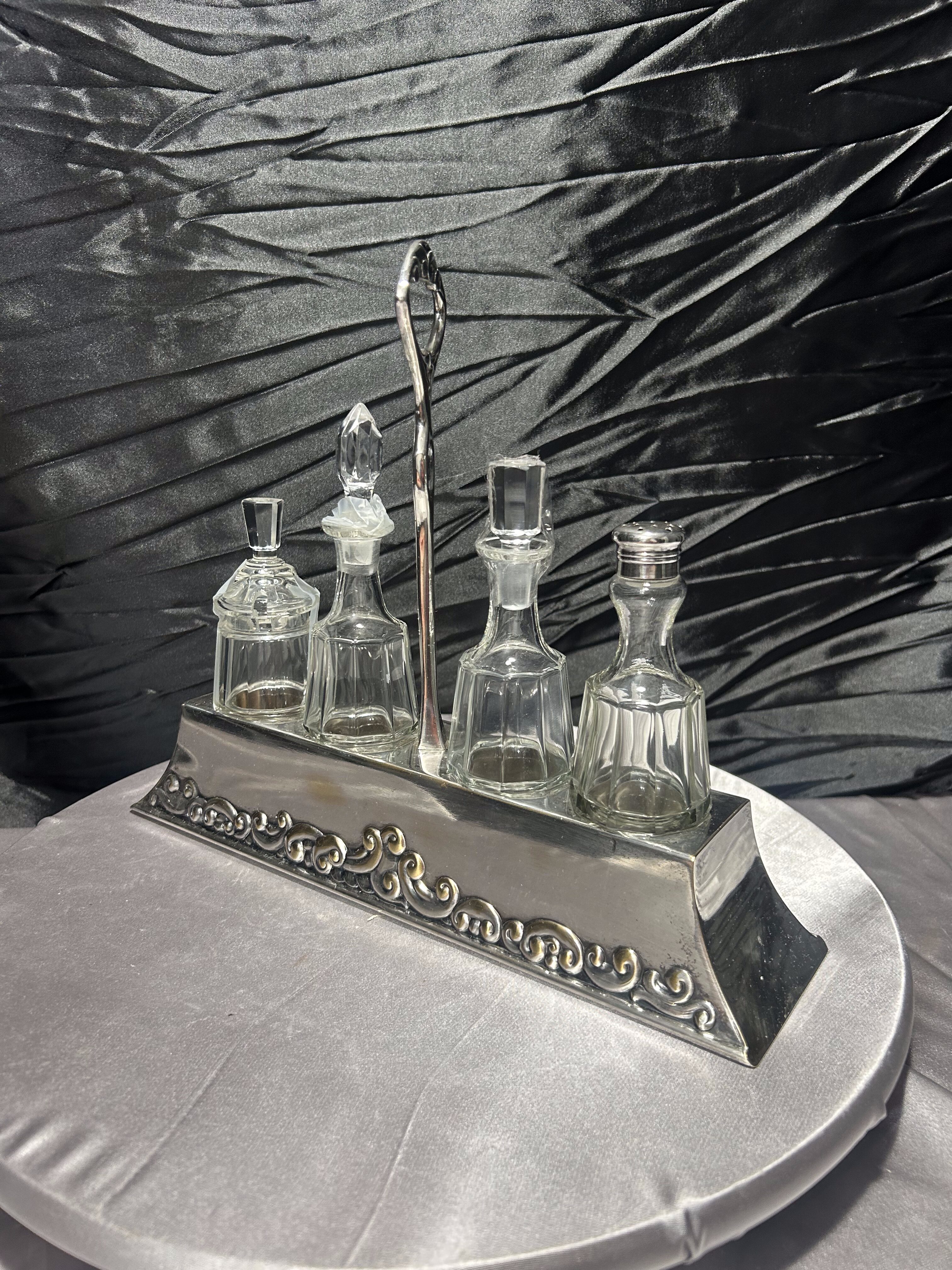 - Zestaw szklanych przyprawników na zdobionej tacy, styl klasyczny