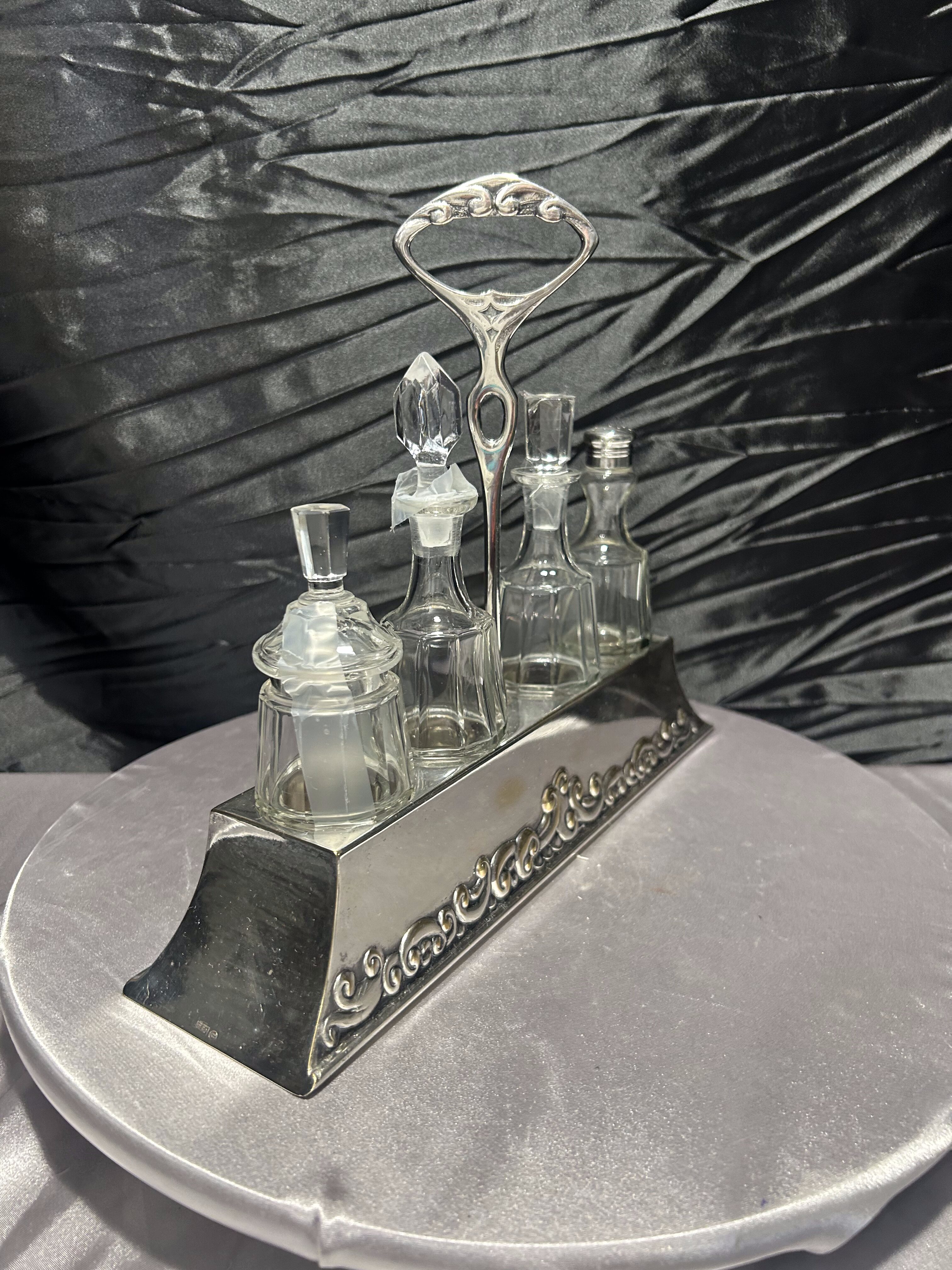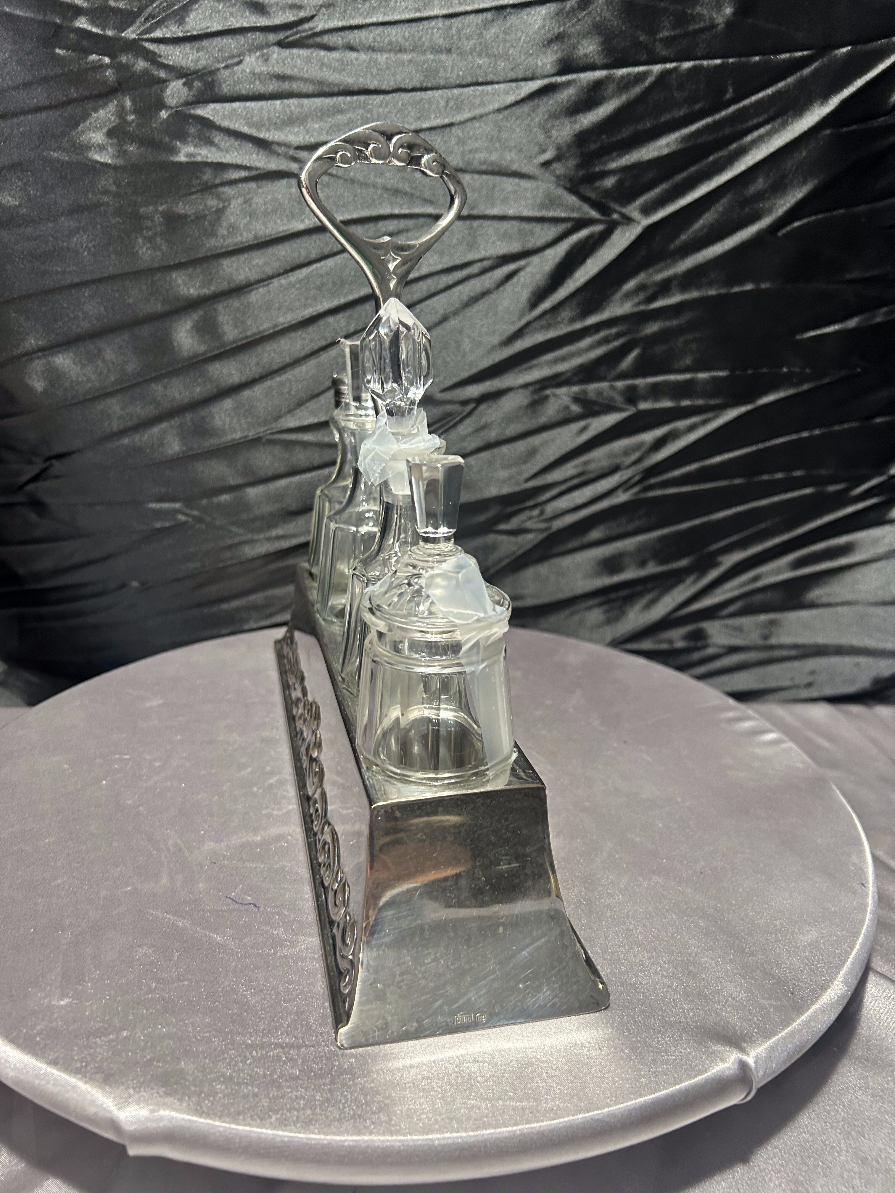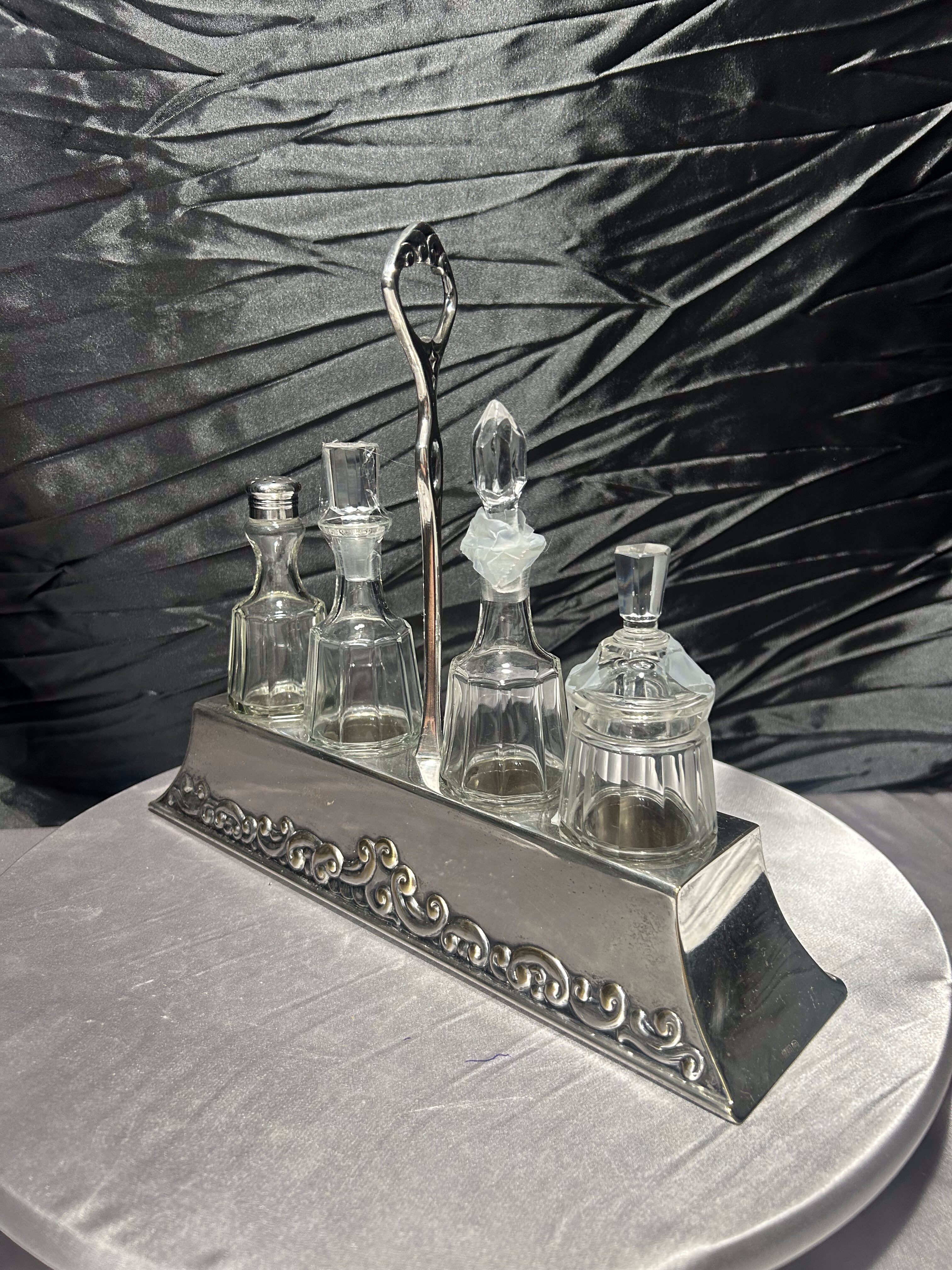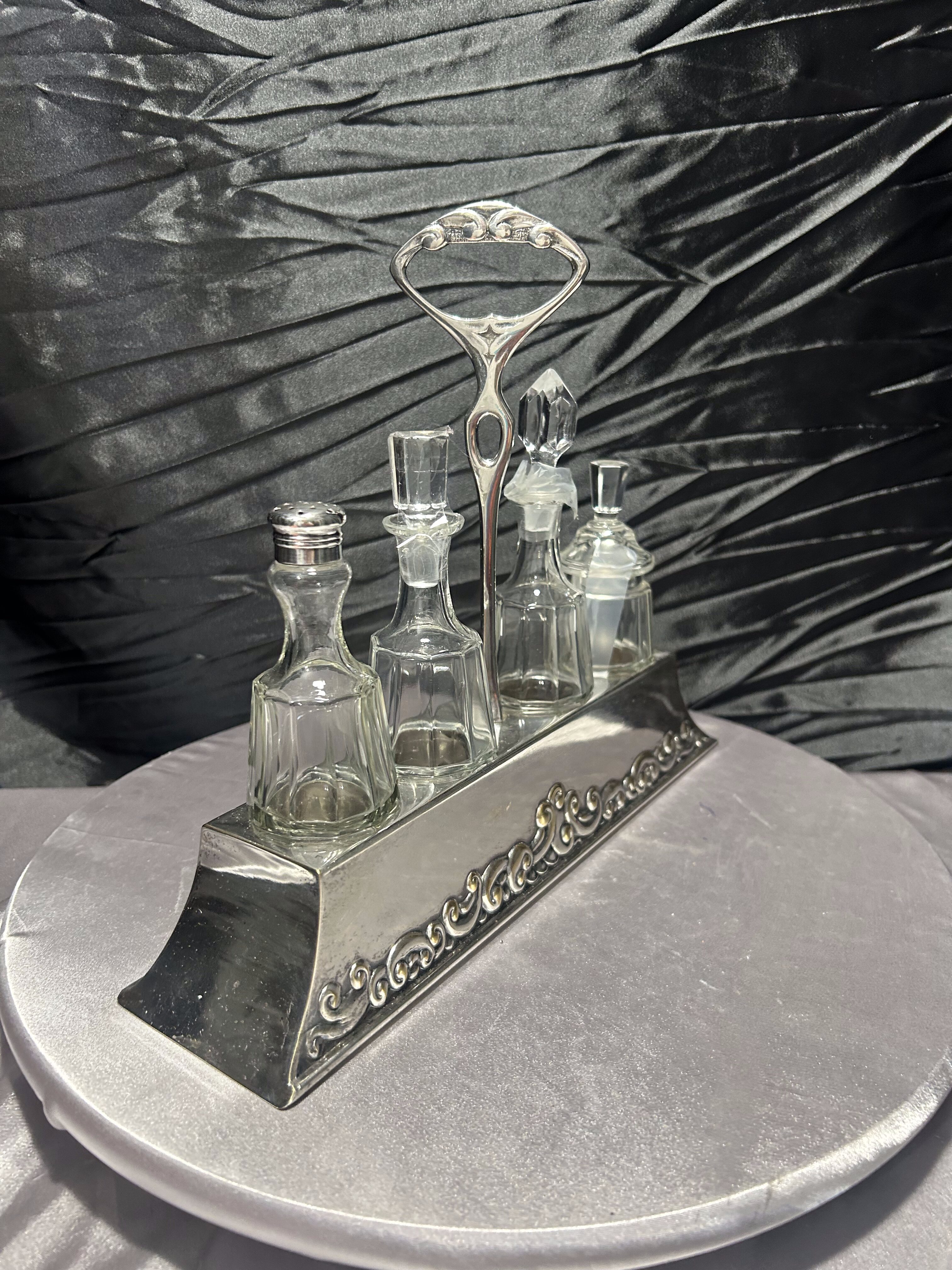 - Zestaw szklanych przyprawników na zdobionej tacy, styl klasyczny