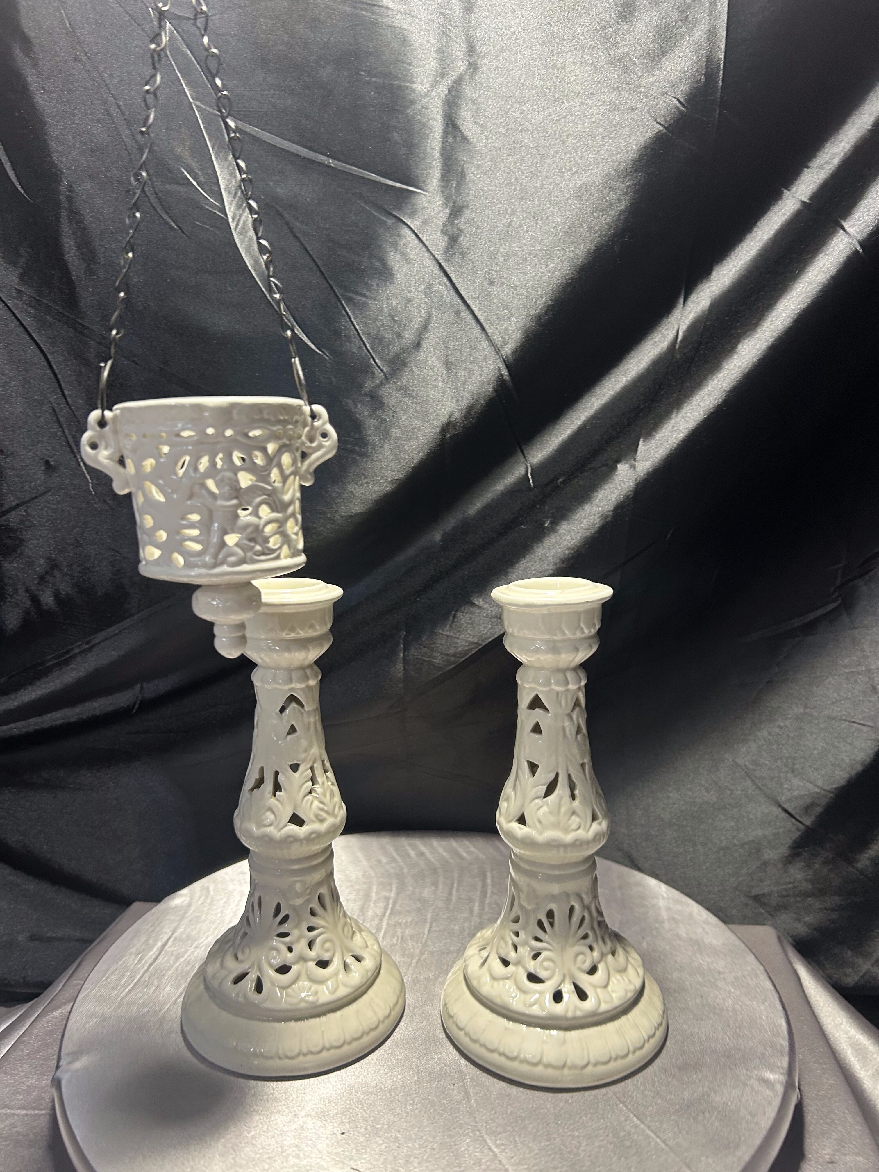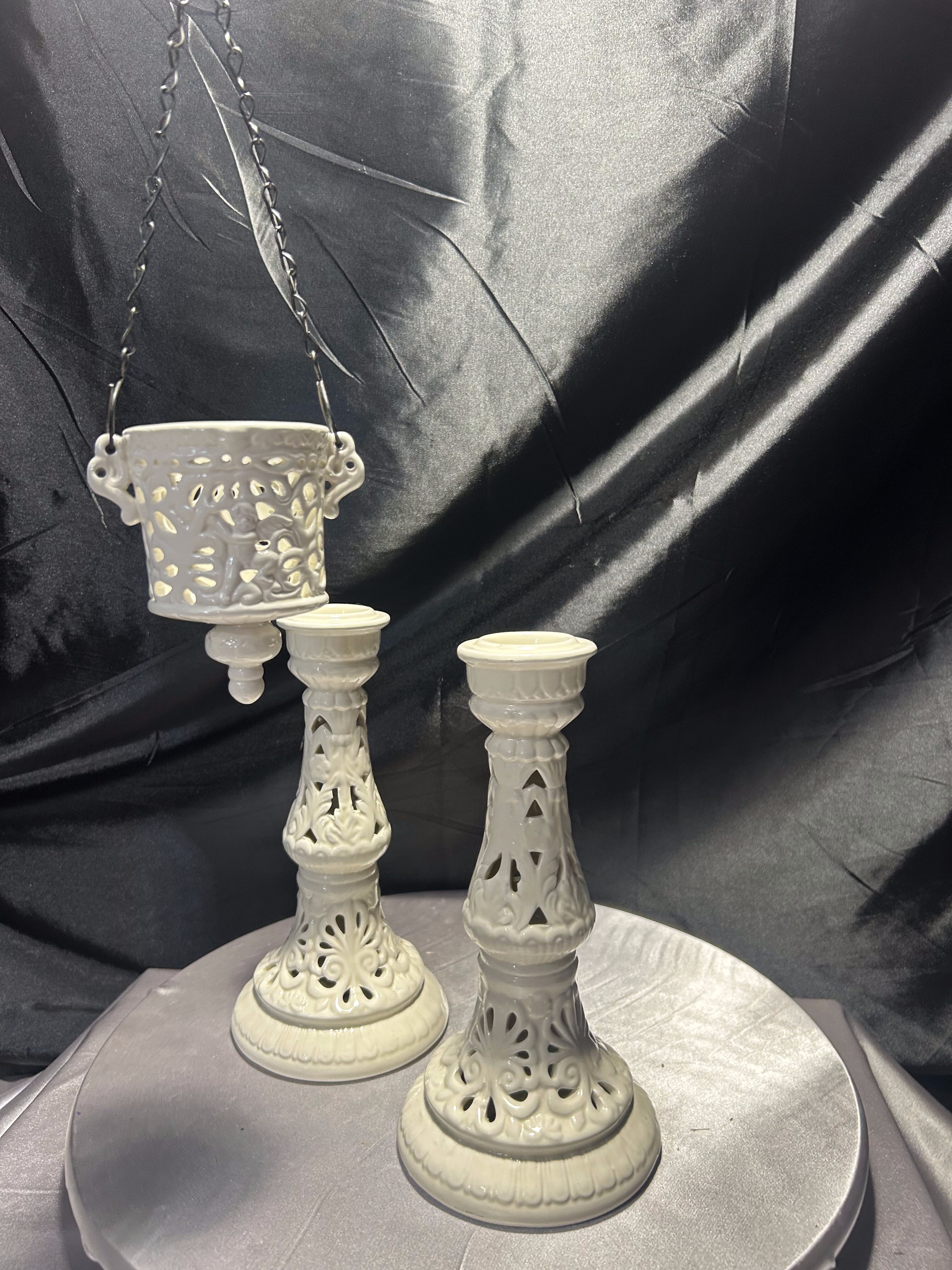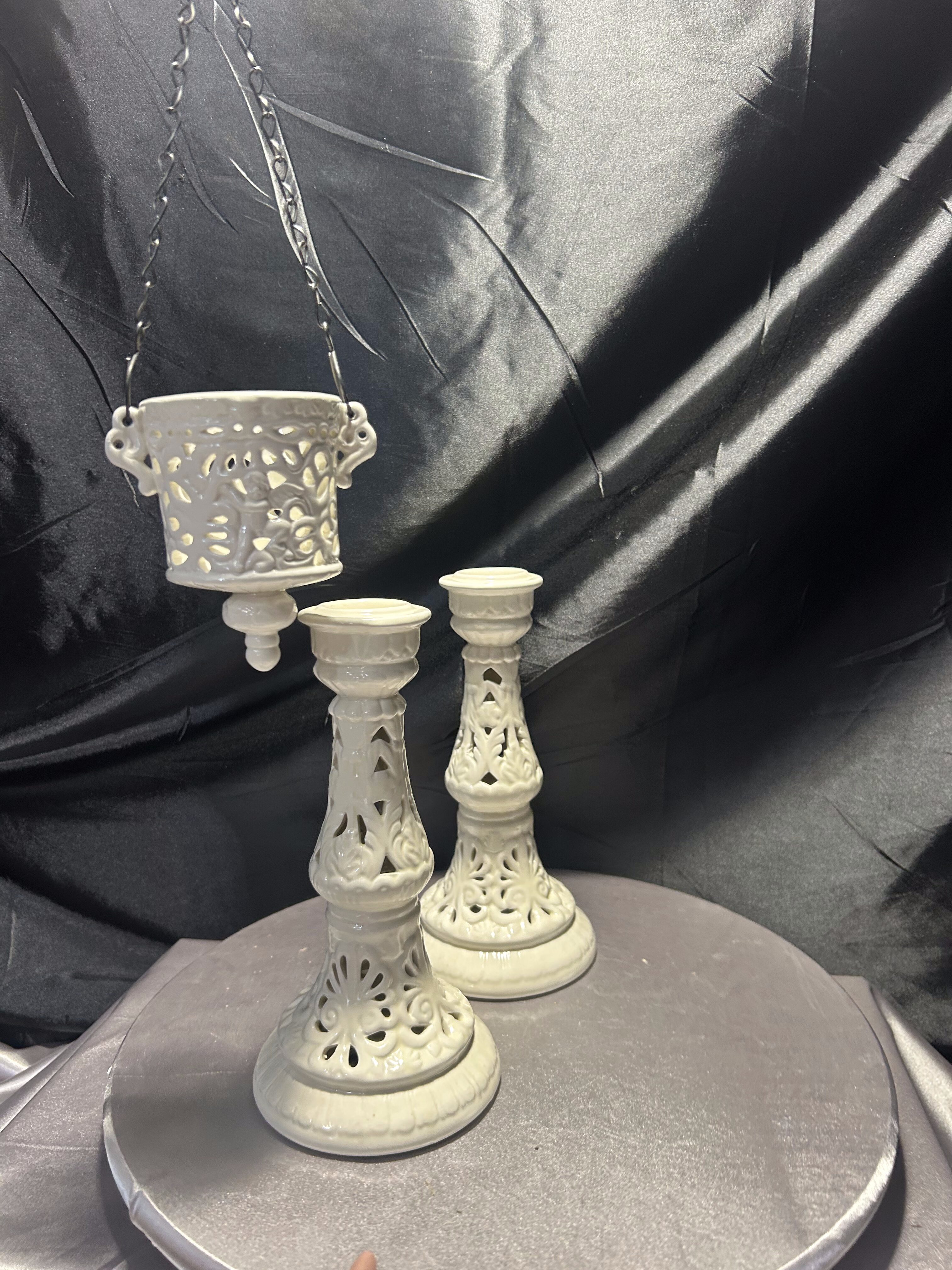 - Zestaw trzech ceramicznych świeczników ażurowych – lichtarze i świecznik wiszący w stylu romantycznym