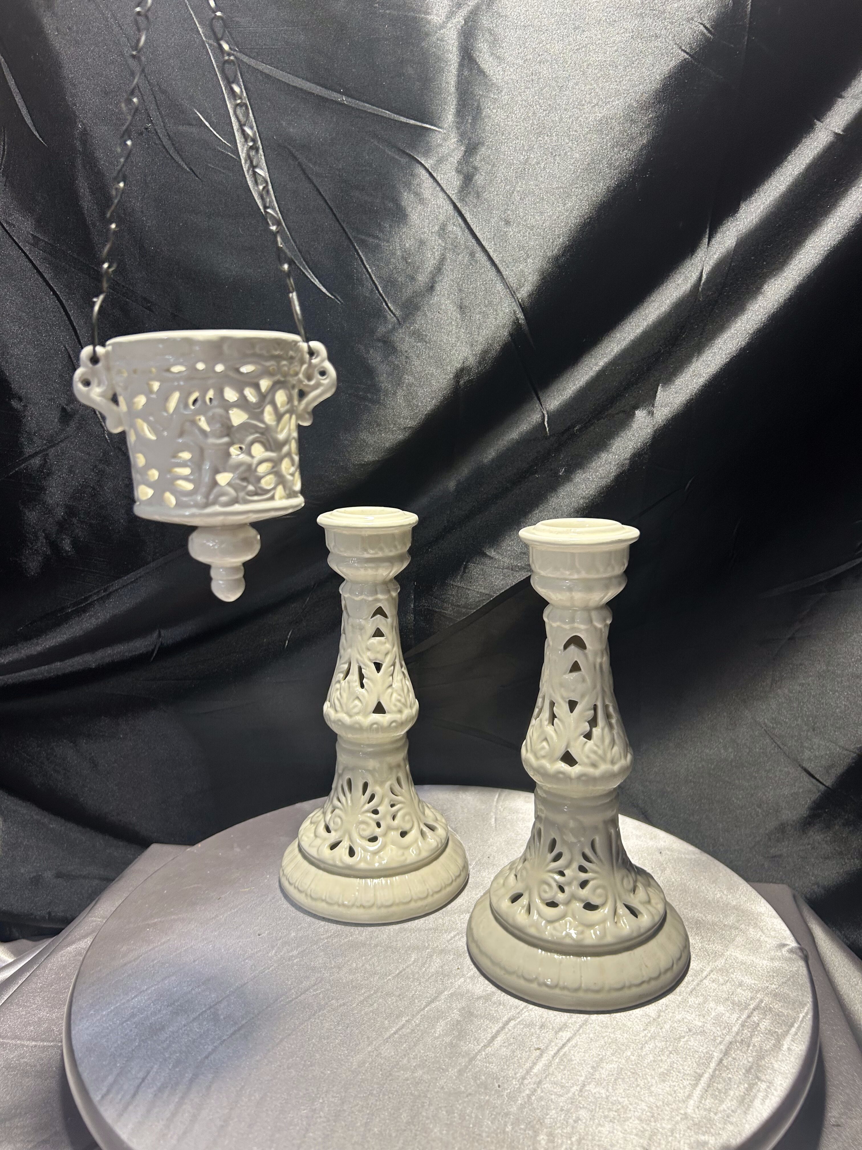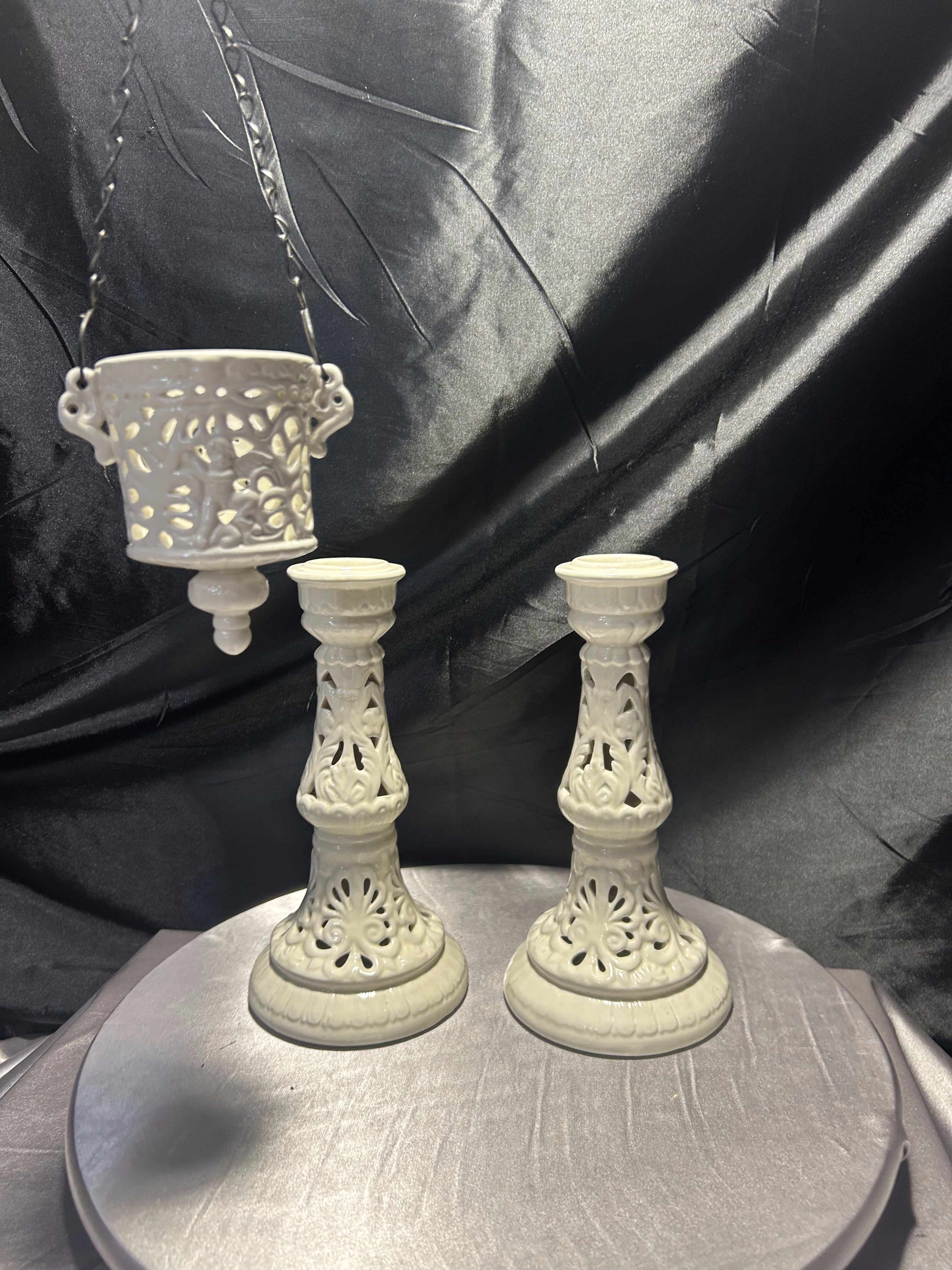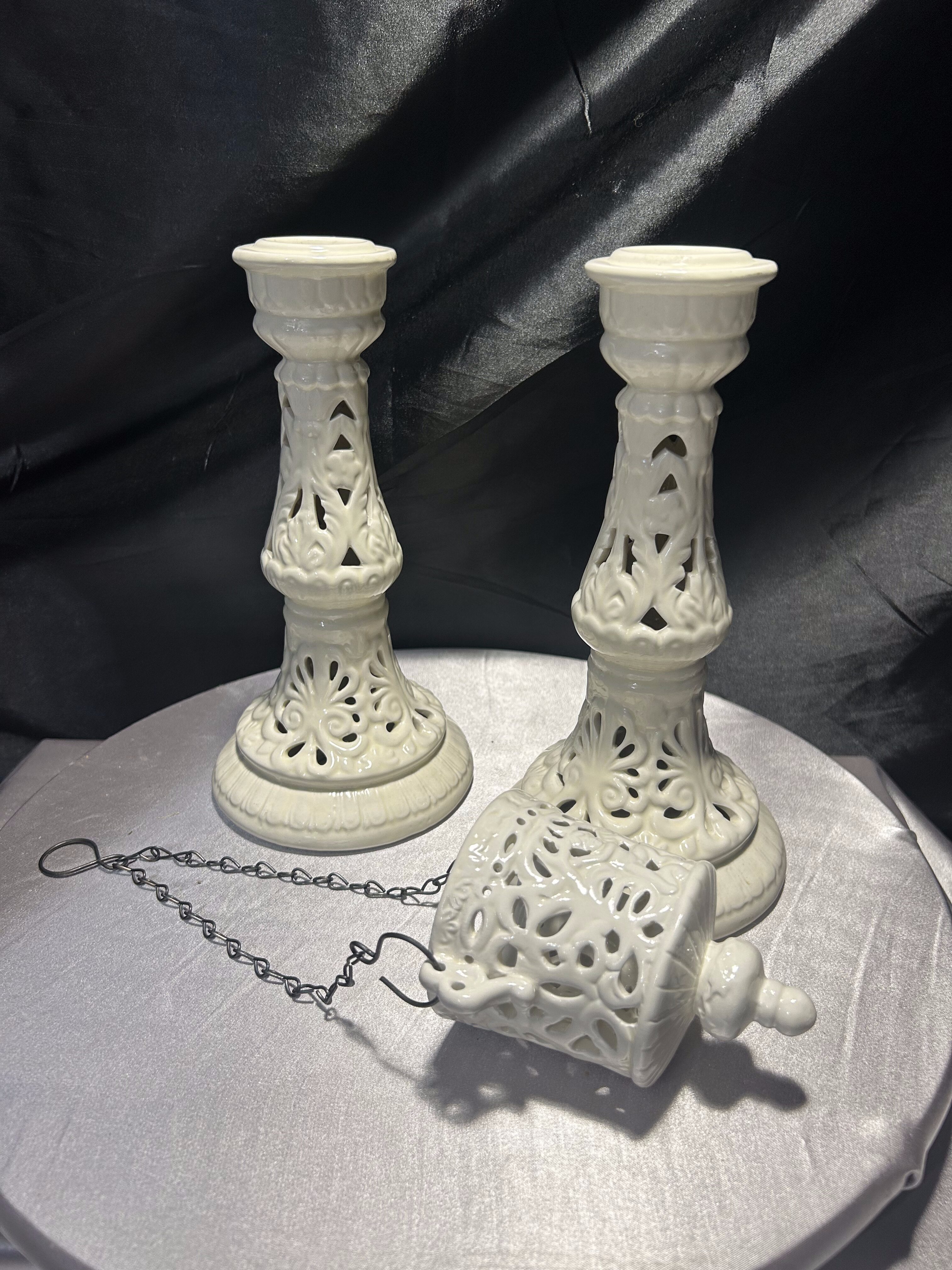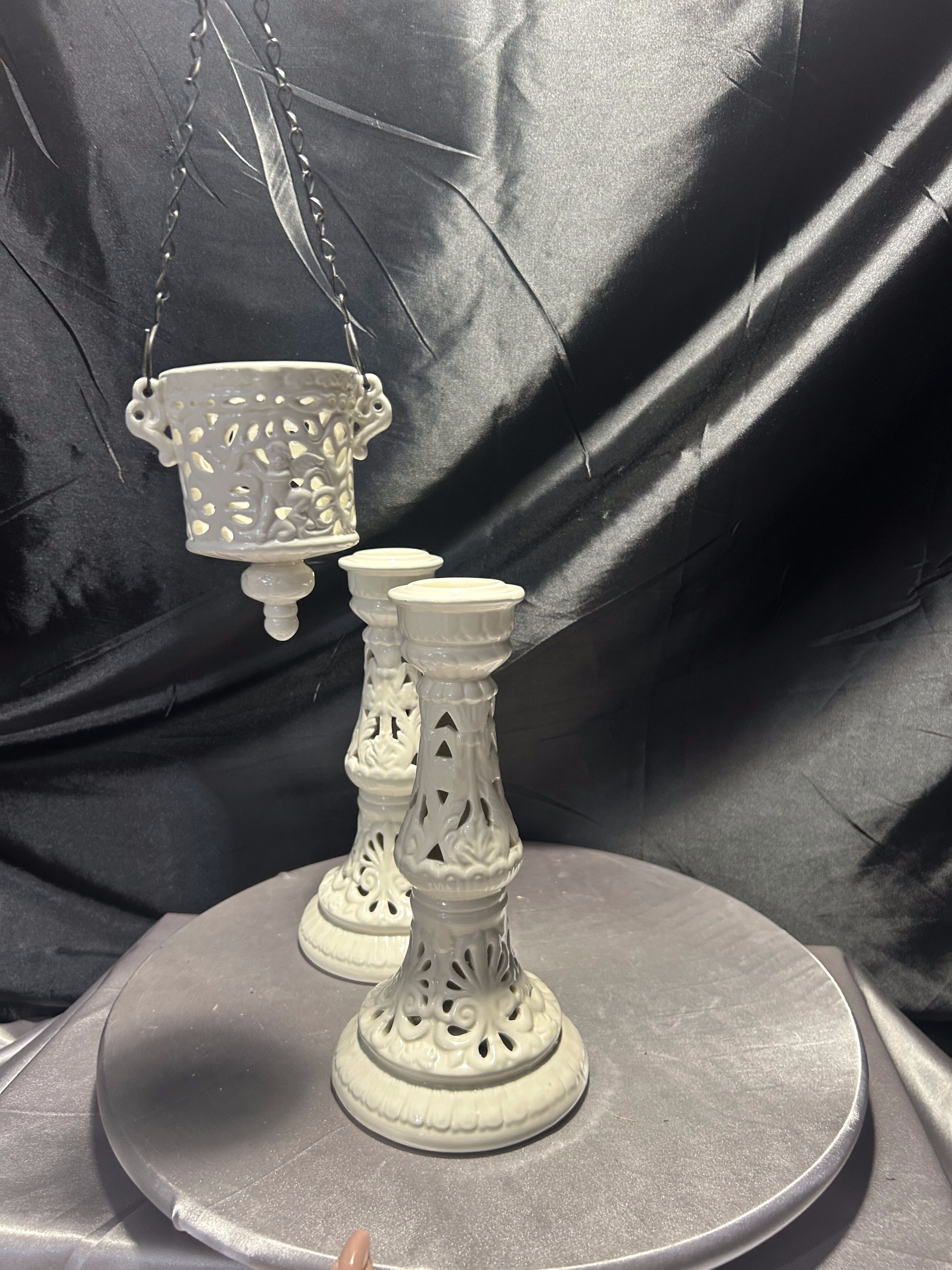 - Zestaw trzech ceramicznych świeczników ażurowych – lichtarze i świecznik wiszący w stylu romantycznym