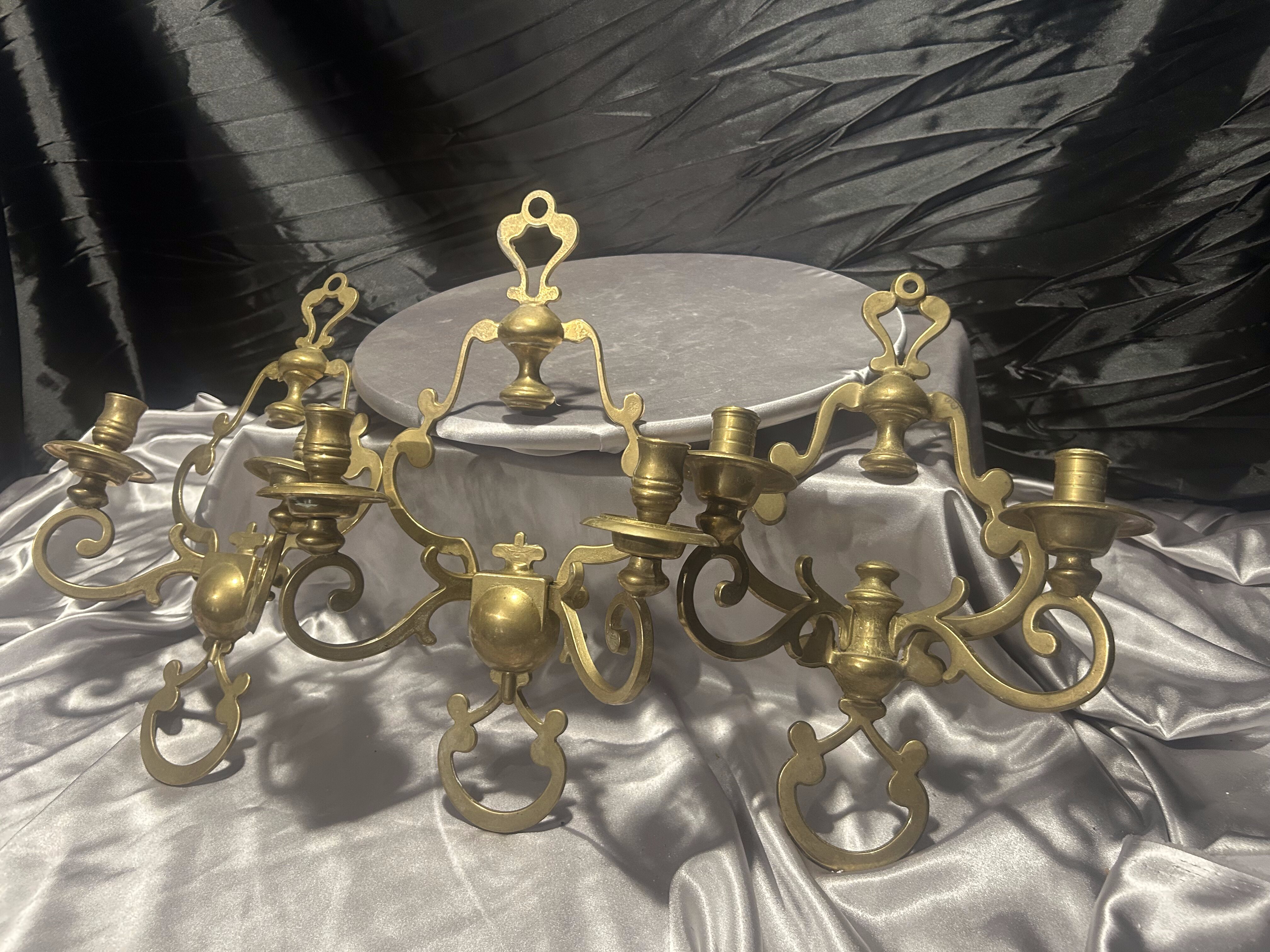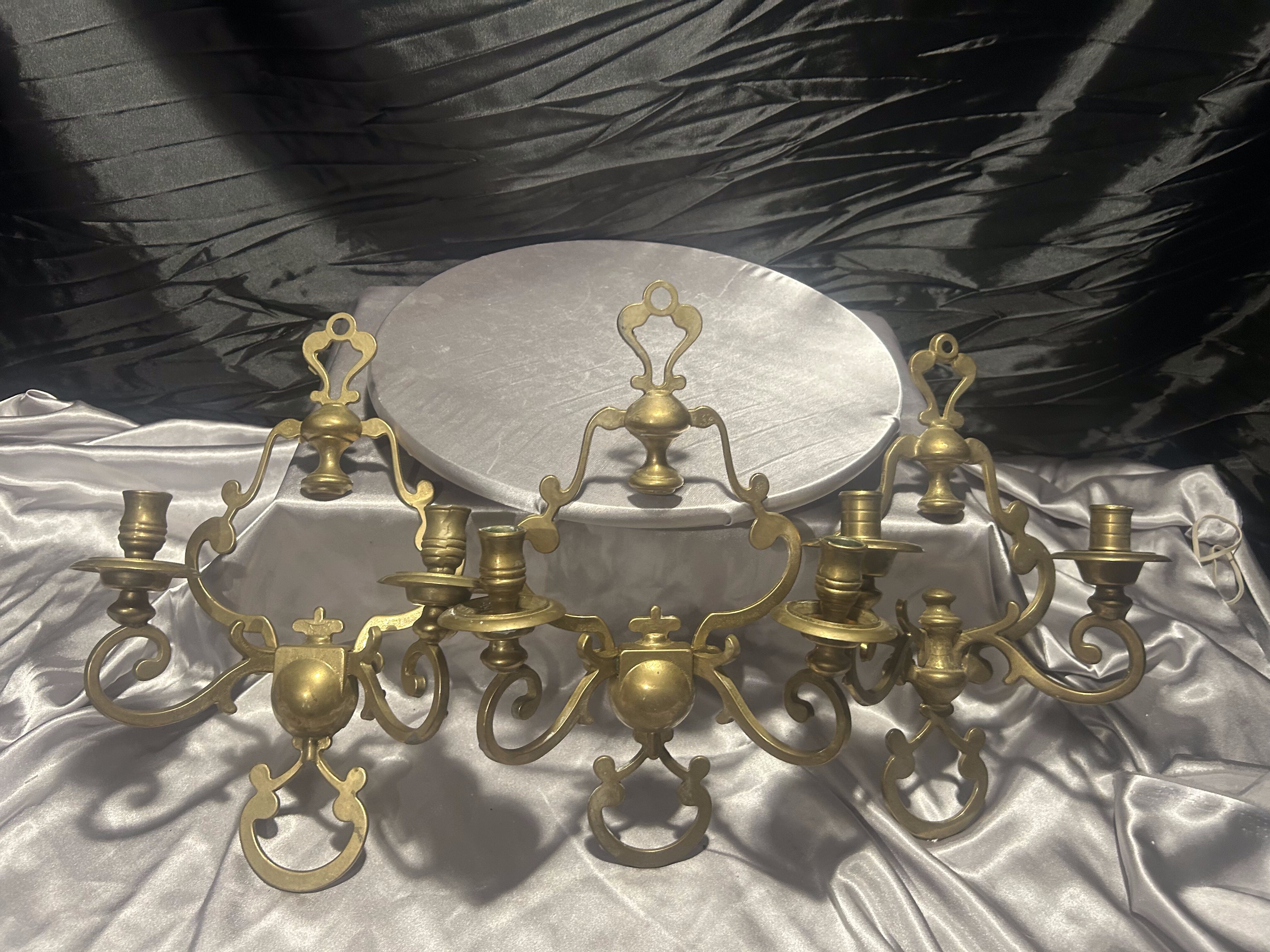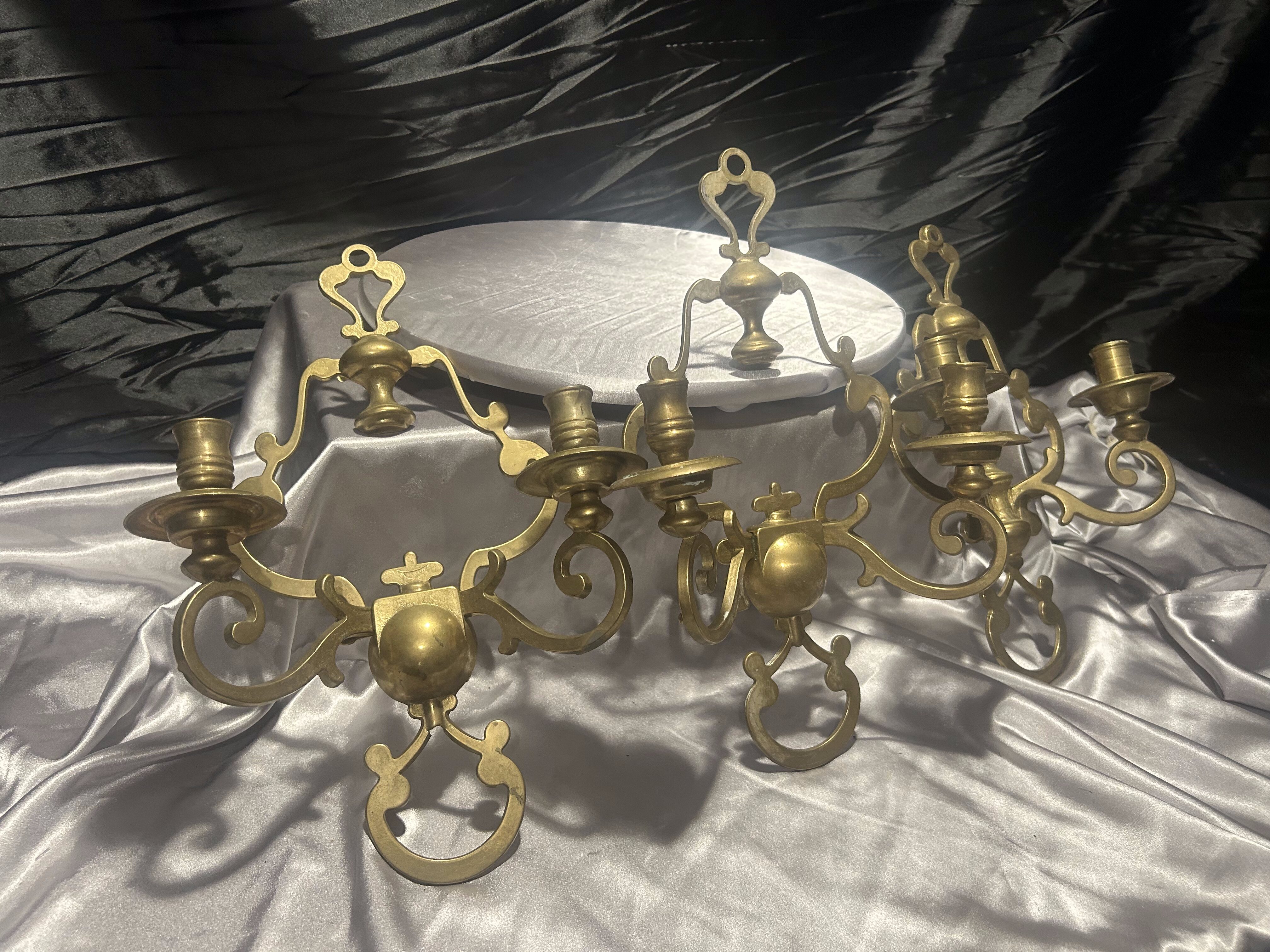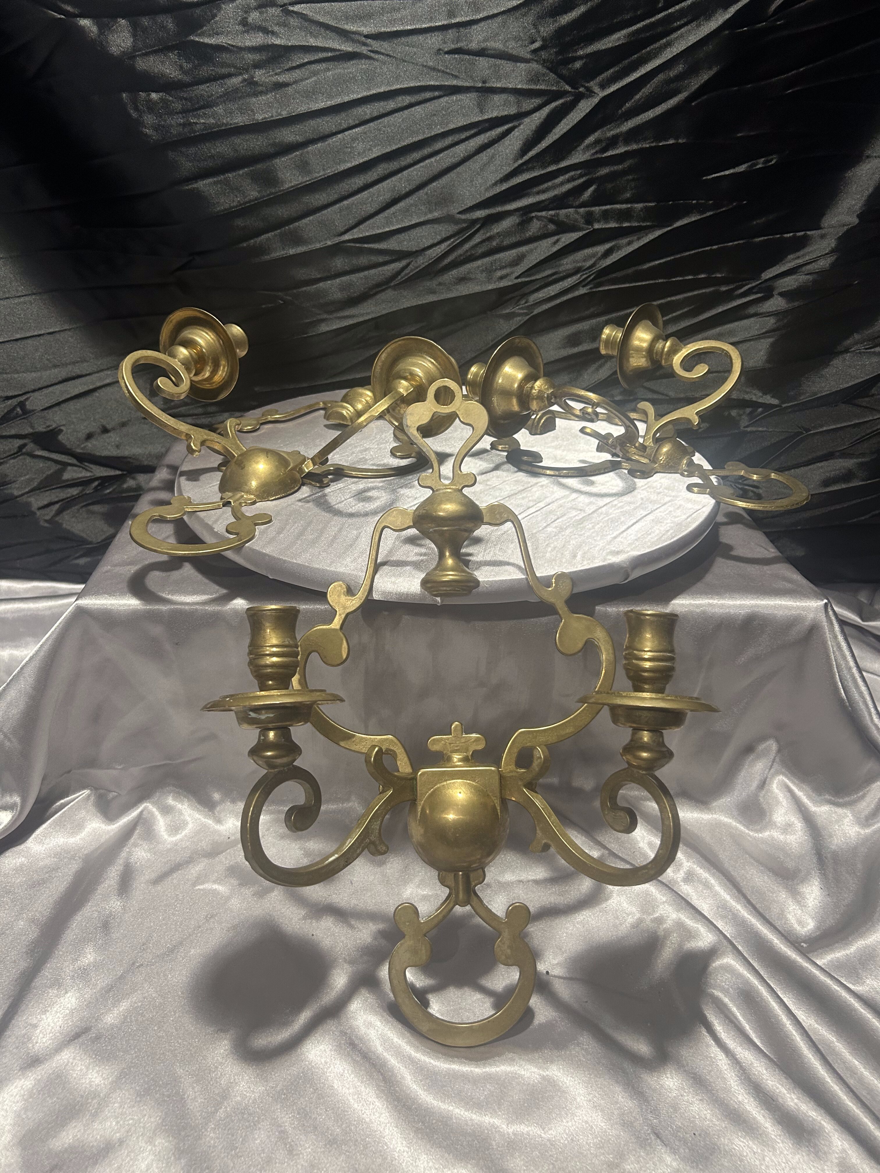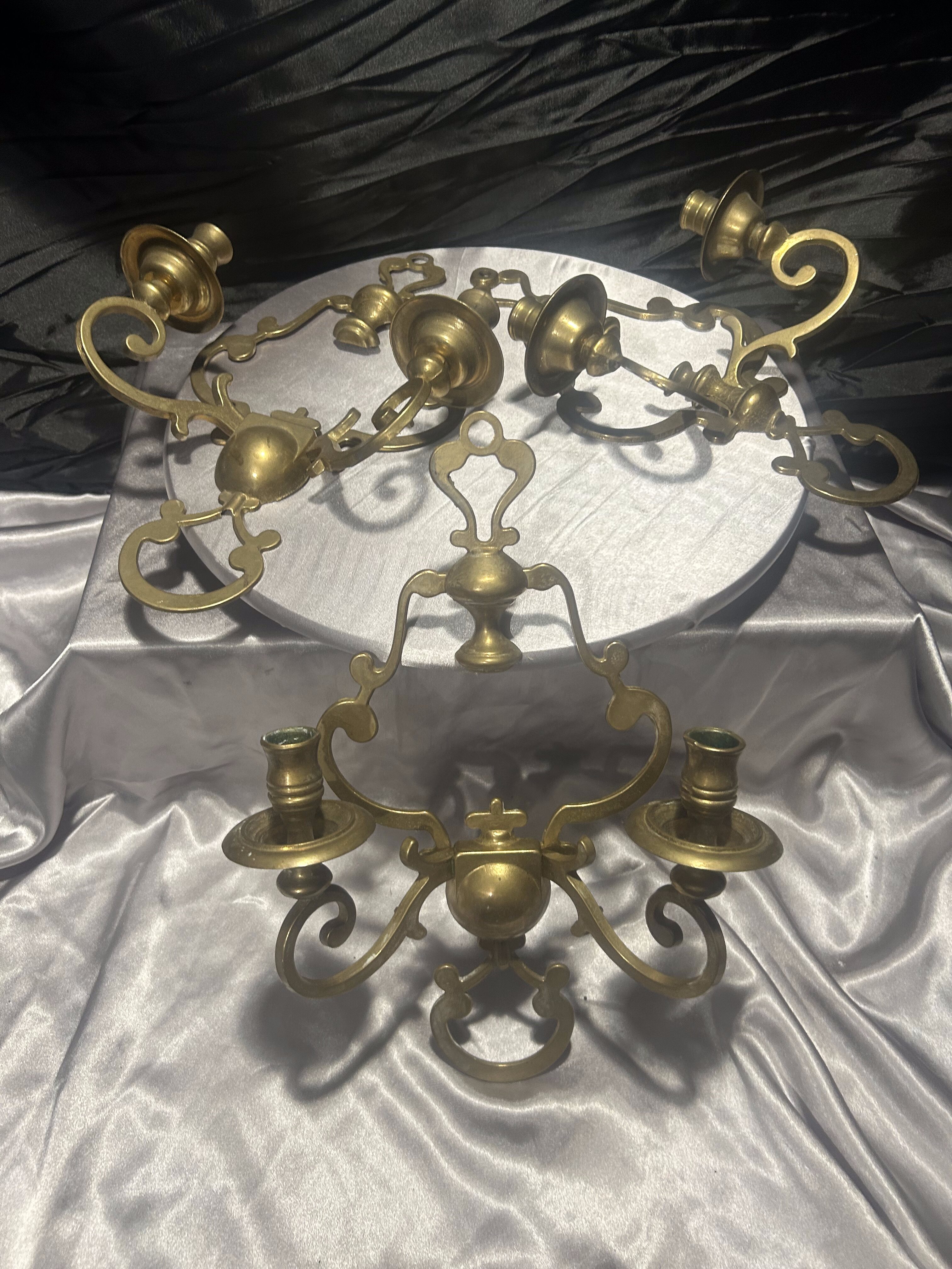 Elegancki zestaw trzech kinkietów ściennych wykonanych z litego mosiądzu. Każdy świecznik posiada miejsce na dwie świece, tworząc harmonijną i symetryczną kompozycję o dekoracyjnym charakterze. Stylowe, gięte ramiona i finezyjne wykończenia nadają całości klasyczny wygląd, doskonale wpisujący się w aranżacje o charakterze retro, vintage czy eklektycznym. To nie tylko funkcjonalne źródło światła, ale również wyrazisty element dekoracyjny, który wniesie do wnętrza ciepło i elegancję.