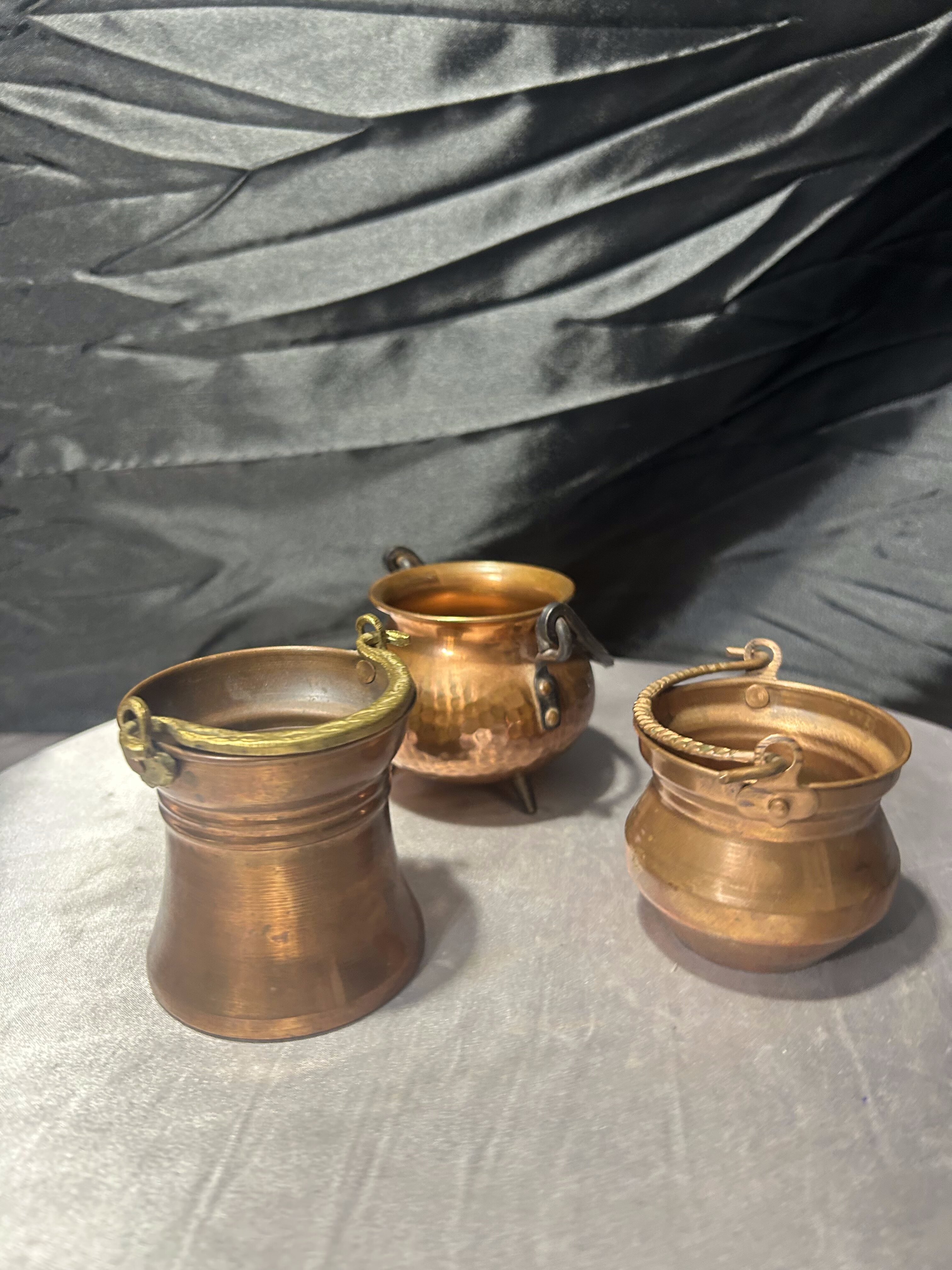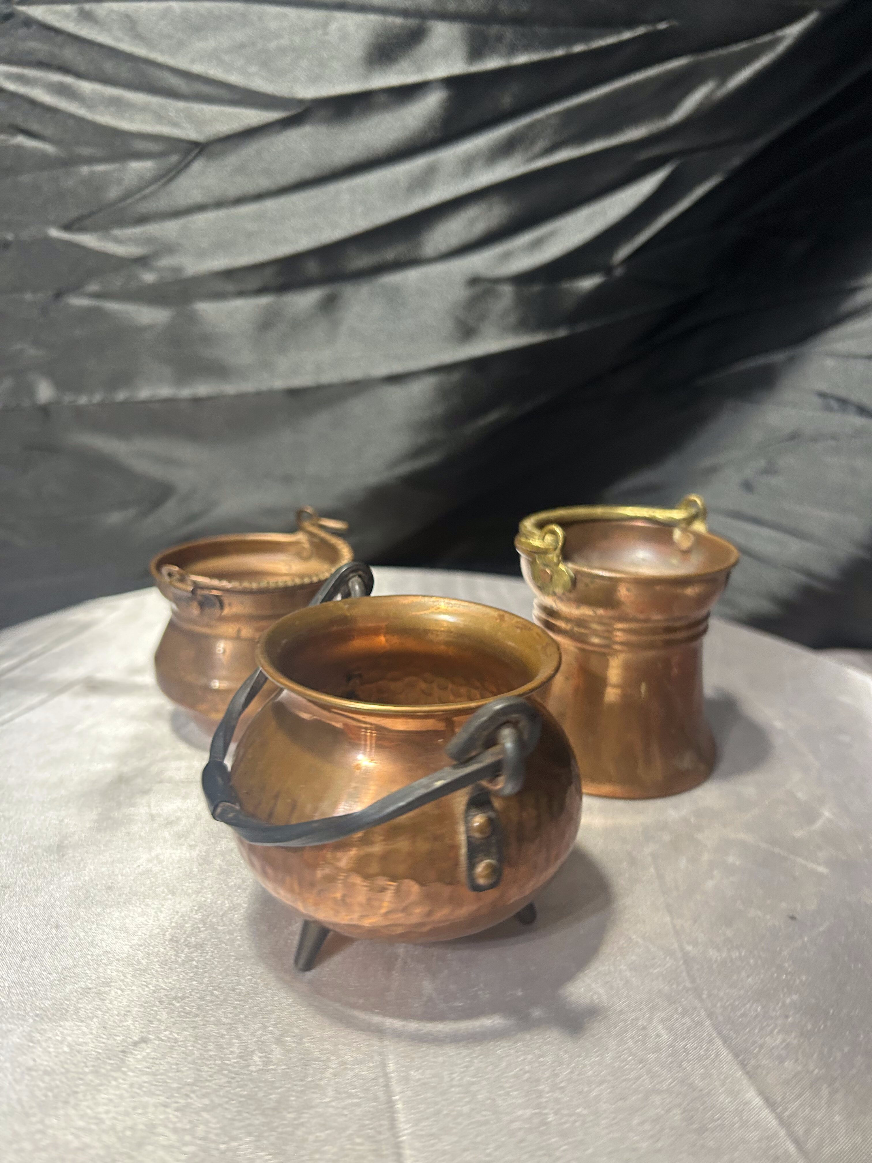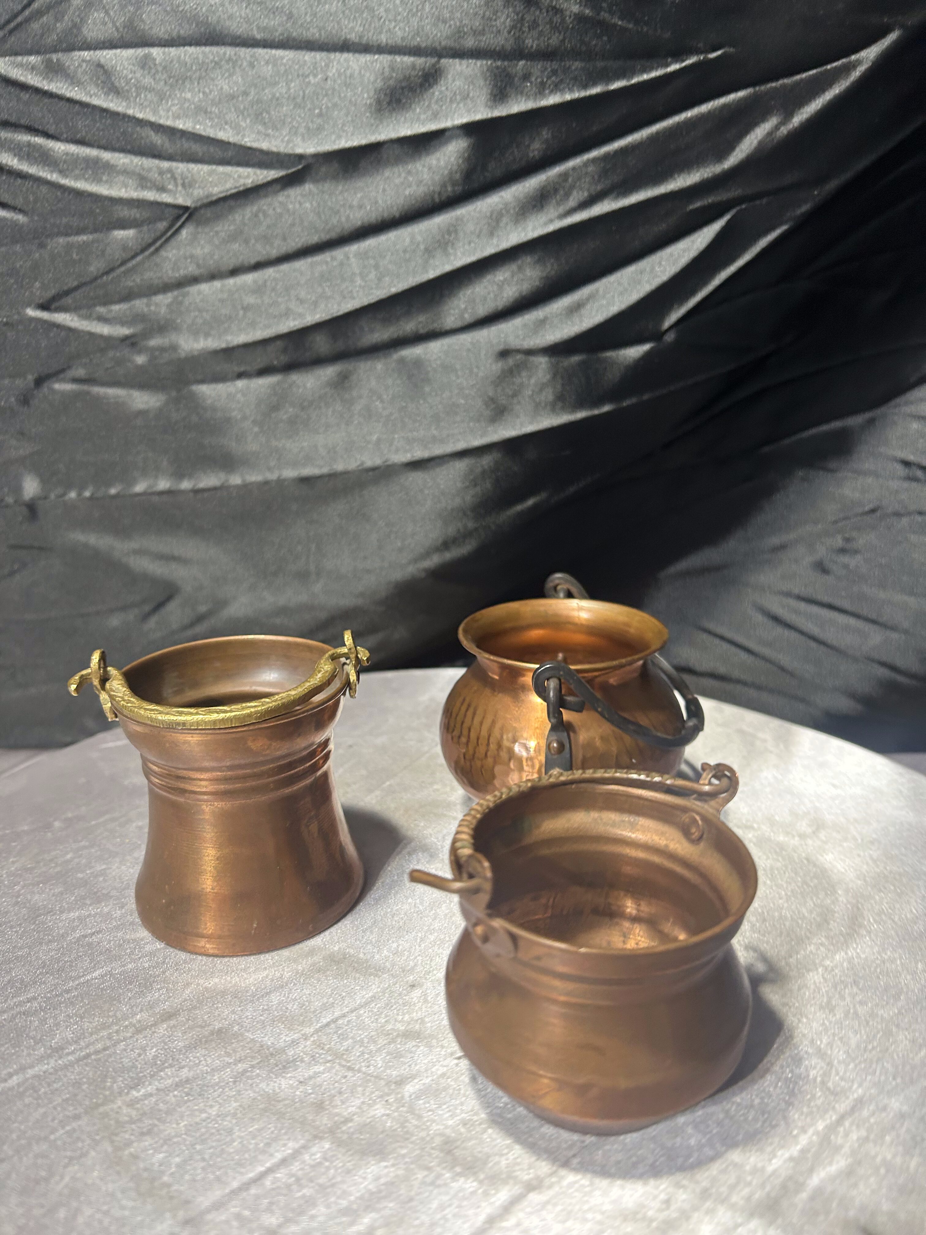 Komplet trzech niewielkich kociołków wykonanych z miedzi, różniących się wysokością i detalami. Każdy egzemplarz ma swój indywidualny charakter – od prostych form po dekoracyjne wykończenia z uchwytami. To drobne, ale bardzo klimatyczne przedmioty, które świetnie odnajdą się zarówno jako dekoracje, jak i praktyczne pojemniki na drobiazgi.