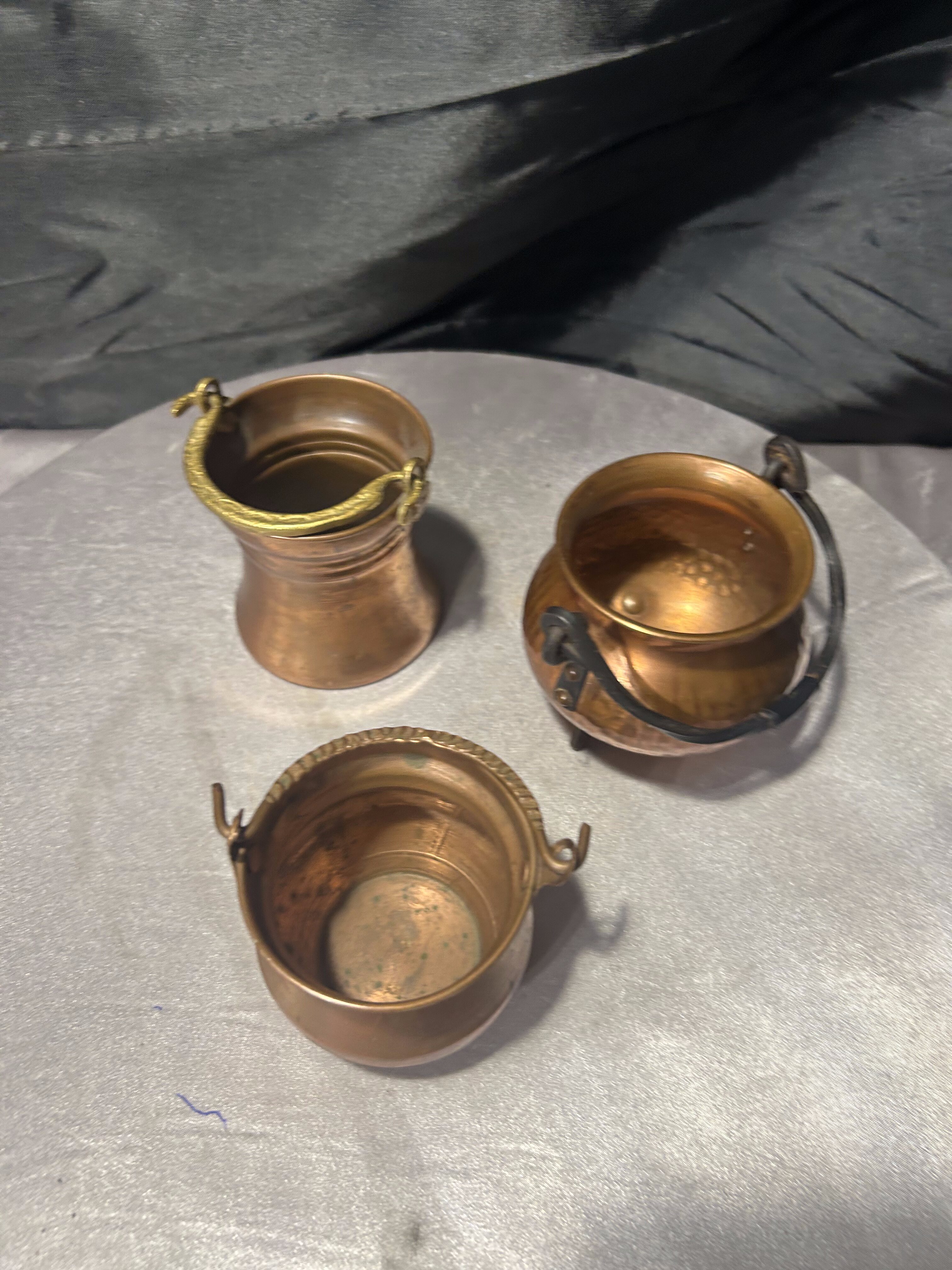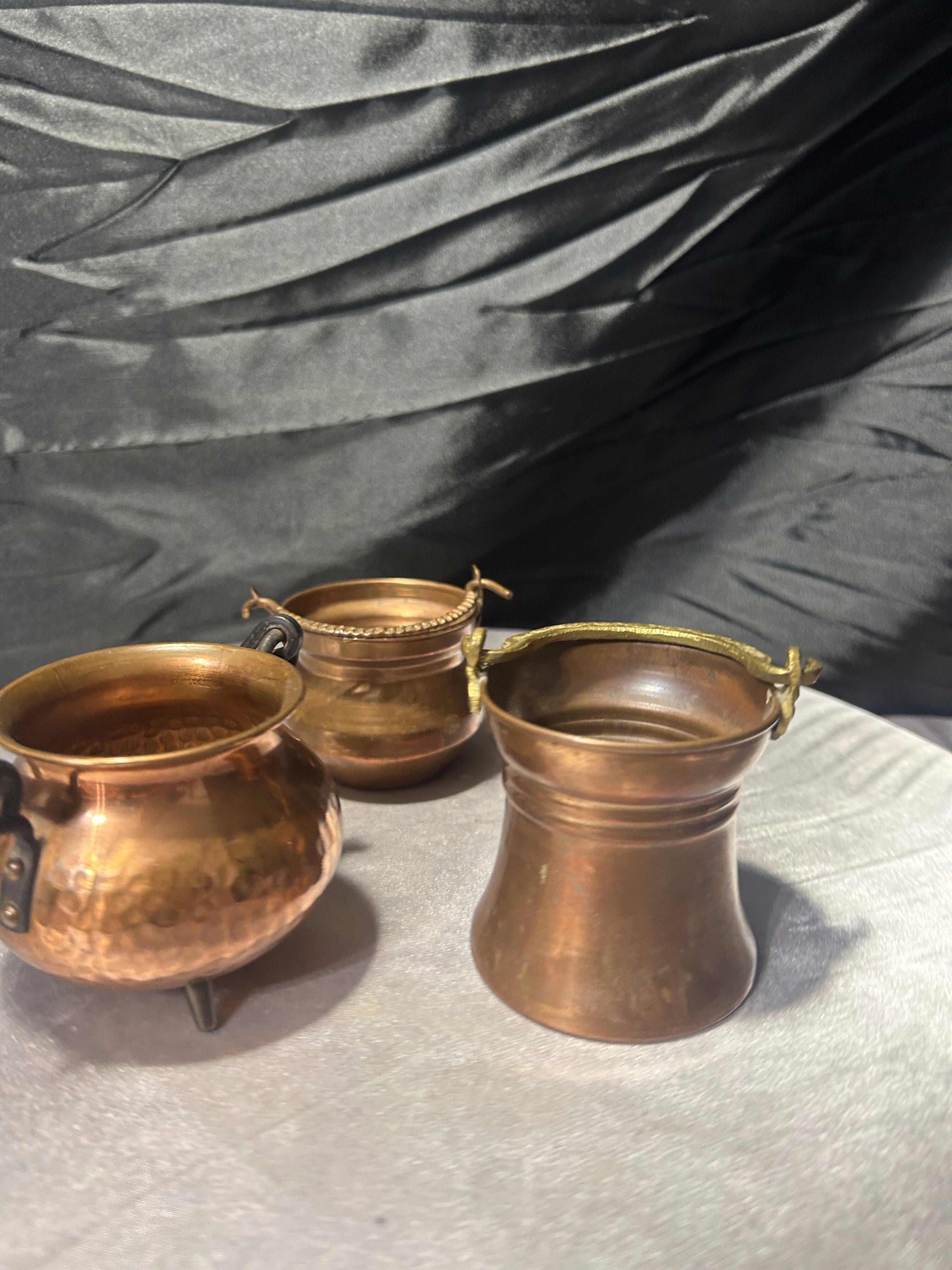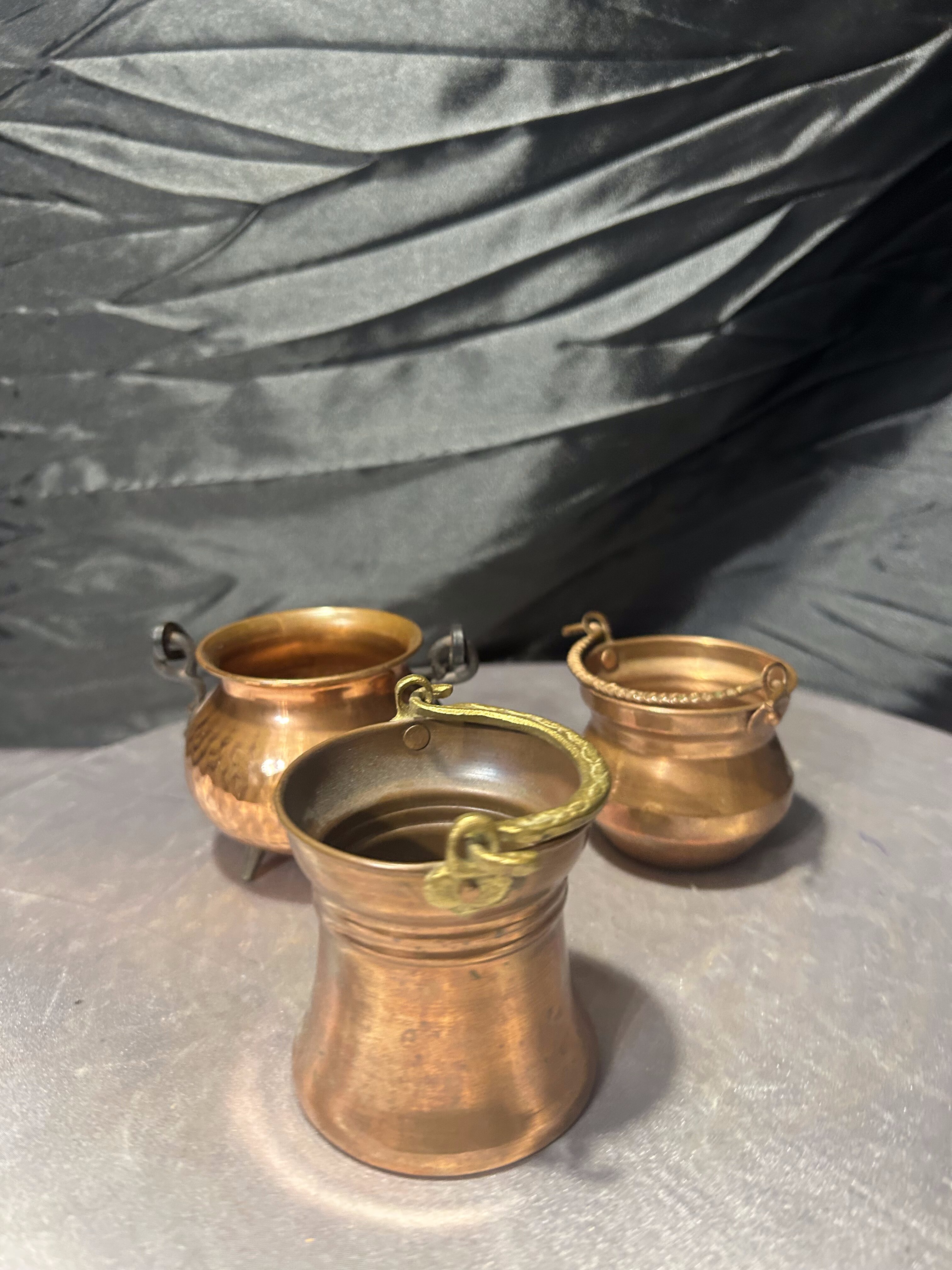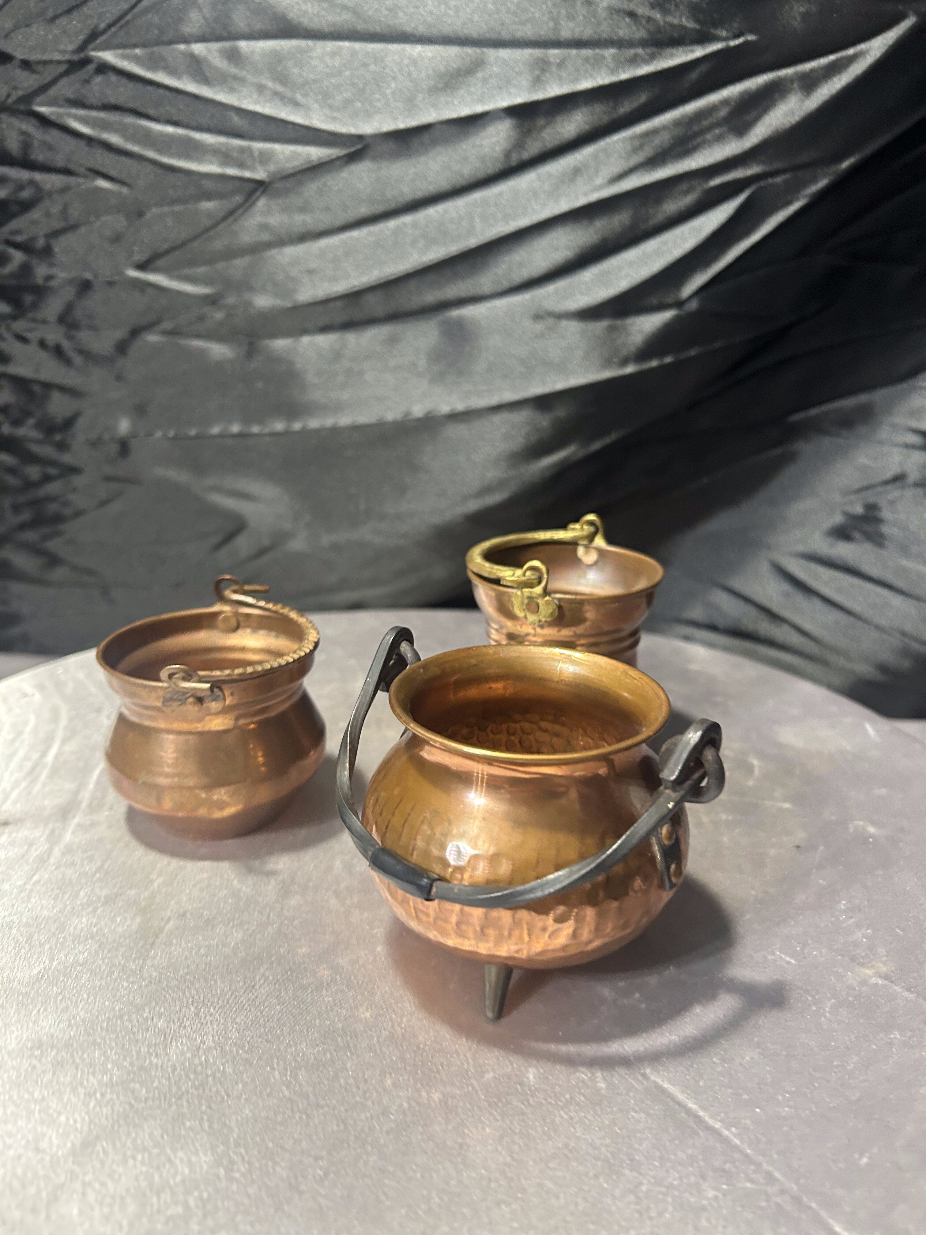 Komplet trzech niewielkich kociołków wykonanych z miedzi, różniących się wysokością i detalami. Każdy egzemplarz ma swój indywidualny charakter – od prostych form po dekoracyjne wykończenia z uchwytami. To drobne, ale bardzo klimatyczne przedmioty, które świetnie odnajdą się zarówno jako dekoracje, jak i praktyczne pojemniki na drobiazgi.