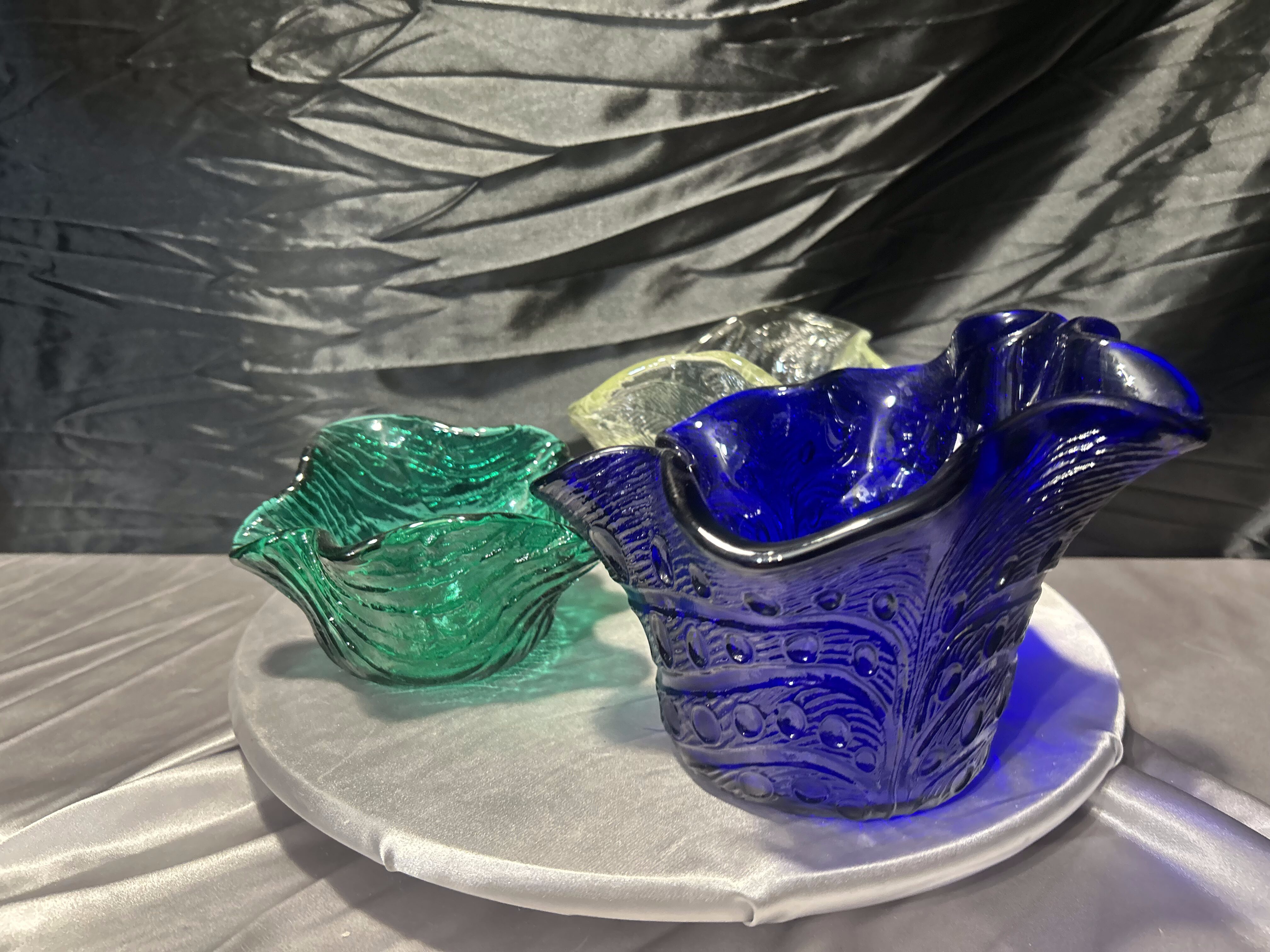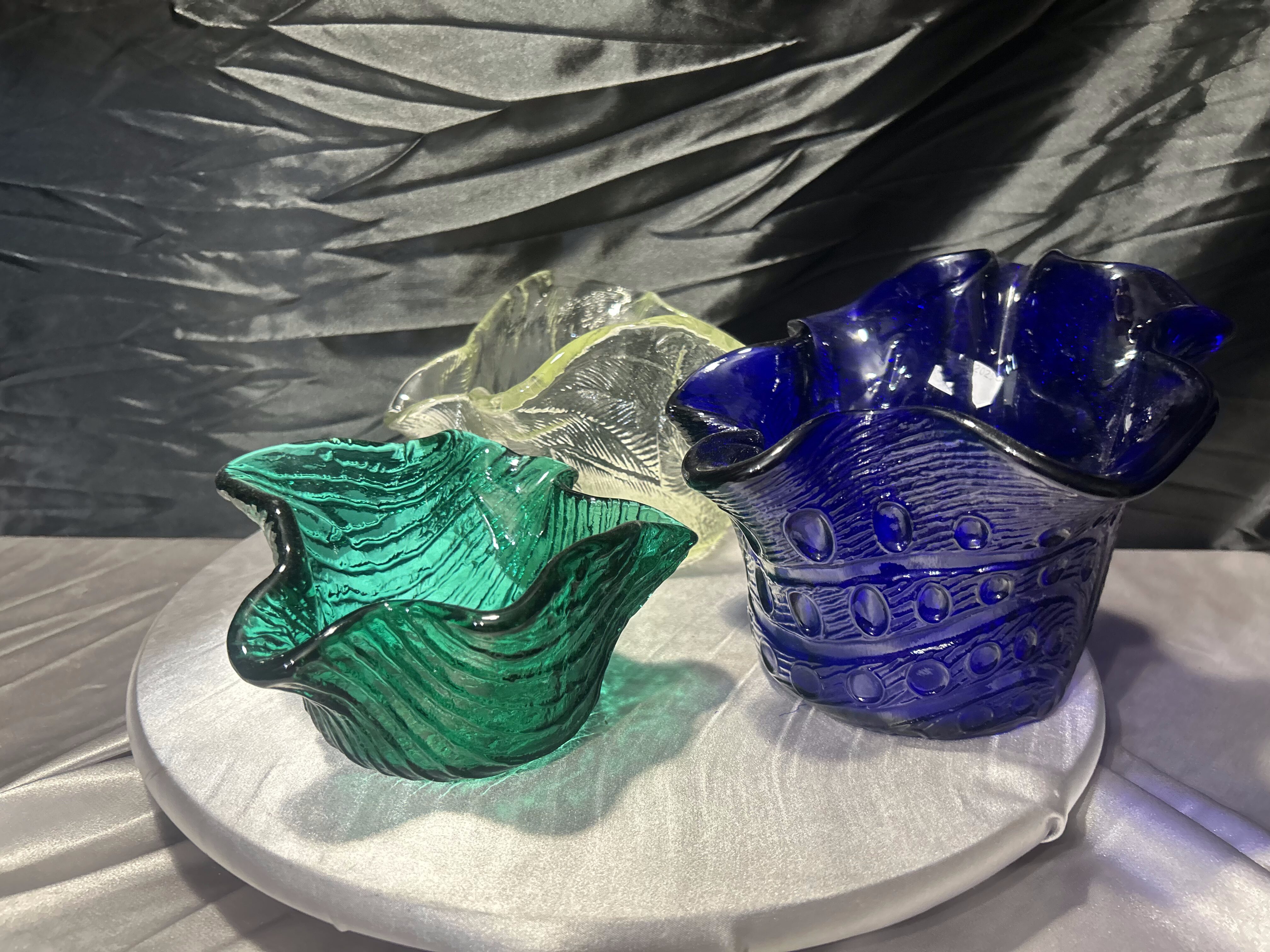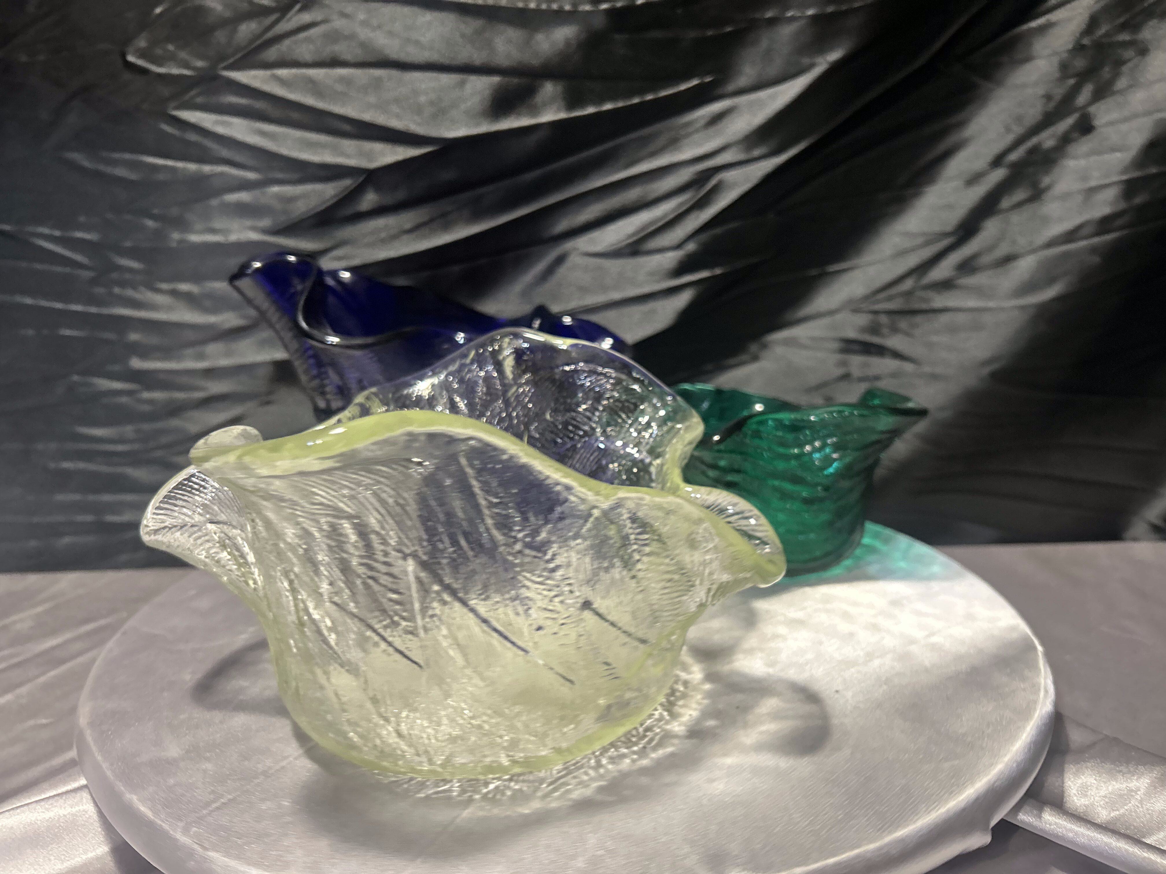 Misy wyróżniają się ręcznie formowaną linią brzegów oraz charakterystyczną, falującą formą. Każda z nich została wykonana z grubego szkła, które pięknie załamuje światło i podkreśla głębię kolorów. W zestawie znajdują się trzy różne odcienie szkła: zielony, jasnożółty oraz intensywny granatowy.