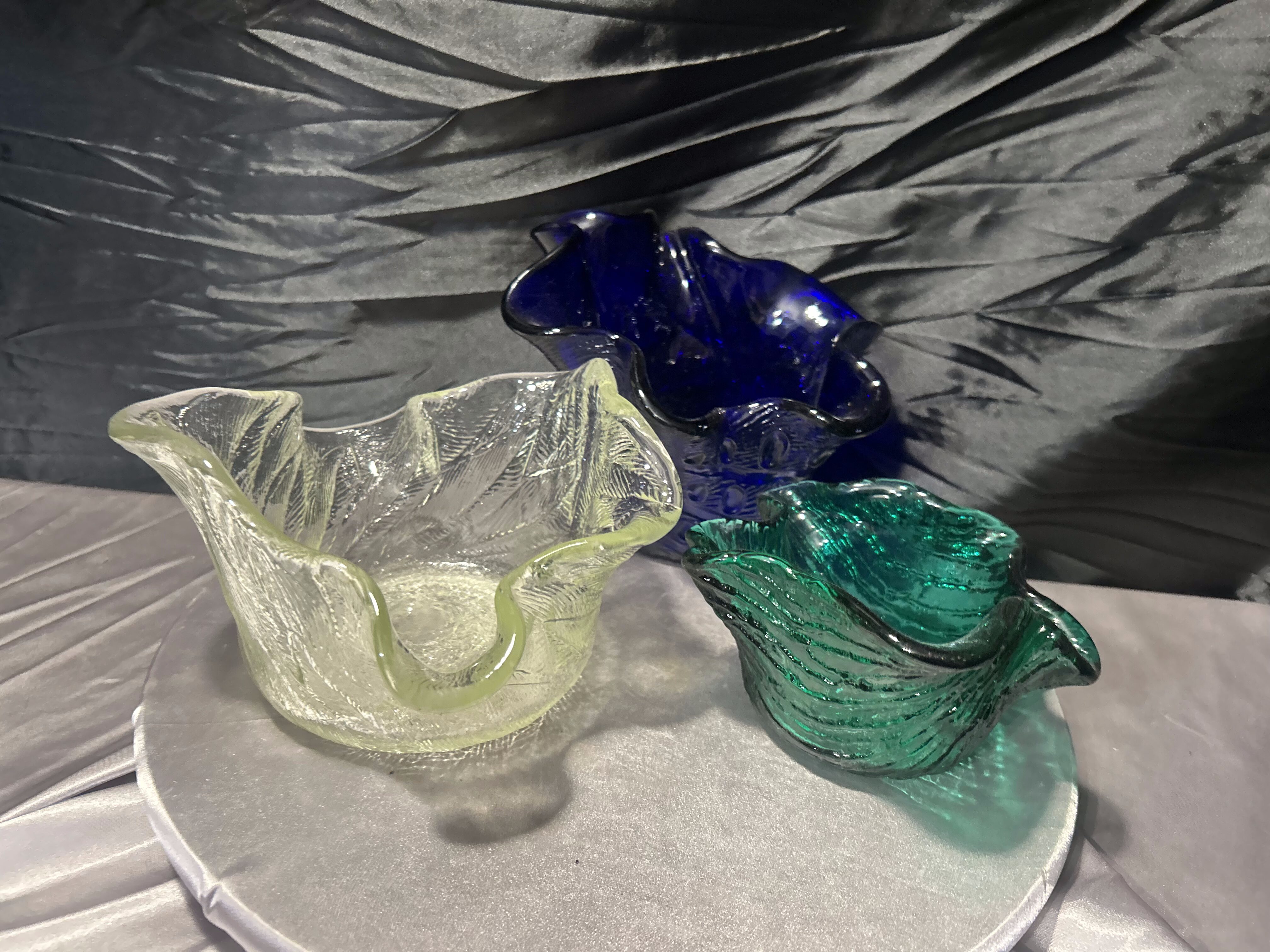 Efektowny zestaw trzech mis wykonanych ze szkła artystycznego. Każda z nich posiada inną formę, strukturę oraz kolor, dzięki czemu komplet tworzy niezwykle dekoracyjną i harmonijną kompozycję.