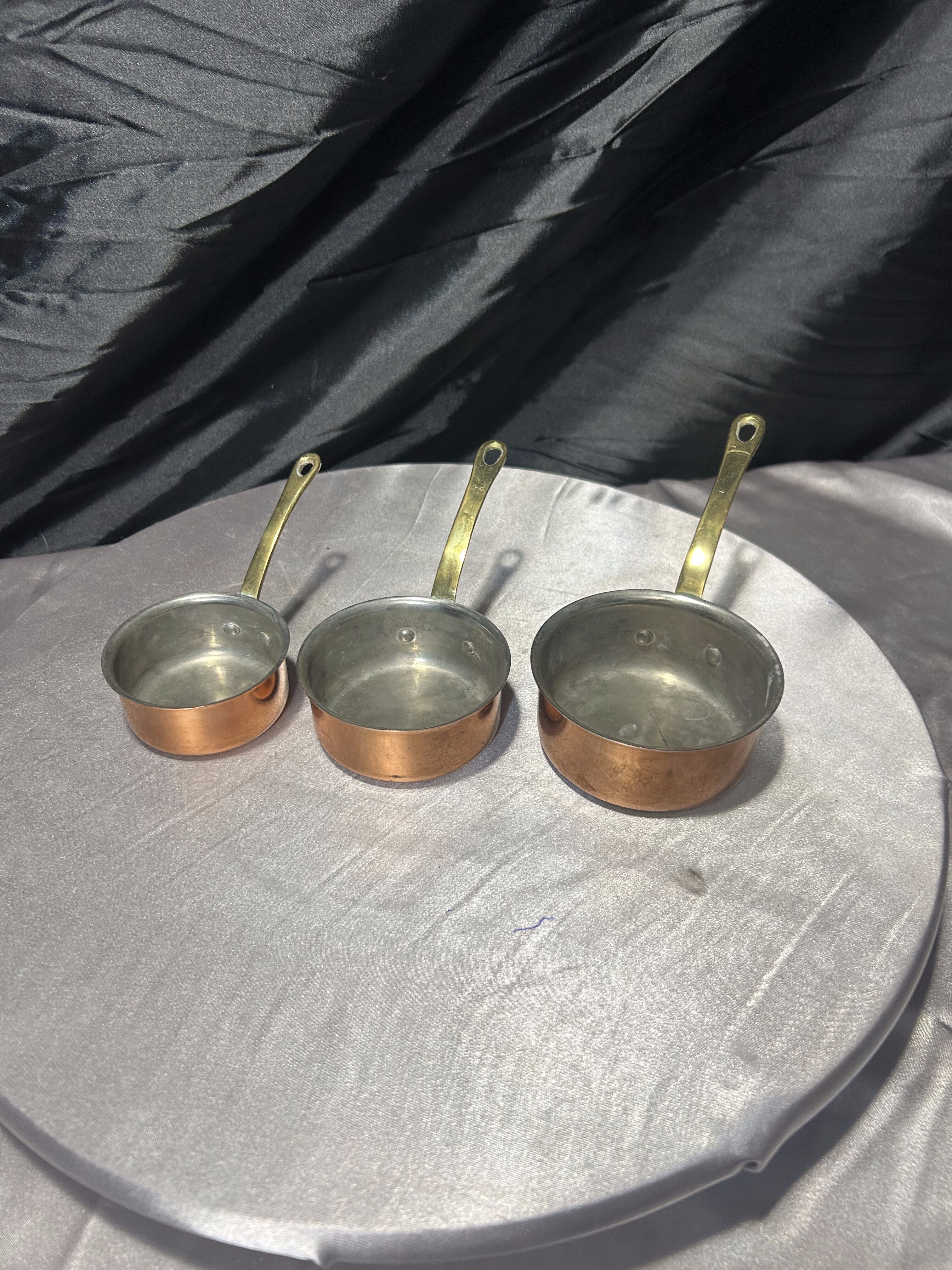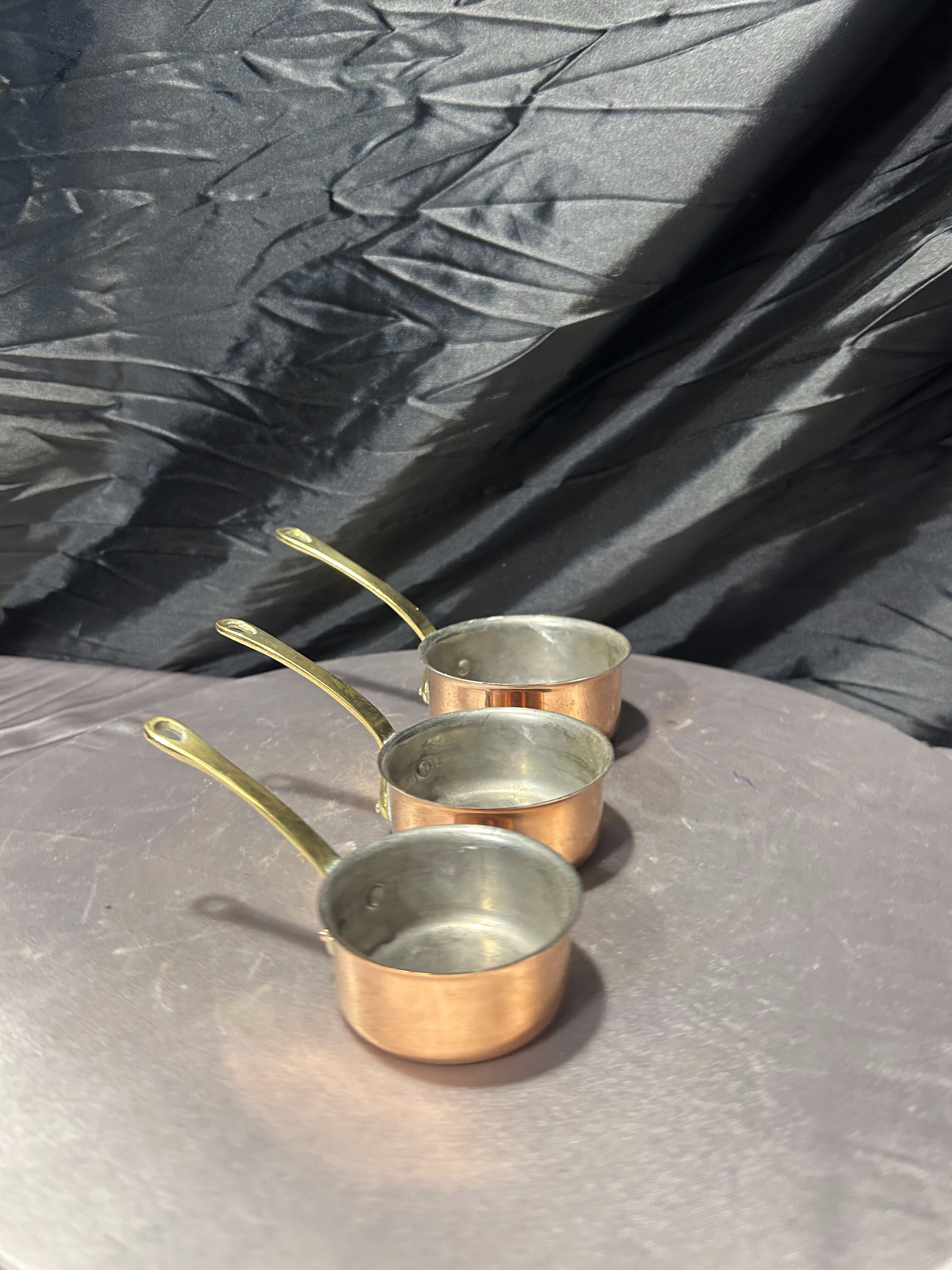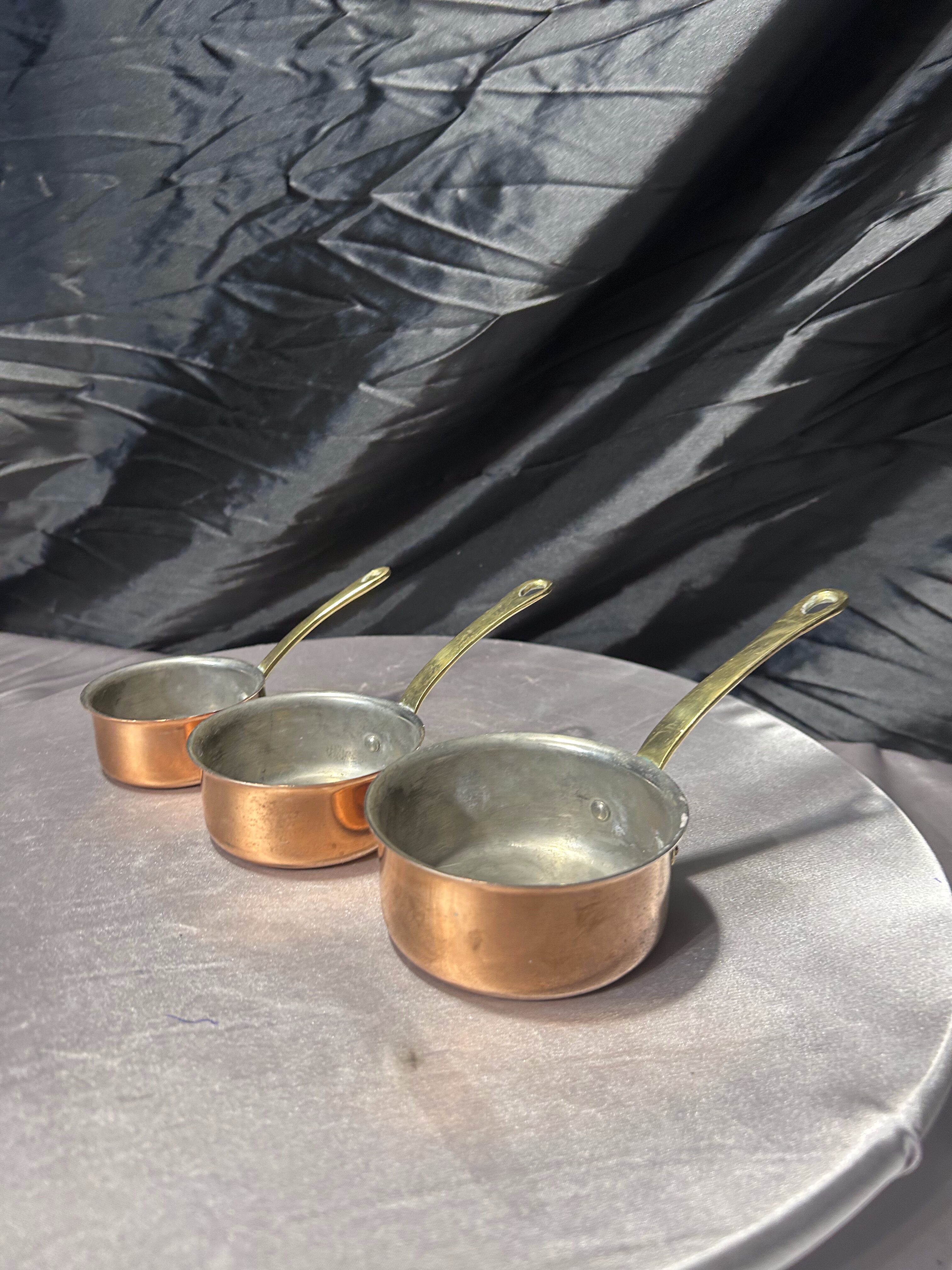 Stylowy komplet trzech rondelków wykonanych z miedzi, z solidnymi rączkami z mosiądzu. To klasyczny zestaw kuchenny w stylu vintage, który zachwyca zarówno funkcjonalnością, jak i dekoracyjnym charakterem.