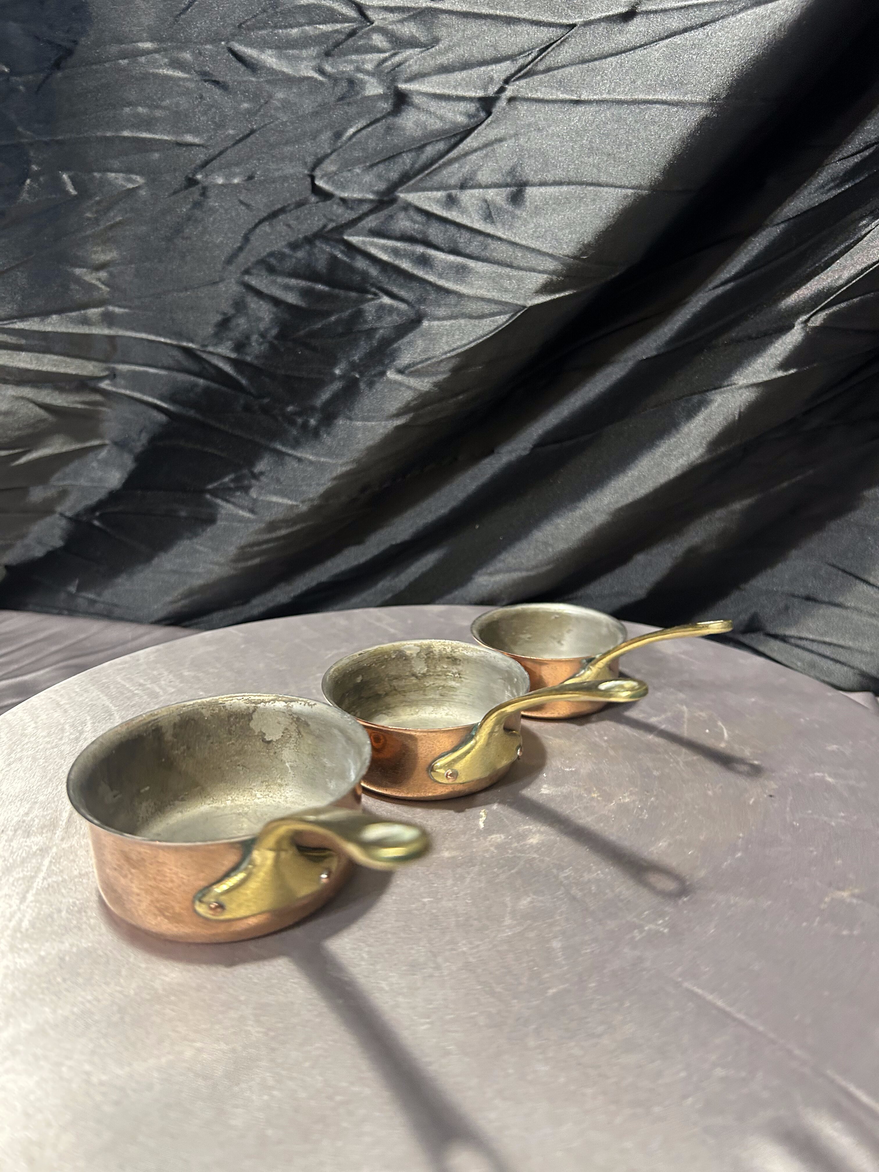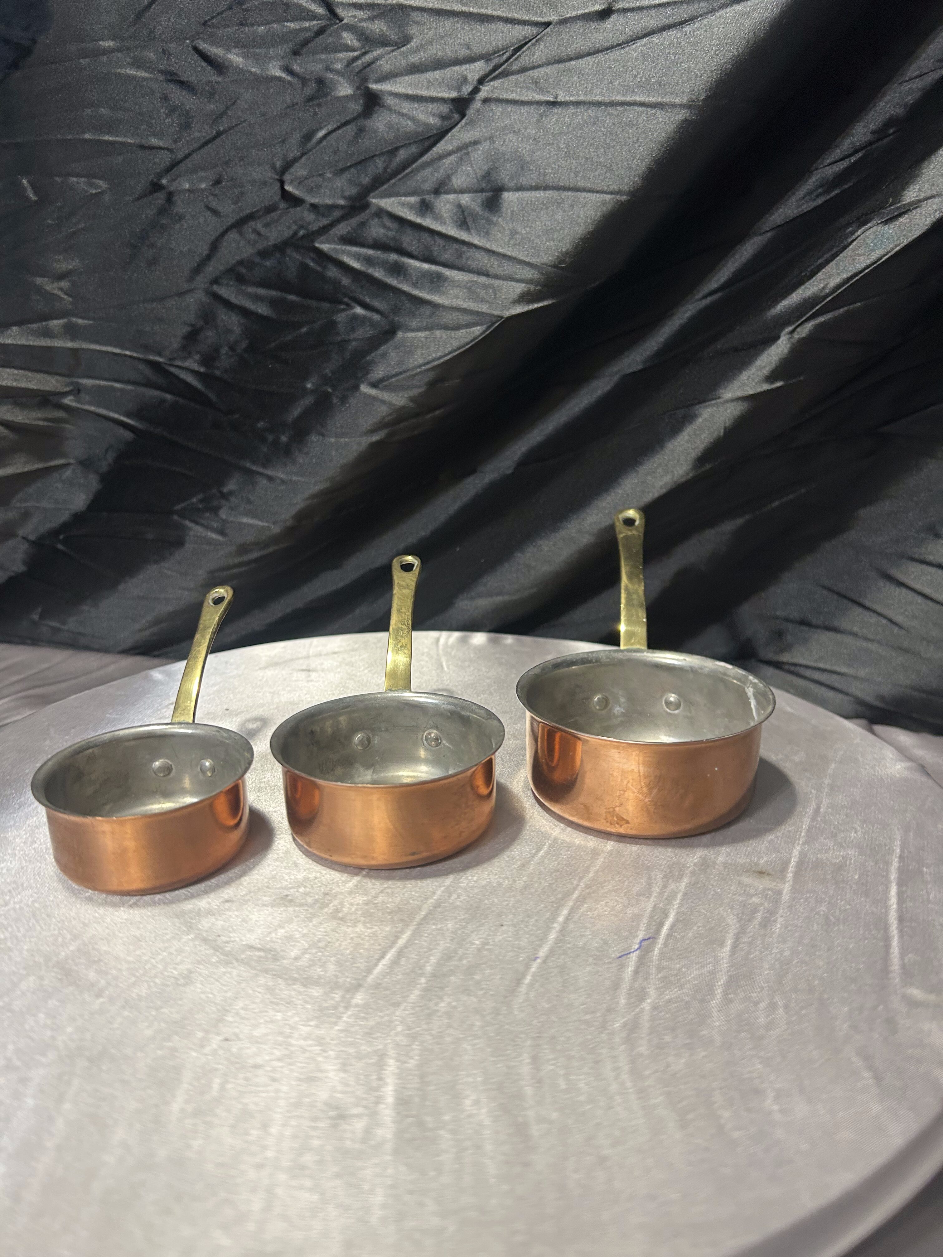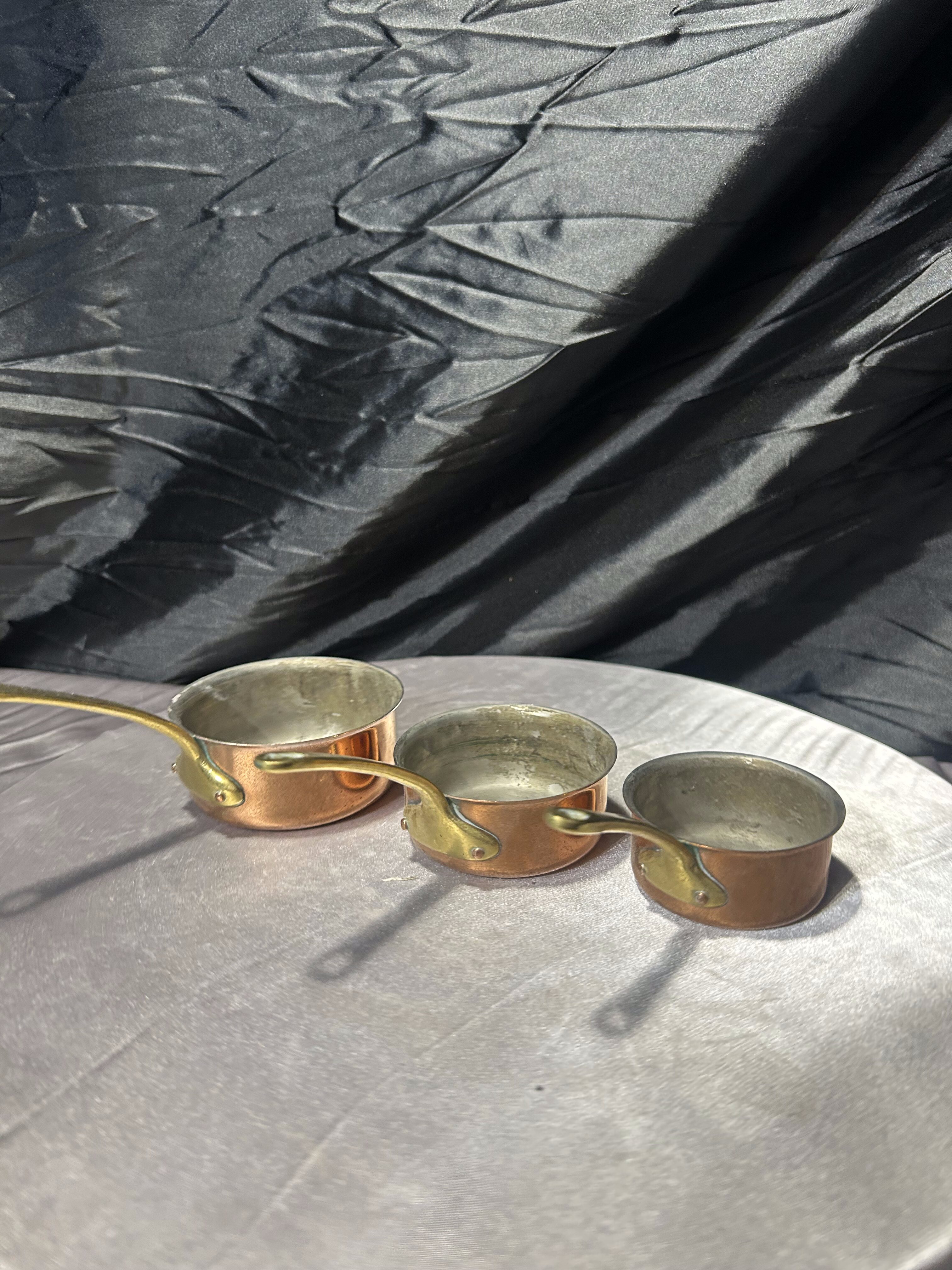Stylowy komplet trzech rondelków wykonanych z miedzi, z solidnymi rączkami z mosiądzu. To klasyczny zestaw kuchenny w stylu vintage, który zachwyca zarówno funkcjonalnością, jak i dekoracyjnym charakterem.