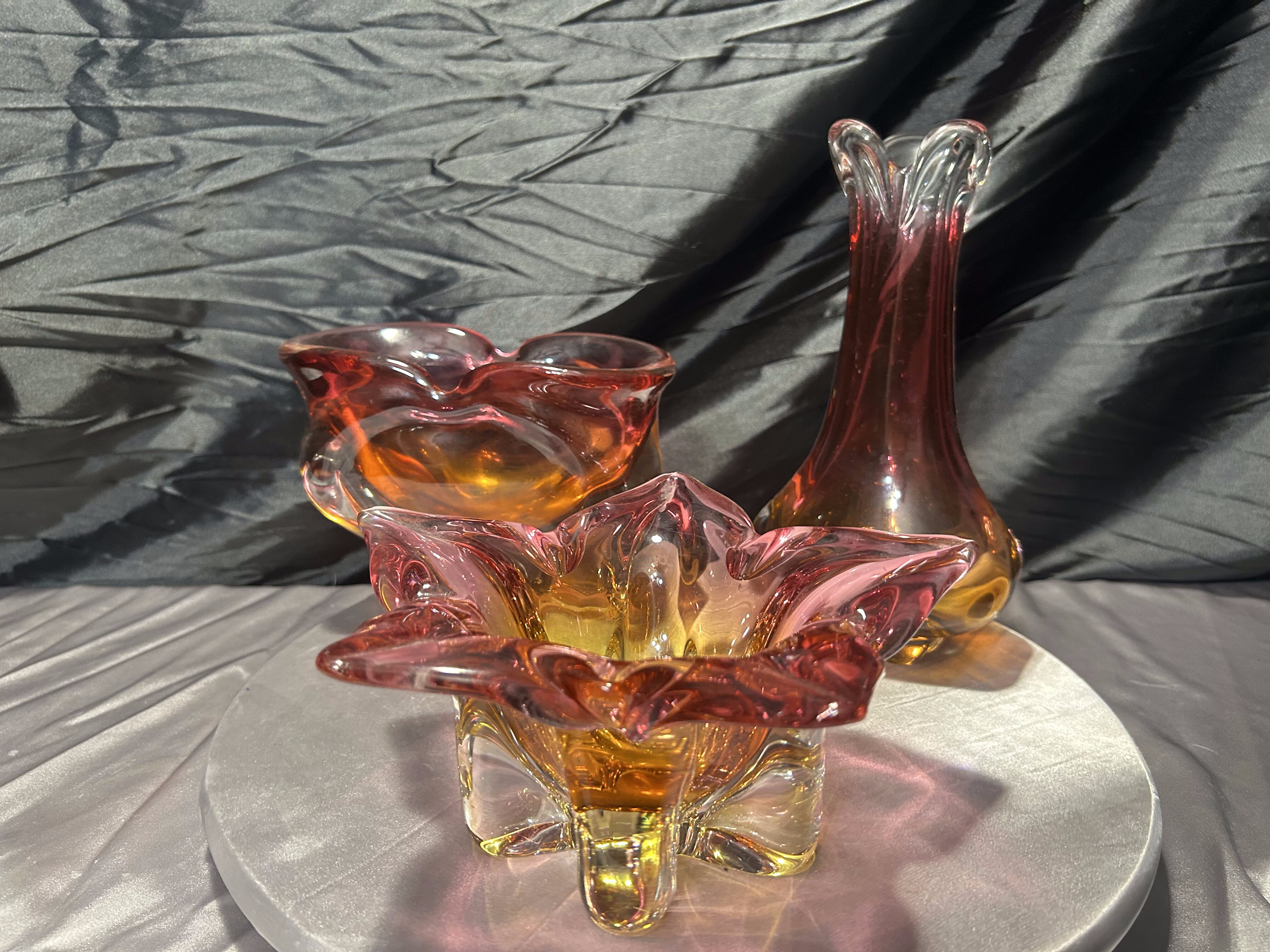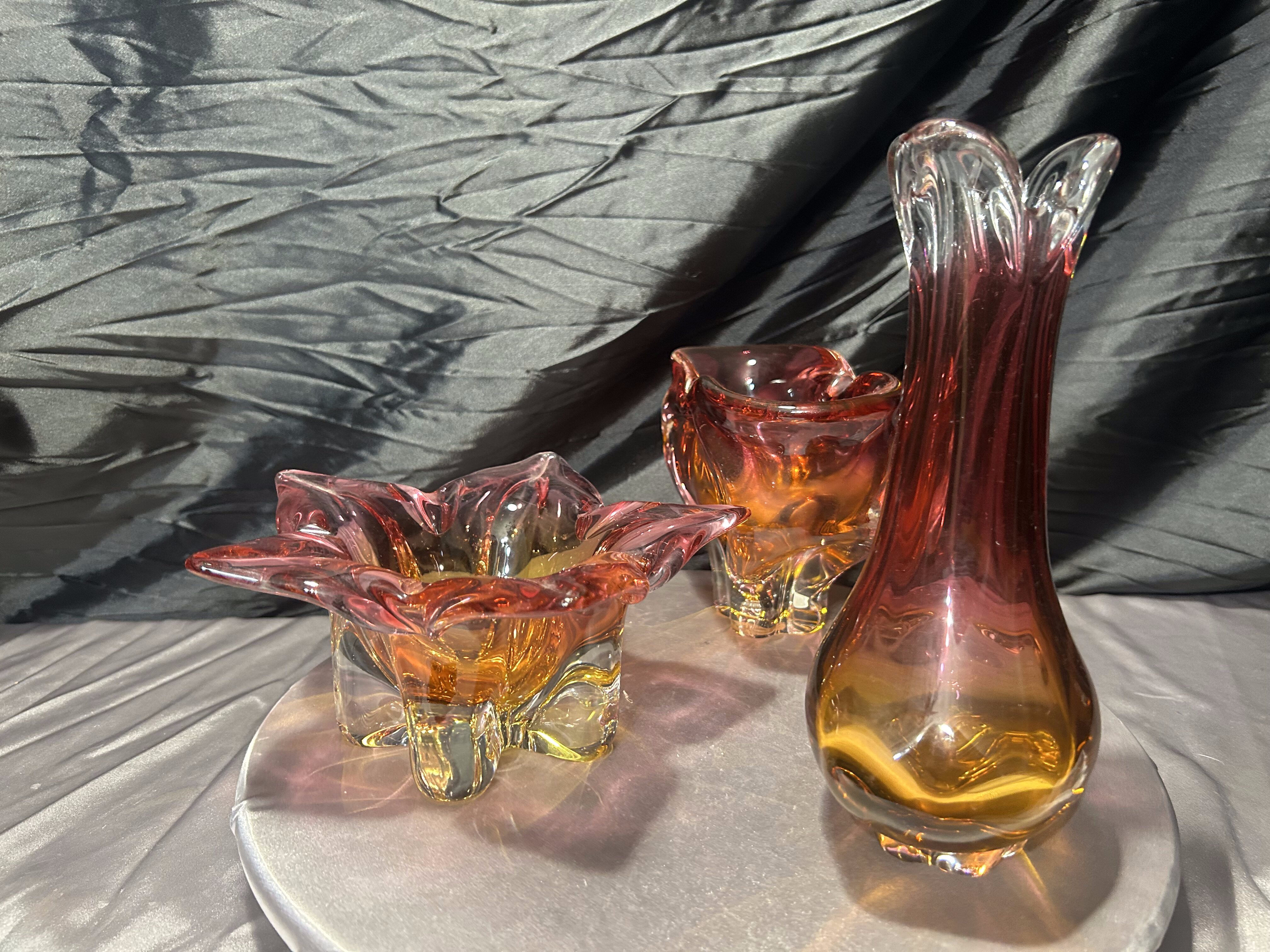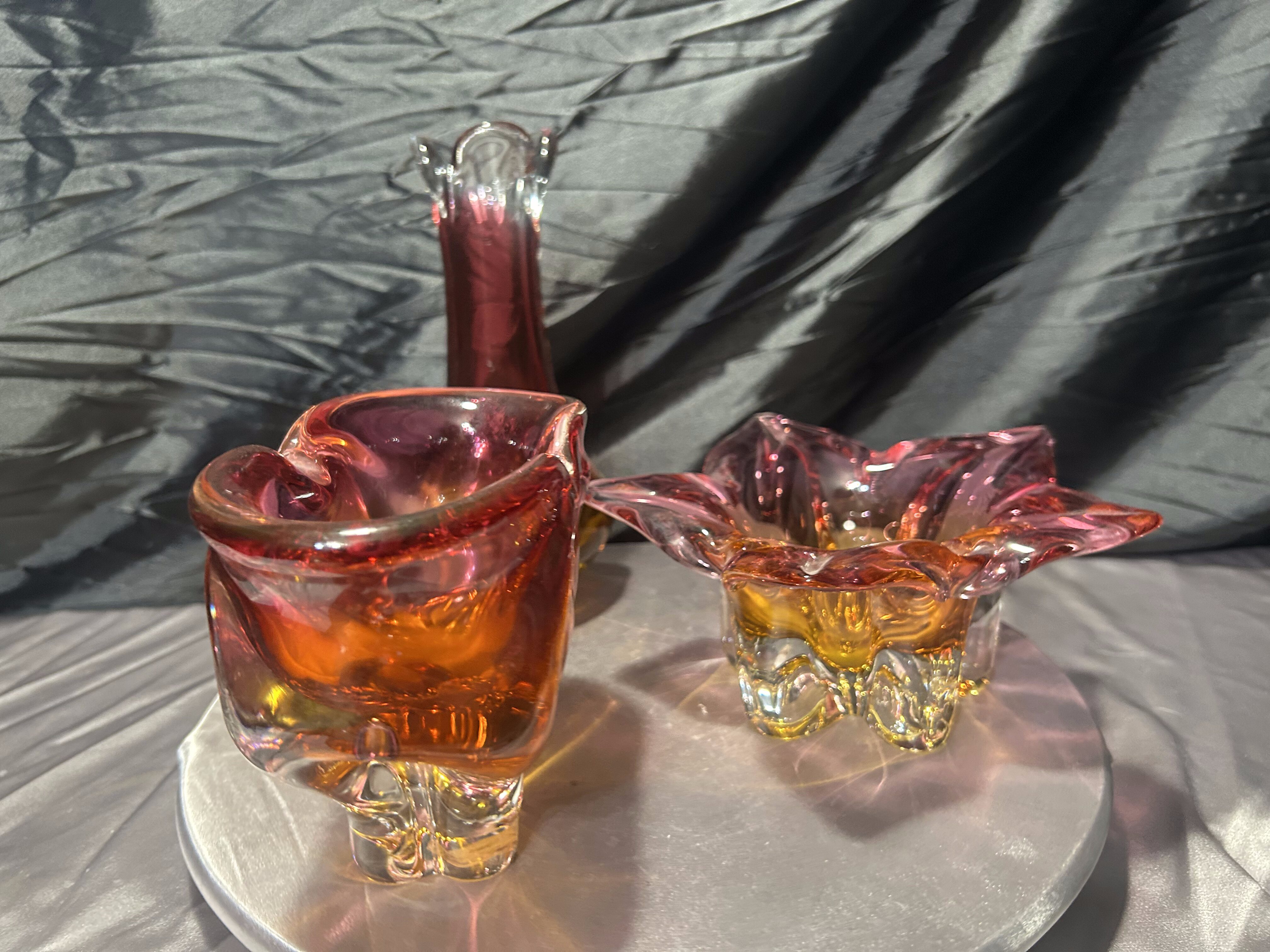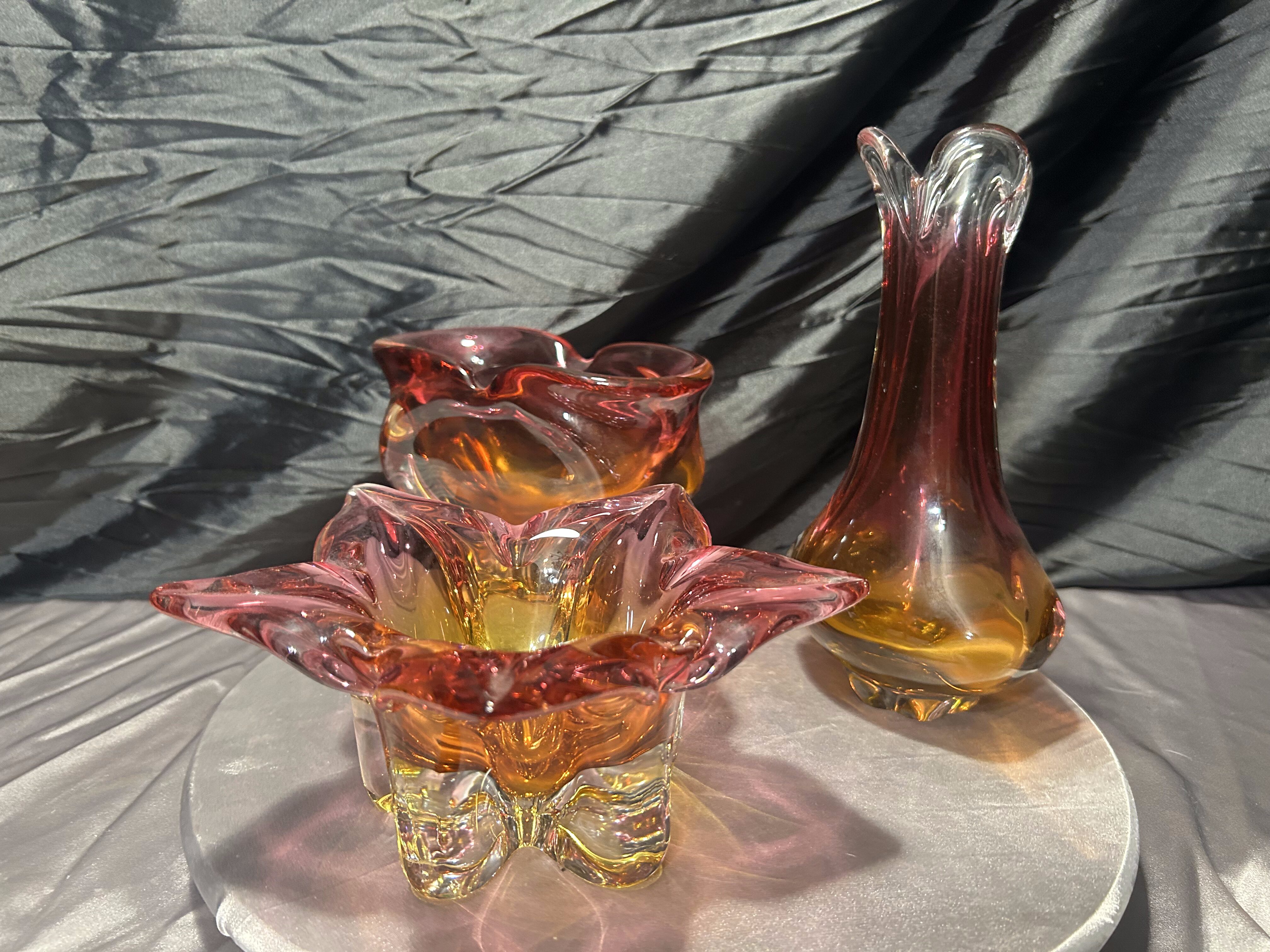 Wyjątkowy komplet trzech szklanych form artystycznych powstałych w słynnej Hucie Bohemia, zaprojektowanych w charakterystycznym stylu jednego z najwybitniejszych czeskich projektantów – Józefa Hospodki. Zestaw obejmuje misę o kwietnym kształcie, podłużną paterę oraz smukły flakon. Wszystkie trzy elementy łączy kunszt ręcznego formowania, przenikanie barw od różu po głęboki bursztyn oraz unikalna płynność form, z której Bohemia znana jest na całym świecie.