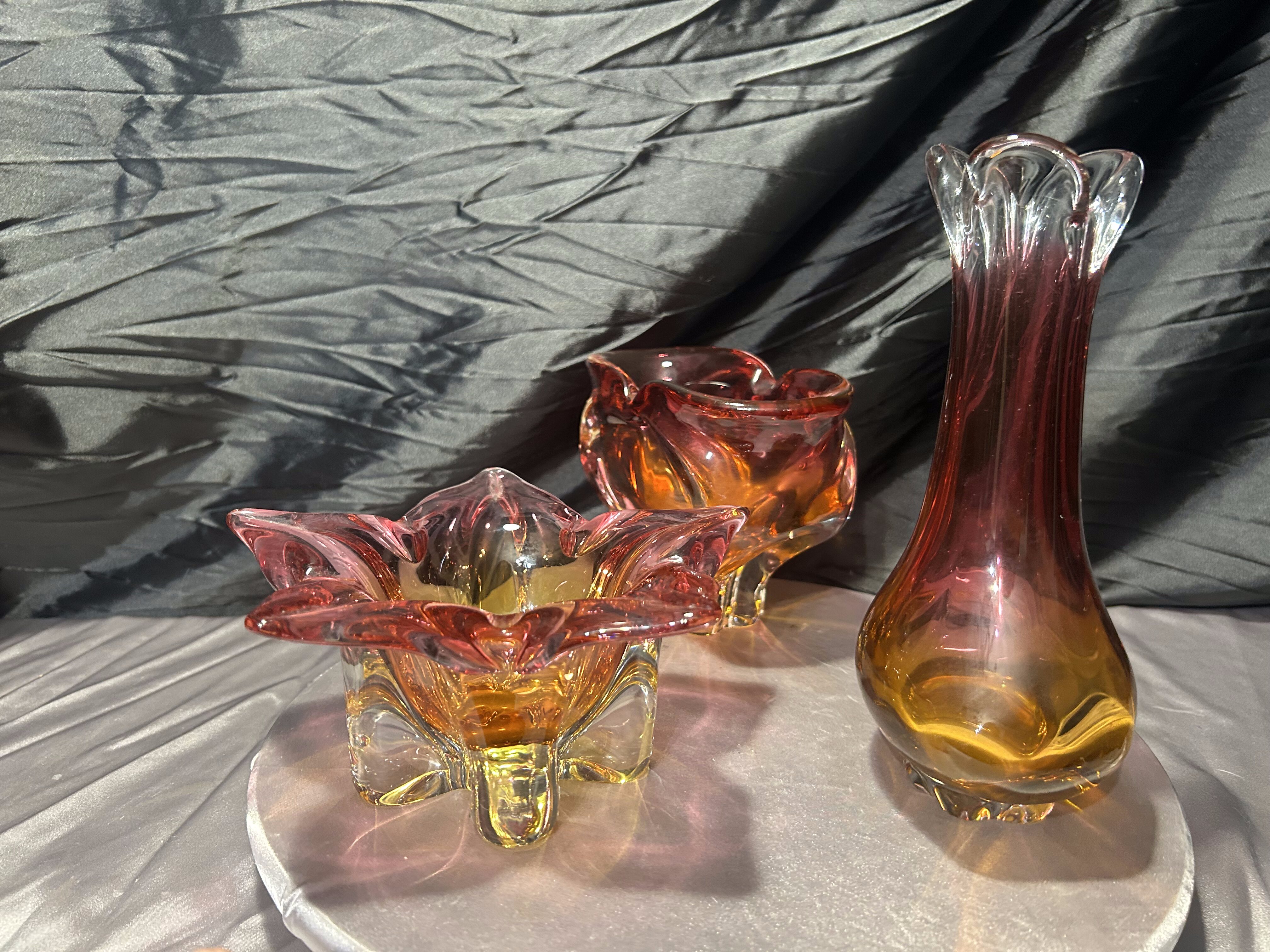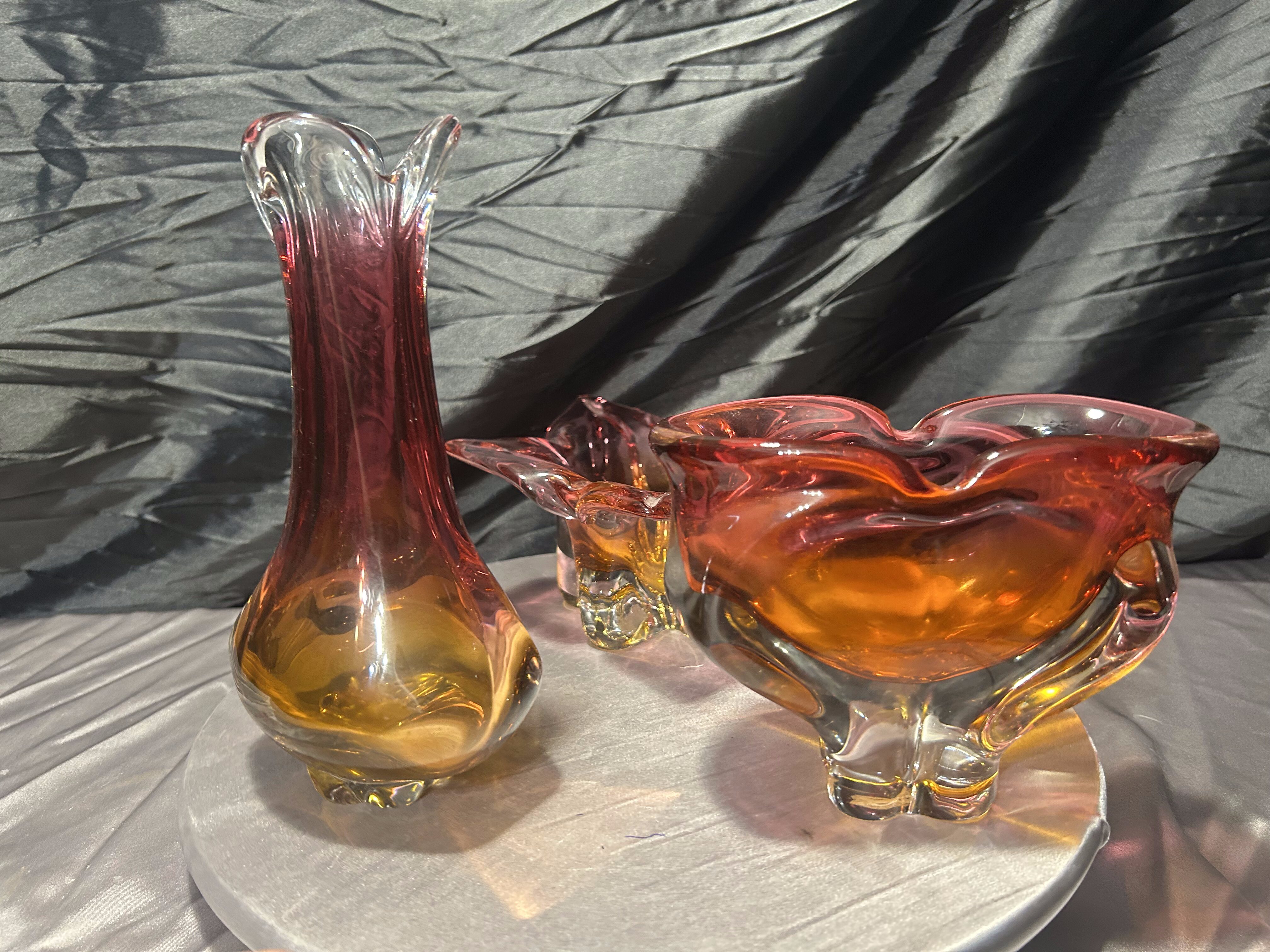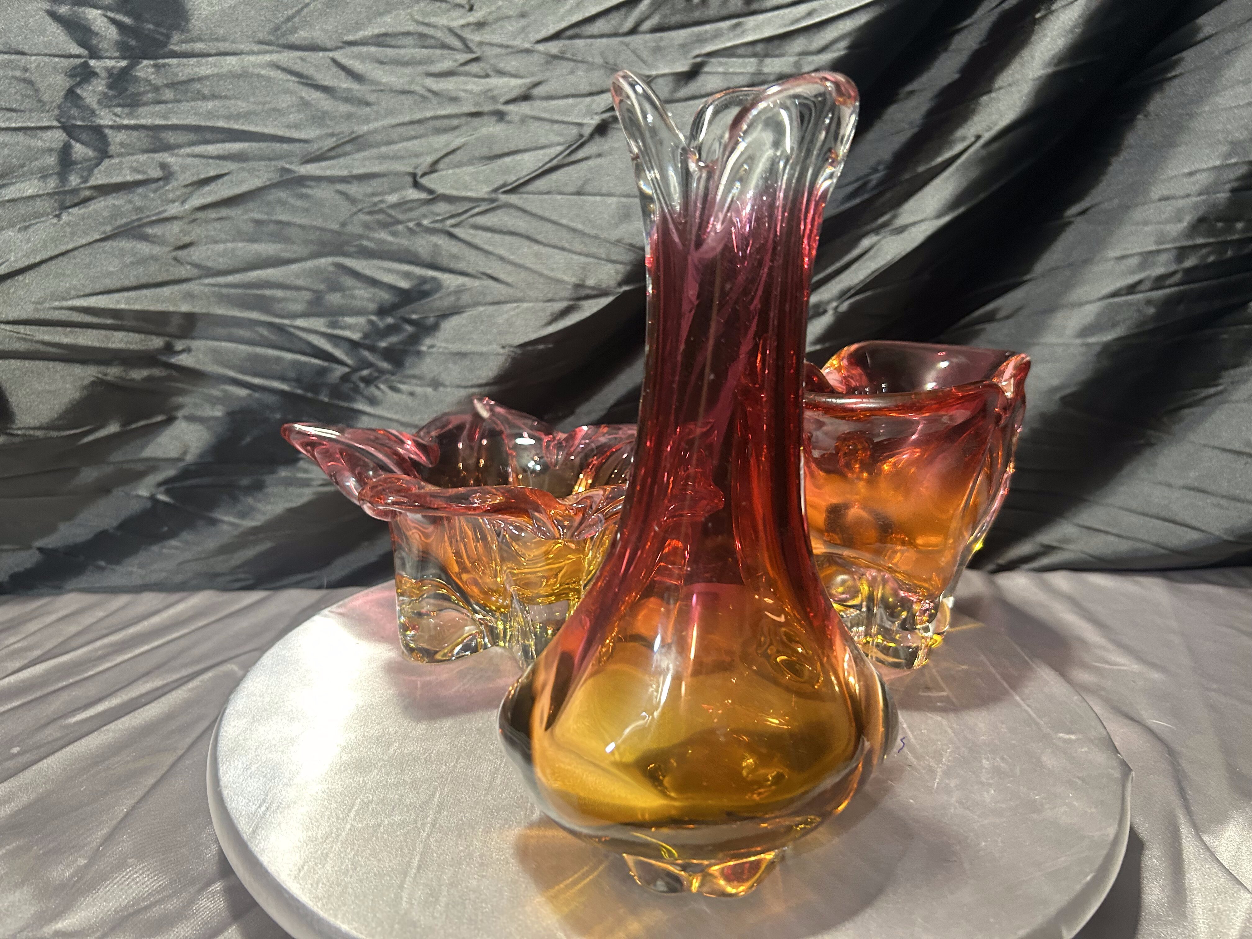 Wyjątkowy komplet trzech szklanych form artystycznych powstałych w słynnej Hucie Bohemia, zaprojektowanych w charakterystycznym stylu jednego z najwybitniejszych czeskich projektantów – Józefa Hospodki. Zestaw obejmuje misę o kwietnym kształcie, podłużną paterę oraz smukły flakon. Wszystkie trzy elementy łączy kunszt ręcznego formowania, przenikanie barw od różu po głęboki bursztyn oraz unikalna płynność form, z której Bohemia znana jest na całym świecie.