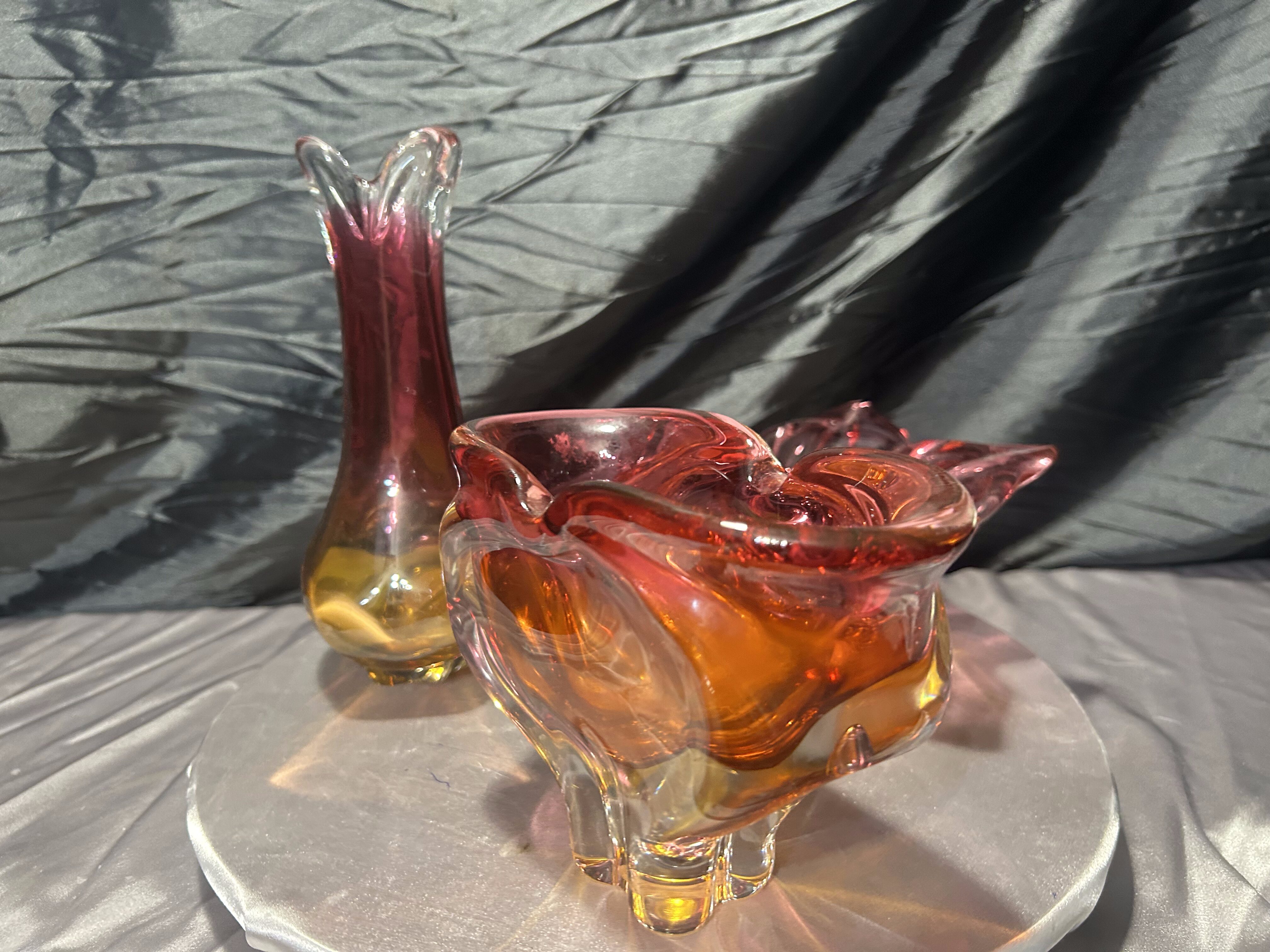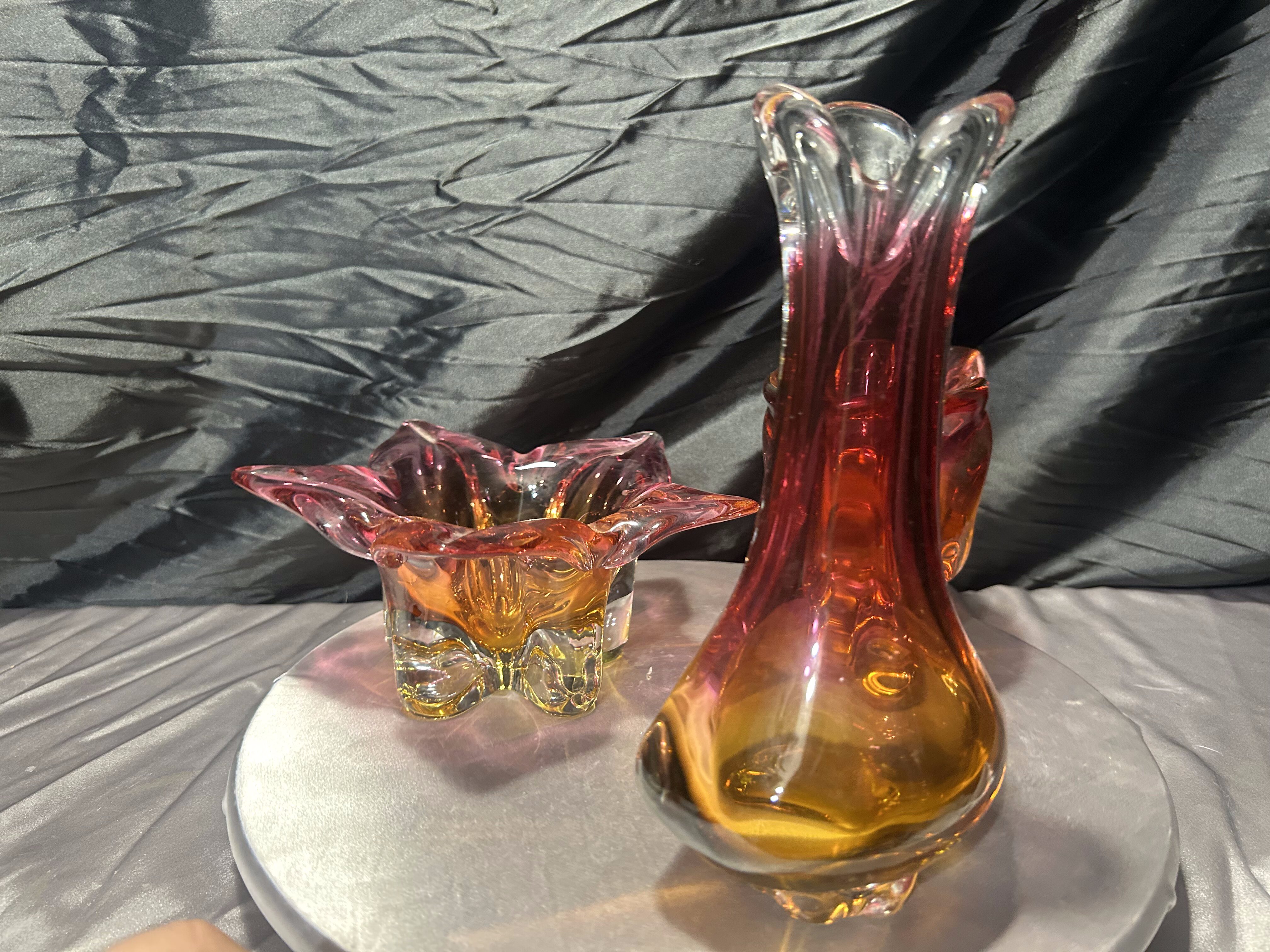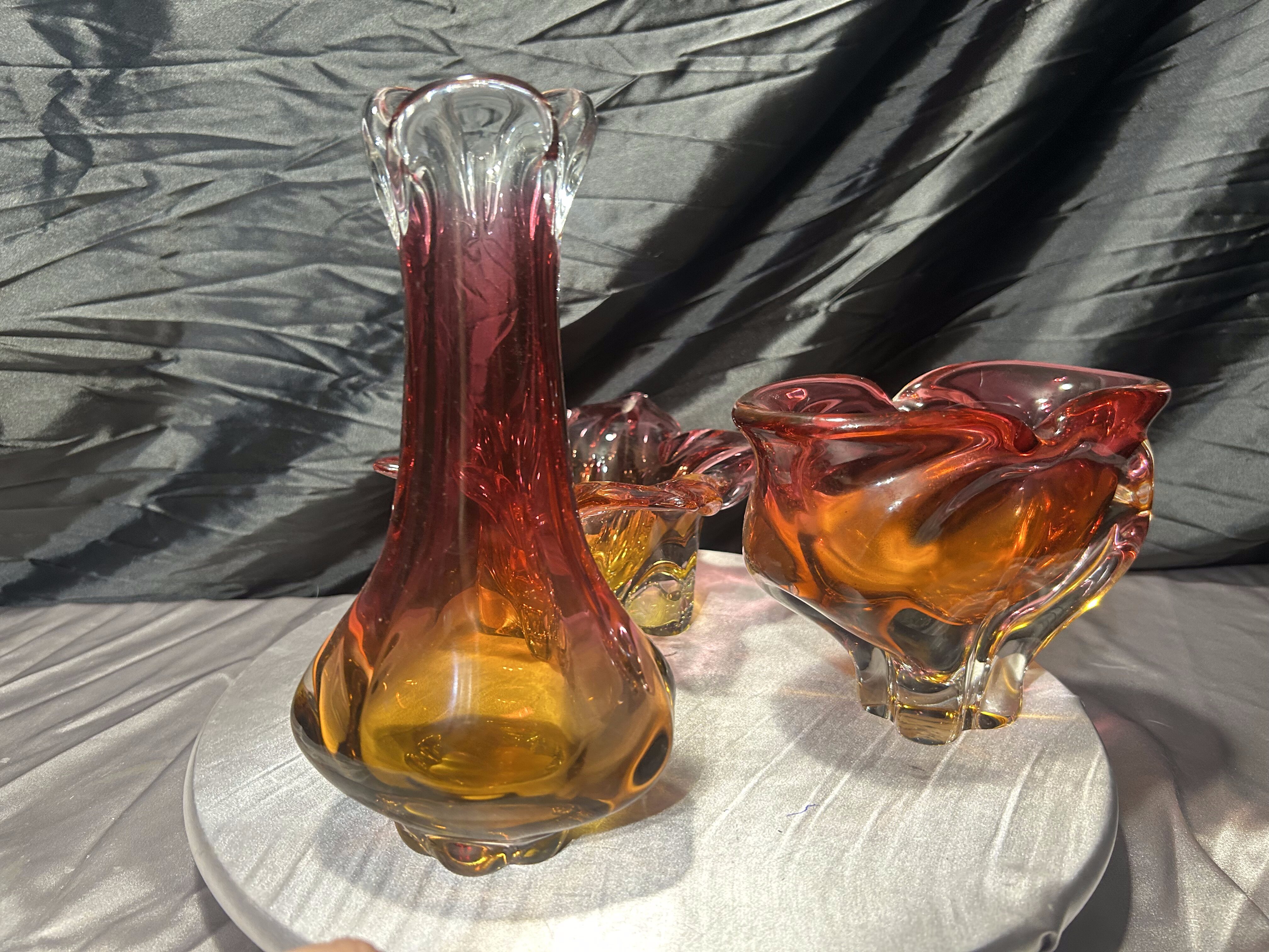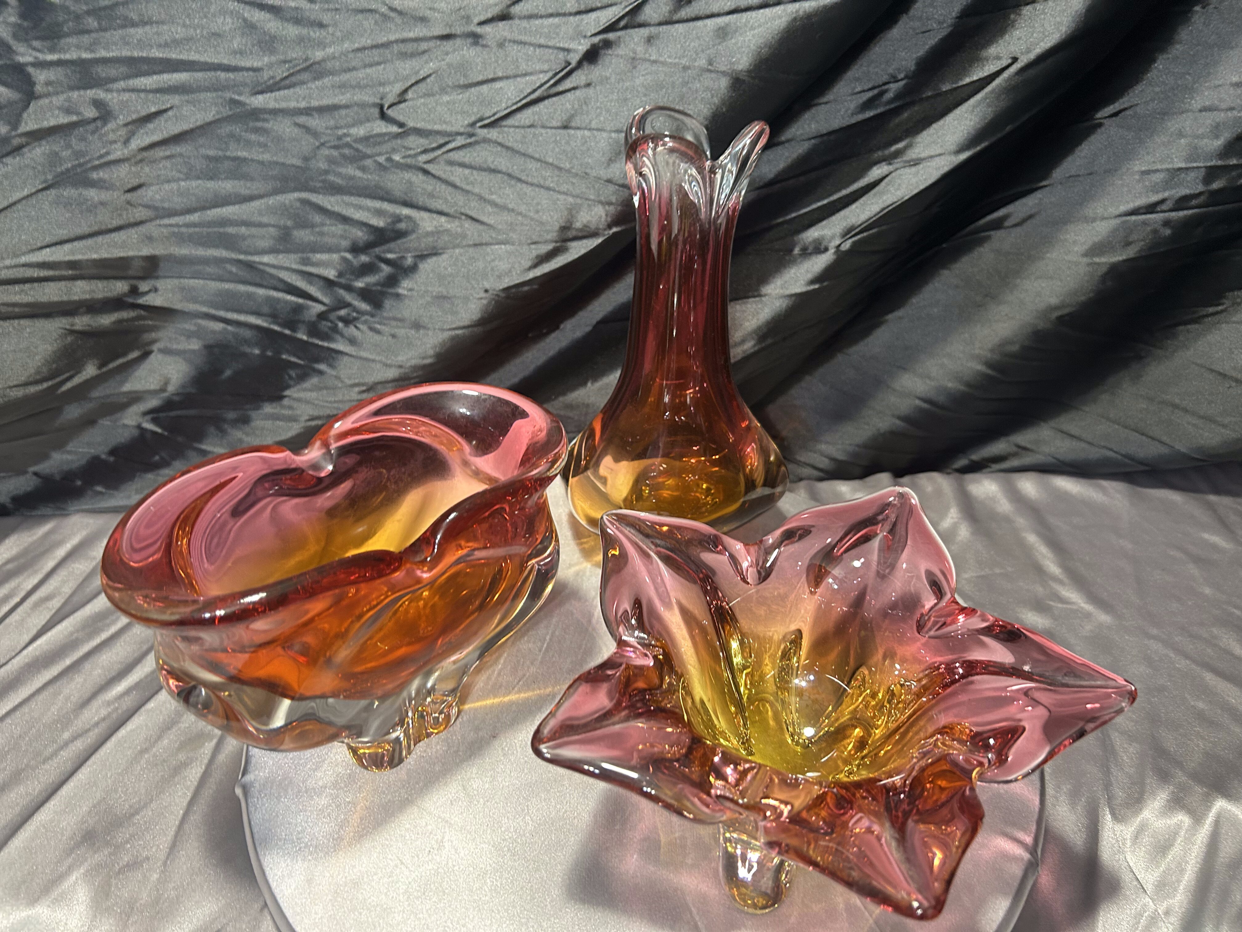 Wyjątkowy komplet trzech szklanych form artystycznych powstałych w słynnej Hucie Bohemia, zaprojektowanych w charakterystycznym stylu jednego z najwybitniejszych czeskich projektantów – Józefa Hospodki. Zestaw obejmuje misę o kwietnym kształcie, podłużną paterę oraz smukły flakon. Wszystkie trzy elementy łączy kunszt ręcznego formowania, przenikanie barw od różu po głęboki bursztyn oraz unikalna płynność form, z której Bohemia znana jest na całym świecie.