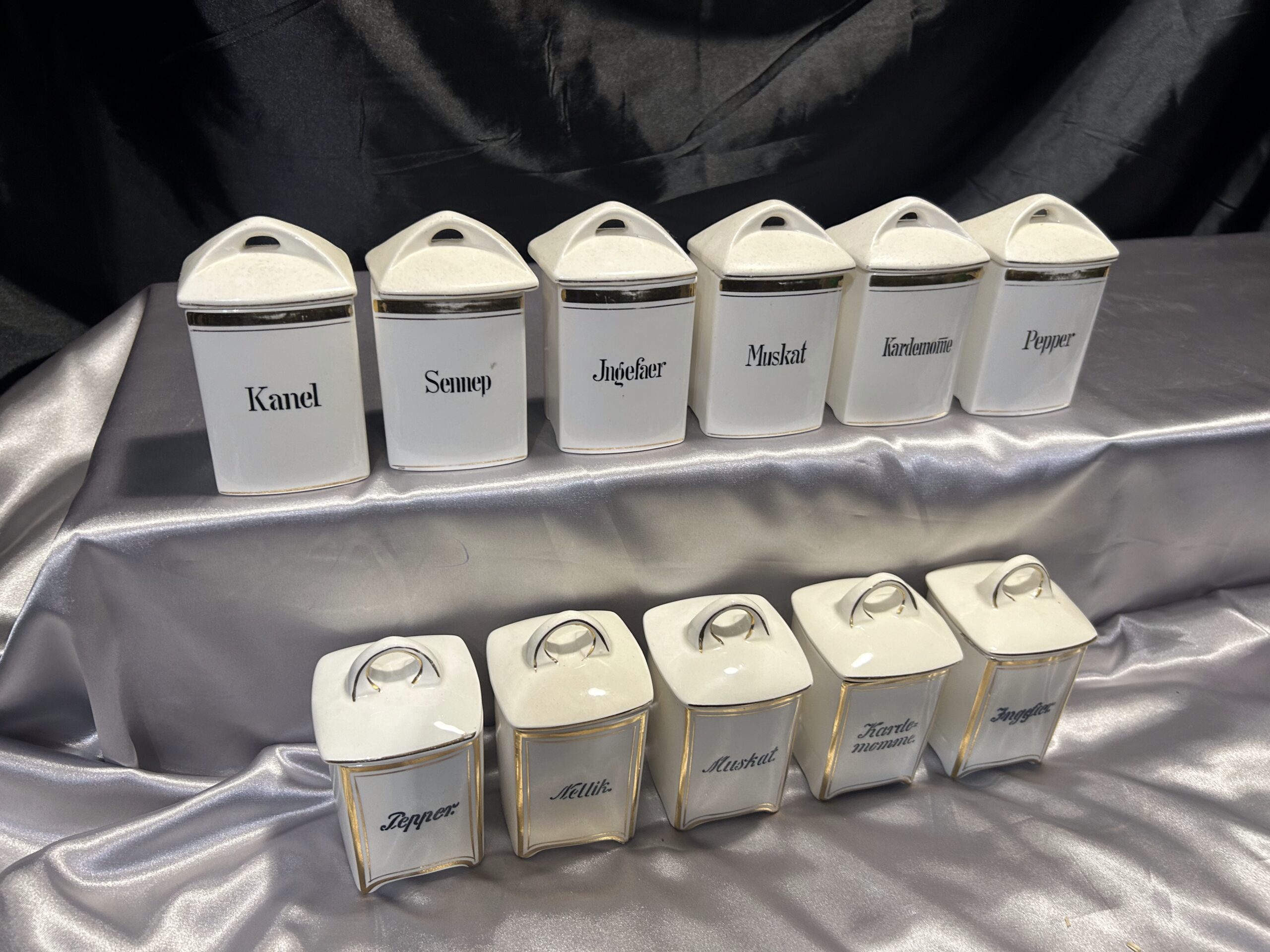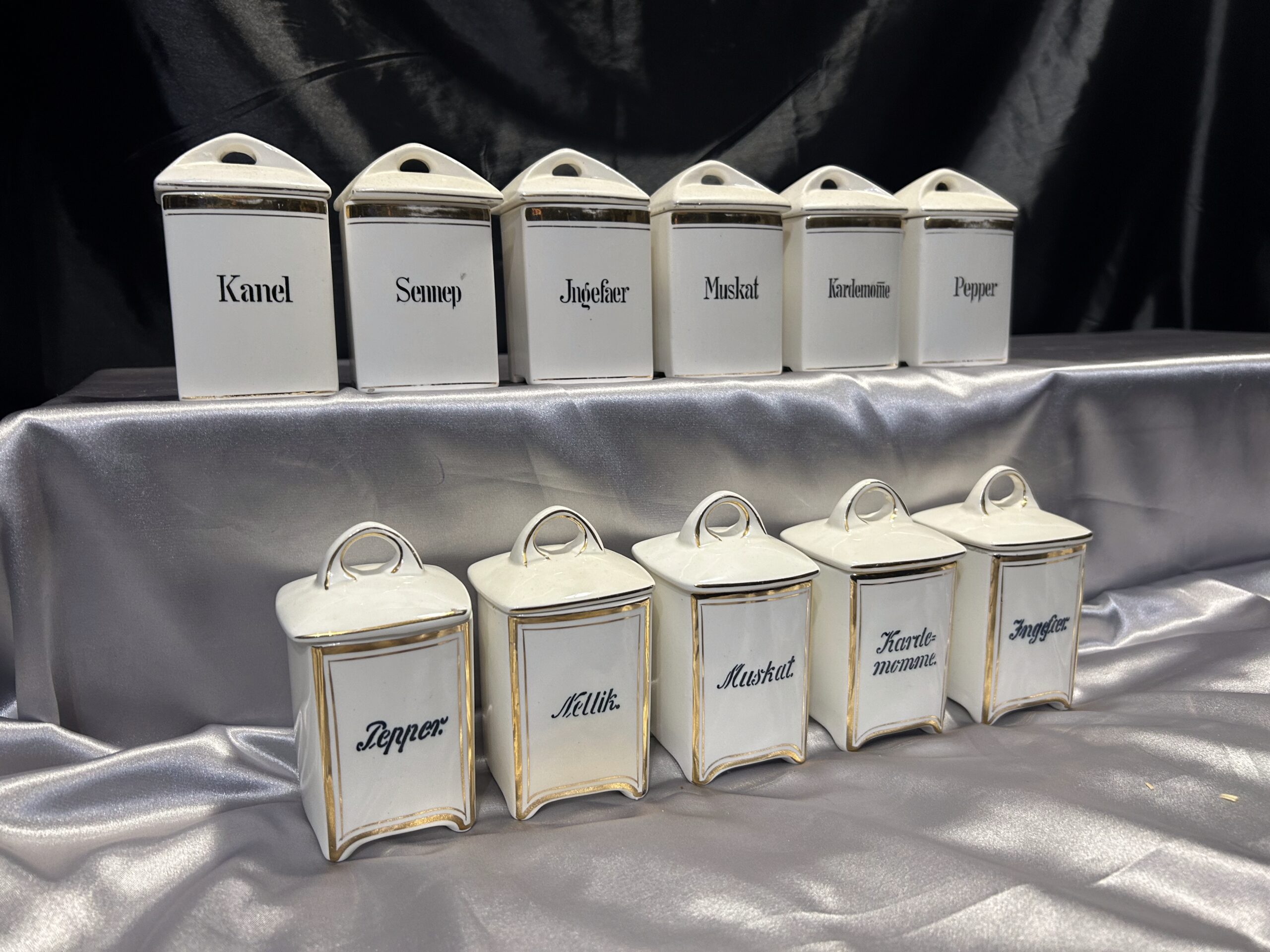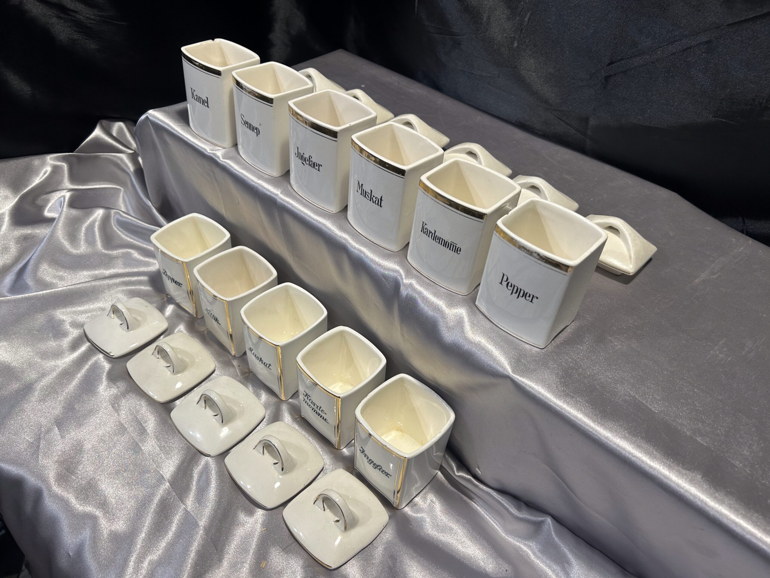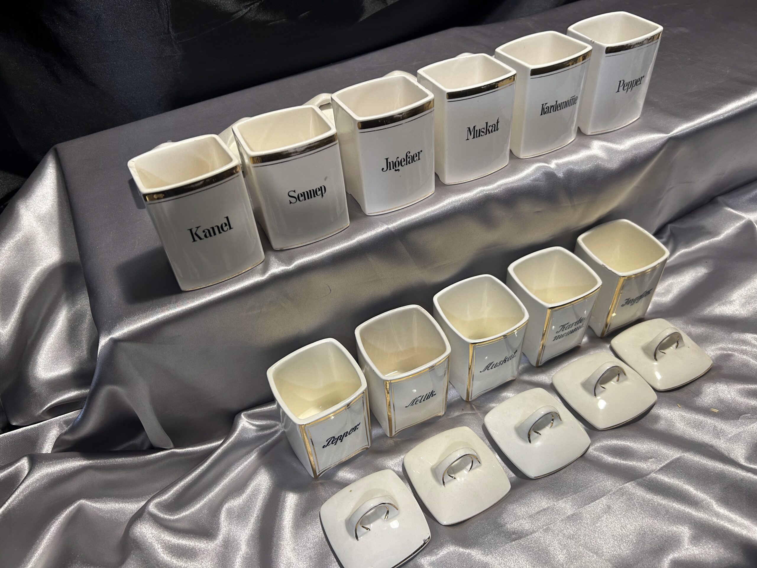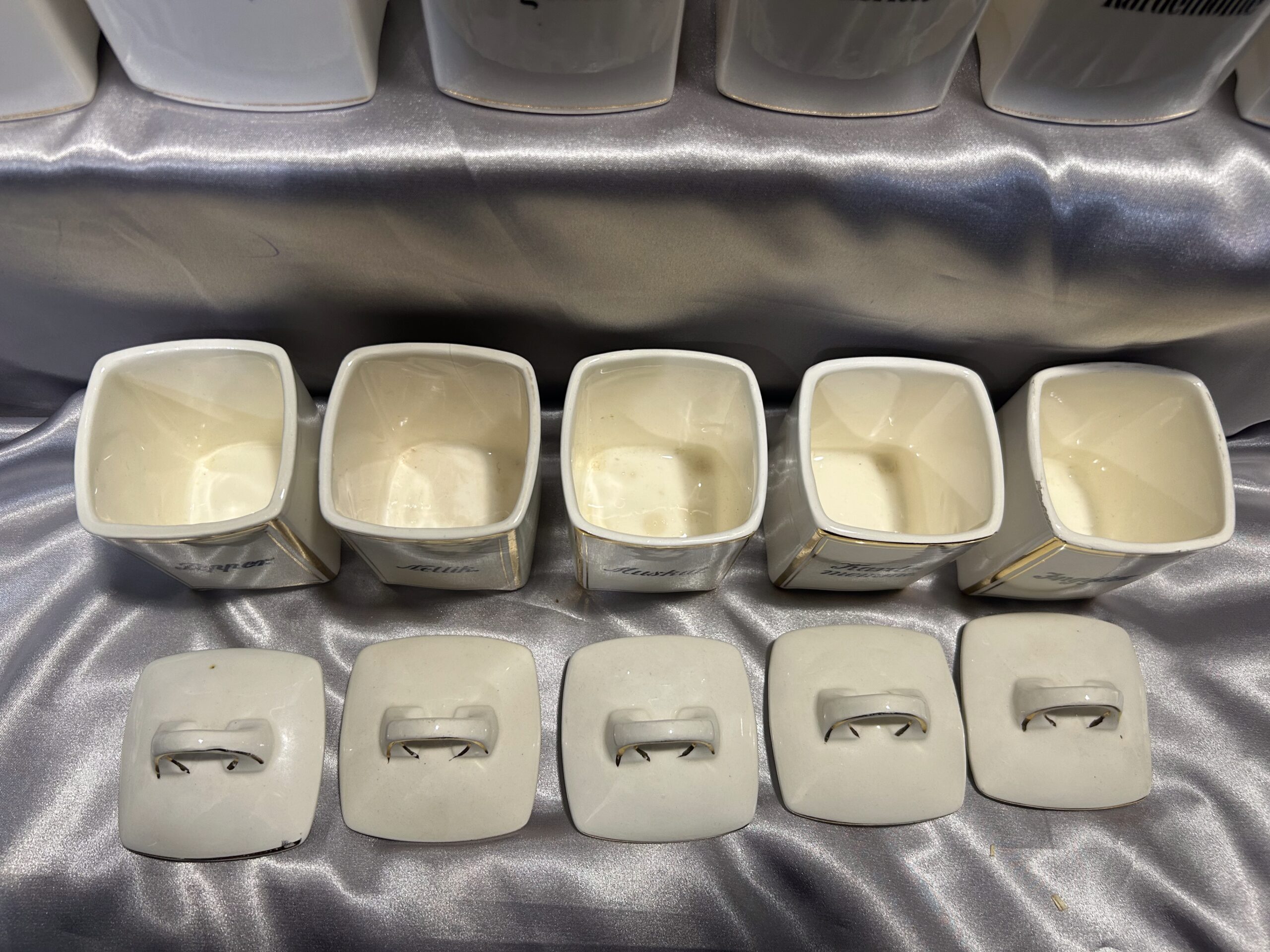 Zestaw jedenastu ceramicznych pojemników – elegancki komplet w kremowym kolorze ze złotymi wstawkami