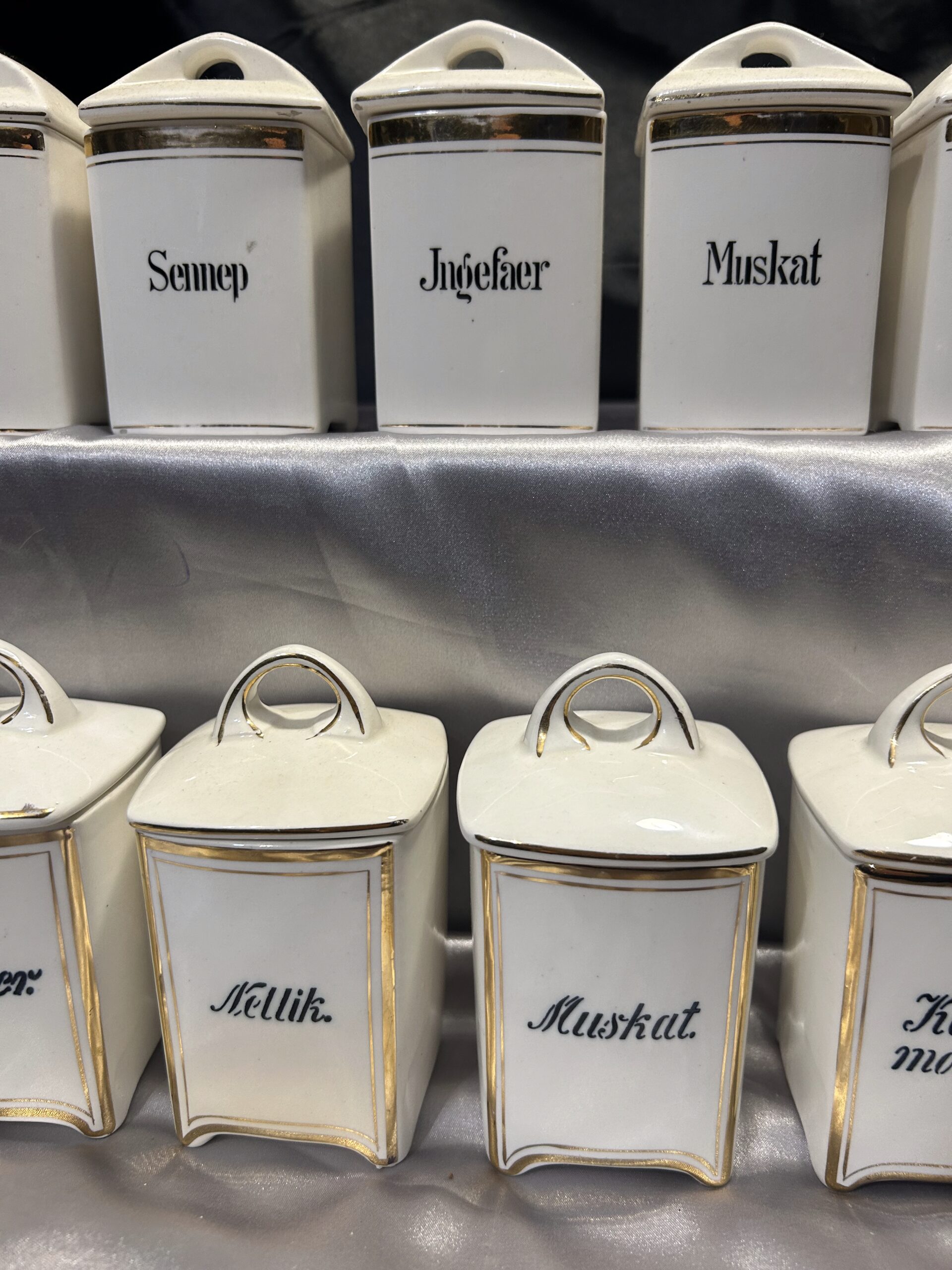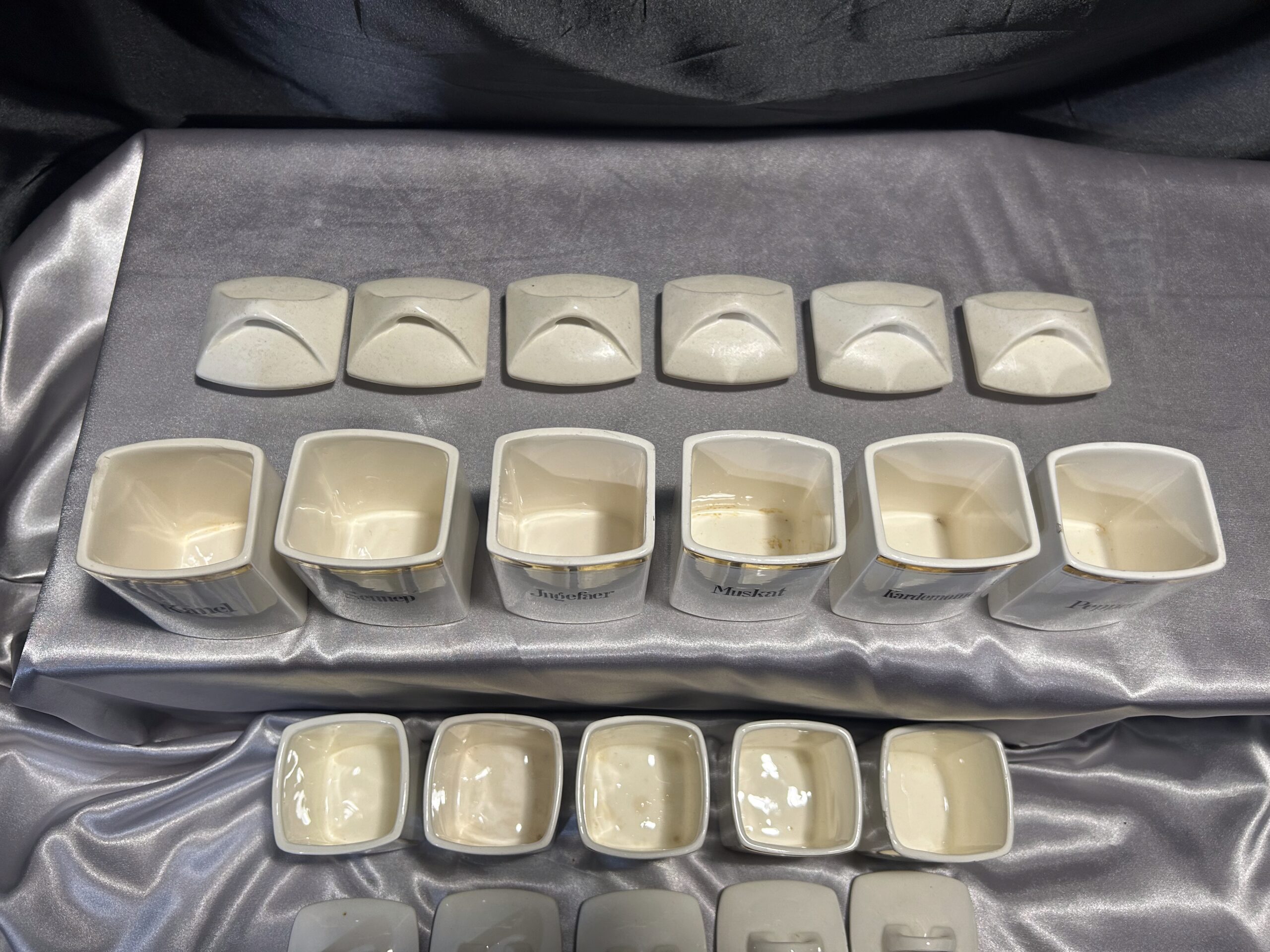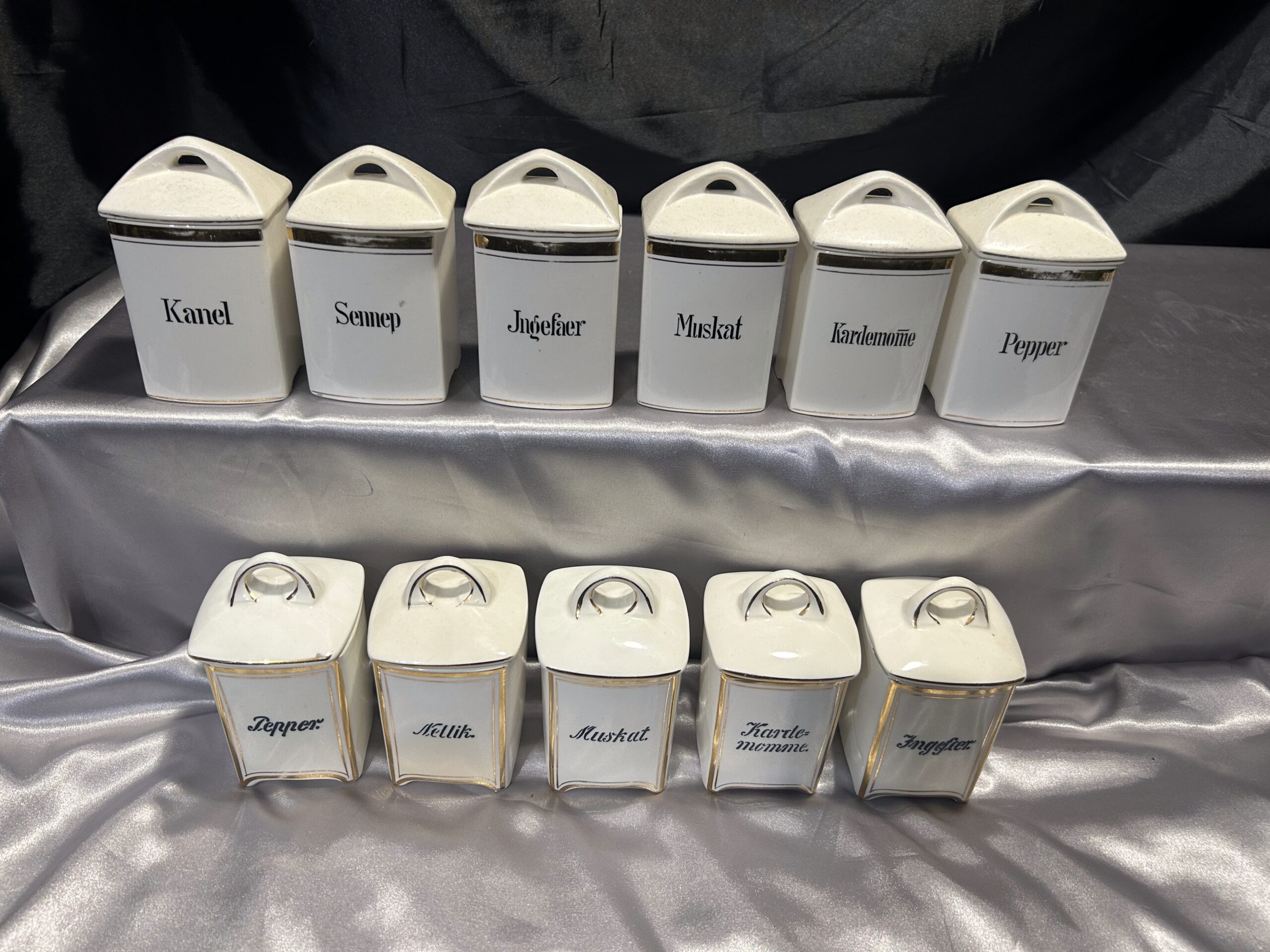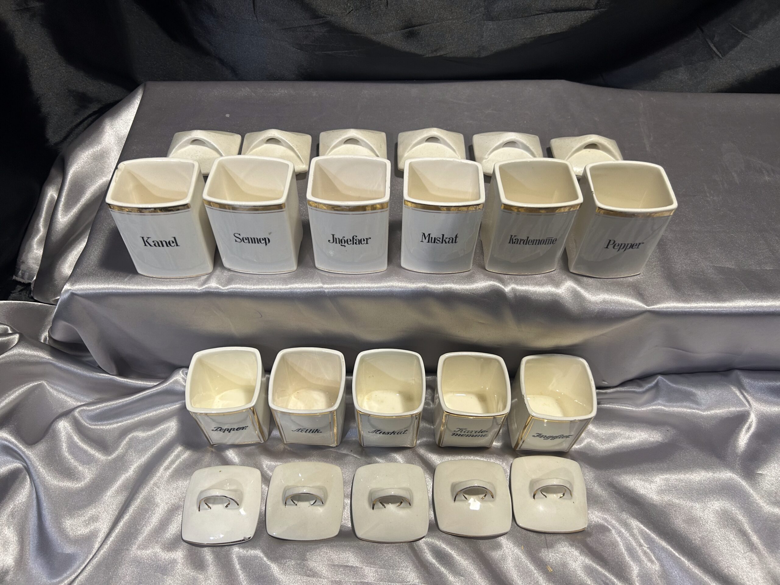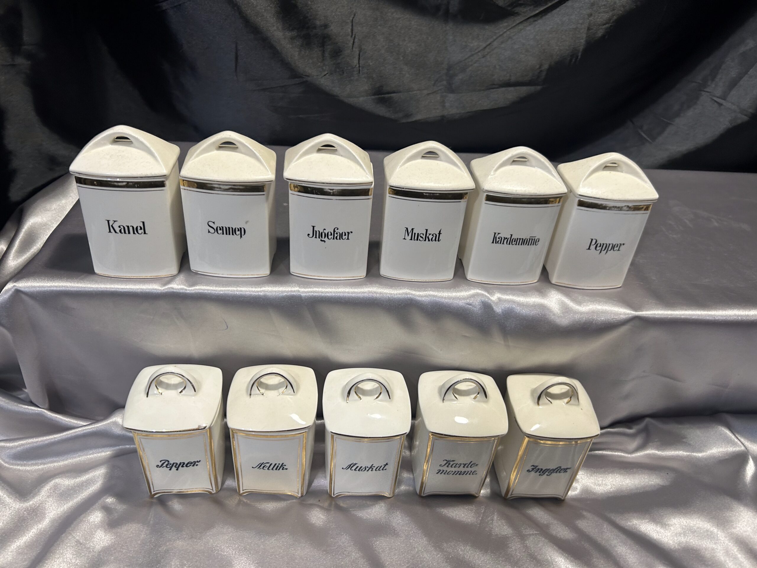 Zestaw jedenastu ceramicznych pojemników – elegancki komplet w kremowym kolorze ze złotymi wstawkami