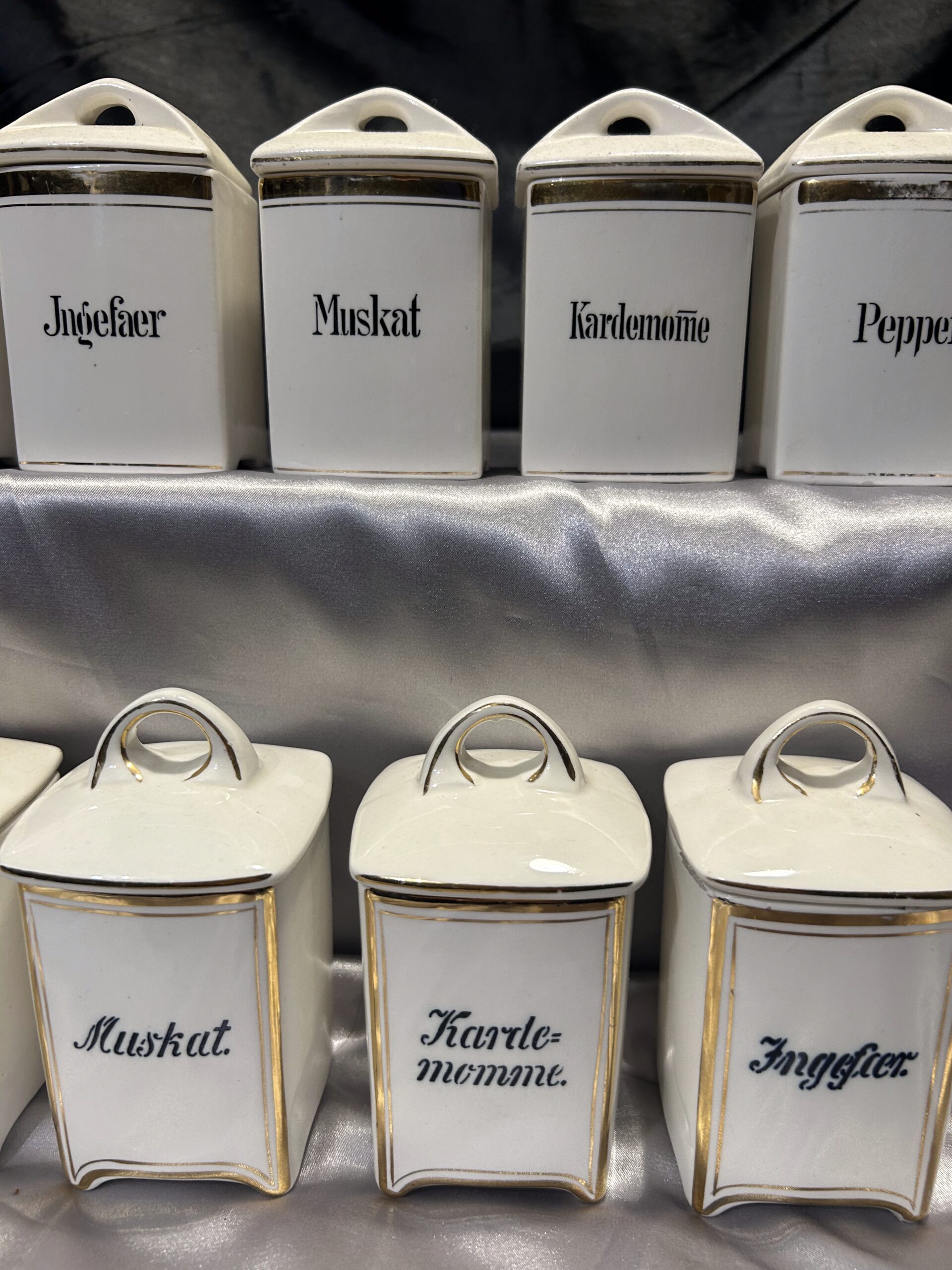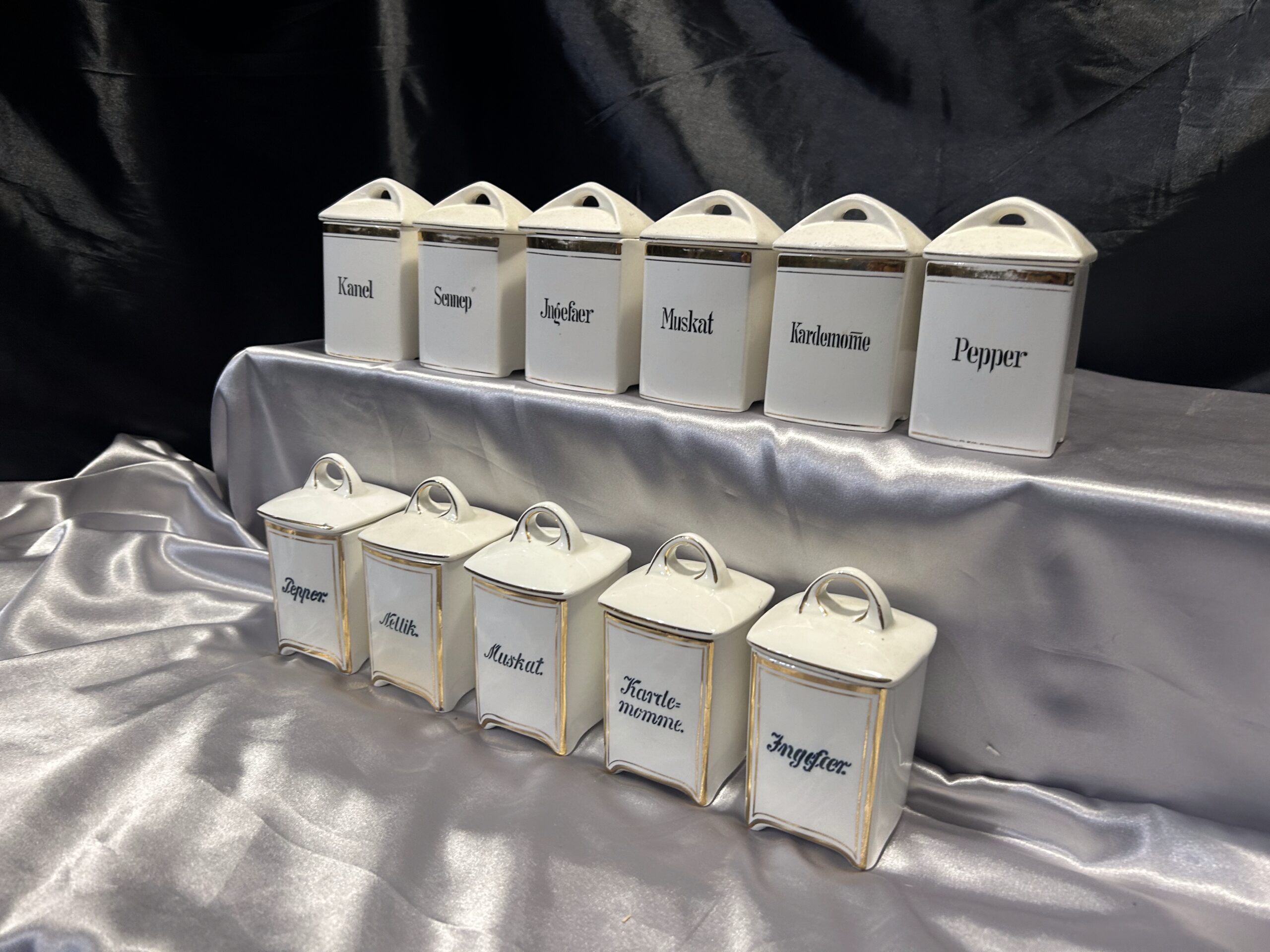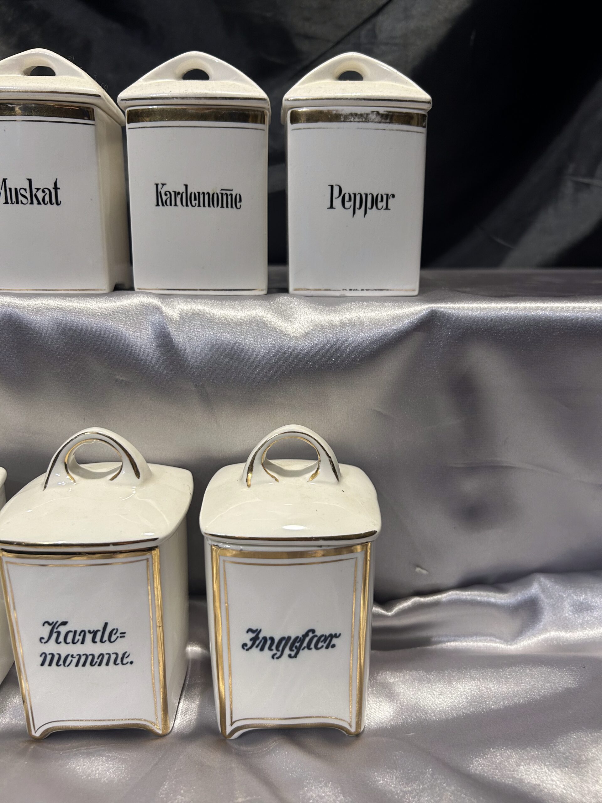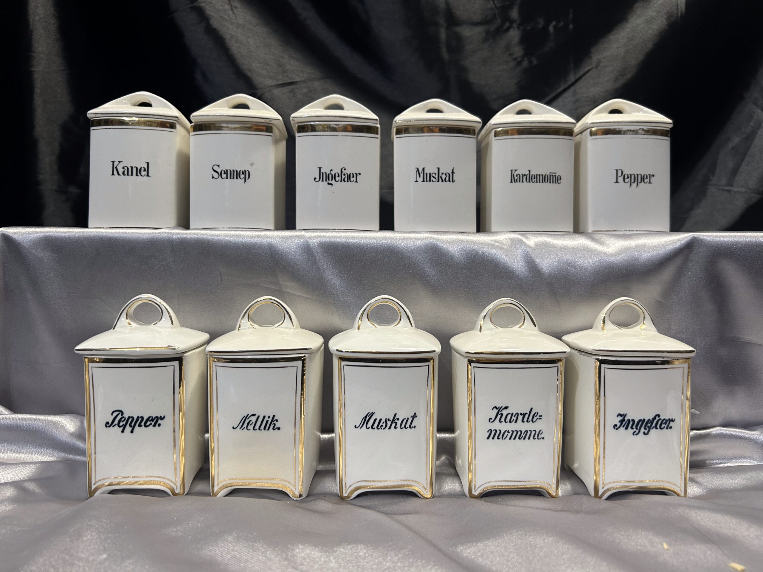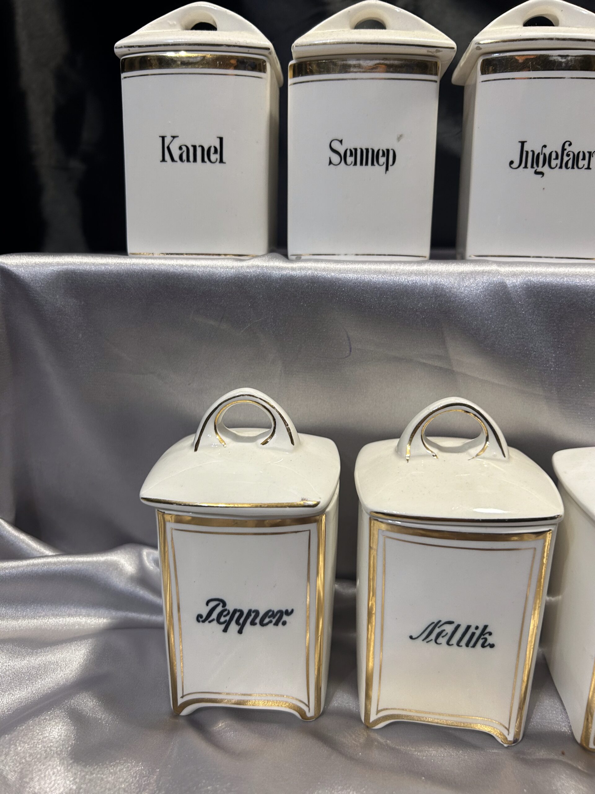 Przedstawiam wyjątkowy zestaw jedenastu ceramicznych pojemników, który łączy elegancję z funkcjonalnością. Wykonane w kremowym kolorze, ozdobione złotymi wstawkami i czarnymi napisami, nadają wnętrzu stylowy i klasyczny wygląd. Komplet składa się z pięciu mniejszych i sześciu większych, idealnych na przyprawy.