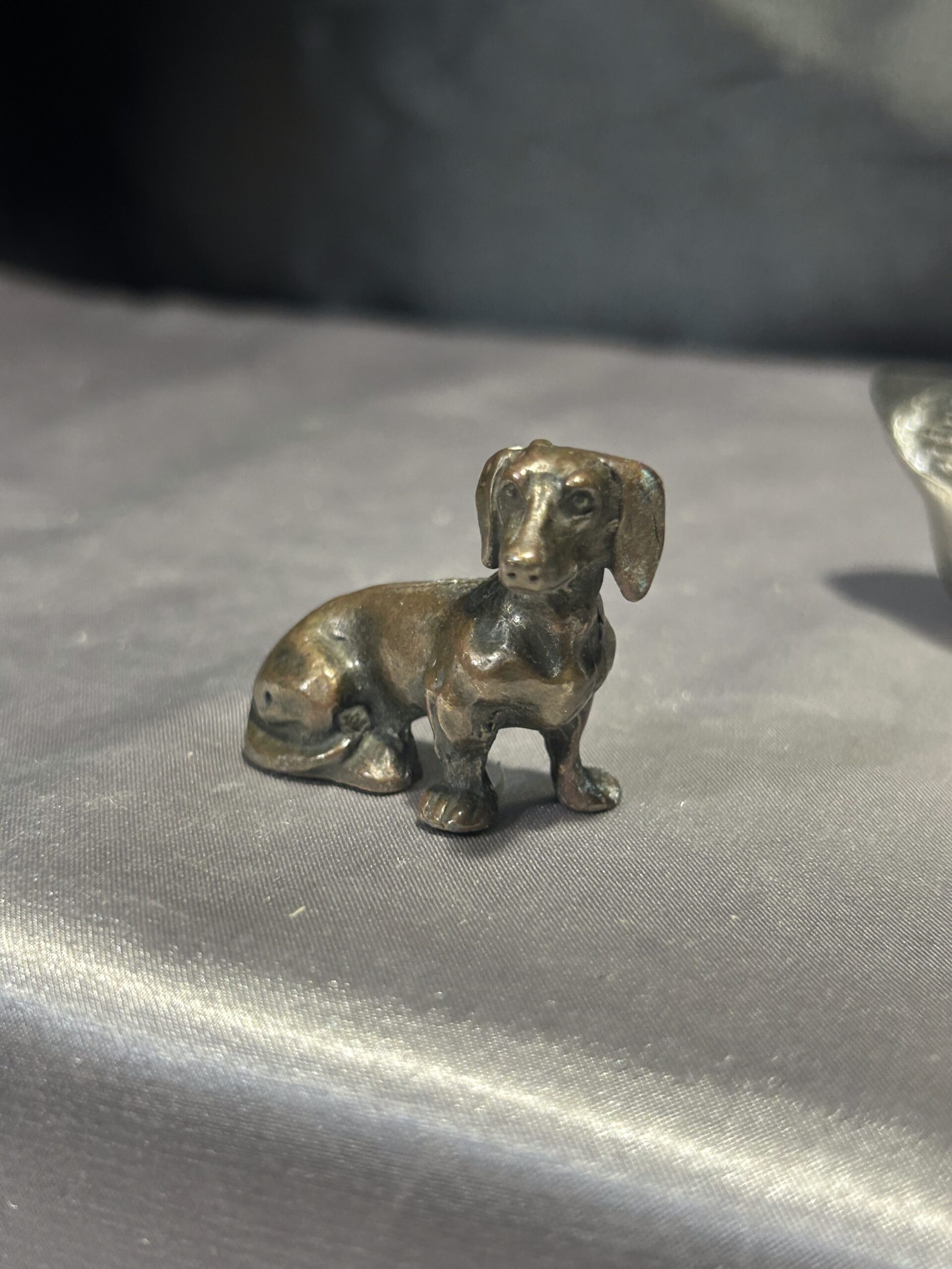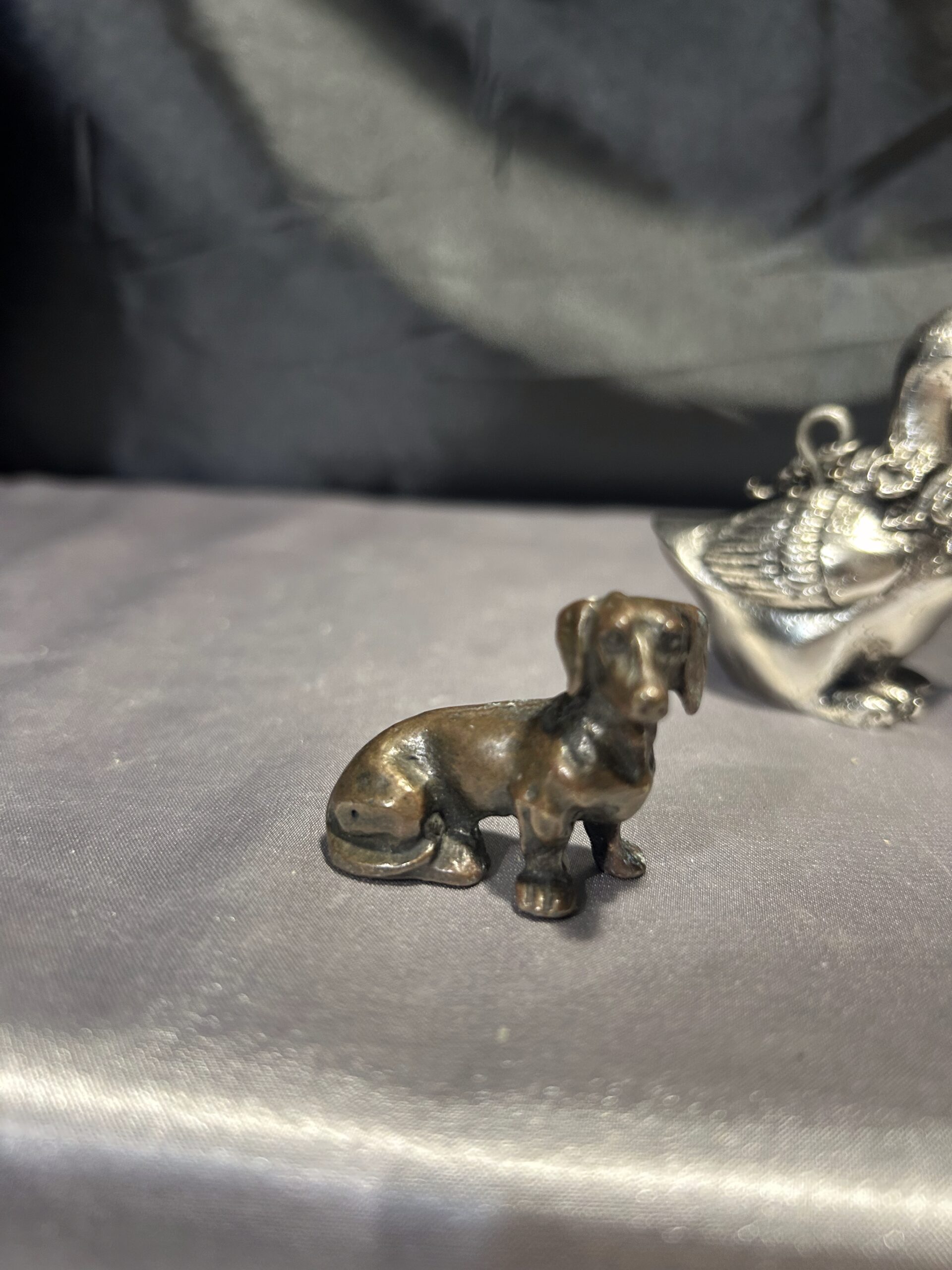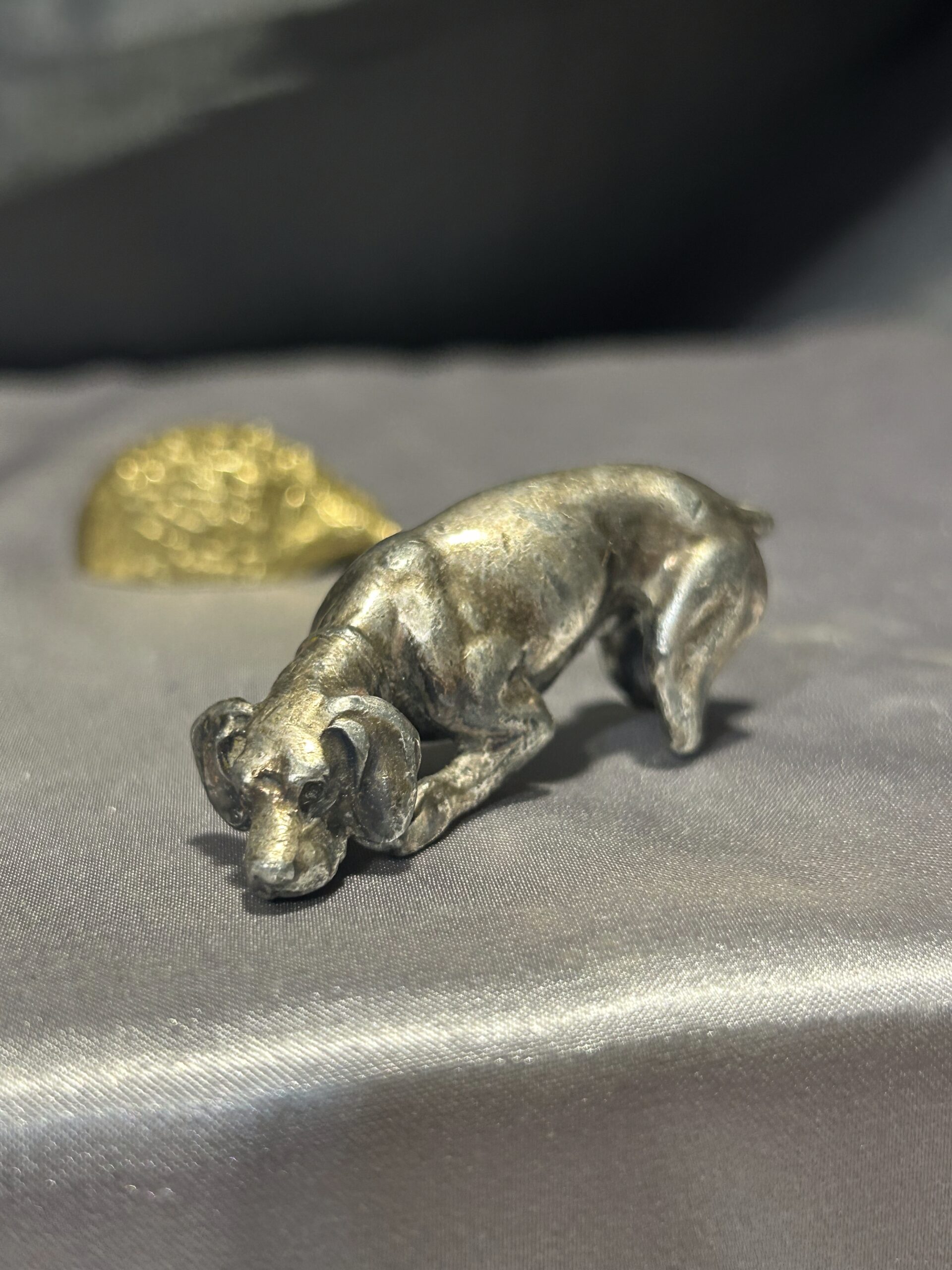 • Pies jamnik wykonany z brązu, prezentujący klasyczny urok i elegancję,